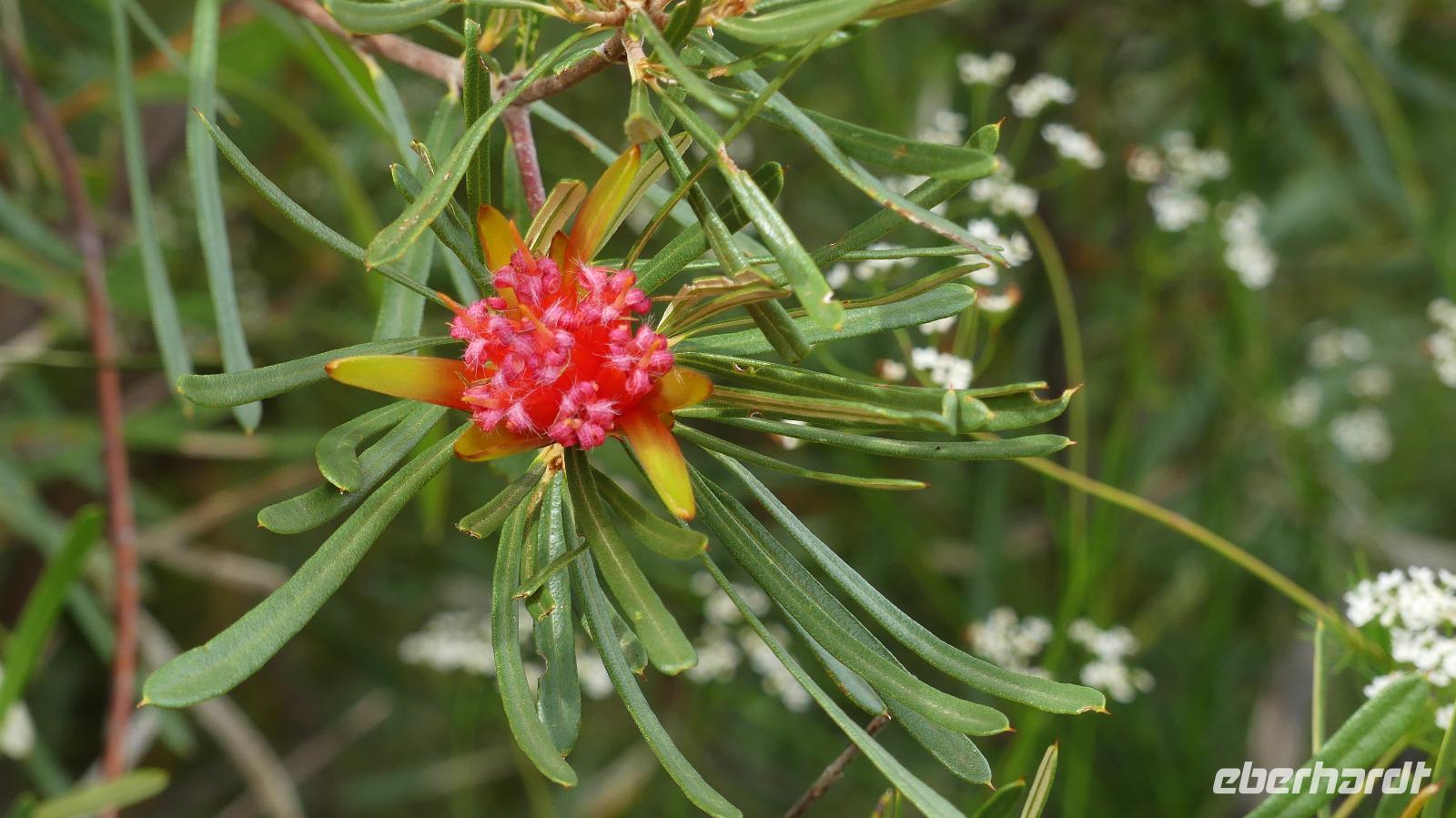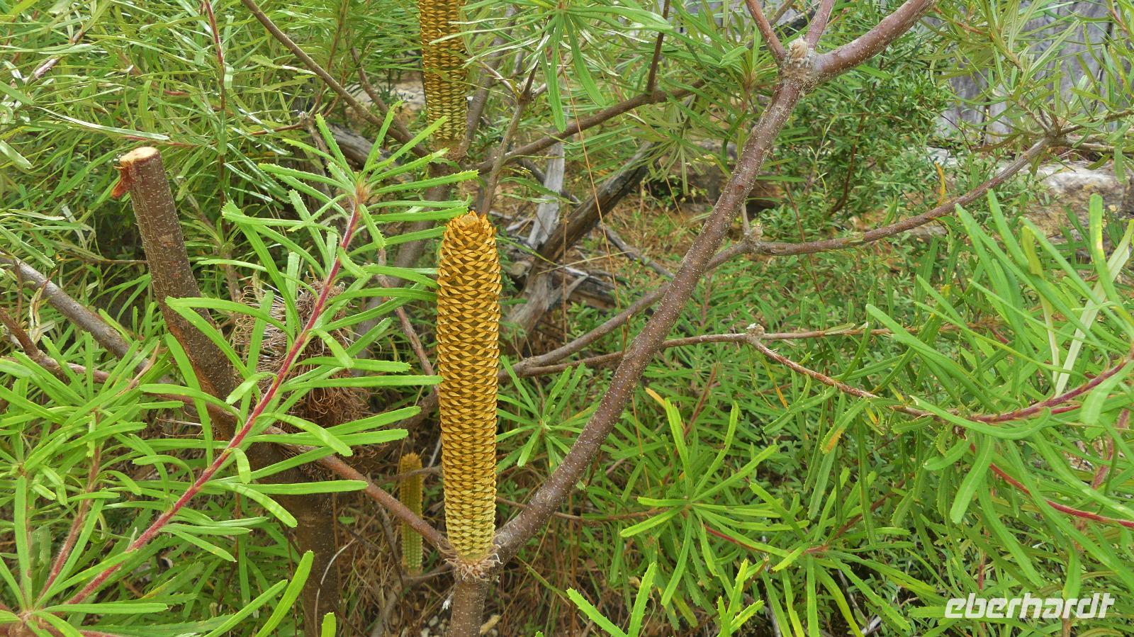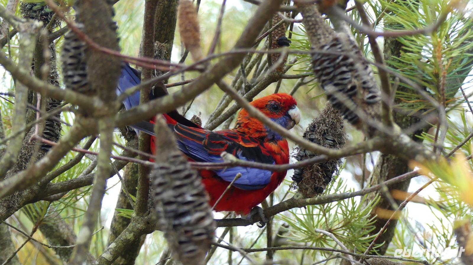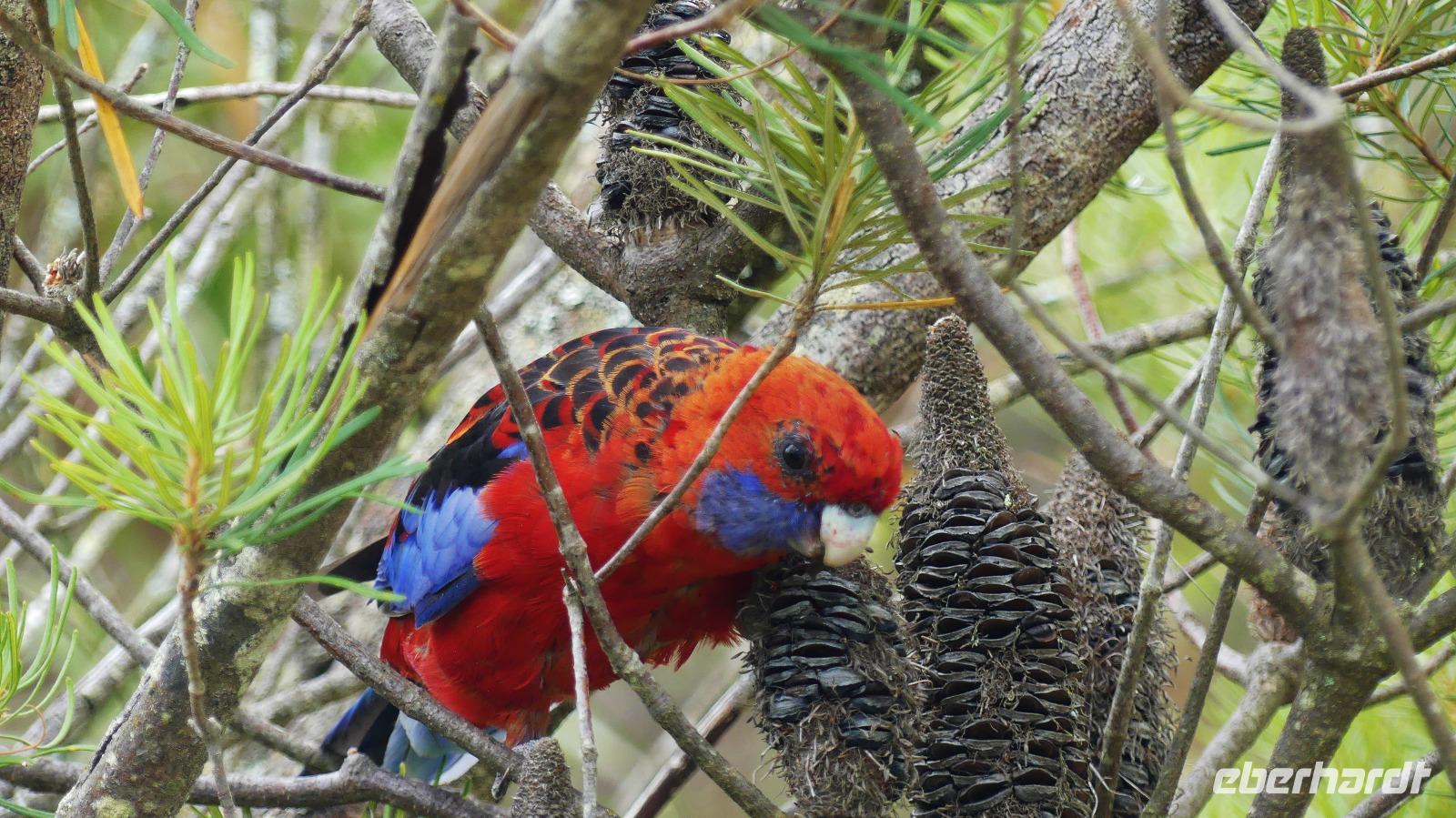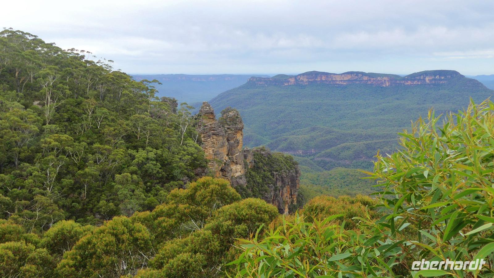 Nach einer Pause in Glenbrook (ich glaube hier sehen wir erstmals Kakadus) erreichen wir die Region Katoomba. An verschiedenen Aussichtspunkten sehen wir Sandsteinformationen der Blue Mountains, weite grüne Täler mit Eukalyptusbaumwäldern und die berühmte Felsformation der drei Schwestern. Als Dresdner erinnert mich diese Landschaft an unser Elbsandsteingebirge - die Blue Mountains wenn man so will das Elbsandsteingebirge mit Eukalyptusbaumwäldern? Und eben die Eukalyptusbäume sind es, die für das Blau in den Bergen sorgen, denn verdunstende ätherische Öle ihrer Blätter verursachen dieses blaue Schimmern. Bei einem kurzen Spaziergang durch den „Zauberwald" wie ihn Uli nennt, lernen wir etwas von der australischen Flora kennen, zum Beispiel die Küstenbanksie (Strauch mit gelb-oranger Blüte),den Bergteufel mit seiner roten Blüte, Teebaumsträucher und Baumfarne. An einer Aussichtsplattform haben wir das Glück, Rosellas (Crimson Rosella, eine Sittichart) zur beobachten. Queen Elisabeth war auch schon hier, eine Tafel erinnert an ihren Besuch 1954.