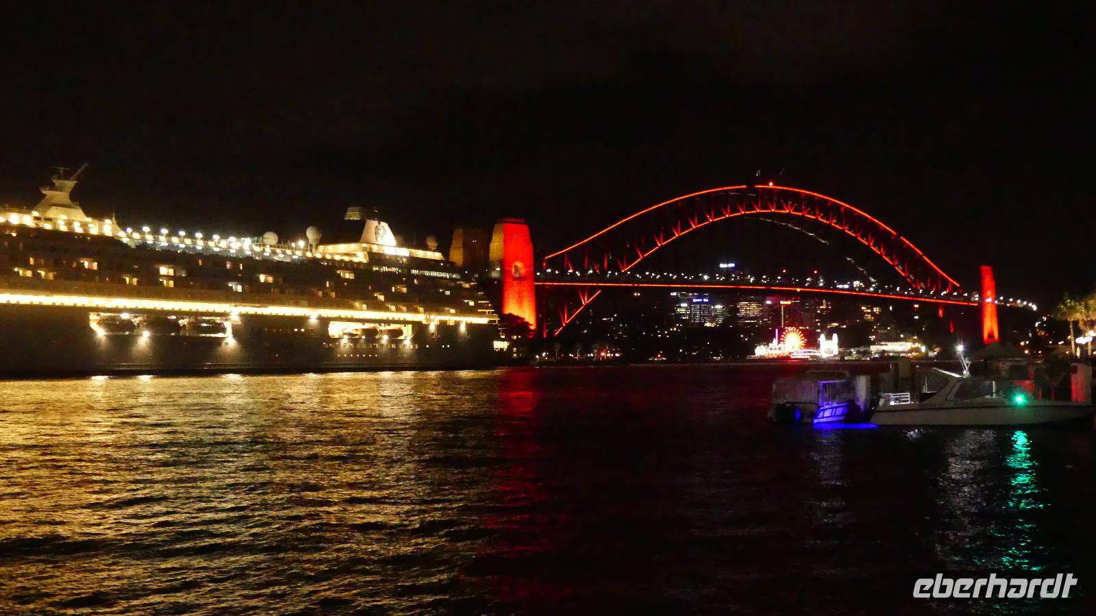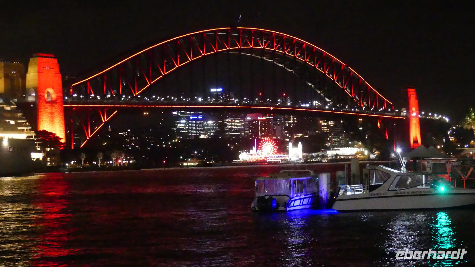 Den Abend verbringt jeder wie er möchte. Mit einem Teil der Gruppe sind wir in einem typischen Pub in der Altstadt. Hier testen wir verschiedene Pizzen, darunter solche exotischen wie Krokodil- und Kängurupizza. Vielen Dank an Ina und Christian, die uns diesen Pub empfohlen und reserviert haben und heute Abend mit uns essen. Die Altstadt und das ganze Gebiet zwischen Harbour Bridge und Oper stehen heute Abend ganz im Zeichen des chinesischen Neujahrsfestes, wir sind also nicht alleine hier. Zum Anlass des Chinese New Year sind die Wahrzeichen der Stadt, Harbour Bridge und Oper rot angestrahlt - ein schöner letzter Blick am Ende unseres Sydney Besuches.