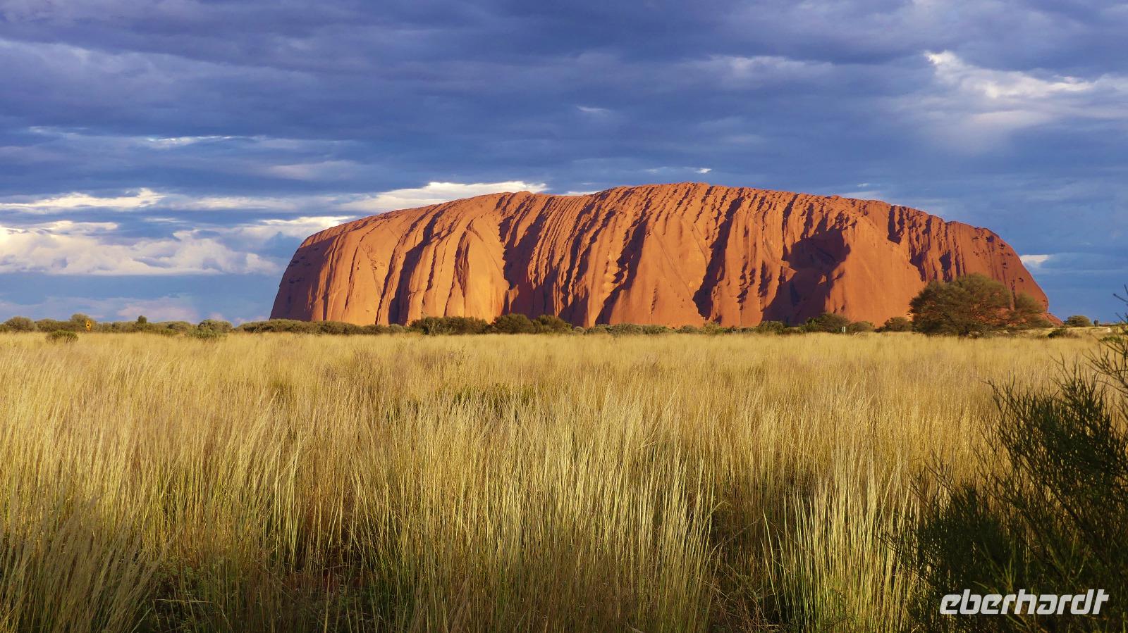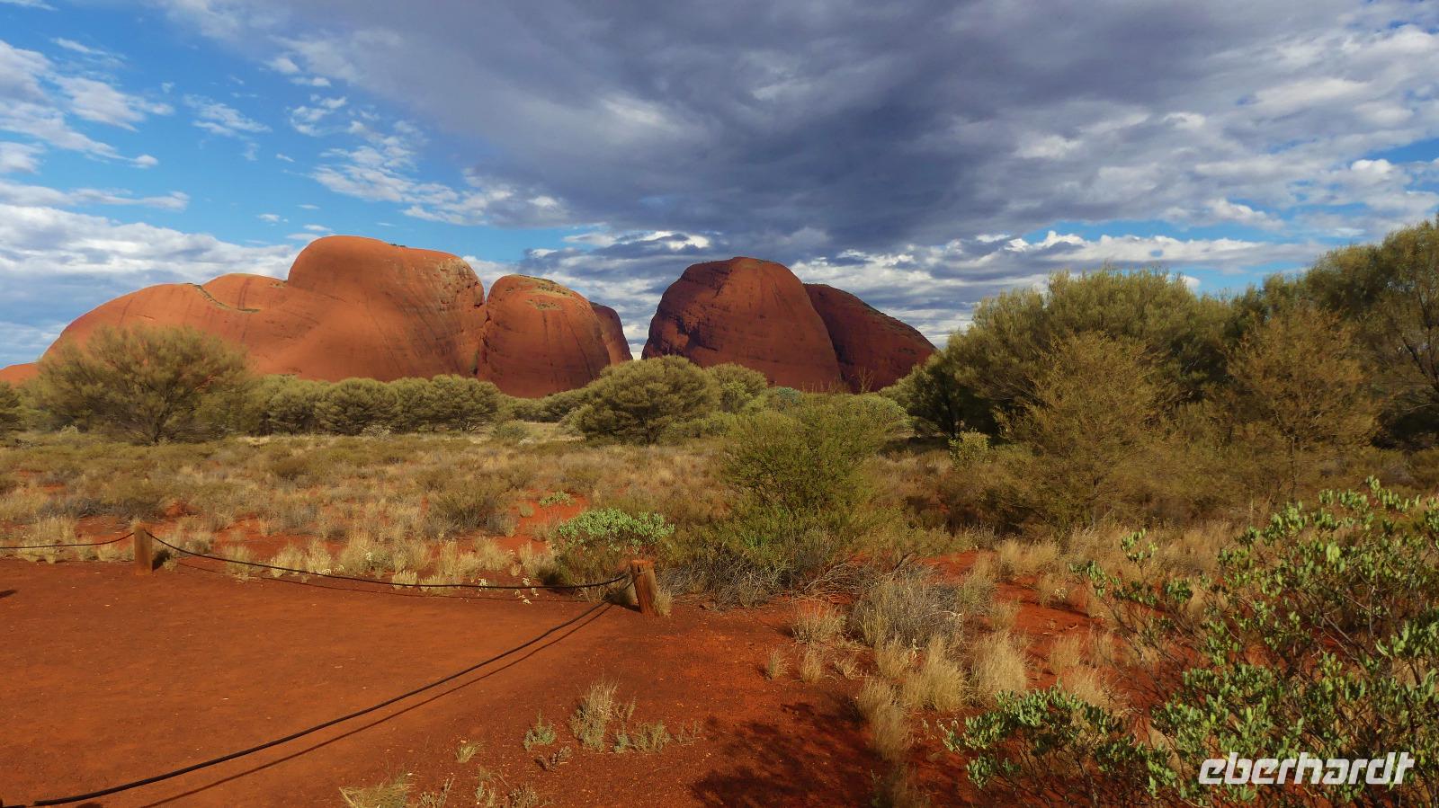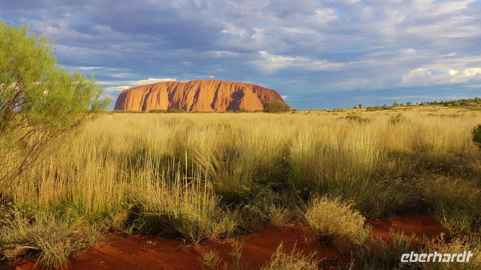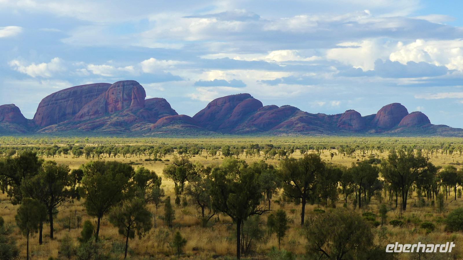 Der Uluru ist der bekannteste aber nicht der einzige Inselberg. Wir schauen uns zunächst die Kata Tjutas an. Übersetzt bedeutet das einfach nur „viele Berge". Die aus 36 Felskuppeln bestehende Formation leuchtet in der Nachmittagssonne kräftig rotbraun. Wir genießen diese Eindrücke bei einer Wanderung und Marcel zeigt uns bei weiteren Stops noch andere faszinierende Ausblicke auf die „Olgas", wie die Kat Tjutas auch genannt werden. Namensgeber war ihr Entdecker Ernest Giles, der sie nach seinen Förderern aus dem Hause Württemberg benannte > Olga von Württemberg. Inzwischen gehen immer wieder bange Blicke zum Himmel - werden die Wolken der Sonne rechtzeitig zum Sonnenuntergang Platz machen? Zu diesem Ereignis fahren wir zum ultimativen Ausblick für Uluru-Sonnenuntergänge (im Nationalpark darf man nur an markierten Stellen halten und aussteigen). Bei einem Gläschen Sekt (oder Saft) lassen wir die Abendstimmung am Ayers Rock auf uns wirken. Ein großes Erlebnis, auch mit Wolken!