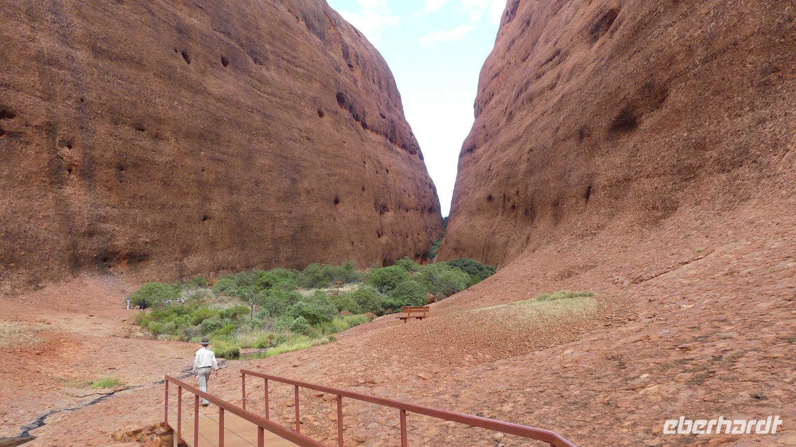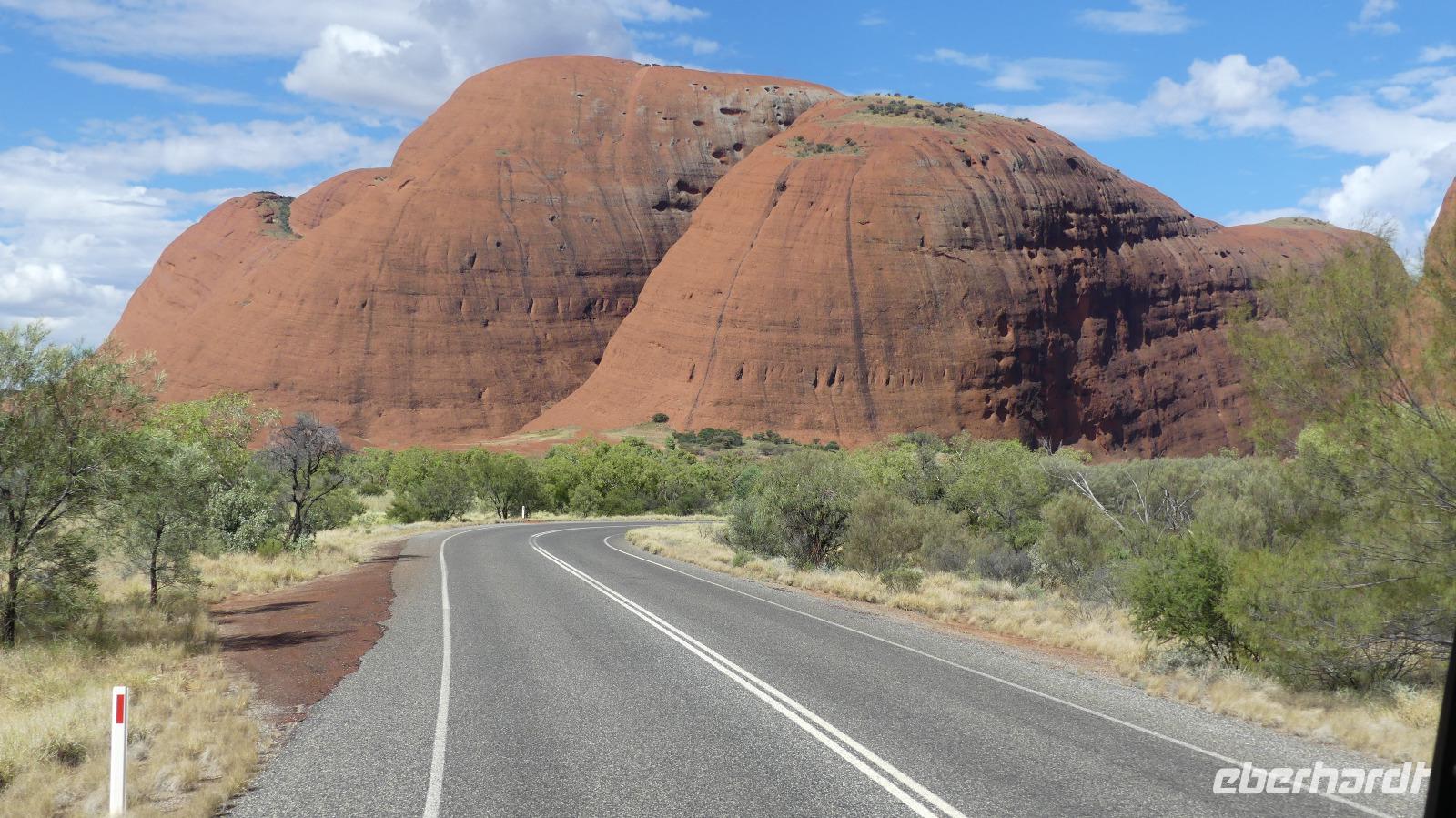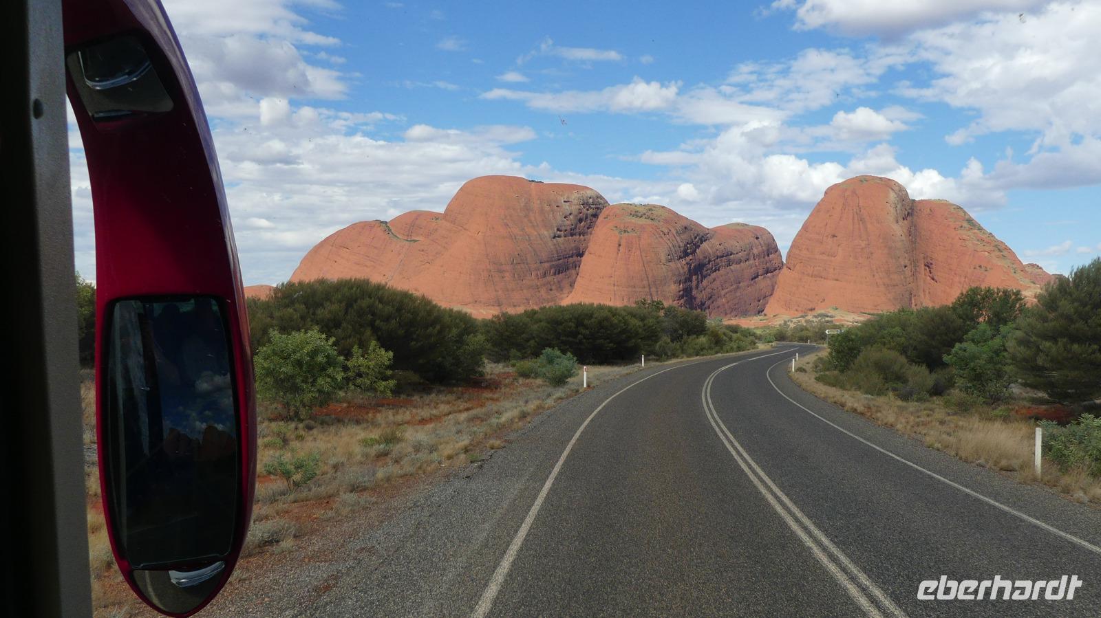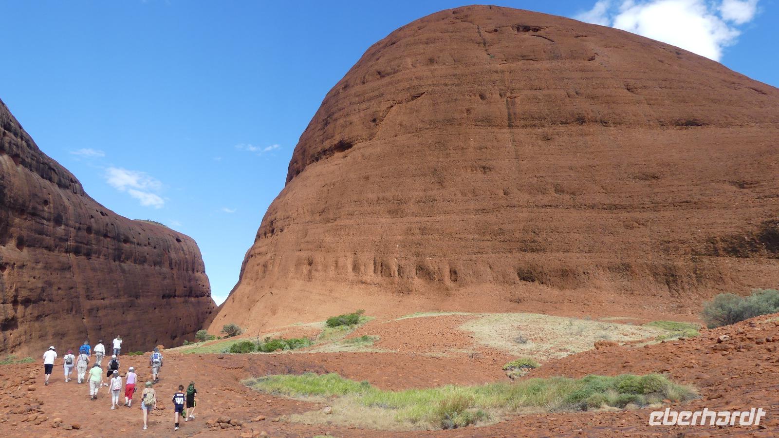 Der Uluru ist der bekannteste aber nicht der einzige Inselberg. Wir schauen uns zunächst die Kata Tjutas an. Übersetzt bedeutet das einfach nur „viele Berge". Die aus 36 Felskuppeln bestehende Formation leuchtet in der Nachmittagssonne kräftig rotbraun. Wir genießen diese Eindrücke bei einer Wanderung und Marcel zeigt uns bei weiteren Stops noch andere faszinierende Ausblicke auf die „Olgas", wie die Kat Tjutas auch genannt werden. Namensgeber war ihr Entdecker Ernest Giles, der sie nach seinen Förderern aus dem Hause Württemberg benannte > Olga von Württemberg. Inzwischen gehen immer wieder bange Blicke zum Himmel - werden die Wolken der Sonne rechtzeitig zum Sonnenuntergang Platz machen? Zu diesem Ereignis fahren wir zum ultimativen Ausblick für Uluru-Sonnenuntergänge (im Nationalpark darf man nur an markierten Stellen halten und aussteigen). Bei einem Gläschen Sekt (oder Saft) lassen wir die Abendstimmung am Ayers Rock auf uns wirken. Ein großes Erlebnis, auch mit Wolken!