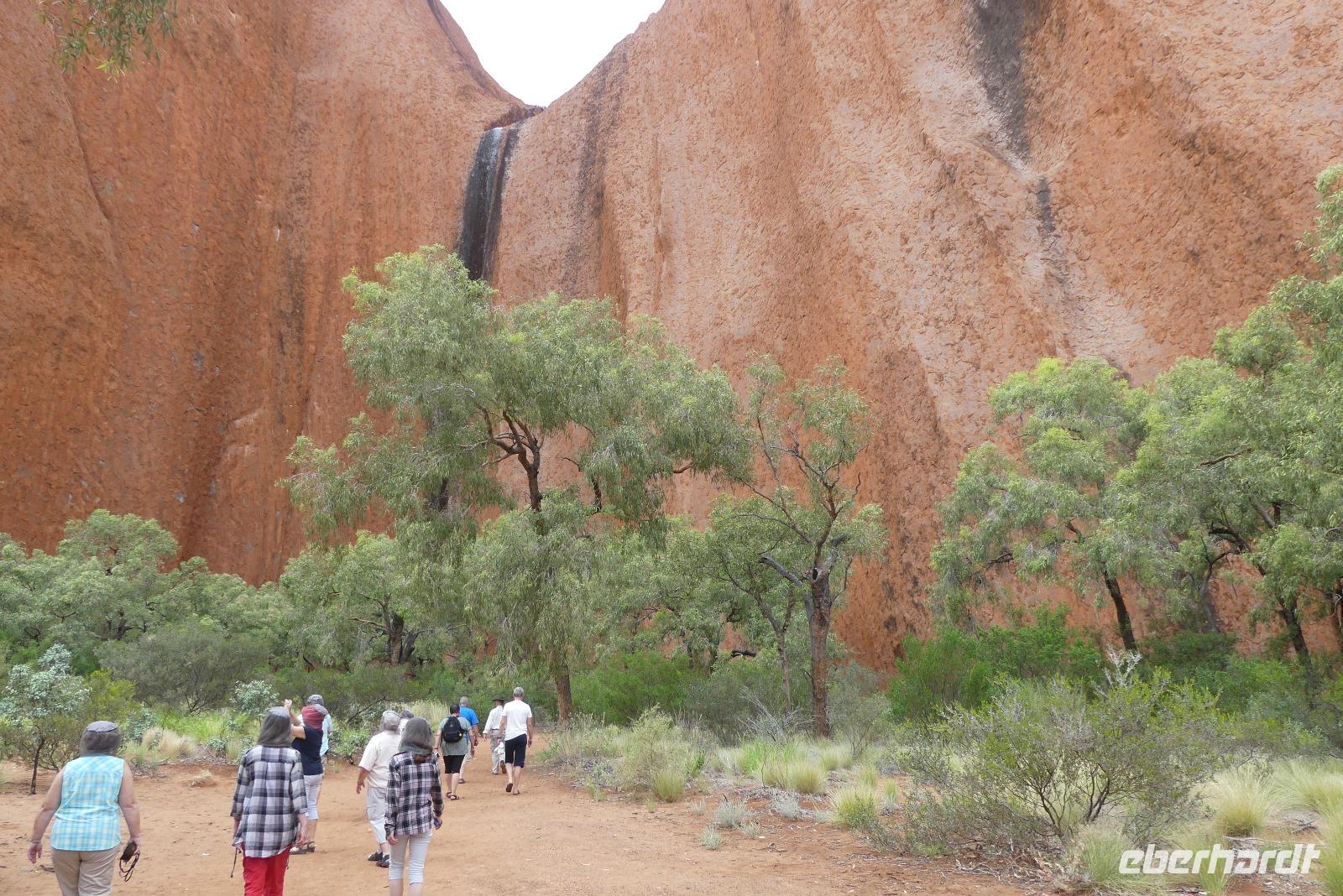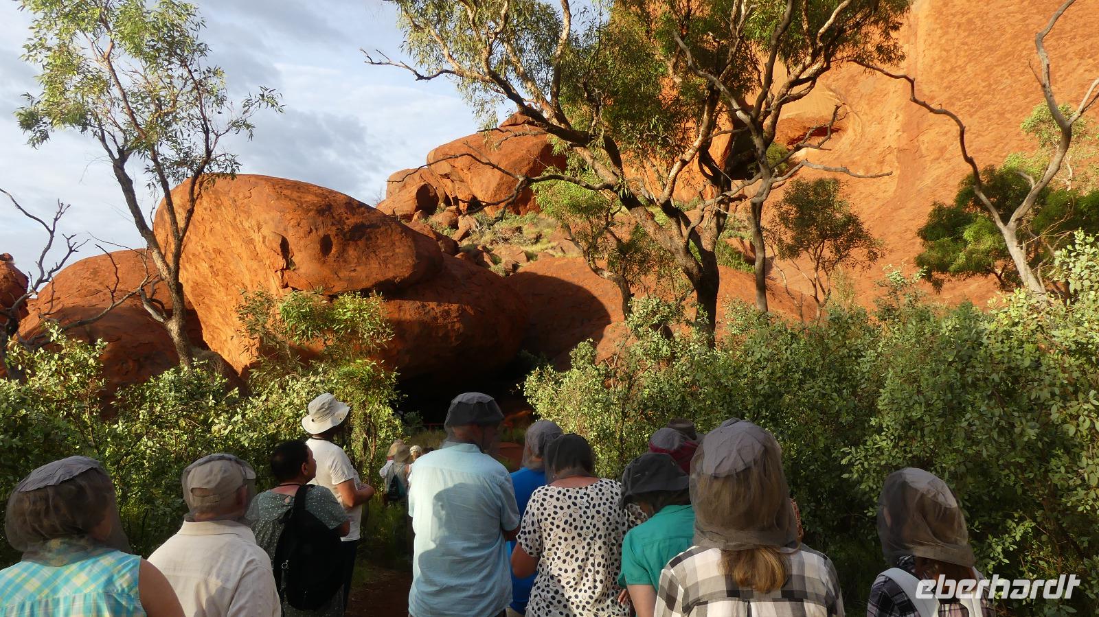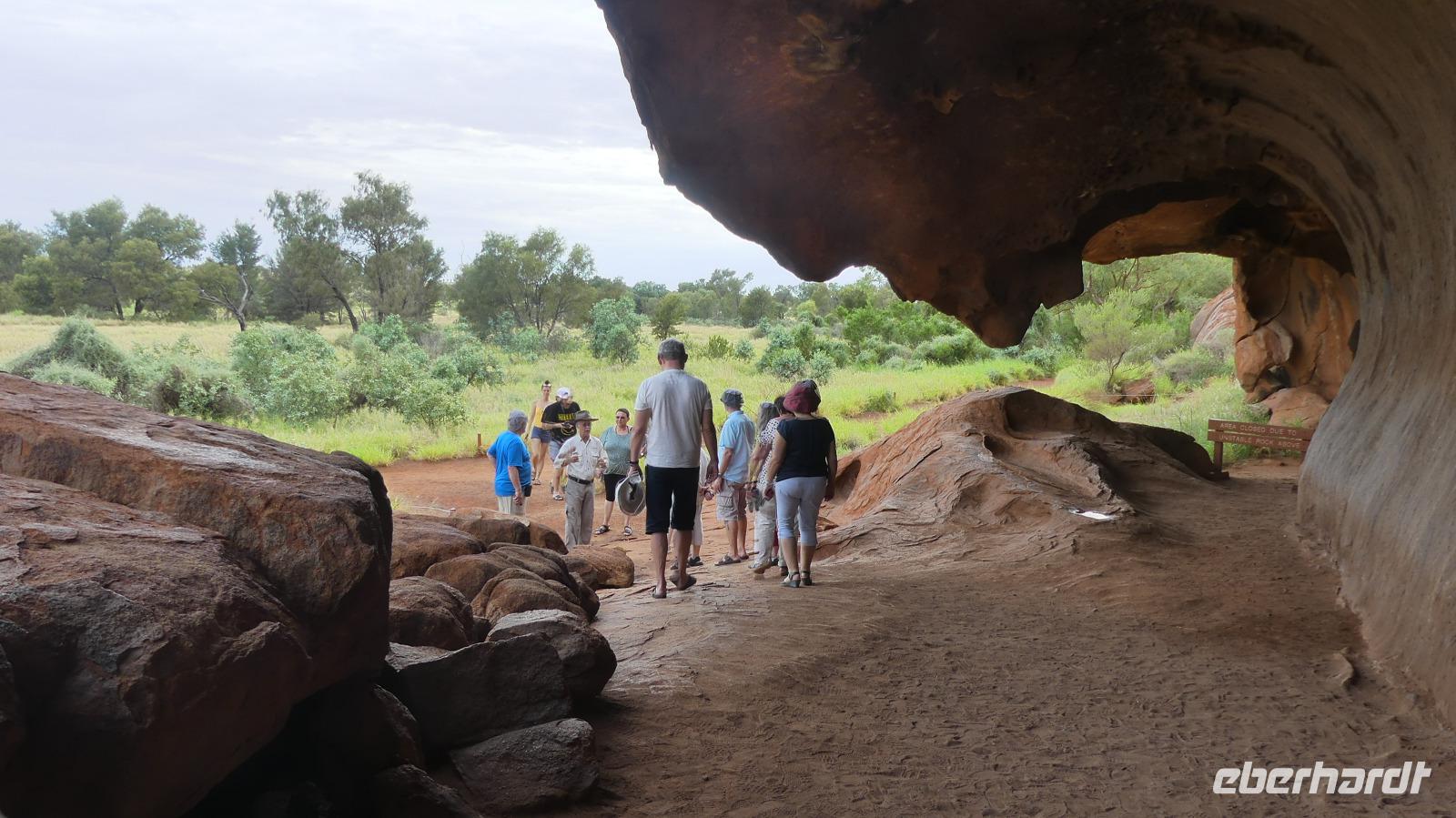 Wie heißt es so schön „der frühe Vogel fängt den Wurm", in unserem Fall bedeutet das um 4.30 aufstehen, wenn man den Sonnenaufgang am Uluru sehen möchte. Immerhin wäre es nach Sydney-Zeit schon 6.00 Uhr.... Auch für den Sonnenaufgang gibt es den Beobachtungspunkt, wo wir uns in Stellung bringen. Hier liegt der Inselberg mit seiner von Länge von etwa 3,5 Kilometer vor uns. Wieder fragen wir uns, ob die Wolken der Sonne Platz machen werden? Ja zumindest für 2-3 Minuten wechselt der Uluru seine Farbe teilweise von grau zu dunkelrot. Bei unseren sich anschließenden kleinen Wanderungen direkt am Ayers Rock kommt dann die kräftige rotbraune Färbung besser zur Geltung. Aus der Nähe sehen wir gut verschiedene Gesteinsformationen. Marcel erklärt uns wie die Ureinwohner diese deuten und welche Geschichten sie damit verbinden (> Traumzeit-Erzählungen). Davon zeugen auch alte Felsmalereien. An einer anderen Stelle sehen wir die wohl markanteste Formation „das Gehirn". Nach dem Frühstück sind wir nochmals am Uluru, laufen zu einem Wasserloch mit Wasserfall. Es ist immer wieder faszinierend, wie detailliert sich Marcel in der Tier- und Pflanzenwelt auskennt und offensichtlich durch einen guten Draht zu den Ureinwohnern von deren Wissen schöpft. Am liebsten würde er wohl im ganzen Outback Unkraut jäten, zumindest zupft er immer wieder nach Australien eingeschleppte Pflanzen aus dem Boden. Was uns schmunzeln lässt, ist dieses „banbalala" welches die Jäger von sich geben und Marcel so wunderbar vortragen kann.
