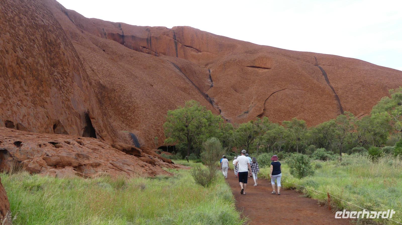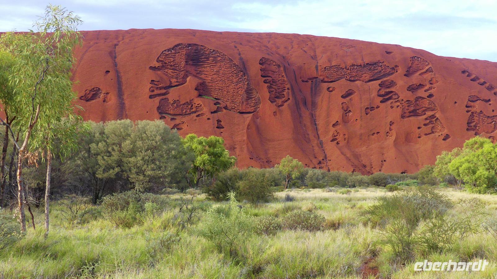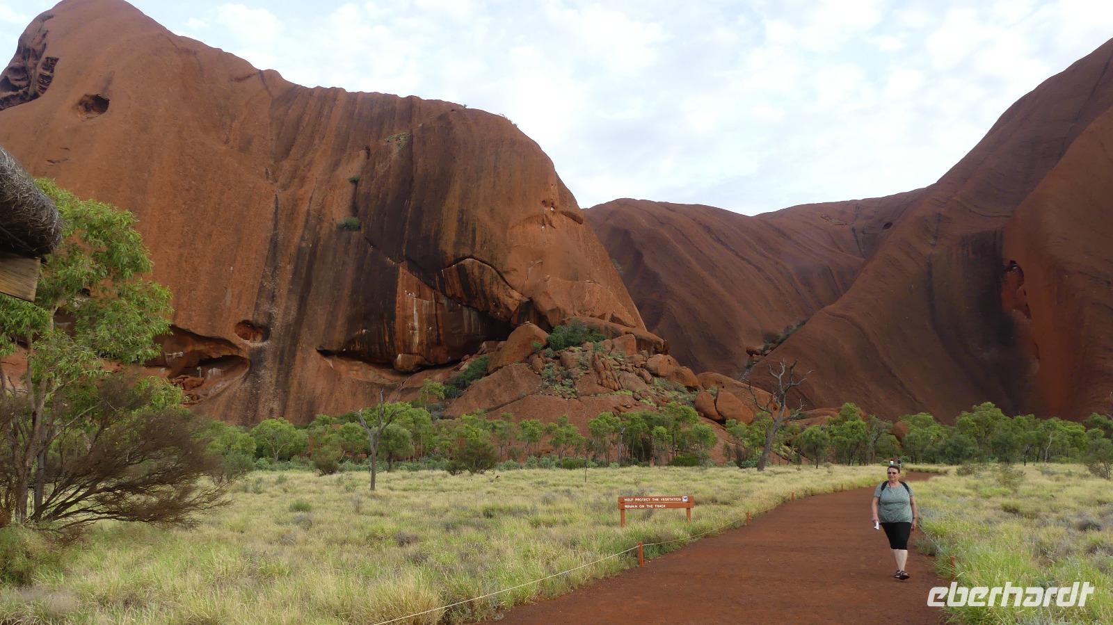 Wie heißt es so schön „der frühe Vogel fängt den Wurm", in unserem Fall bedeutet das um 4.30 aufstehen, wenn man den Sonnenaufgang am Uluru sehen möchte. Immerhin wäre es nach Sydney-Zeit schon 6.00 Uhr.... Auch für den Sonnenaufgang gibt es den Beobachtungspunkt, wo wir uns in Stellung bringen. Hier liegt der Inselberg mit seiner von Länge von etwa 3,5 Kilometer vor uns. Wieder fragen wir uns, ob die Wolken der Sonne Platz machen werden? Ja zumindest für 2-3 Minuten wechselt der Uluru seine Farbe teilweise von grau zu dunkelrot. Bei unseren sich anschließenden kleinen Wanderungen direkt am Ayers Rock kommt dann die kräftige rotbraune Färbung besser zur Geltung. Aus der Nähe sehen wir gut verschiedene Gesteinsformationen. Marcel erklärt uns wie die Ureinwohner diese deuten und welche Geschichten sie damit verbinden (> Traumzeit-Erzählungen). Davon zeugen auch alte Felsmalereien. An einer anderen Stelle sehen wir die wohl markanteste Formation „das Gehirn". Nach dem Frühstück sind wir nochmals am Uluru, laufen zu einem Wasserloch mit Wasserfall. Es ist immer wieder faszinierend, wie detailliert sich Marcel in der Tier- und Pflanzenwelt auskennt und offensichtlich durch einen guten Draht zu den Ureinwohnern von deren Wissen schöpft. Am liebsten würde er wohl im ganzen Outback Unkraut jäten, zumindest zupft er immer wieder nach Australien eingeschleppte Pflanzen aus dem Boden. Was uns schmunzeln lässt, ist dieses „banbalala" welches die Jäger von sich geben und Marcel so wunderbar vortragen kann.