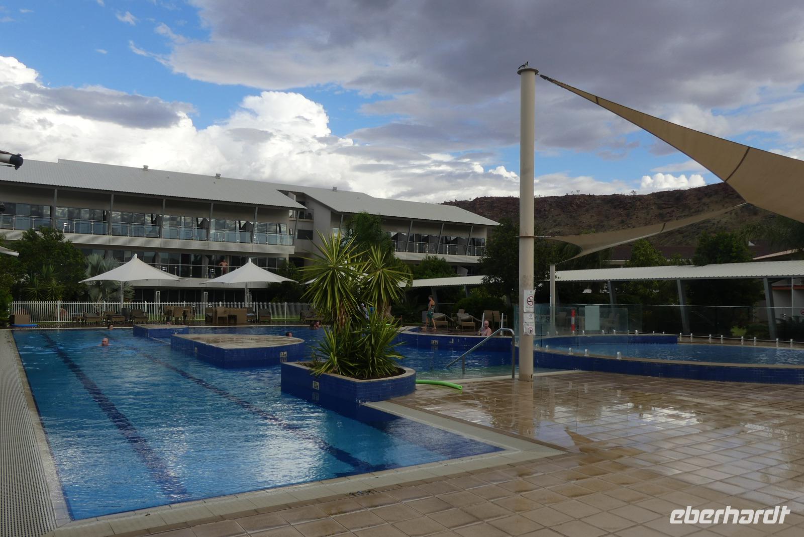 Nach einer Pause in unserem sehr schönen Hotel genießen wir noch ein leckeres 3-Gang-Menü im gemütlichen Overlander Steakhouse. Unter anderem gibt es Kostproben von Krokodil, Känguruh, Büffel und Kamel.
