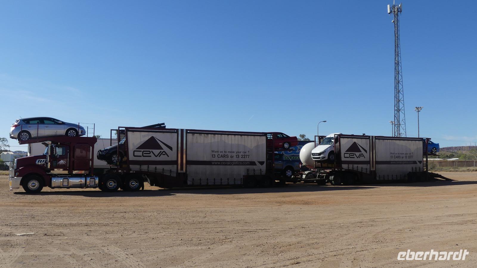 Am Morgen unternehmen wir einen Abstecher zu den Road Trains, bei uns würde man Gigaliner sagen, nur dass sie hier noch länger sein dürfen, nämlich bis 53,5 Meter. Sicherlich eine sinnvolle Transportvariante angesichts der Distanzen und dünn besiedelten Region. Nur dumm wenn man so einen Road Train als Autofahrer vor sich hat....