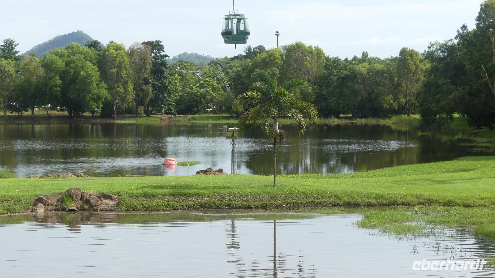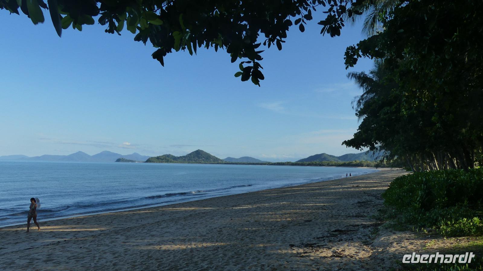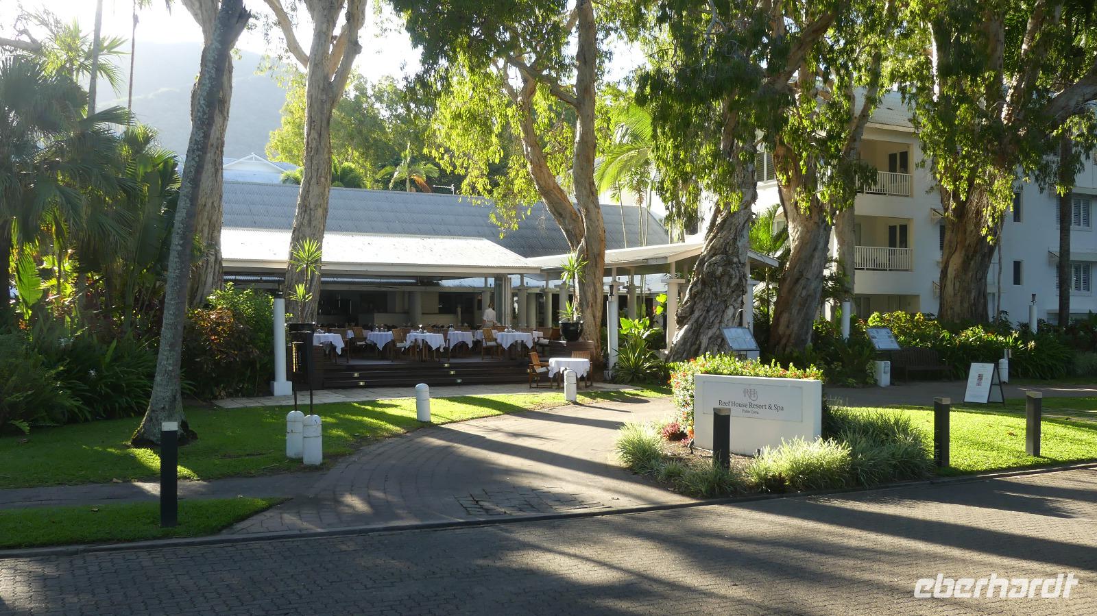Eine kleine Boeing vom Typ Boeing 717-200 fliegt uns in zwei Stunden von der Halbwüste an die tropische Küste im Bundesstaat Queensland. Reiseleiterin Gabi gibt uns auf dem Weg zum Hotel erste Informationen zur Region Cairns. Pünktlich checken wir am Nachmittag im Hotel in Palme Cove ein, eine schöne weitläufige und im üppigen Grün gelegene Anlage, wo sich auch Vögel und Wallabies wohlfühlen. Zum Strand ist es nicht weit, hier kann man schwimmen, vorsichtshalber in einem mit Netzen abgegrenzten Bereich, wo Quallen keine Chance haben. Palm Cove hat eine schicke Strandpromenade mit schicken Strandhäusern unter großen Schatten spendenden Bäumen. Vier Tage werden wir in diesem schönen Ort übernachten.