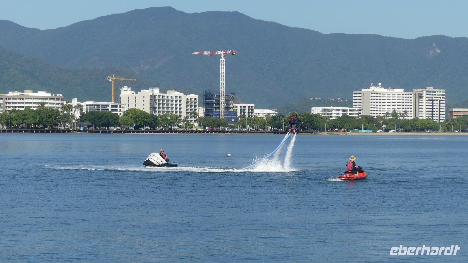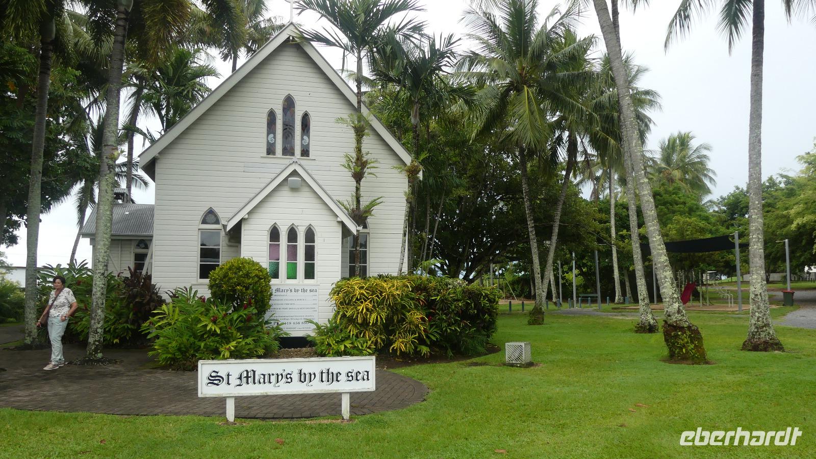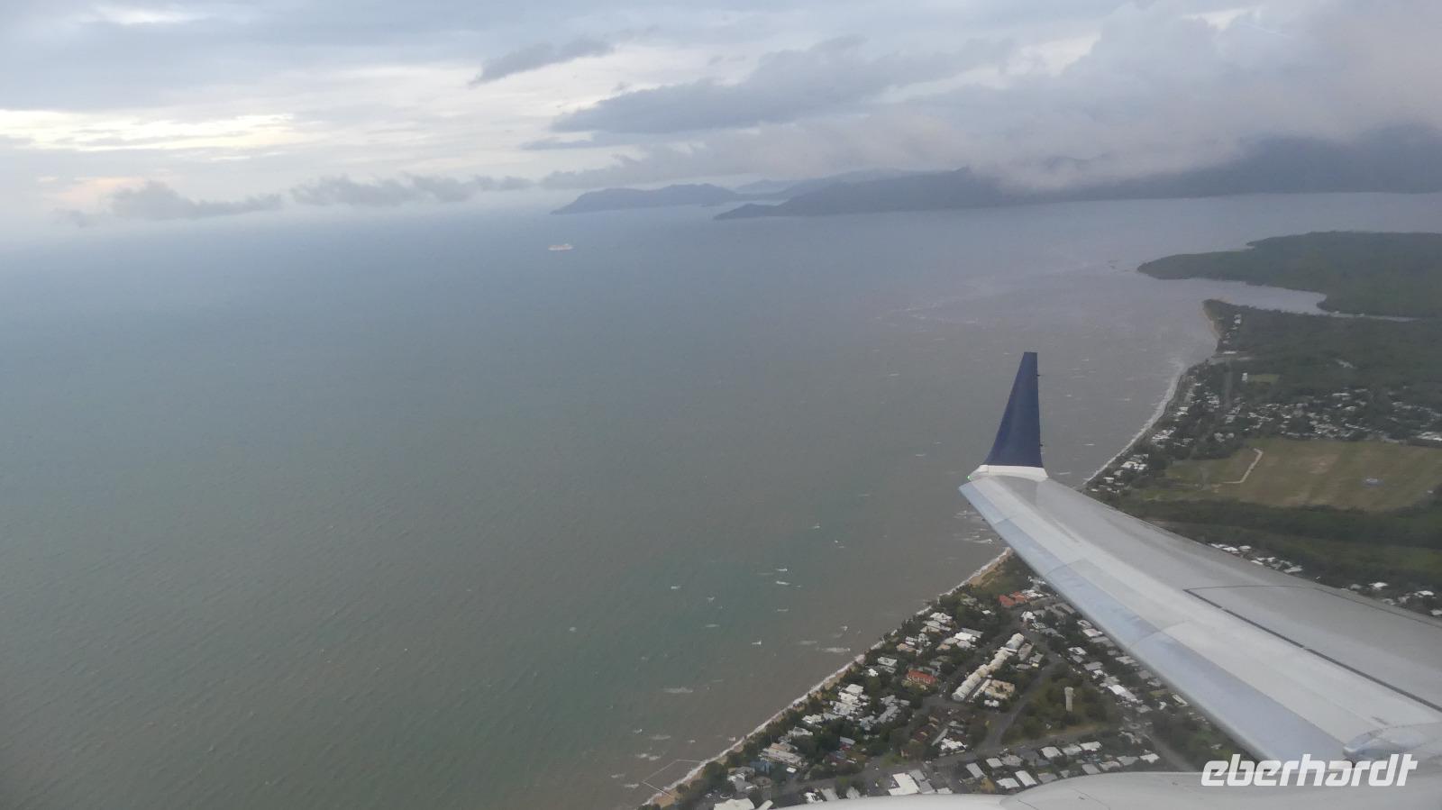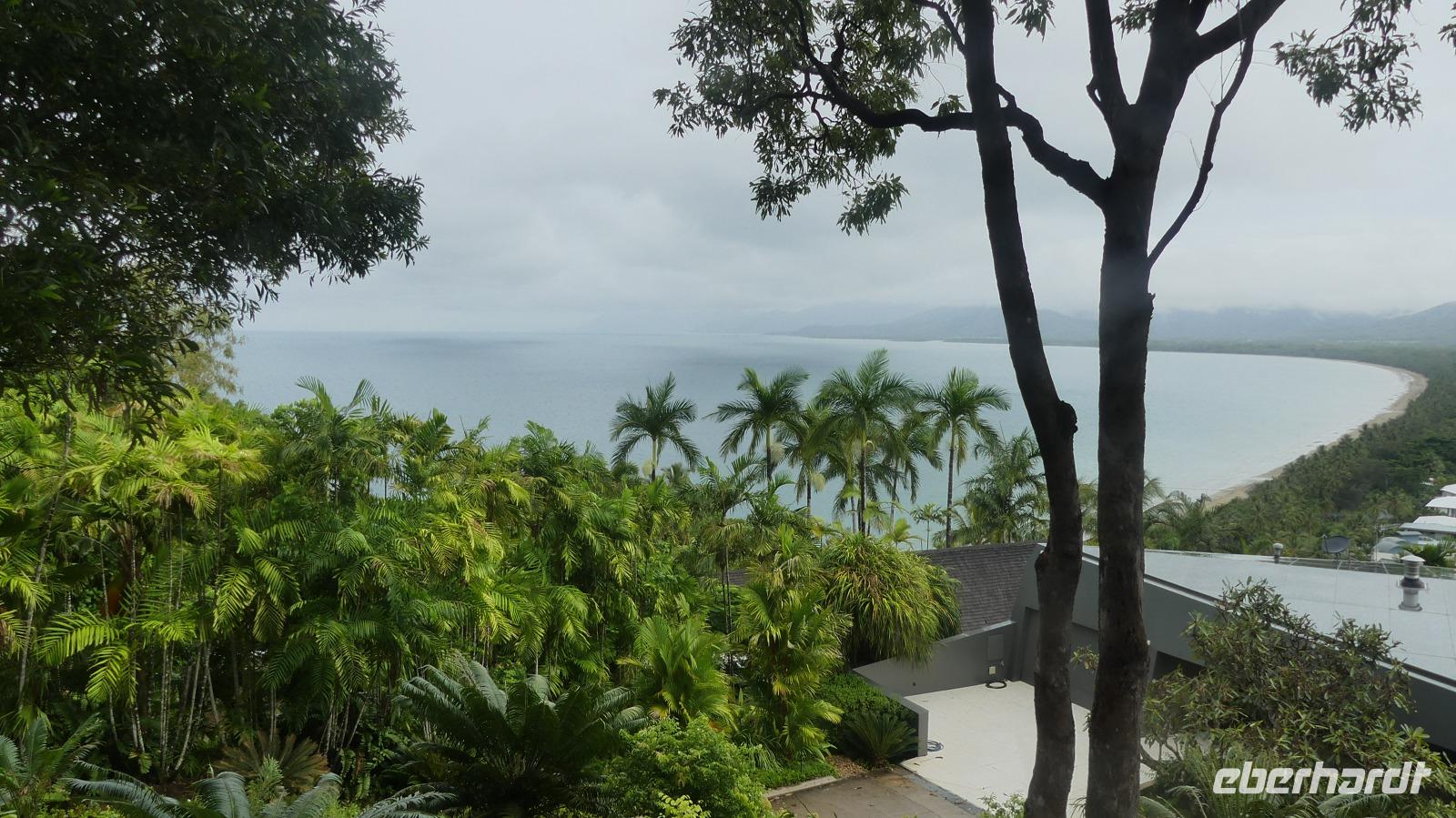 Eine kleine Boeing vom Typ Boeing 717-200 fliegt uns in zwei Stunden von der Halbwüste an die tropische Küste im Bundesstaat Queensland. Reiseleiterin Gabi gibt uns auf dem Weg zum Hotel erste Informationen zur Region Cairns. Pünktlich checken wir am Nachmittag im Hotel in Palme Cove ein, eine schöne weitläufige und im üppigen Grün gelegene Anlage, wo sich auch Vögel und Wallabies wohlfühlen. Zum Strand ist es nicht weit, hier kann man schwimmen, vorsichtshalber in einem mit Netzen abgegrenzten Bereich, wo Quallen keine Chance haben. Palm Cove hat eine schicke Strandpromenade mit schicken Strandhäusern unter großen Schatten spendenden Bäumen. Vier Tage werden wir in diesem schönen Ort übernachten.
