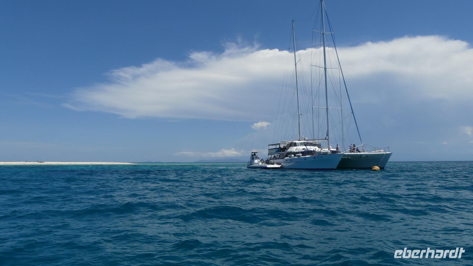 Eine Koralleninsel im Pazifik, so ca. 400 Meter lang, maximal zwei Meter aus dem Meer ragend, das ist unser heutiges Ziel. Michaelmas Cay liegt zwei Bootsstunden vor der Küste von Queensland und ist Teil des größten Korallenriffs der Welt, dem Great Barrier Reef. Unser Katamaran ankert mit etwas Abstand von der Insel im klaren türkisblauen Wasser. Hin und wieder kommen Fische vorbei und eine grüne Suppenschildkröte steckt während unseres Aufenthaltes immer mal den Kopf aus dem Wasser.