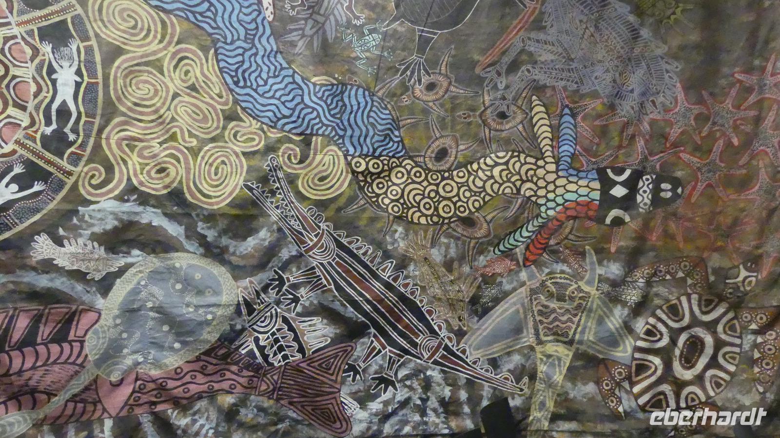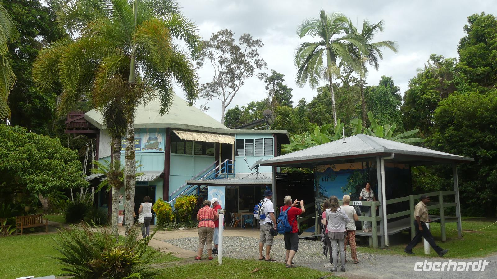 Tjapukai ist der Name eines Kulturzentrums der Ureinwohner. „Kulturzentrum" klingt etwas banal, ist aber eine wirklich interessante Einrichtung, in der die Ureinwohner ihre Traditionen vorstellen. In unserem Fall ist es „rollender Stein" oder wie ich ihn nenne „Mister Easy". Er führt uns vor, wie man einen Bumerang und einen Schleuderspeer wirft und ein Didgeridoo spielt - alles „easy". Erstaunlich auch seine Informationen zu Pflanzen und Früchten, zum Beispiel wie giftige Früchte behandelt werden, um sie essen zu können. Ich frage mich, warum man sich diese Mühe mit dem Entgiften machte, müsste es im Regenwald nicht genügend essbare Früchte geben? Die für mich erstaunliche Antwort darauf wird uns Gabi bald geben. Tjapukai verabschiedet sich mit einer kleinen Tanzshow, an der auch „Mr. Easy" teilnimmt (und auch da seine Späßchen dabei macht).