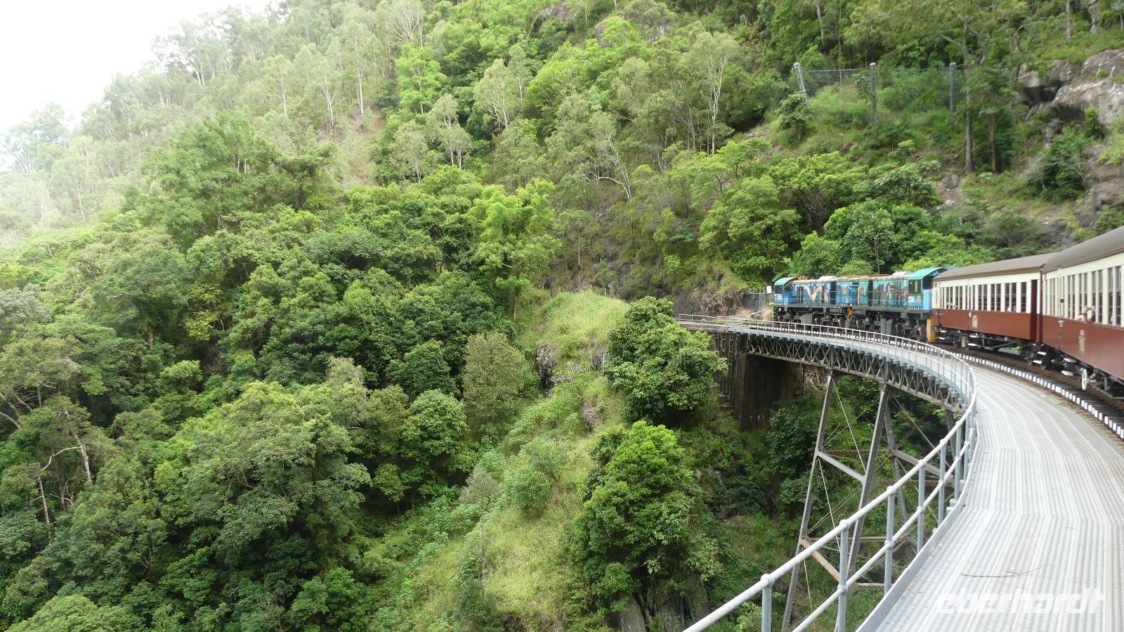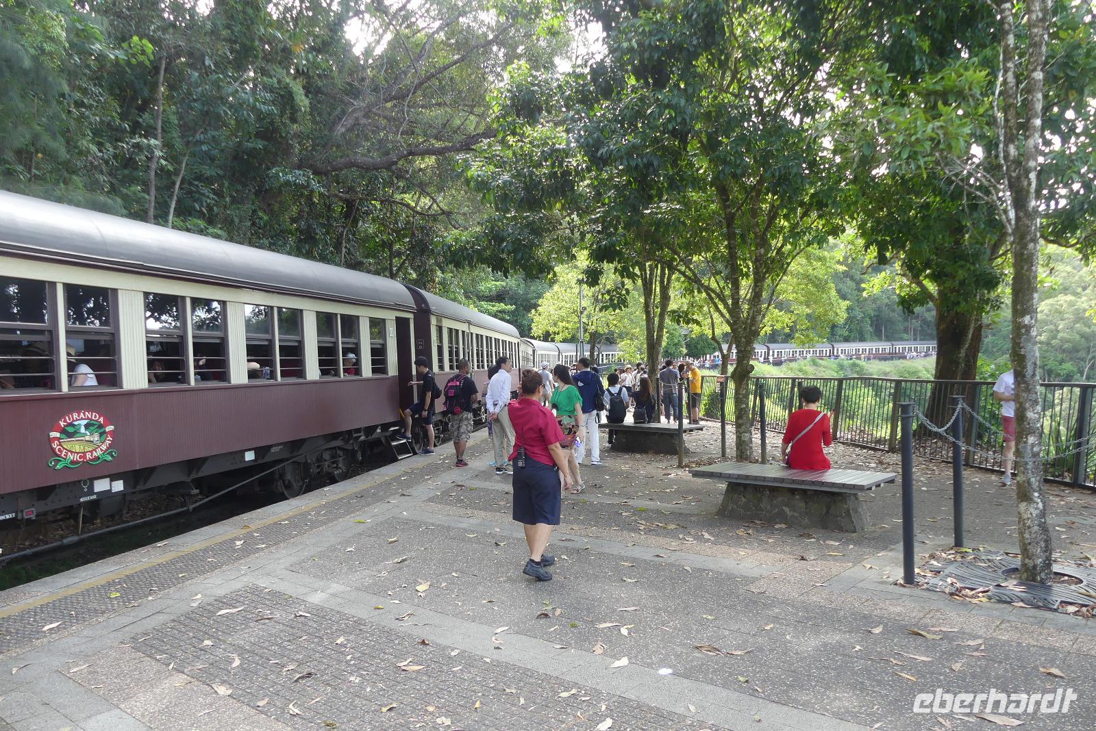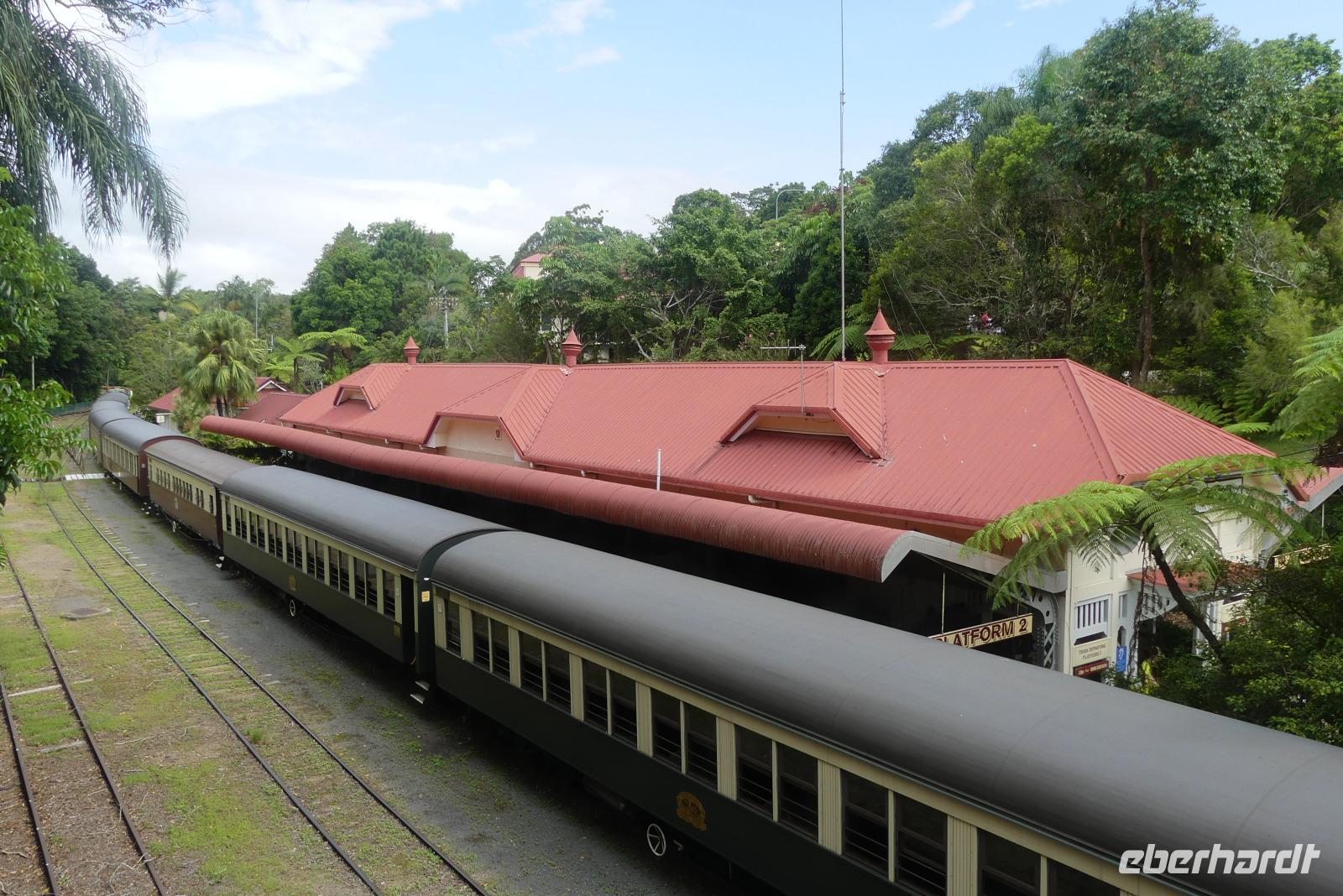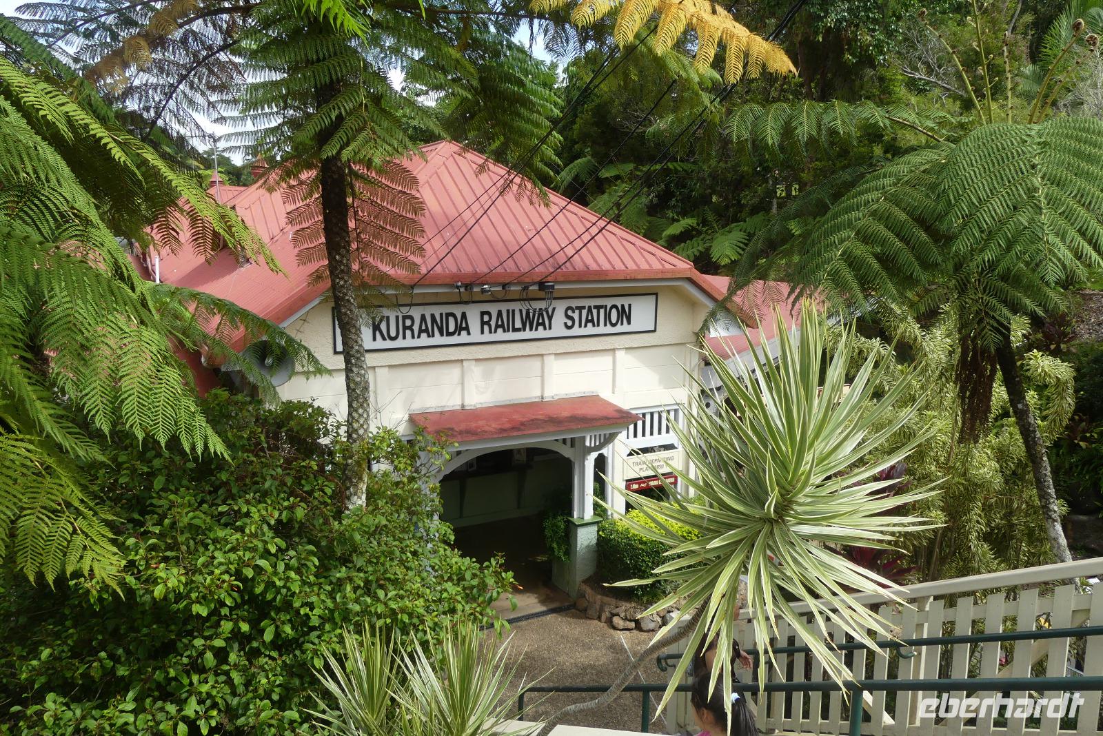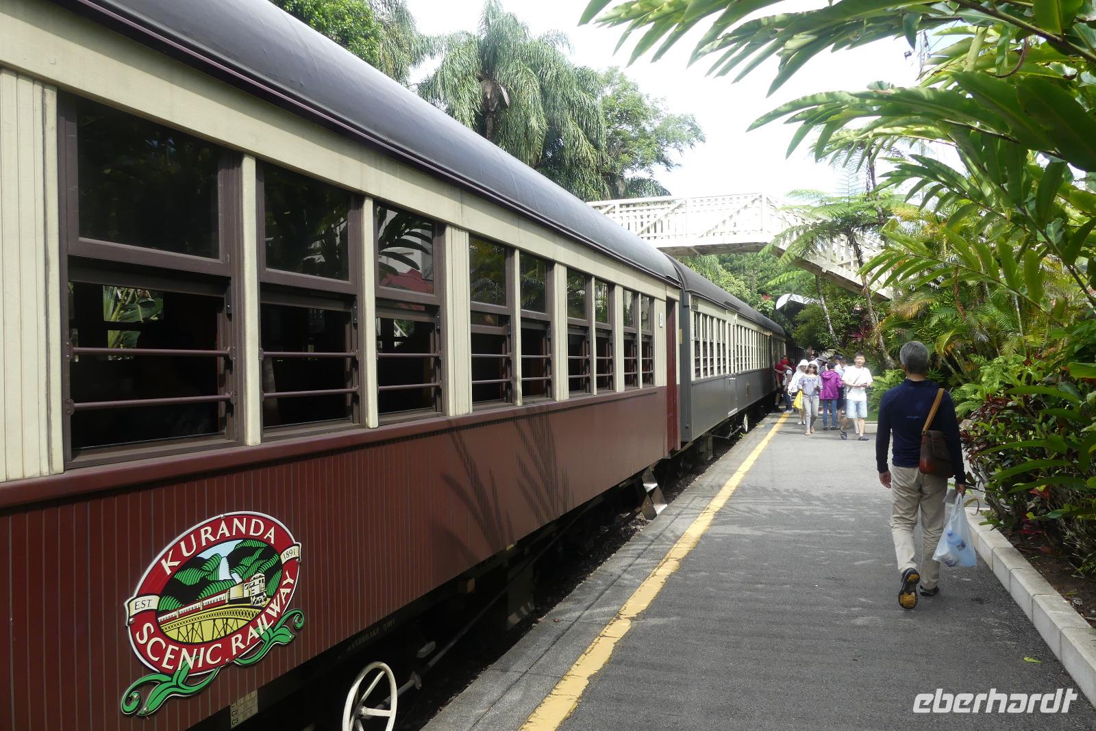 Gleich nebenan steigen wir in eine Gondelbahn. Auch eine nicht ganz gewöhnliche. Das Besondere an ihr ist, dass sie dicht über den Baumkronen des Regenwaldes verläuft und man so aus geringer Höhe einen Einblick von oben in den Wald bekommt. Die 7,5 Kilometer lange Bahn hat zwei Umsteigestationen, dort unternimmt Gabi mit uns Abstecher in den Regenwald. So sehen wir den mächtigen Kauri-Fichte, Korbfarne und urformen verschiedener Pflanzen. Am Aussichtspunkt zum Barron Fluß und Barron Wasserfall begegnet uns ein riesiger blauer Schmetterling - ich habe nachgeschlagen und glaube es war ein blauer Odysseusfalter, einer oder vielleicht sogar der größte Schmetterling Australiens. Am Ende der Gondelfahrt liegt Kuranda, ein kleiner Ort, der vom Tourismus lebt und je nach Blickwinkel Ausgangs- oder Endpunkt der historischen Eisenbahn Kuranda Scenic Railway ist. Für uns ist die kleine malerische (1915 gebaut) Ausgangspunkt für die Bahnfahrt durch den Regenwald zurück zur Küste. Einst war die Eisenbahn die einzige zuverlässige Verbindung ins Hinterland und entsprechend wichtig für dessen Versorgung. Nach dem Beginn des Goldrausches wurde sie in nur fünf Jahren von 1886 bis 1891 erbaut. Heute transportiert sie Besucher des Nationalparks und deshalb macht diese Eisenbahn auch Fotostopps, in unserem Fall für ein Foto von der tiefen Schlucht des Barron River mit Wasserfall. Nächster Halt: Freshwater Station, ein im Stil der Jahrhundertwende erbaute Bahnstation, Endpunkt unserer Bahnfahrt und unseres heutigen Programms.