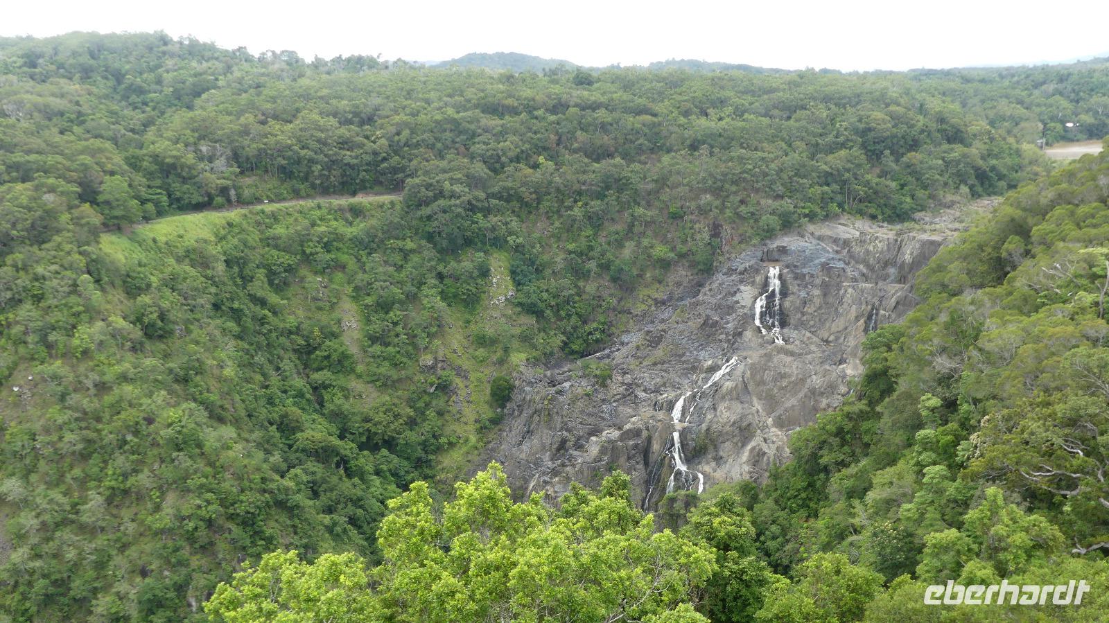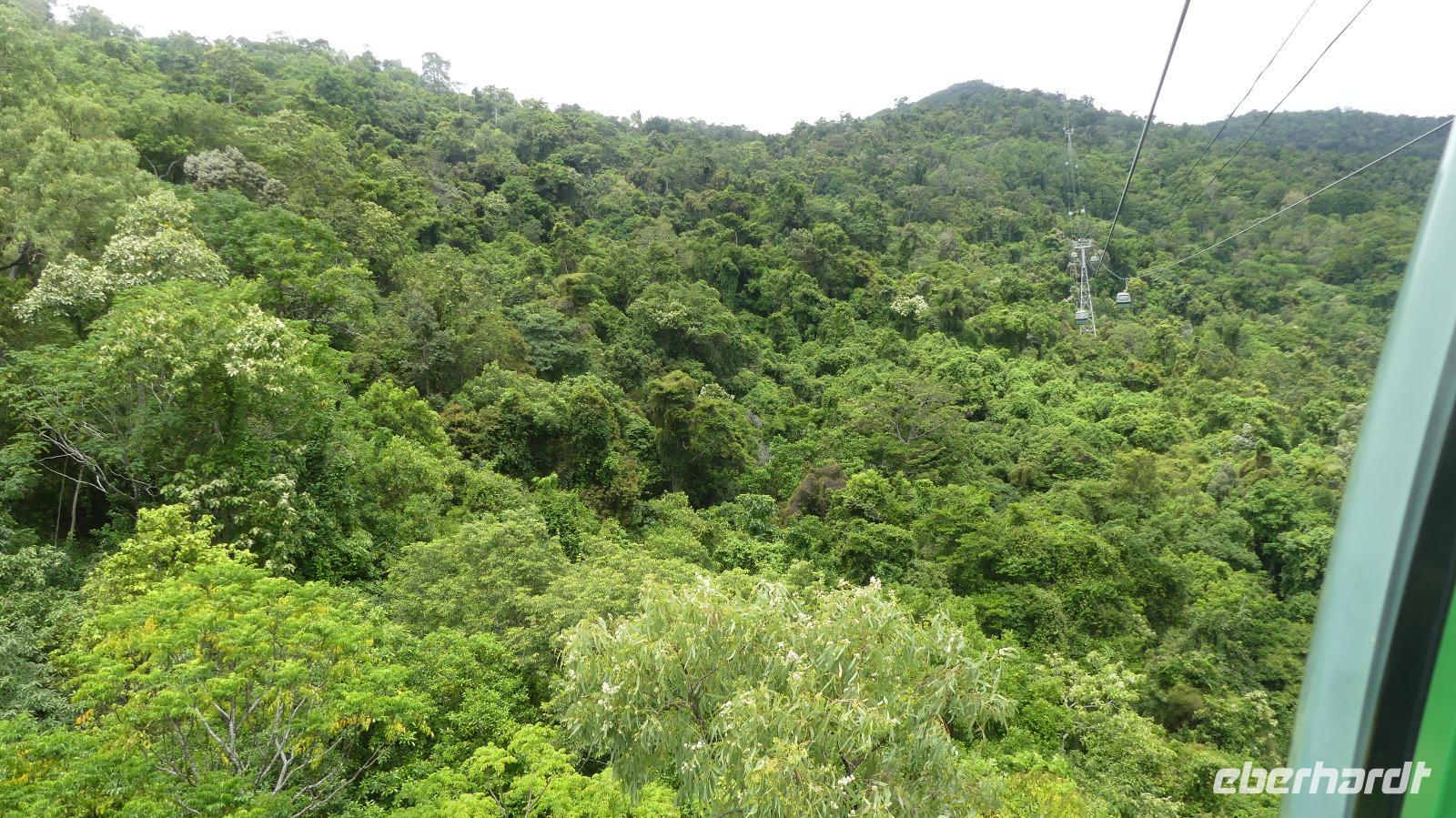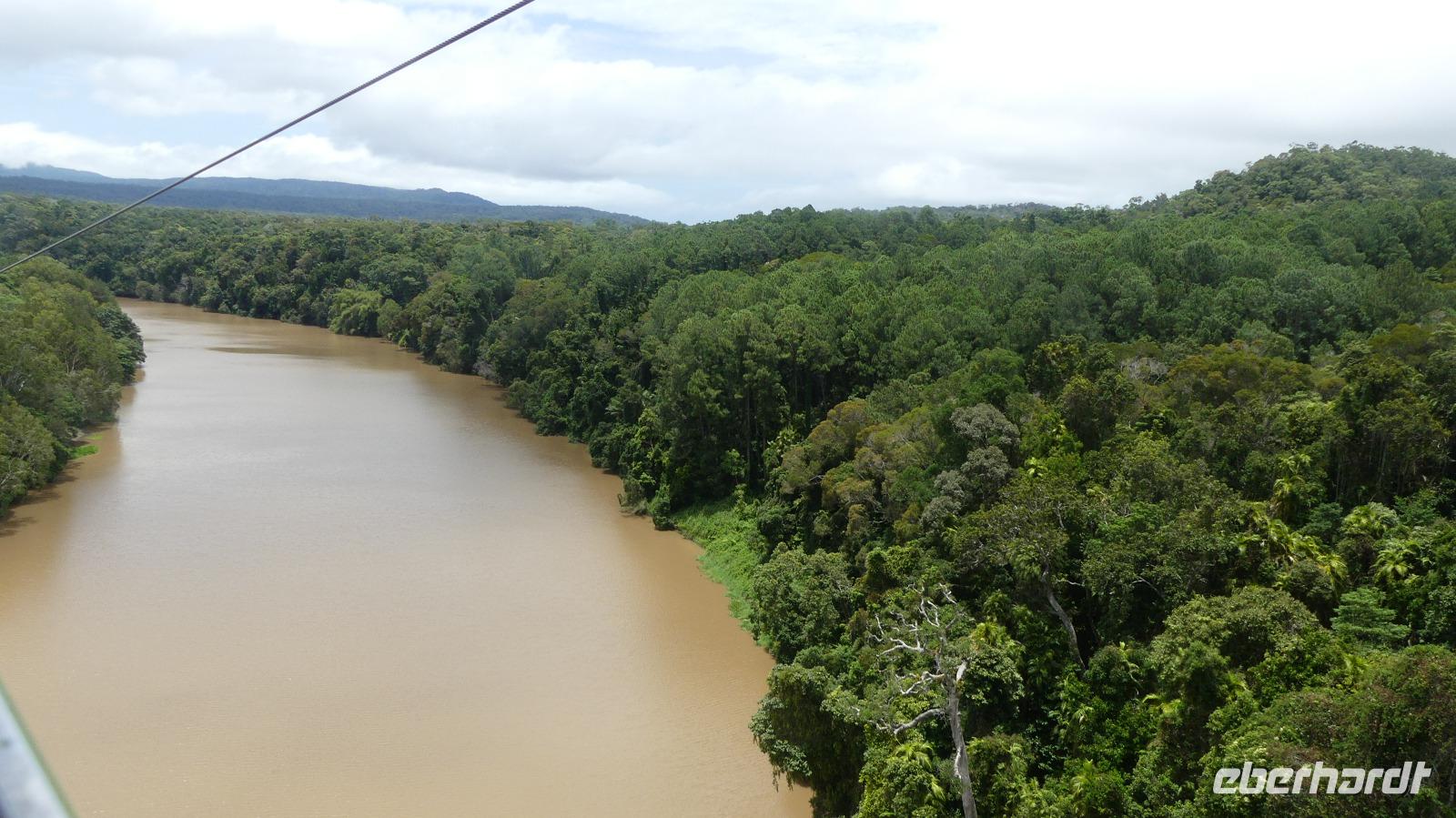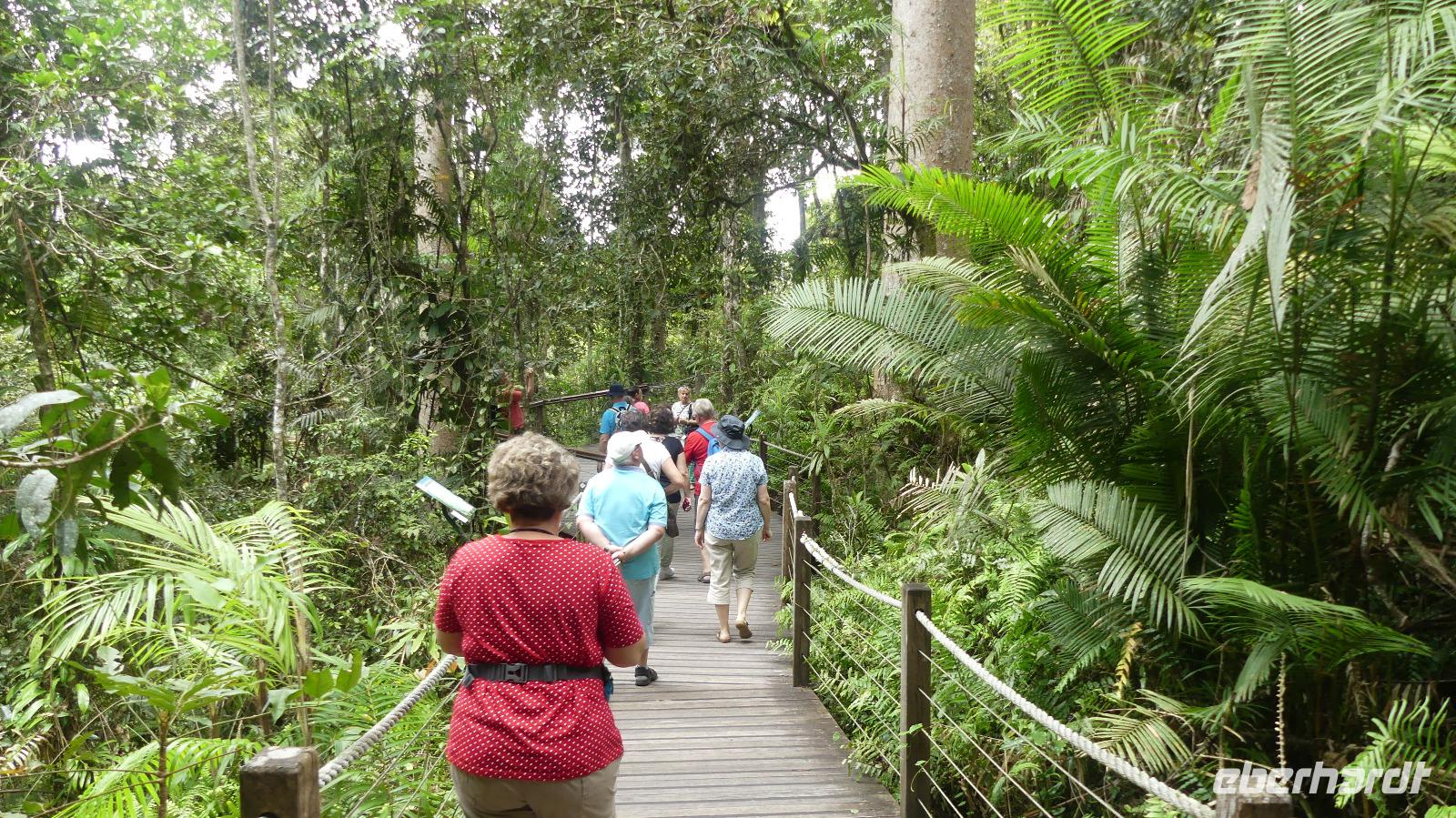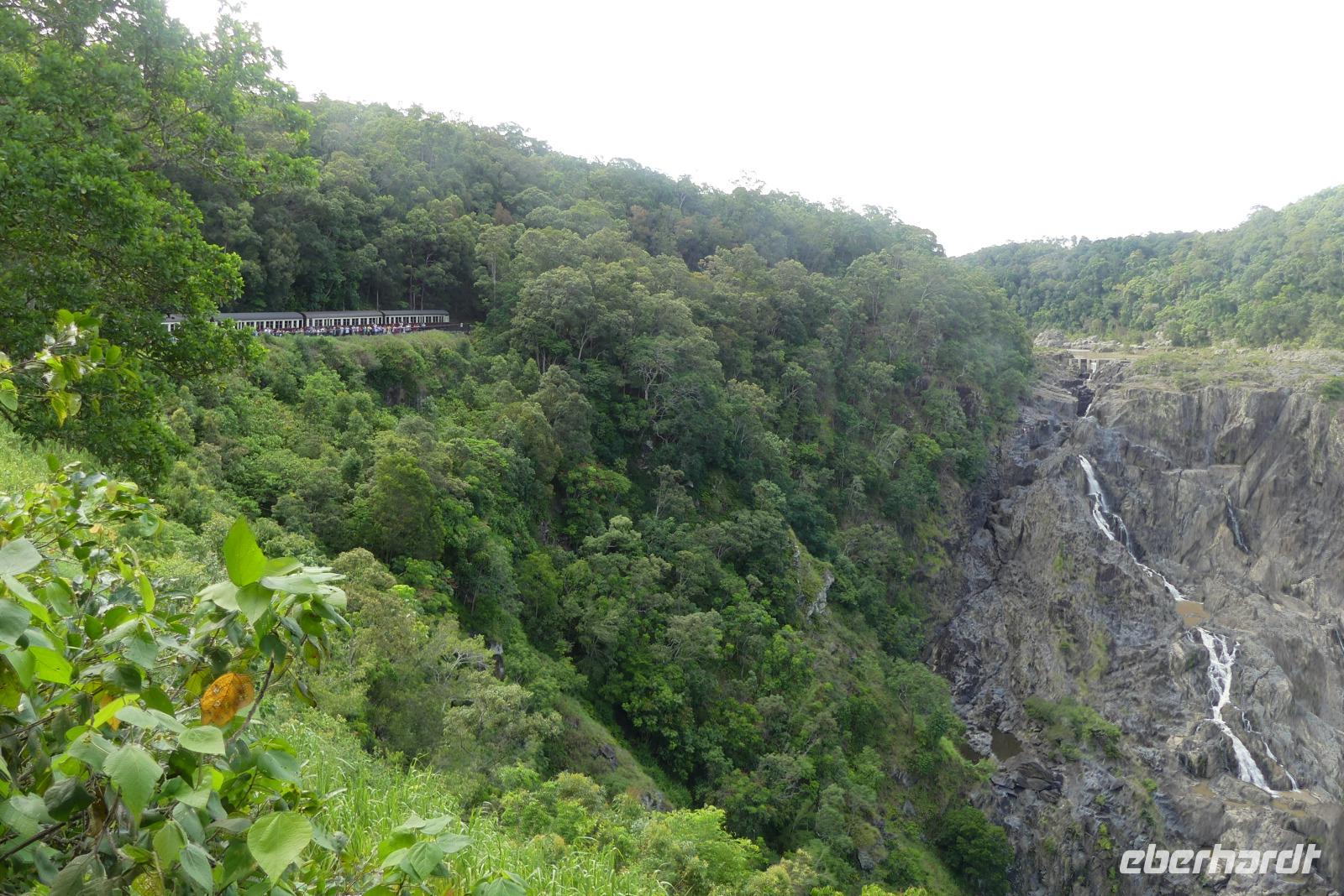 Gleich nebenan steigen wir in eine Gondelbahn. Auch eine nicht ganz gewöhnliche. Das Besondere an ihr ist, dass sie dicht über den Baumkronen des Regenwaldes verläuft und man so aus geringer Höhe einen Einblick von oben in den Wald bekommt. Die 7,5 Kilometer lange Bahn hat zwei Umsteigestationen, dort unternimmt Gabi mit uns Abstecher in den Regenwald. So sehen wir den mächtigen Kauri-Fichte, Korbfarne und urformen verschiedener Pflanzen. Am Aussichtspunkt zum Barron Fluß und Barron Wasserfall begegnet uns ein riesiger blauer Schmetterling - ich habe nachgeschlagen und glaube es war ein blauer Odysseusfalter, einer oder vielleicht sogar der größte Schmetterling Australiens. Am Ende der Gondelfahrt liegt Kuranda, ein kleiner Ort, der vom Tourismus lebt und je nach Blickwinkel Ausgangs- oder Endpunkt der historischen Eisenbahn Kuranda Scenic Railway ist. Für uns ist die kleine malerische (1915 gebaut) Ausgangspunkt für die Bahnfahrt durch den Regenwald zurück zur Küste. Einst war die Eisenbahn die einzige zuverlässige Verbindung ins Hinterland und entsprechend wichtig für dessen Versorgung. Nach dem Beginn des Goldrausches wurde sie in nur fünf Jahren von 1886 bis 1891 erbaut. Heute transportiert sie Besucher des Nationalparks und deshalb macht diese Eisenbahn auch Fotostopps, in unserem Fall für ein Foto von der tiefen Schlucht des Barron River mit Wasserfall. Nächster Halt: Freshwater Station, ein im Stil der Jahrhundertwende erbaute Bahnstation, Endpunkt unserer Bahnfahrt und unseres heutigen Programms.
