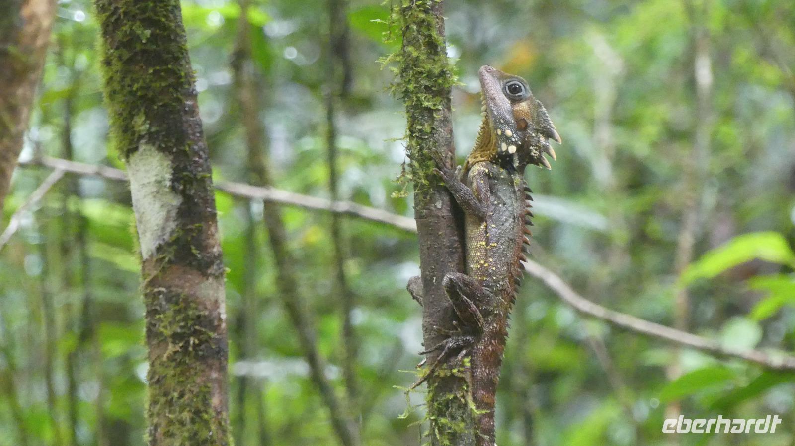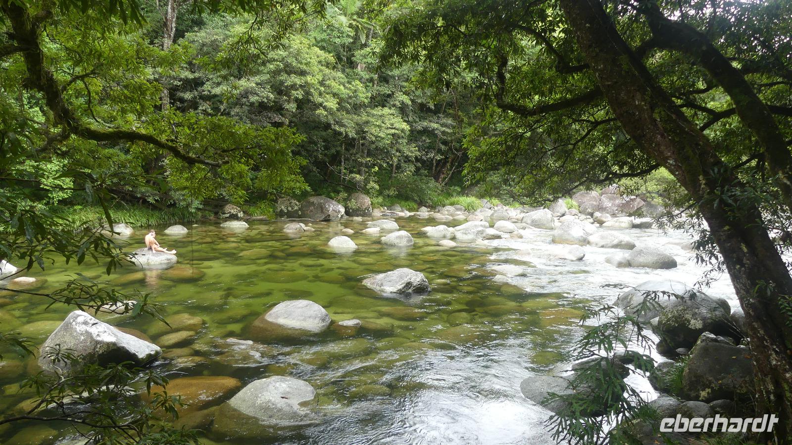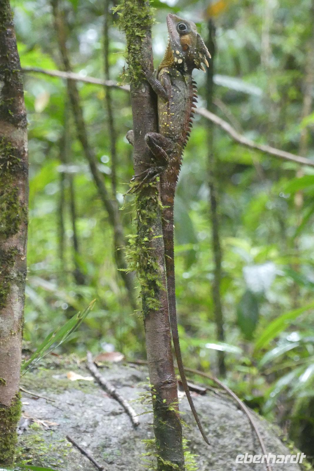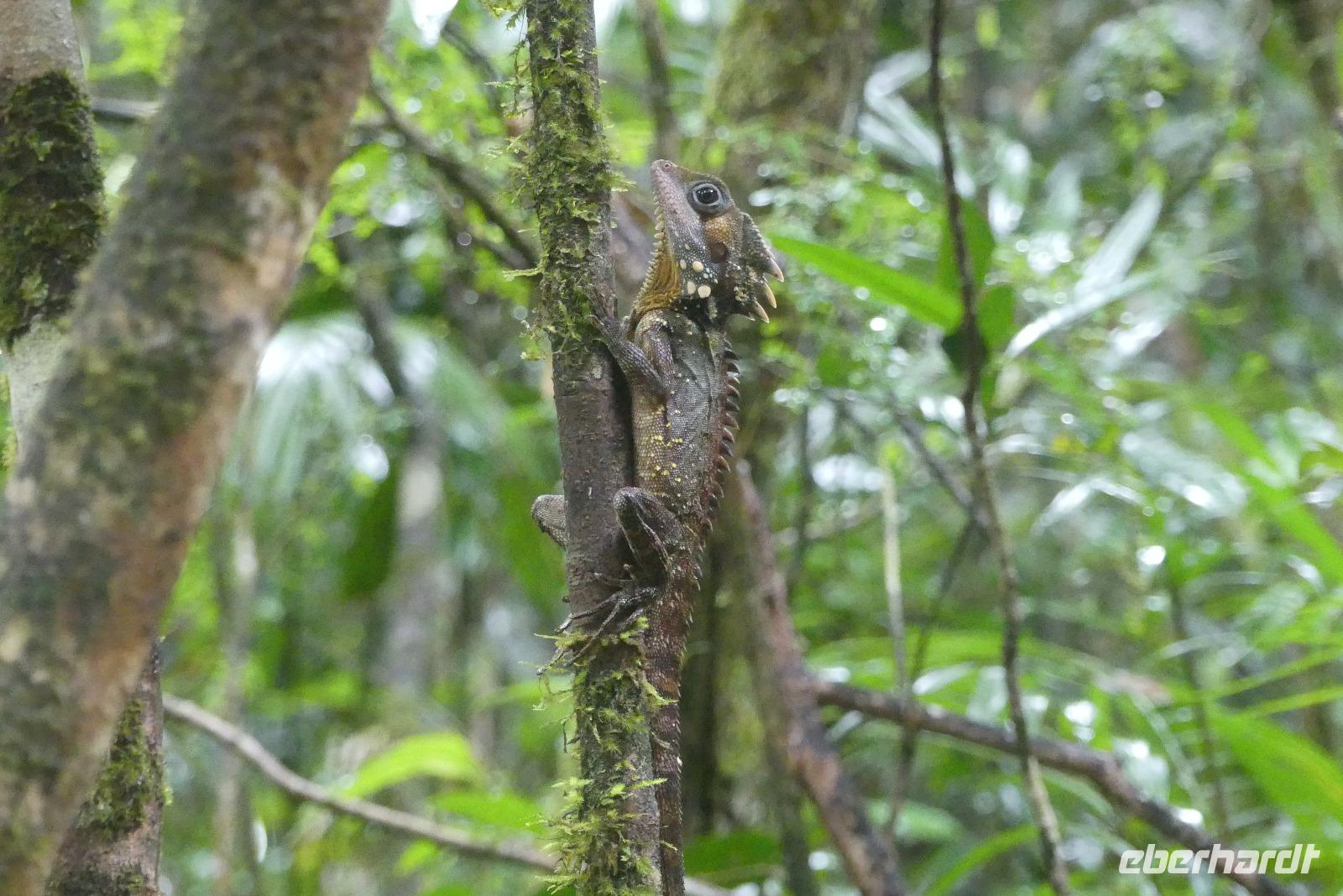 Am Zugang zur Mossman Schlucht ist unser erster Halt. Ein Ureinwohner demonstriert uns wie Naturfarben hergestellt werden und M. aus unserer Gruppe bekommt eine Naturfarbenmalerei auf ihren Unterarm. Pünktlich zu Beginn unserer Wanderung in der Mossman Gorge hört es auf zu regnen, so ist der Regenwald frisch gewaschen. Es ist ein Ausflug wie in ein lebendes Museum. Denn aus Zeiten von Gondwana, als Regenwälder entstanden, sind Pflanzen in ihrer ursprünglichen Form erhalten, weil es für sie keine Evolution gab. So sind auch Früchte in ihrer Urform erhalten, oft giftig, während weiterentwickelte Formen auf anderen Kontinenten begehrte Früchte sind. Beispiele sind Kaki oder die praktisch nicht genießbare Banane mit steinharten Kernen. Heute sind diese Urformen ein wertvoller Genpool. Für uns ist es, wenn man so will in gewisser Weiße ein Ausflug nach Gondwana. „Die hiesigen Wälder sind mit rund 120 Mio Jahren die ältesten ständig überlebenden tropischen Regenwälder der Erde. Durch diesen Wald streiften einst Dinosaurier und hier öffneten einige der ersten Blütenpflanzenarten der Welt ihre Blüten" (Quelle: Infoflyer des Nationalparks). Auch einige Waldbewohner wie der Walddrache (siehe Foto) oder der Cossowary (aggresiver und größter Laufvogel Australien, deutsche Schreibweise Kasuar), dem wir besser nicht begegnen, sind urzeitliche Relikte.