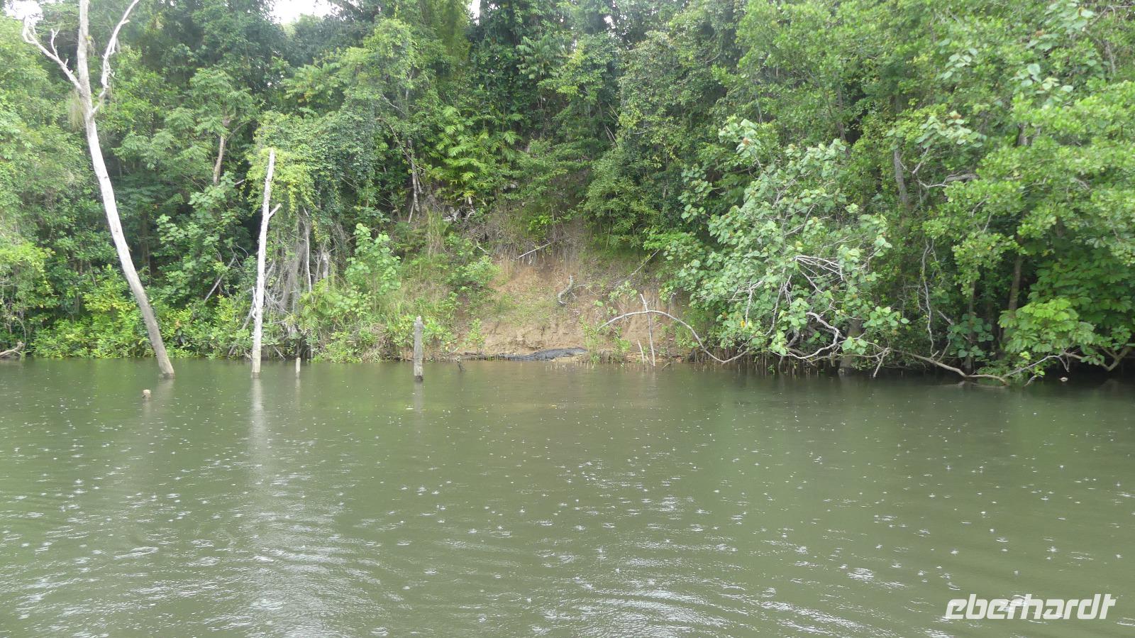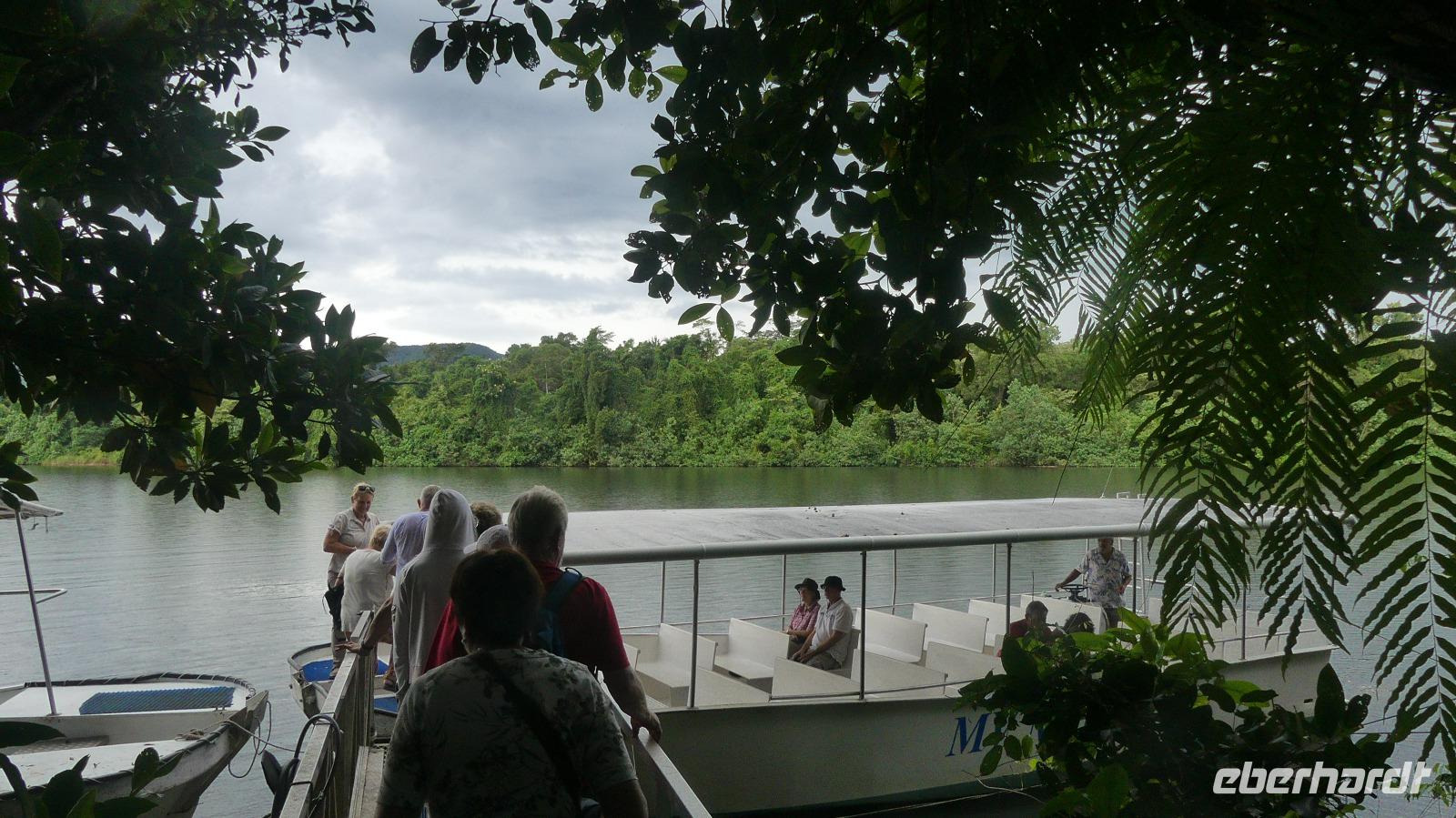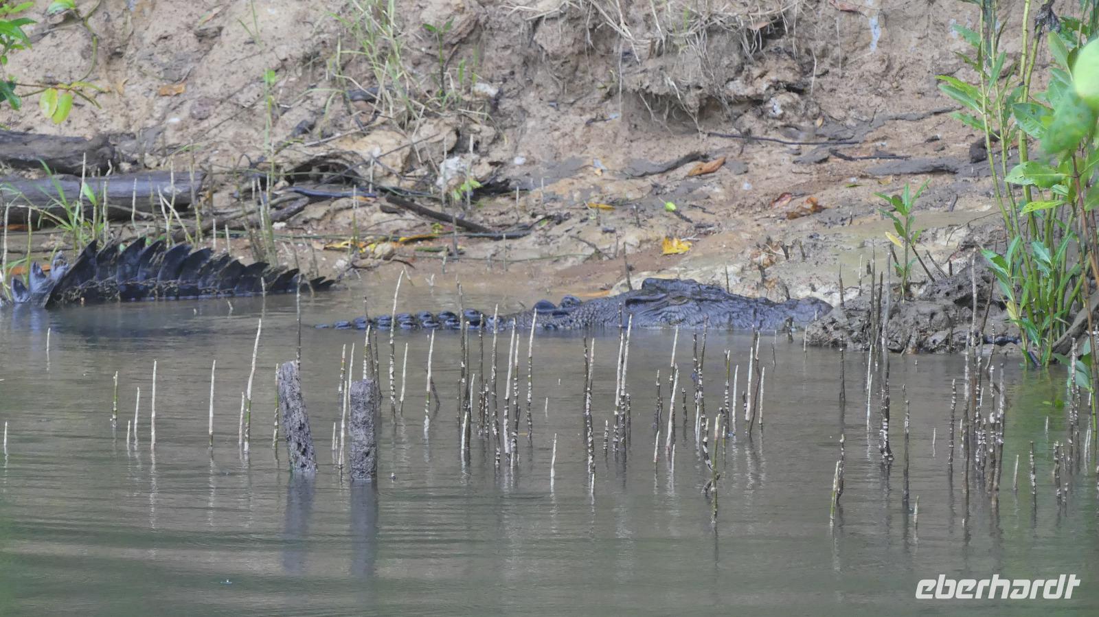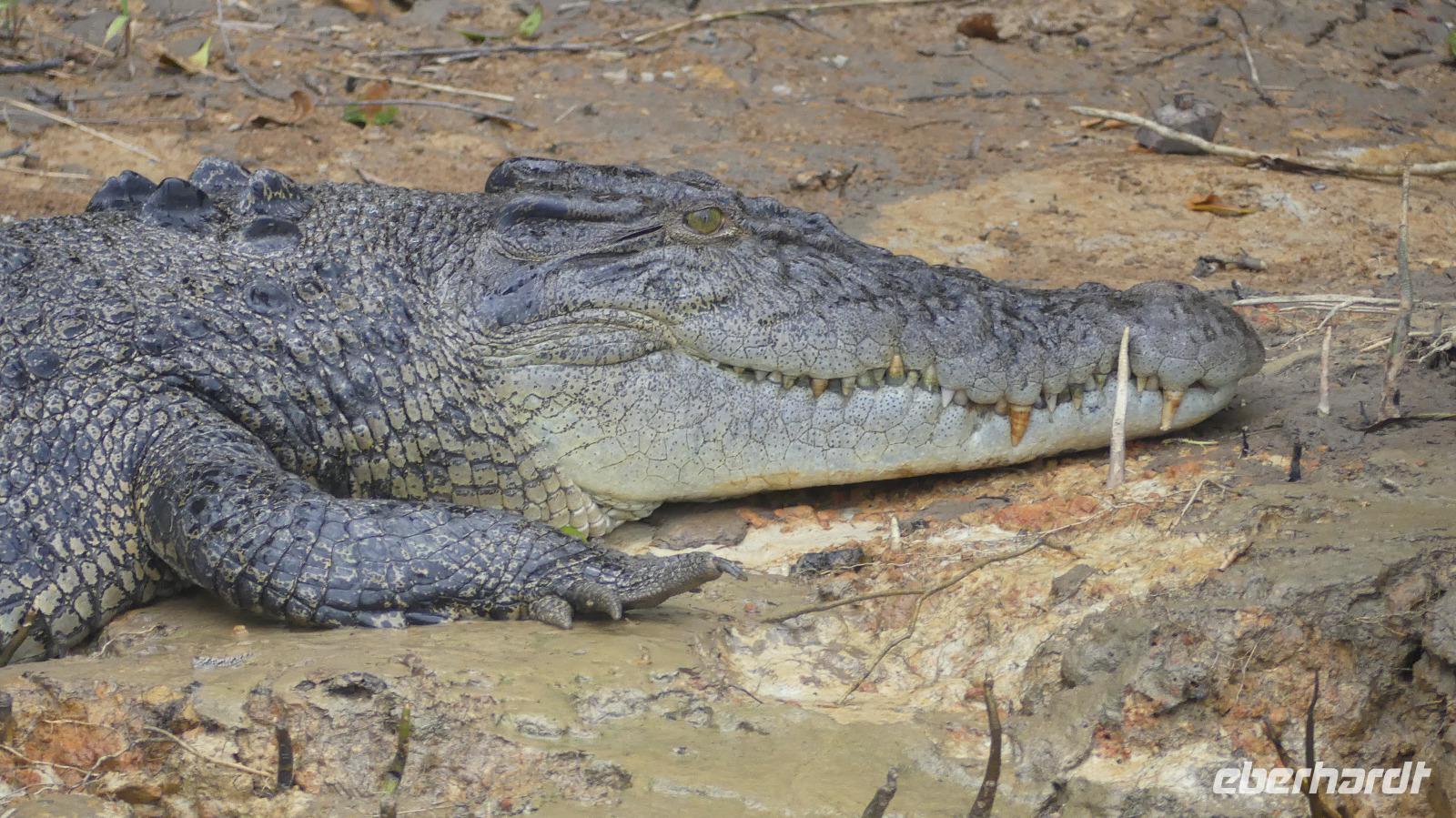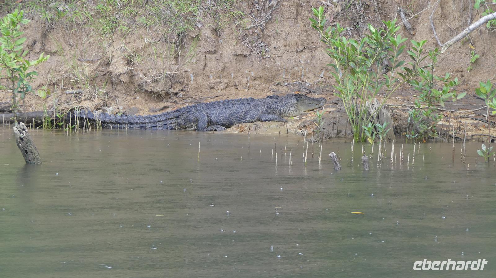 Nach dem Essen folgt eine entspannte Bootsfahrt auf dem Daintree Fluß. Der Fluß wird von dichtem, undurchlässigen Regen- und Mangrovenwald gesäumt, im Hintergrund ragt der 1.374 hohe Thornton Peak aus dem Wald und wir hoffen darauf, vielleicht ein Krokodil zu sehen. Wir müssen auch gar nicht lang warten, dann erblicken wir am Flussufer ein prächtiges Exemplar von geschätzten 4,5 Meter Länge. Ganz ruhig liegt es in der Sonne. Der Bootsausflug hat sich schon mal gelohnt, alles was jetzt noch kommt ist Zugabe: Da ist der Mangrovenreiher mit Nachwuchs im Nest, einen flauschigen Kopf kann man im Nest erkennen. Auch einen strahlend blauen Azurkingfischer (verwandt mit den Eisvögeln) sehen wir. Und Gabi erklärt uns das Ökosystem der Mangroven.