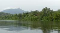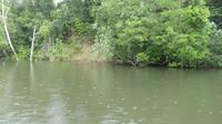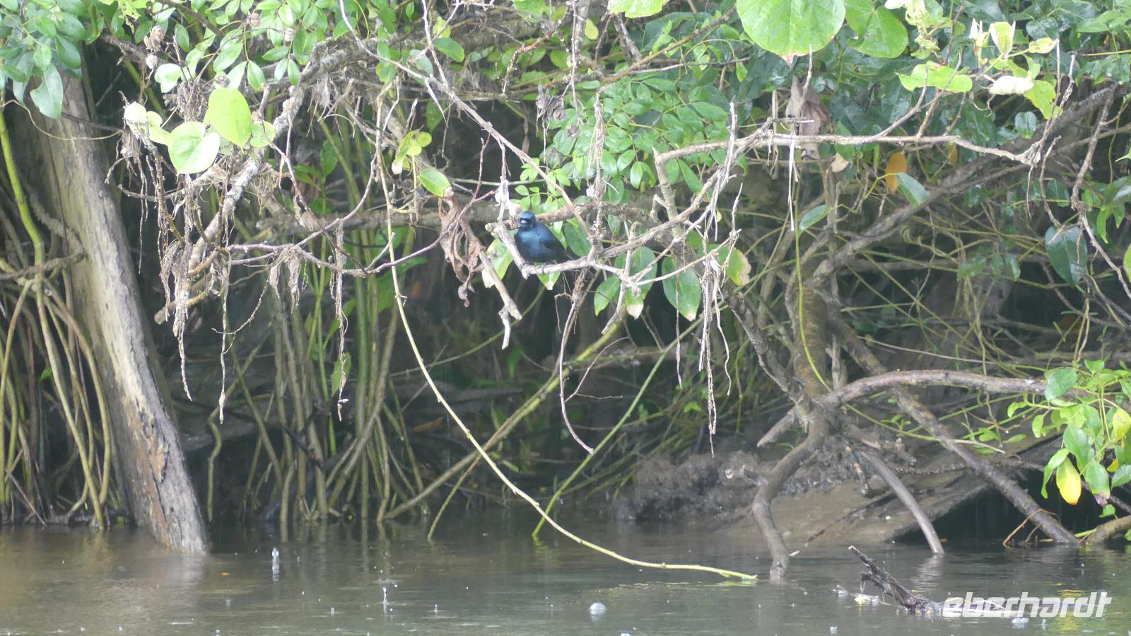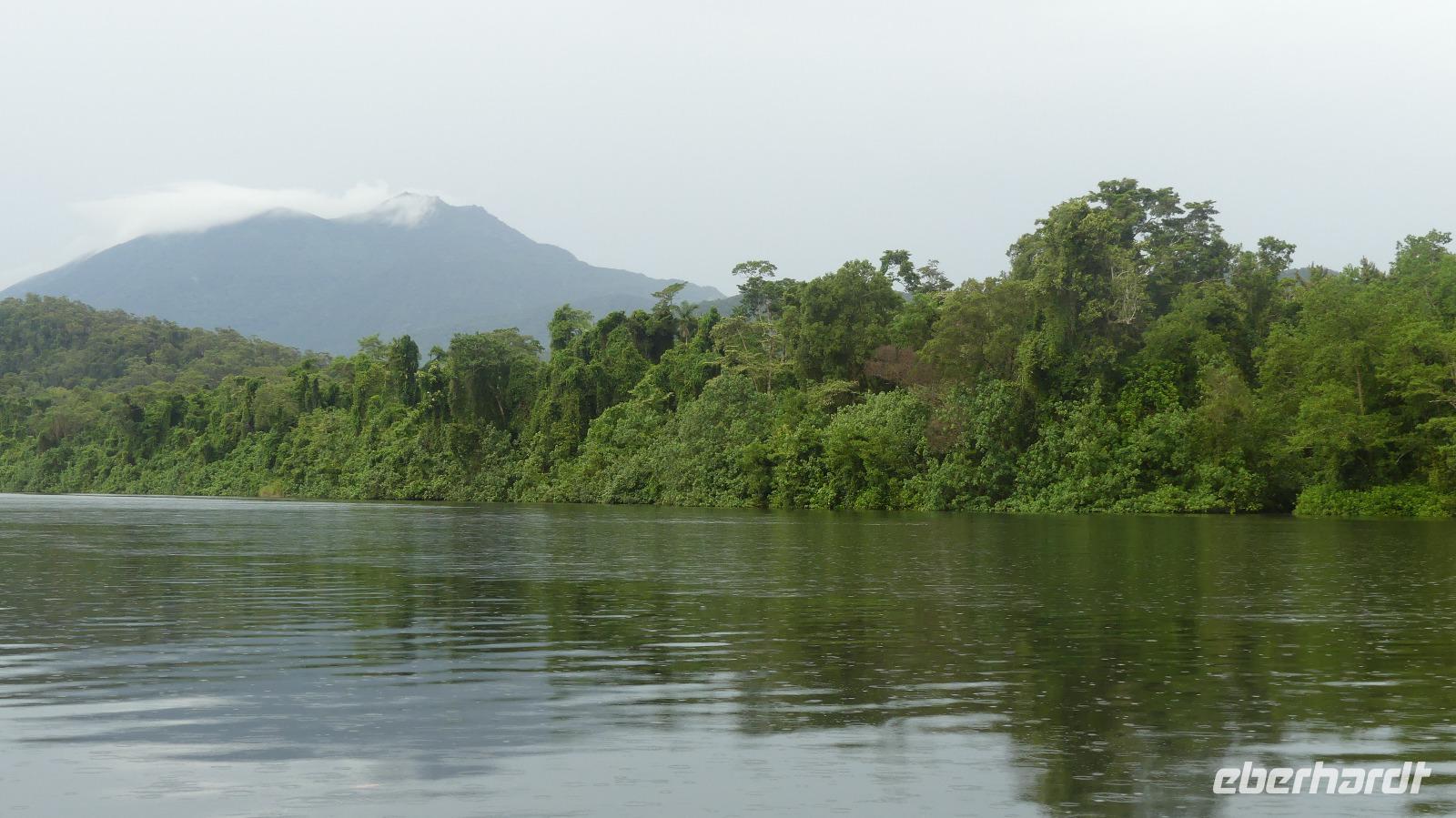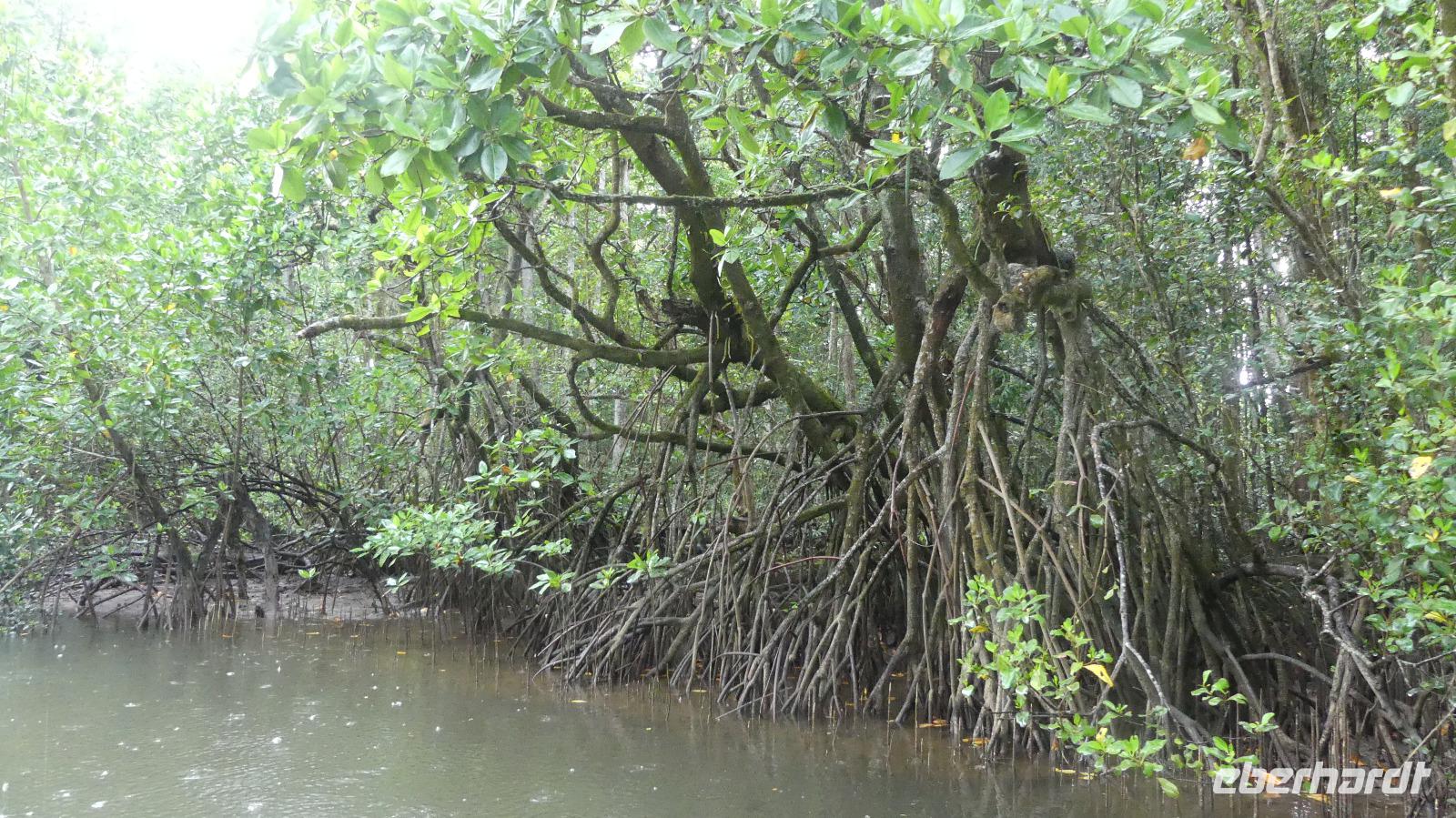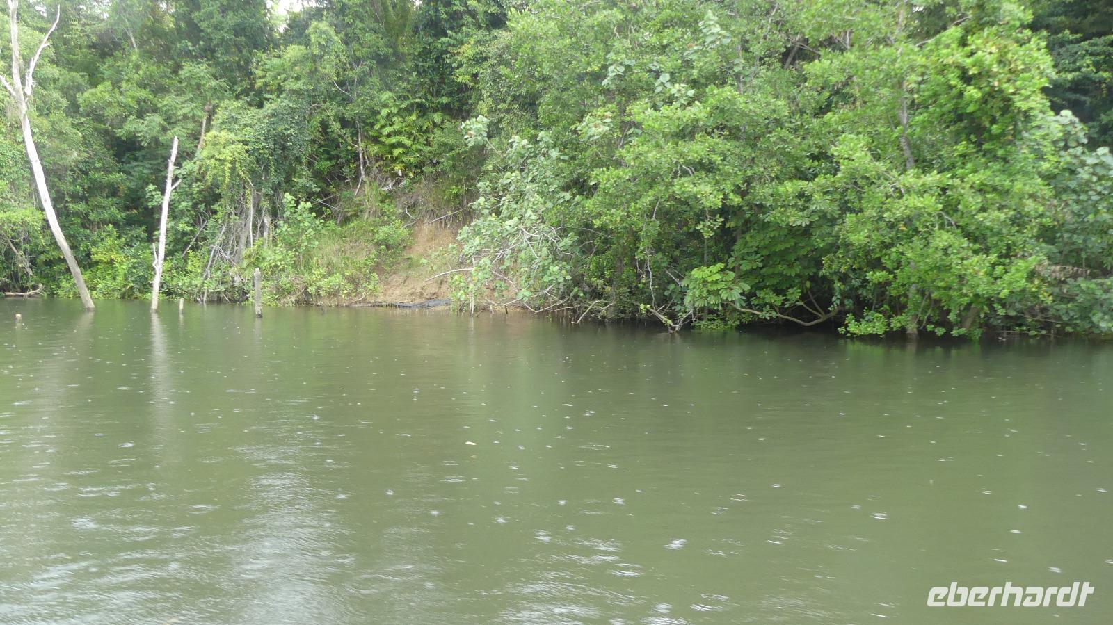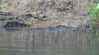 Nach dem Essen folgt eine entspannte Bootsfahrt auf dem Daintree Fluß. Der Fluß wird von dichtem, undurchlässigen Regen- und Mangrovenwald gesäumt, im Hintergrund ragt der 1.374 hohe Thornton Peak aus dem Wald und wir hoffen darauf, vielleicht ein Krokodil zu sehen. Wir müssen auch gar nicht lang warten, dann erblicken wir am Flussufer ein prächtiges Exemplar von geschätzten 4,5 Meter Länge. Ganz ruhig liegt es in der Sonne. Der Bootsausflug hat sich schon mal gelohnt, alles was jetzt noch kommt ist Zugabe: Da ist der Mangrovenreiher mit Nachwuchs im Nest, einen flauschigen Kopf kann man im Nest erkennen. Auch einen strahlend blauen Azurkingfischer (verwandt mit den Eisvögeln) sehen wir. Und Gabi erklärt uns das Ökosystem der Mangroven.
