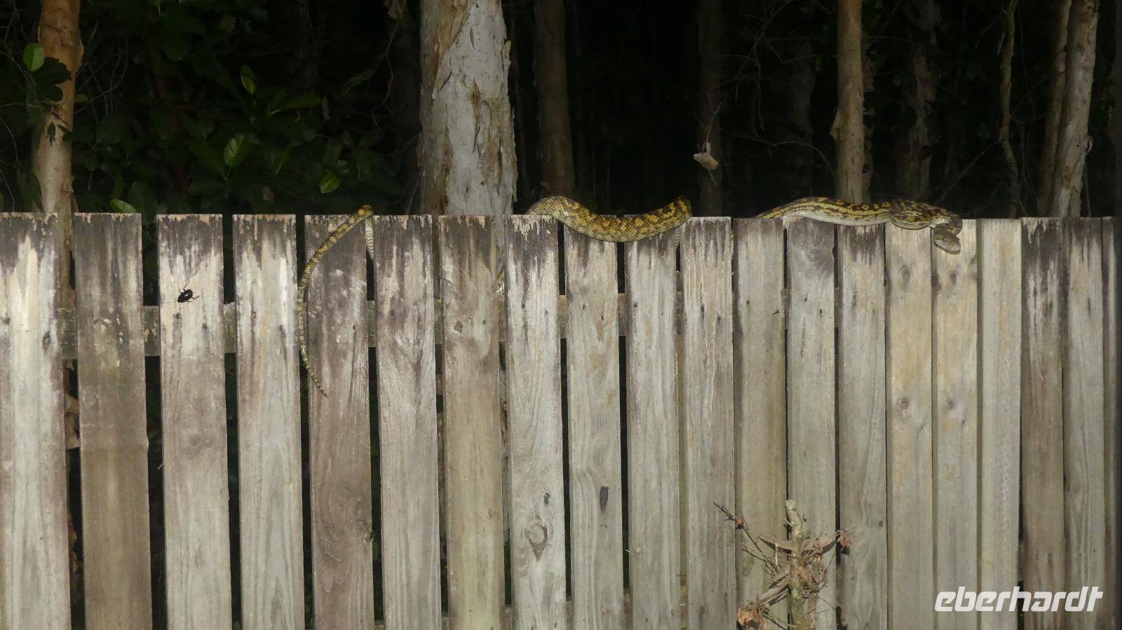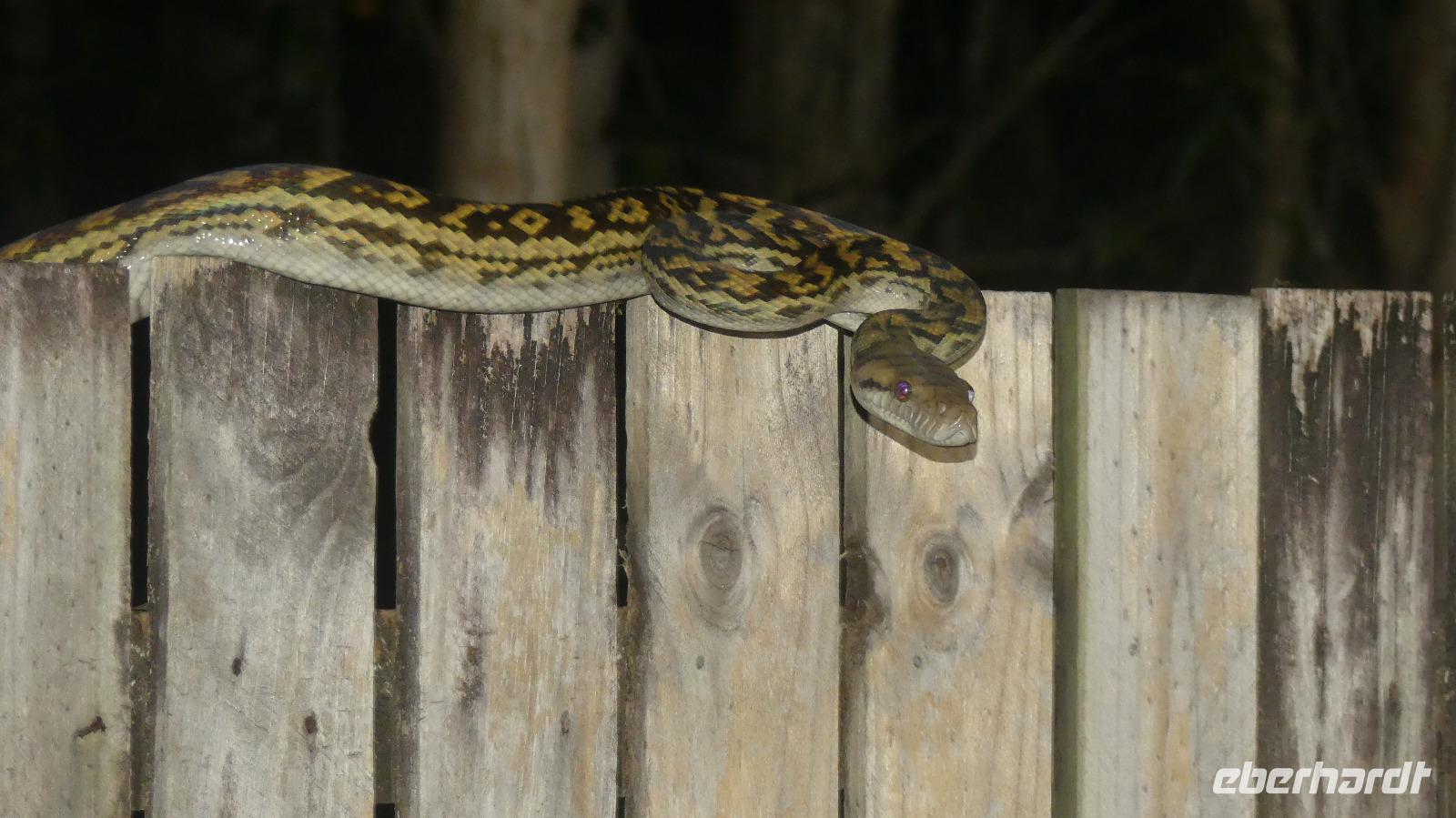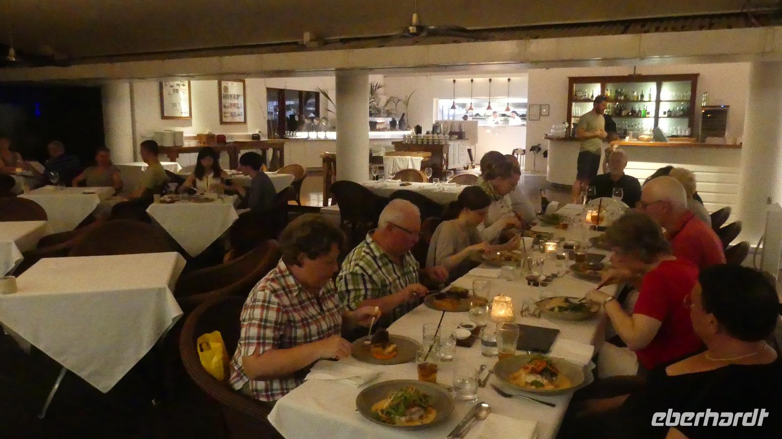 Unser letztes gemeinsames Abendessen haben wir im Reef House an der Strandpromenade. Auch hier gibt es ein sehr schmackhaftes Menü. Der anschließende Spaziergang zurück zum Hotel hält noch eine Schrecksekunde für uns bereit. Auf einem Holzbretterzaun, an dem wir parallel entlang laufen, liegt in Sichthöhe eine etwa zwei Meter lange Python, die wir erst sehr spät bemerken, aber sie ist offenbar nicht an uns interessiert.