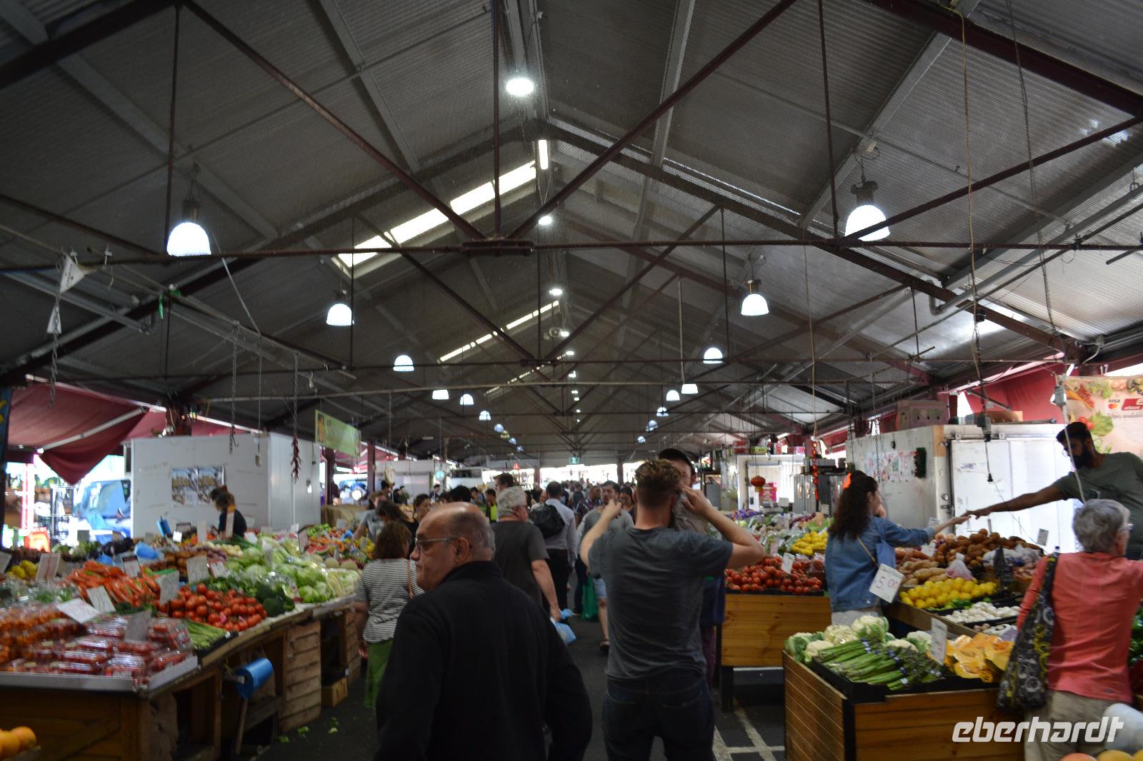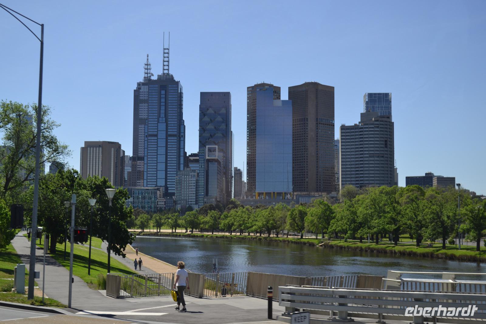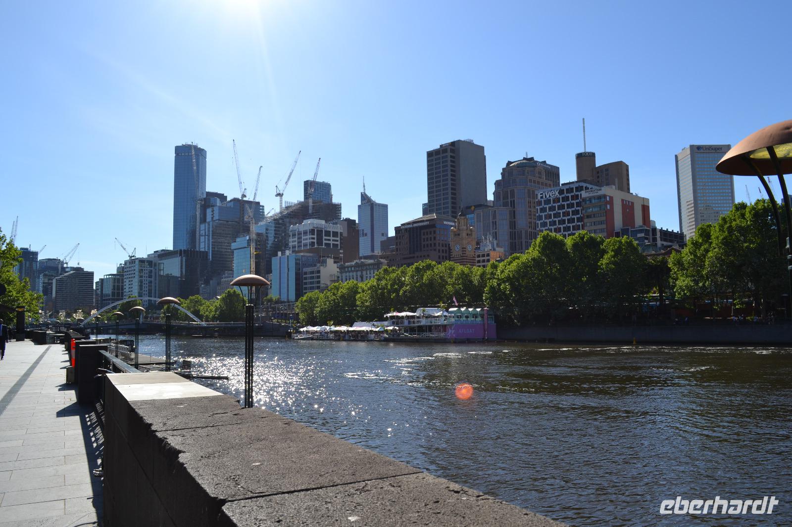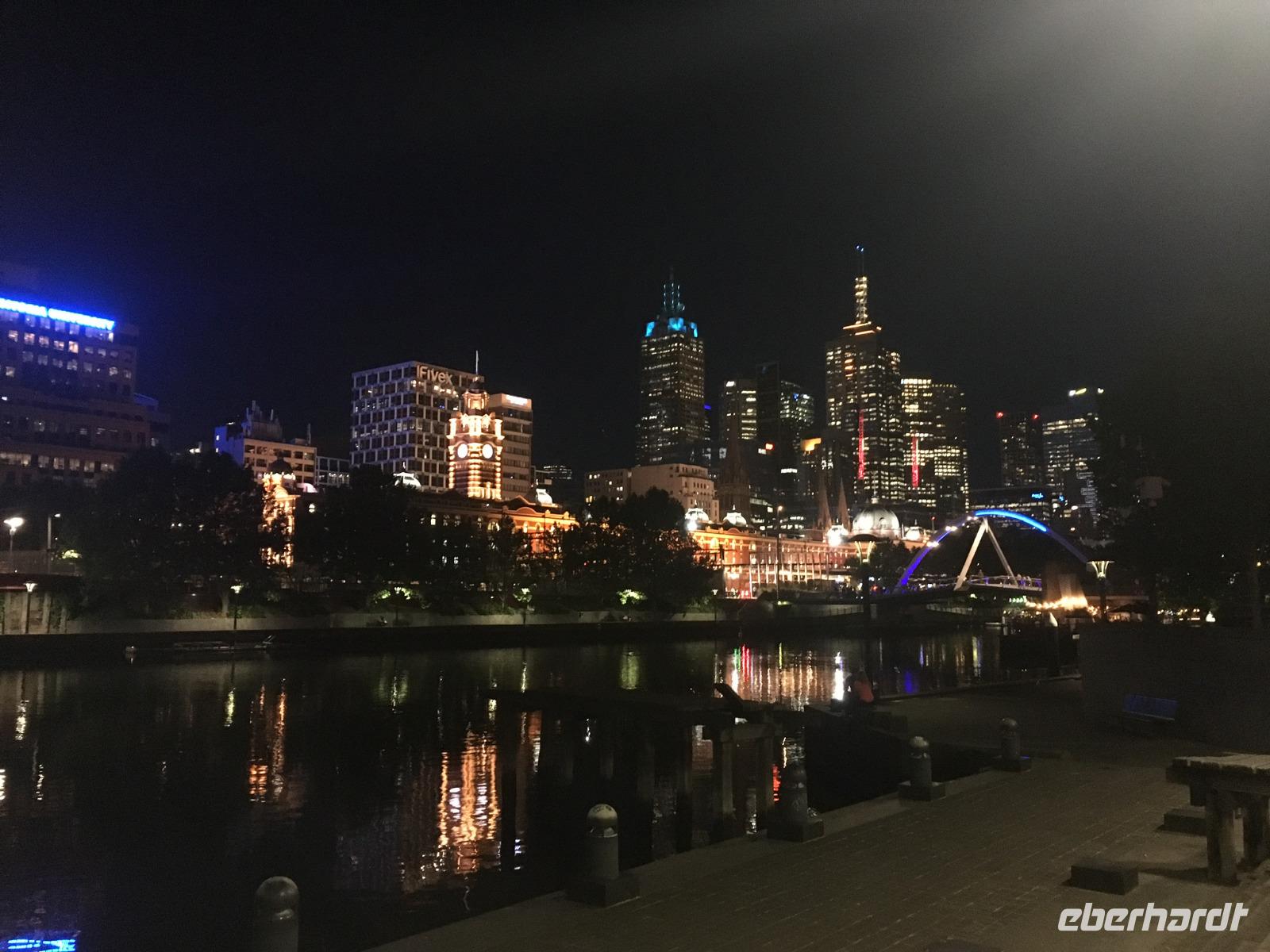 Willkommen in Australien! So begrüßte uns die örtliche Reiseleiterin Christine mit Ihrem kleinen französischen Akzent am Morgen in Melbourne. Wir fuhren gemeinsam mit dem Bus zu unserem Hotel in bester Lage im Herzen der Stadt am Yarra River. Wir durften bereits am Morgen die Zimmer beziehen und nutzen die Pause über den Mittag für ein kleines Schläfchen oder ein Mittagessen. Gemeinsam mit Laura spazierten wir zu einem am Fluss Ufer gelegenen Restaurant und genossen das Treiben entlang der beliebten Promenade. 13 Uhr starteten wir dann unsere Stadtrundfahrt. Während der Busfahrt fuhren wir entlang der Prachtbauten im viktorianischen Stil und großen Parks zunächst zu dem Queen Victoria Market. Dort hatten wir ein wenig Zeit, um uns die unterschiedlichen Markthallen gefüllt mit Souvenir, frische Fleisch- und Fischwaren, sowie Ost- und Gemüse auf eigene Faust zu erkunden. Weiter ging es zu der St. Pauls Cathedral, welche wir von Innen besichtigten und vorbei an dem Cricket Stadion, sowie dem botanischen Garten. In einem wunderschönen Park steht das Cooks Cottage in Fitzroy Garden. Dabei handelt es sich um das älteste Gebäude des Landes. Wir besichtigten das kleine Haus und erfrischten uns mit einem kühlen Leitungswasser. Am Shrine of Remembrance in der St. Kilda Road stiegen wir für eine weitere Besichtigung aus. Das Gebäude ist eines der größten Kriegerdenkmäler Australiens und wurde als Denkmal für alle Männer und Frauen aus Victoria, welche im 1. Weltkrieg dienten und dabei starben, erichtet. Heute umfasst es die weitläufige Geschichte der Kriegsopfer Australiens. Bevor es zurück zum Hotel ging zeigte uns Christine noch die schöne Gegend rund um die Formel 1 Strecke in der Nähe der St. Kilda Road. Der Busfahrer ließ uns oberhalb des bekannten Federal Square raus. Der Platz ist das kulturelle Zentrum der Stadt und bei jung, wie alt ein beliebter Treffpunkt zu Veranstaltungen, etc. Von dort aus liefen wir nur wenige Minuten zu unserem Hotel, wo wir uns für den Abend fertig machten. Gemeinsam spazierten wir entlang des Yarra River zum unserem heutigen Restaurant. Unser erstes Abendessen ließ lange auf sich warten, aber wir wurden geschmacklich dafür belohnt.
