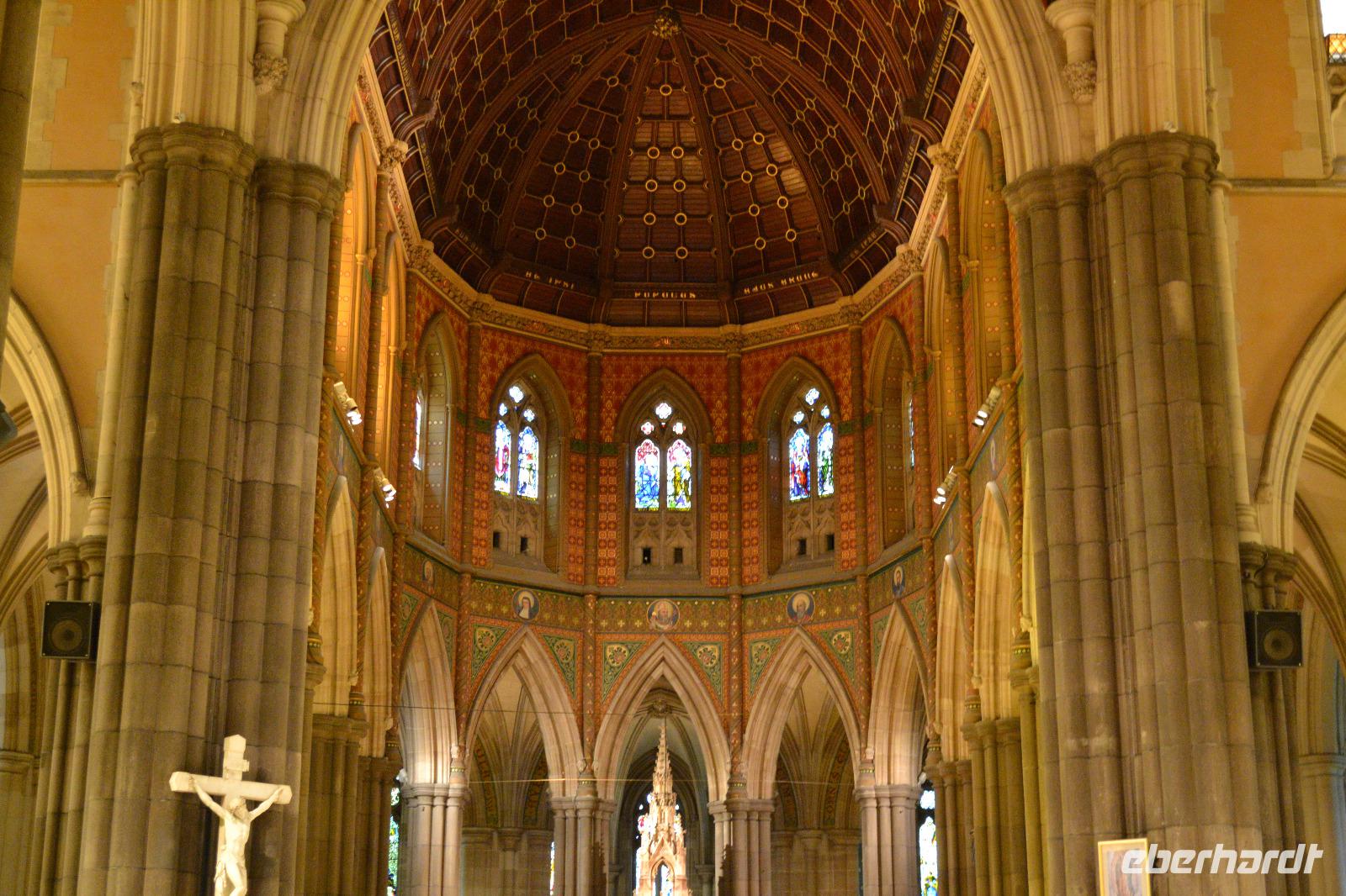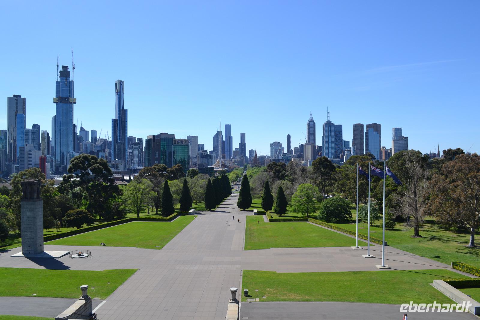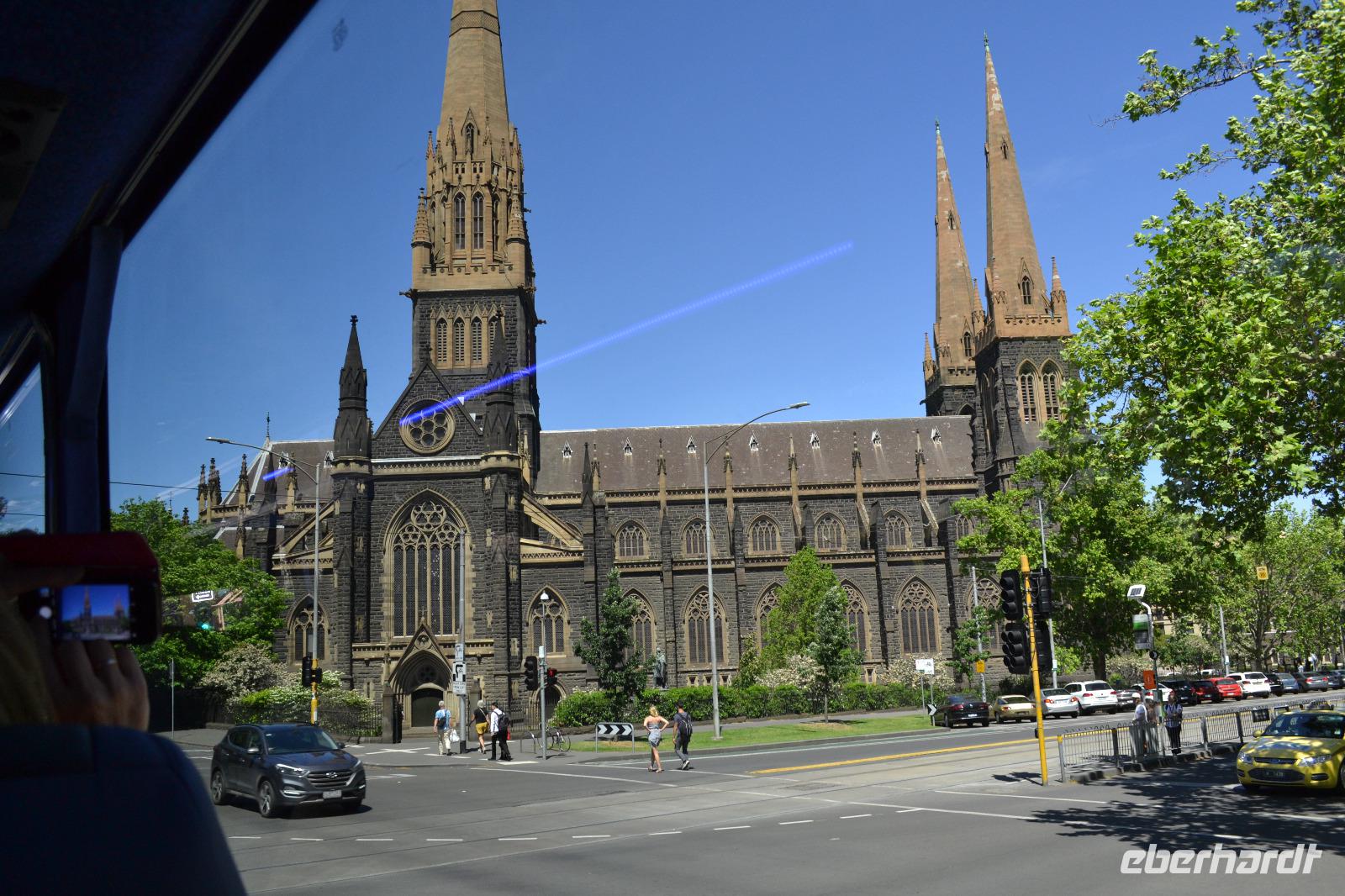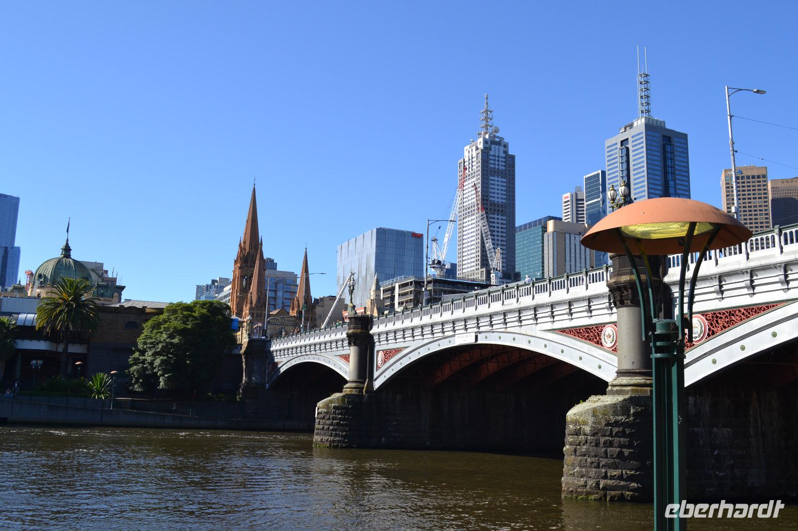 Willkommen in Australien! So begrüßte uns die örtliche Reiseleiterin Christine mit Ihrem kleinen französischen Akzent am Morgen in Melbourne. Wir fuhren gemeinsam mit dem Bus zu unserem Hotel in bester Lage im Herzen der Stadt am Yarra River. Wir durften bereits am Morgen die Zimmer beziehen und nutzen die Pause über den Mittag für ein kleines Schläfchen oder ein Mittagessen. Gemeinsam mit Laura spazierten wir zu einem am Fluss Ufer gelegenen Restaurant und genossen das Treiben entlang der beliebten Promenade. 13 Uhr starteten wir dann unsere Stadtrundfahrt. Während der Busfahrt fuhren wir entlang der Prachtbauten im viktorianischen Stil und großen Parks zunächst zu dem Queen Victoria Market. Dort hatten wir ein wenig Zeit, um uns die unterschiedlichen Markthallen gefüllt mit Souvenir, frische Fleisch- und Fischwaren, sowie Ost- und Gemüse auf eigene Faust zu erkunden. Weiter ging es zu der St. Pauls Cathedral, welche wir von Innen besichtigten und vorbei an dem Cricket Stadion, sowie dem botanischen Garten. In einem wunderschönen Park steht das Cooks Cottage in Fitzroy Garden. Dabei handelt es sich um das älteste Gebäude des Landes. Wir besichtigten das kleine Haus und erfrischten uns mit einem kühlen Leitungswasser. Am Shrine of Remembrance in der St. Kilda Road stiegen wir für eine weitere Besichtigung aus. Das Gebäude ist eines der größten Kriegerdenkmäler Australiens und wurde als Denkmal für alle Männer und Frauen aus Victoria, welche im 1. Weltkrieg dienten und dabei starben, erichtet. Heute umfasst es die weitläufige Geschichte der Kriegsopfer Australiens. Bevor es zurück zum Hotel ging zeigte uns Christine noch die schöne Gegend rund um die Formel 1 Strecke in der Nähe der St. Kilda Road. Der Busfahrer ließ uns oberhalb des bekannten Federal Square raus. Der Platz ist das kulturelle Zentrum der Stadt und bei jung, wie alt ein beliebter Treffpunkt zu Veranstaltungen, etc. Von dort aus liefen wir nur wenige Minuten zu unserem Hotel, wo wir uns für den Abend fertig machten. Gemeinsam spazierten wir entlang des Yarra River zum unserem heutigen Restaurant. Unser erstes Abendessen ließ lange auf sich warten, aber wir wurden geschmacklich dafür belohnt.