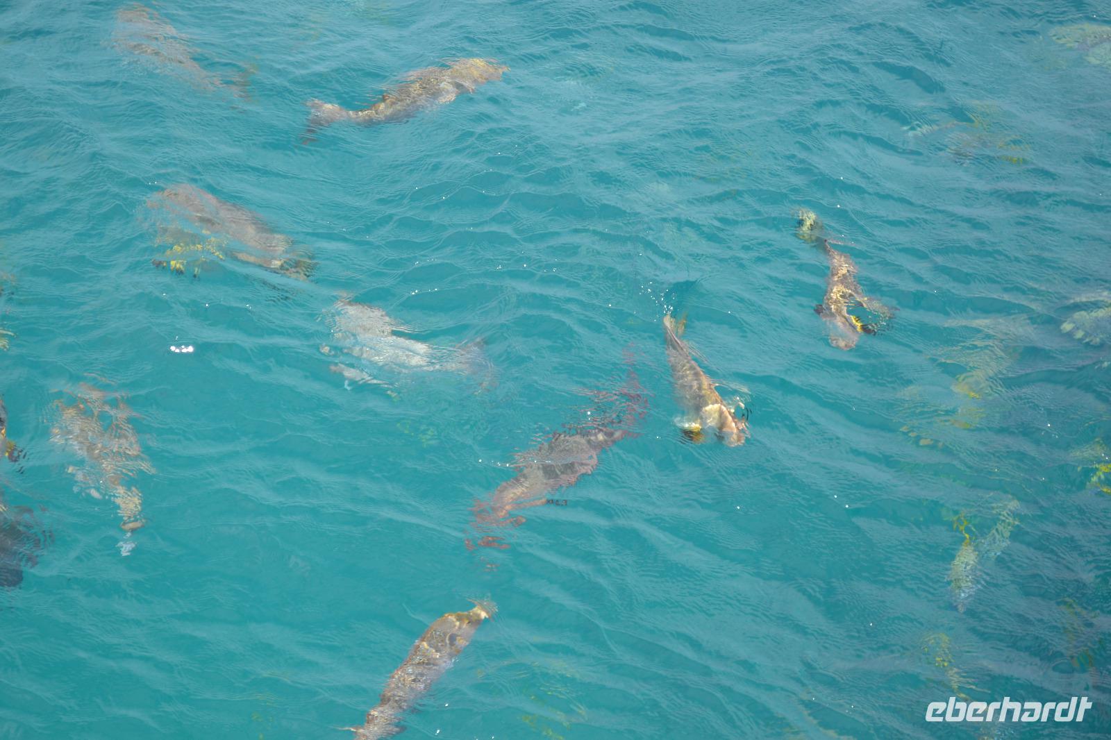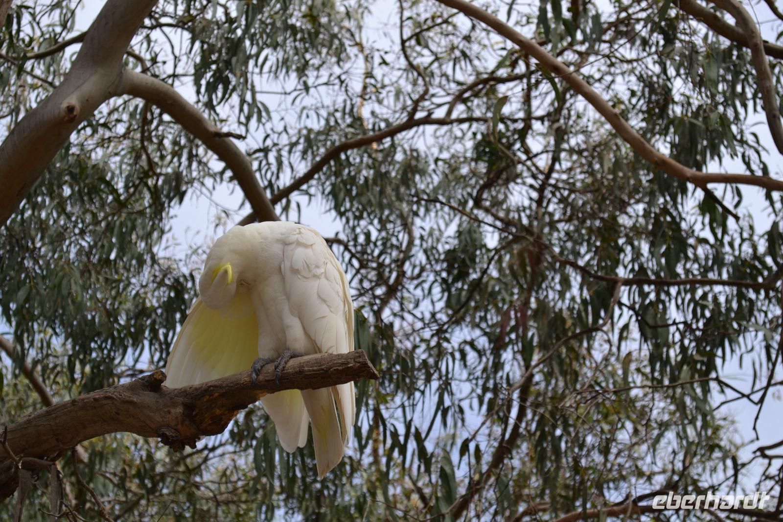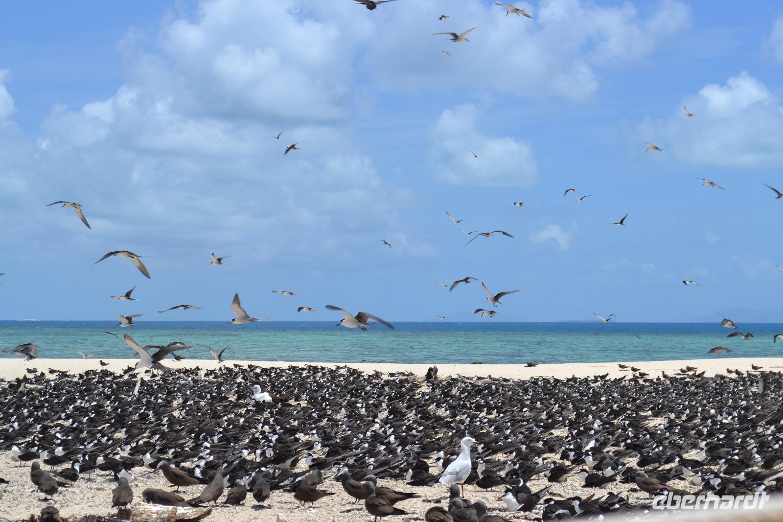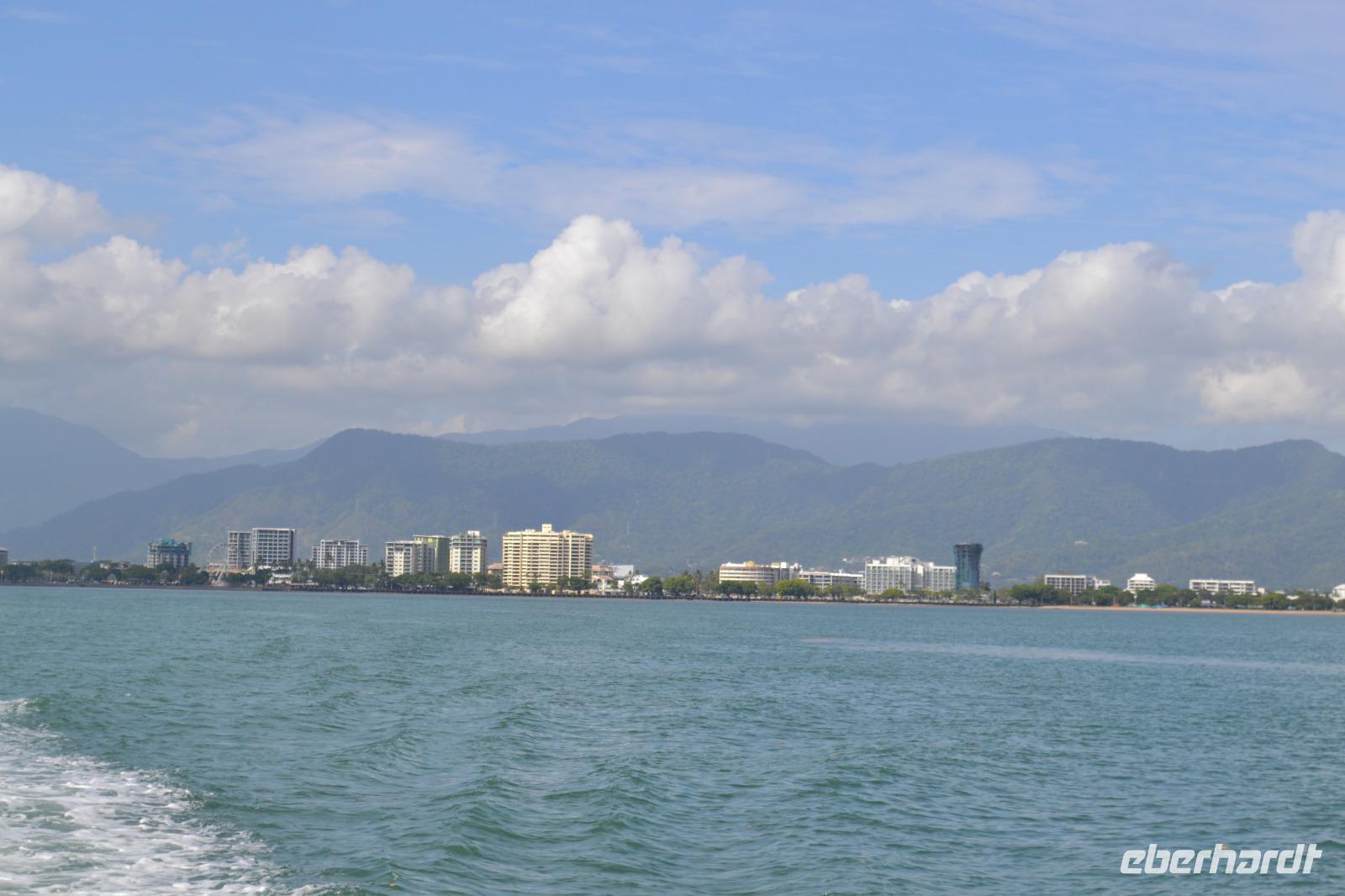 Direkt nach dem Frühstück holte uns ein Sammelbus vom Hotel ab und brachte uns nach Cairns an den Hafen. Auch den heutigen Ausflug unternahmen wir gemeinsam mit der anderen Eberhardt Gruppe und Ihrer Reiseleiterin. Auf dem Katamaran angekommen füllten wir zunächst ein Gesundheitsformular aus bevor wir uns einen Kaffee und ein Muffin holten. Während der 1,5 stündigen Fahrt zu der Insel abseits des Massentourismus wurde uns die Ausrüstung für den Schnorchelgang zur Verfügung gestellt und ein Vortrag über die Unterwasserwelt gehalten. Kurz vor 11 Uhr erreichten wir die mit tausenden von Vögeln belebte Insel. Wir gestalteten den Nachmittag nach unseren Wünschen. Einige Gästen fuhren mit dem Shuttleboot direkt zu Insel zum Schnorcheln, andere unternahmen eine Glasbootfahrt entlang des Riffs. Reiseleiterin Claudine erzählte Interessante Begebenheiten der Unterwasserwelt. Das Great Barrier Reef ist die größte zusammenhängende Ansammlung von knapp 3000 einzelnen Korallenriffen der Welt. 1981 wurde es von der UNESCO zum Weltnaturerbe erklärt und zählt seither zu einem der sieben Weltwunder. Es erstreckt sich im Nordosten Australiens und ist im Laufe seiner Zeit auf 2.300 Kilometern angewachsen. Pünktlich zur Mittagszeit wurde ein leckeres Buffen im Inneren des Katamarans aufgebaut, woran sich jeder nach belieben bedienen konnte. Heute kam jeder auf seine Kosten! Am Nachmittag wurden die letzten Gäste von der kleinen einsamen Insel ohne Sonnenschutz und Liegemöglichkeiten zurückgeholt. Auf der Rückfahrt durften wir uns an dem Obst und Kuchen bedienen und der Kapitän gab jeden Gast ein Glas Sekt aus! Wir genossen die Sonnenstrahlen auf der Heimfahrt von dem Traumhaften Ausflug. Im Hotel angekommen erfrischten wir uns von dem salzigen Meerwasser und trafen uns an der Hotelbar. Laura stand bereits mit einem Eimer gefüllt mit Weinflaschen da und teilte uns mit, ein Getränk zu bestellen. Danach spazierten wir den romantisch beleuchteten Weg zum Feigenbaum in Garten der Hotelanlage. Dieser war mit Lichterketten ähnlich wie in einem Film geschmückt. Das Essen des Würzburger Kochs schmeckte uns bei dem Ambiente besonders gut.