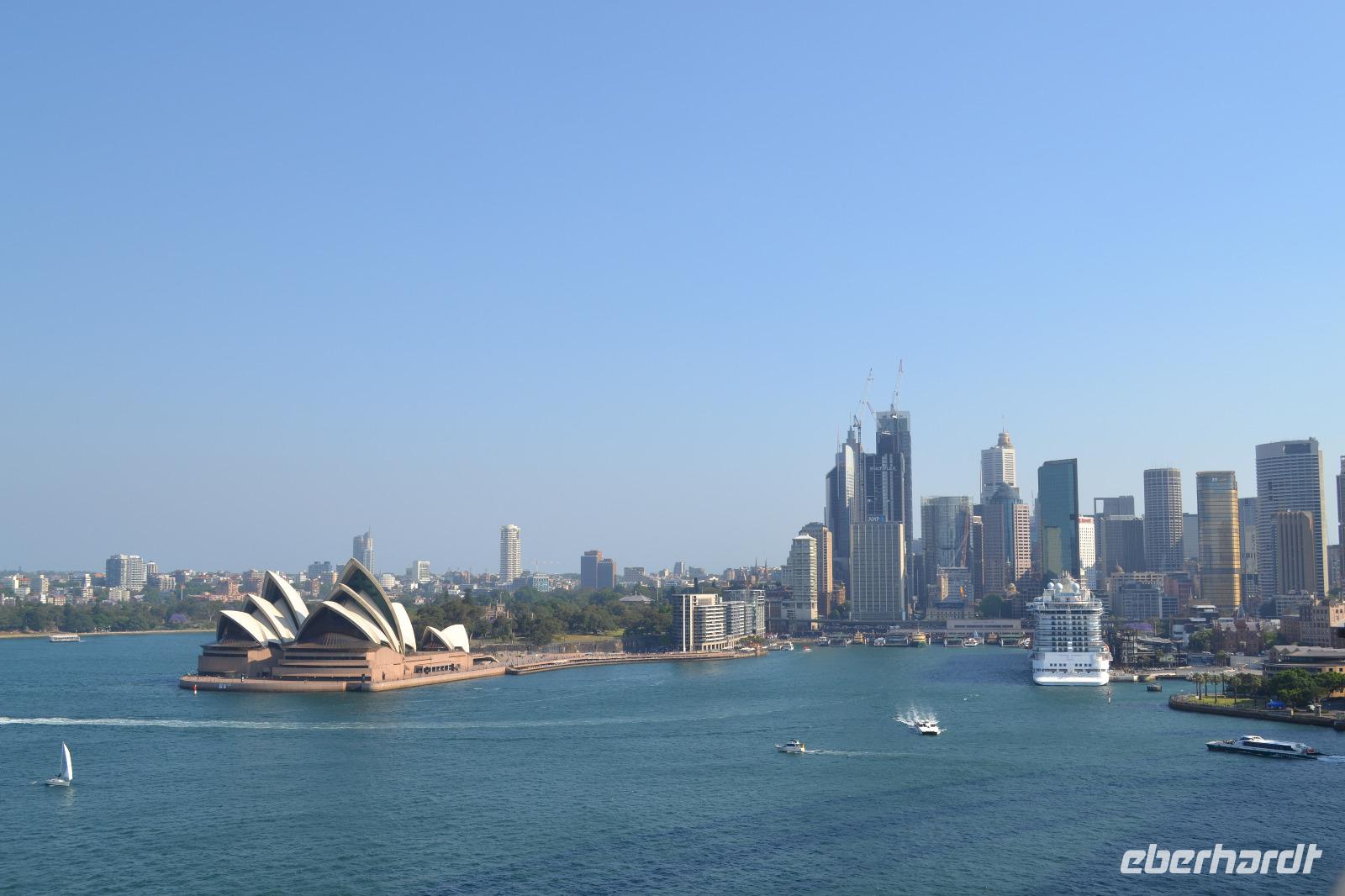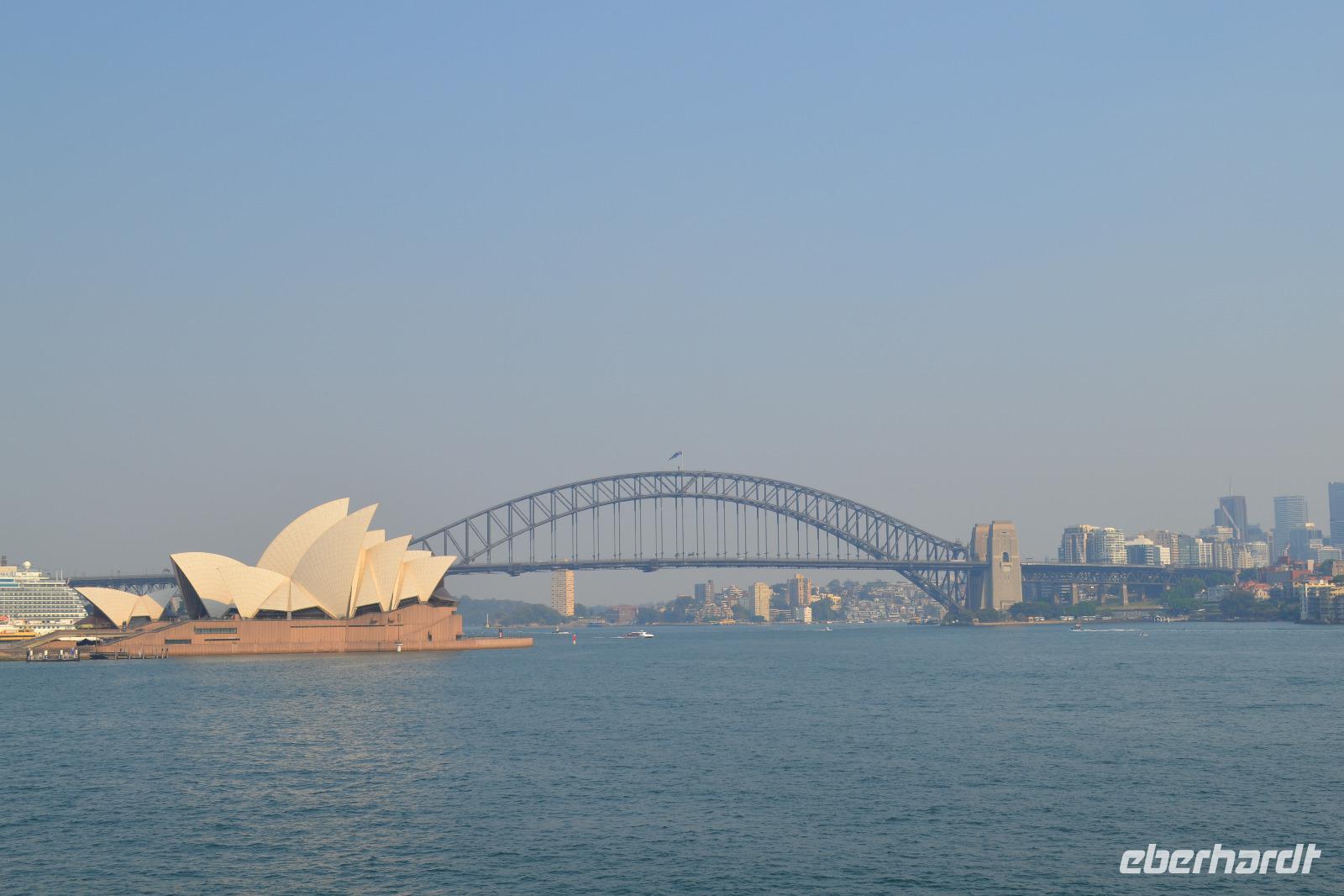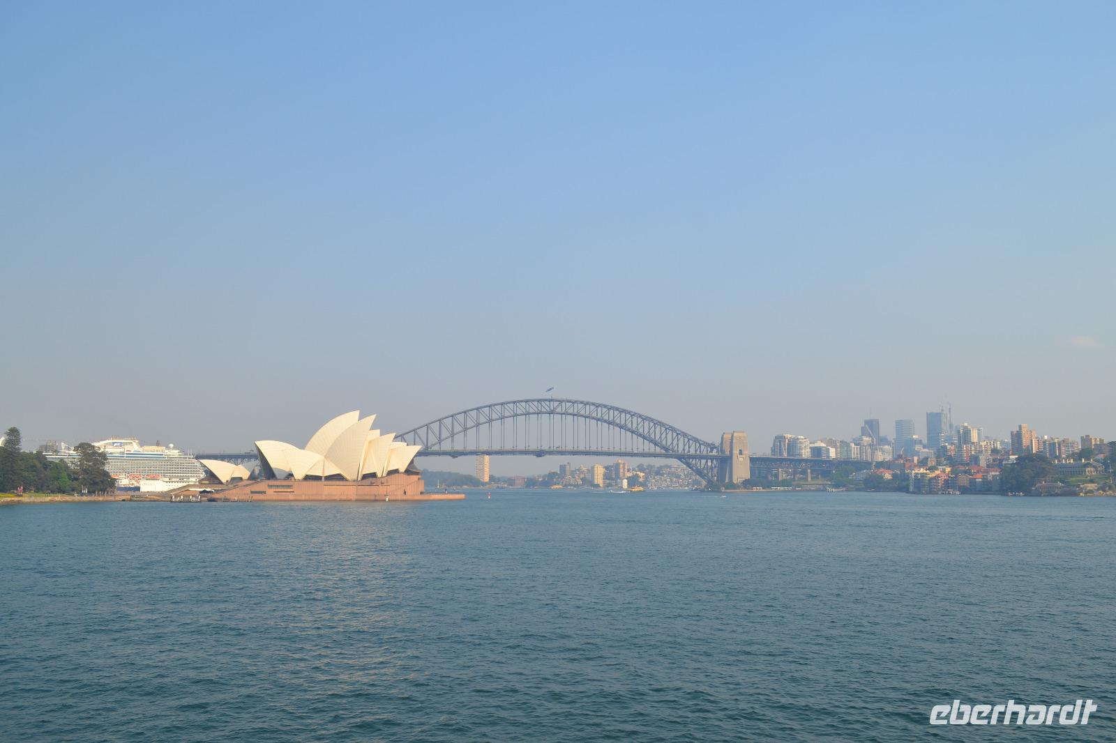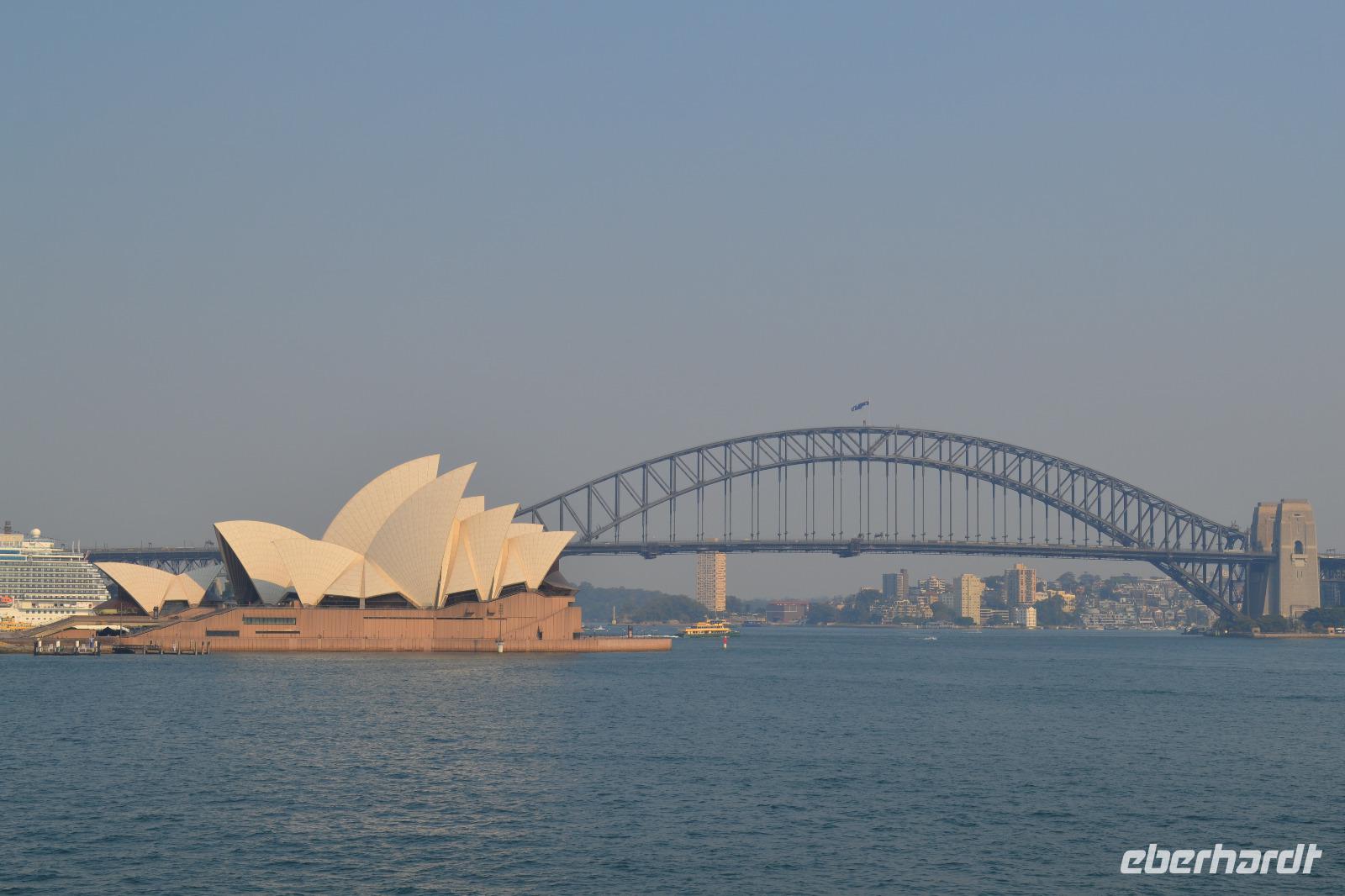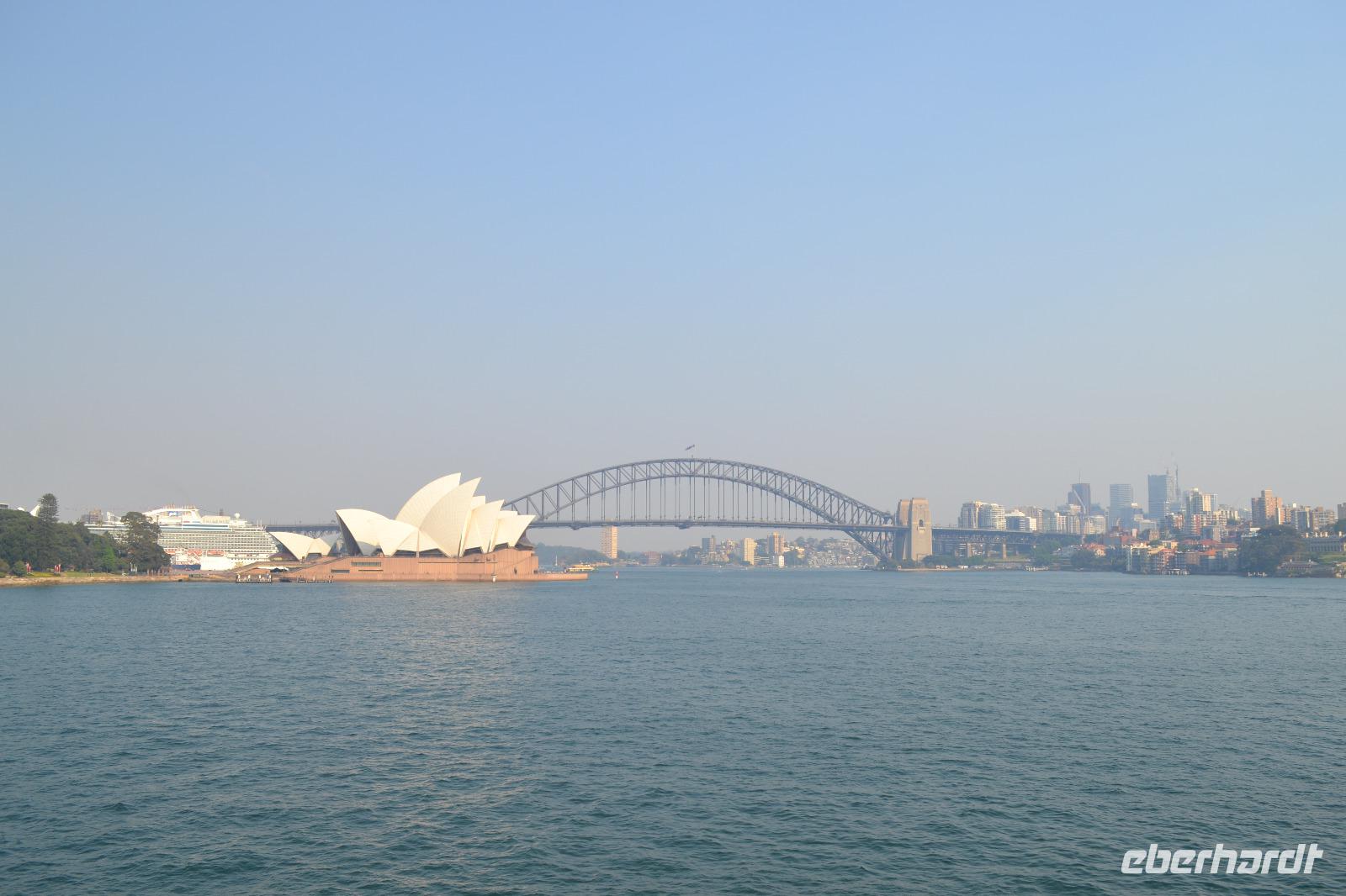 Am Morgen holte uns Uli zusammen mit Busfahrer Max von dem zentralen Hotel in Sydney ab. Zuerst fuhren wir zu dem Aussichtspunkt wo wir einen Gesamtblick über die Oper, Harbour Bridge und der Skyline hatten. Weiter ging es durch die Vororte vorbei an dem Darling Harbour, entlang des historischen Viertel „The Rocks", Kings Cross und Paddington. Entfernt von den Hochhäusern merkte man nicht mehr, dass es sich um eine Weltmetropole handelte. Die hübsch angelegten Stadtteile mit den lila blühenden Jacaradas gefielen uns sehr. Leider lag auch heute noch ein Rauchfilm über der Stadt, sodass unsere Aufnahmen an den Fotostopps nur bedingt gelungen sind. Gegen Mittag gelangten wir zum Bondi Beach, dem bekanntesten Surf Spot der Welt. Auch wir konnten heute trotz niedrigen Wellen einigen Sportlern beim Wellenreiten zusehen. Gemeinsam spazierten wir den Coastal Walk, wo gerade die Sculpture by the Sea zu sehen waren. Dabei handelt es sich um die größte temporäre Ausstellung von Bildhauerarbeiten im öffentlichen Raum. Rund 100 Kunstwerke von Künstlern aus aller Welt werden hier präsentiert. Auf dem Rückweg zum Bus blieb uns noch Zeit den Strandabschnitt entlang zu laufen. Anschließend fuhren wir zurück in die Stadt, wo wir am Hafen eine Mittagspause an einem Food Court einlegten. Nur wenige Gehminuten entfernt erreichten wir das Opernhaus. Wir wurden von einer österreichischen Gästeführerin in Empfang genommen und durch die magischen Hallen und verschiedenen Konzertsäle geführt. Dabei erzählte Sie uns lustige und spannenden Anekdoten über die Entstehung und Geschichte der Oper. Das Gebäude, welches durch den Architekten Jørn Utzon geplant wurde, ist Oktober 1973 offiziell von Königin Elisabeth II., übergeben worden. Zur feierlichen Eröffnung wurde Beethovens Neunte mit der Ode An die Freude gespielt. Im Anschluss ging es für uns auf das Schiff, wo wir uns die Stadt noch einmal von einer anderen Perspektive ansahen. Dabei kamen wir unmittelbar an der Residenz der königlichen Familie bei staatlichen Besuchen vorbei. Nachdem wir zurück am Hafen waren, stand uns der Nachmittag zur freien Verfügung. Laura spazierte mit einigen Gäste gemeinsam über die Harbour Bridge. Sie stellt den Hauptverbindungszweig zwischen Nord- und Süd Sydney dar und wird von den australischen Bürgern liebevoll „Kleiderbügel" genannt. Am Abend trafen wir uns um zu unserem Fischrestaurant am Darling Harbour zu spazieren. Dort erwartete uns ein leckeres 3-Gänge-Menü auf der Terrasse. Als Abschluss des Abends nahm uns Laura noch mit in eine Drehbare Skybar. Die o-Bar liegt im 47. Stock und besticht mit einem tollen Blick auf das nächtlich beleuchtete Sydney. Wir ließen uns den Cocktail schmecken!