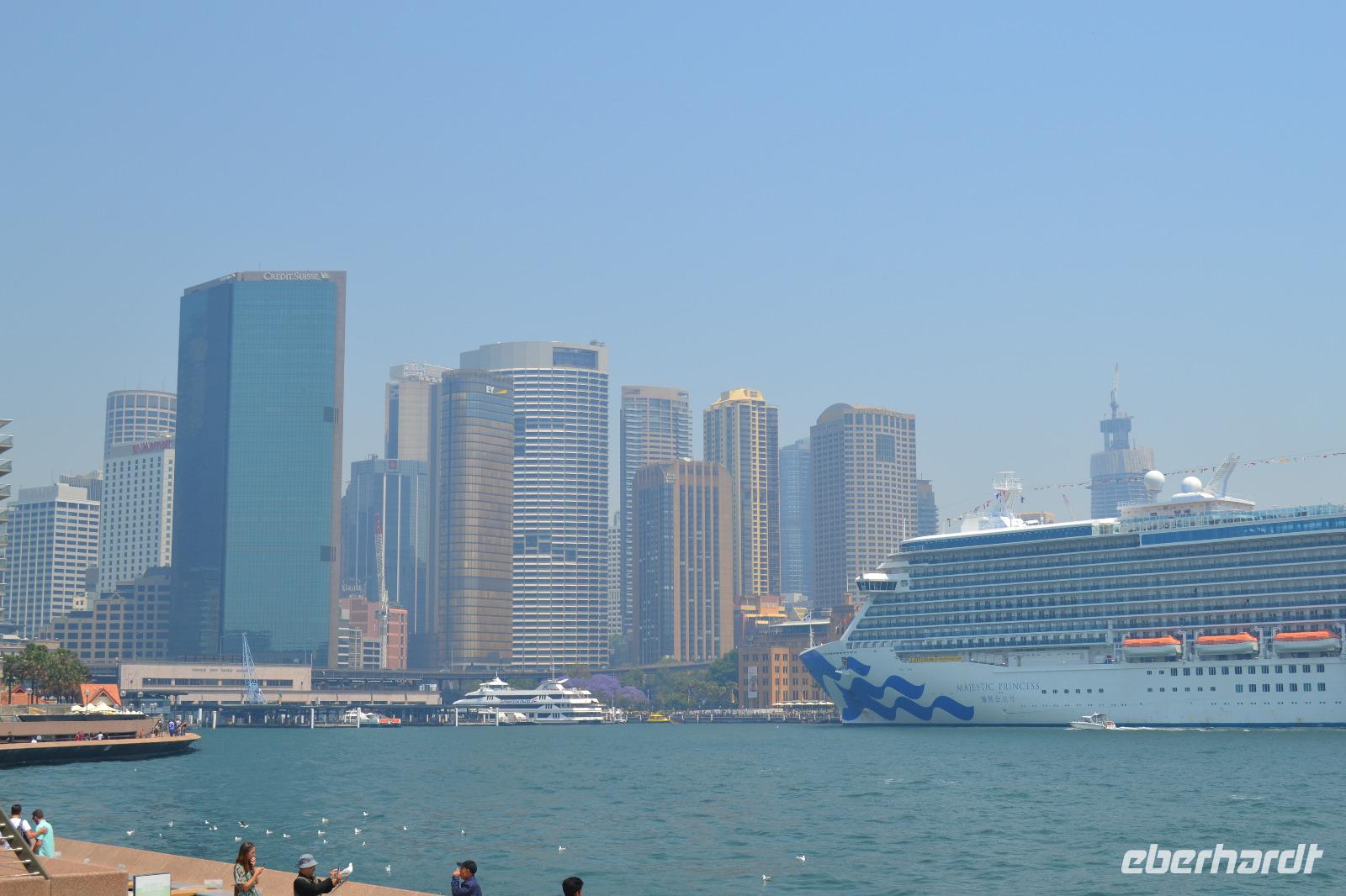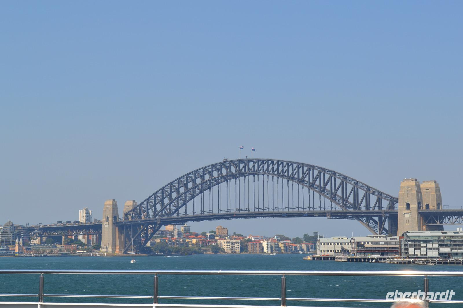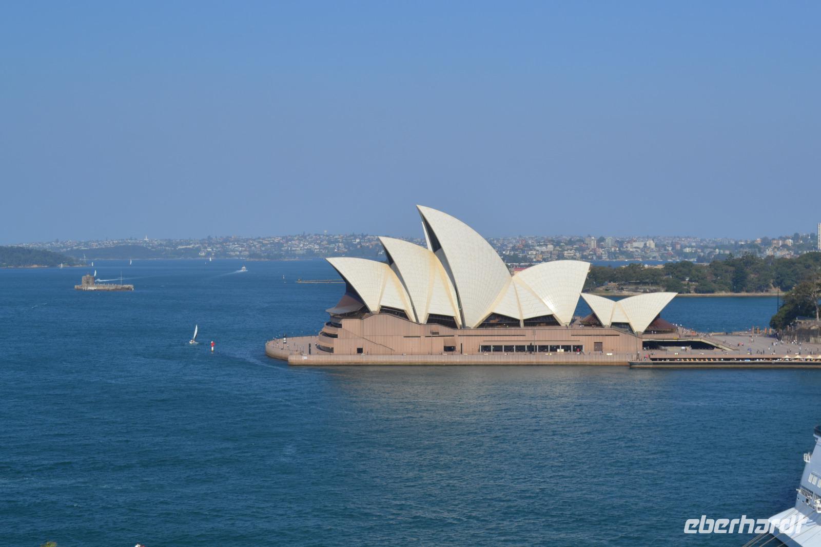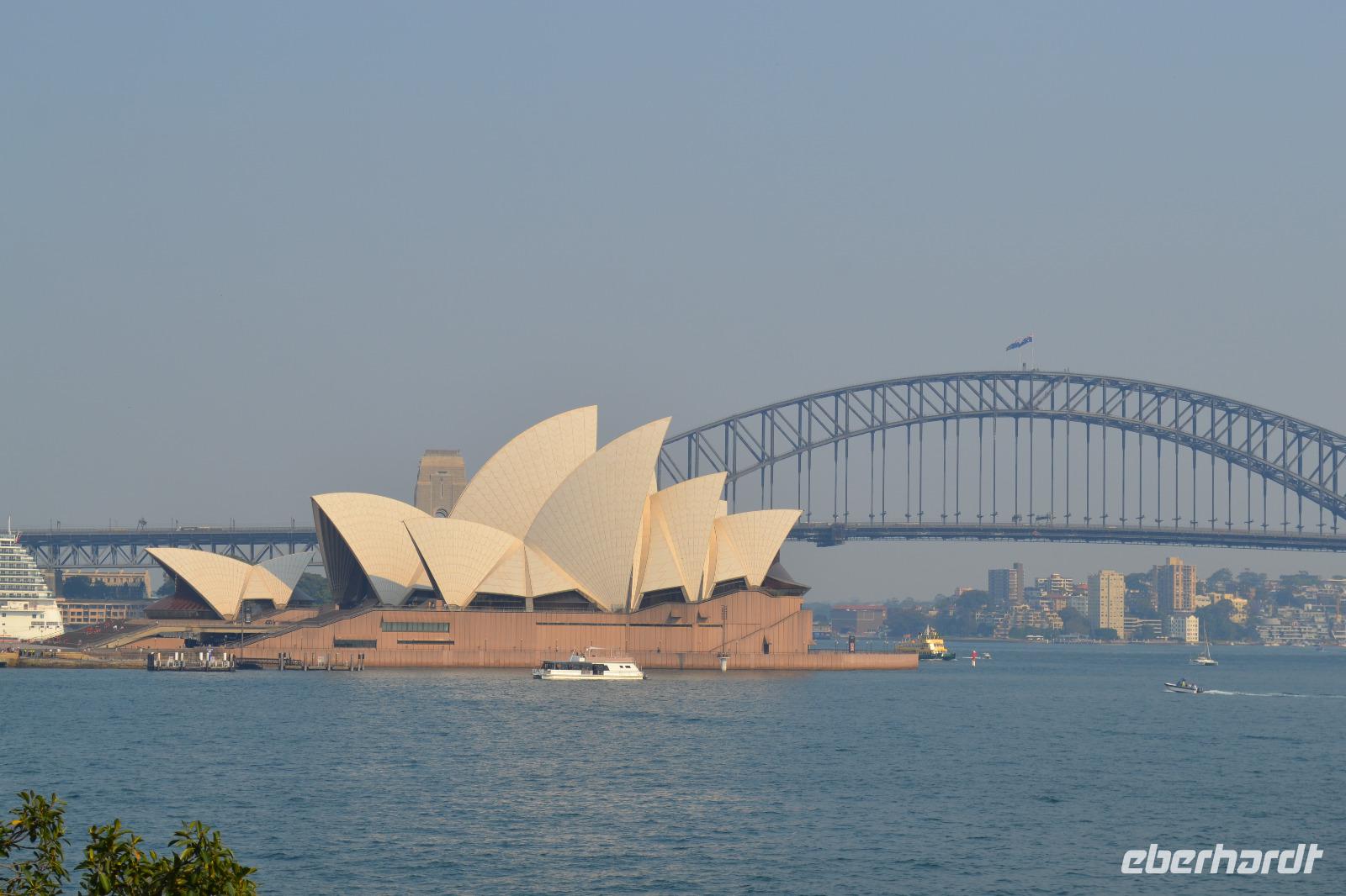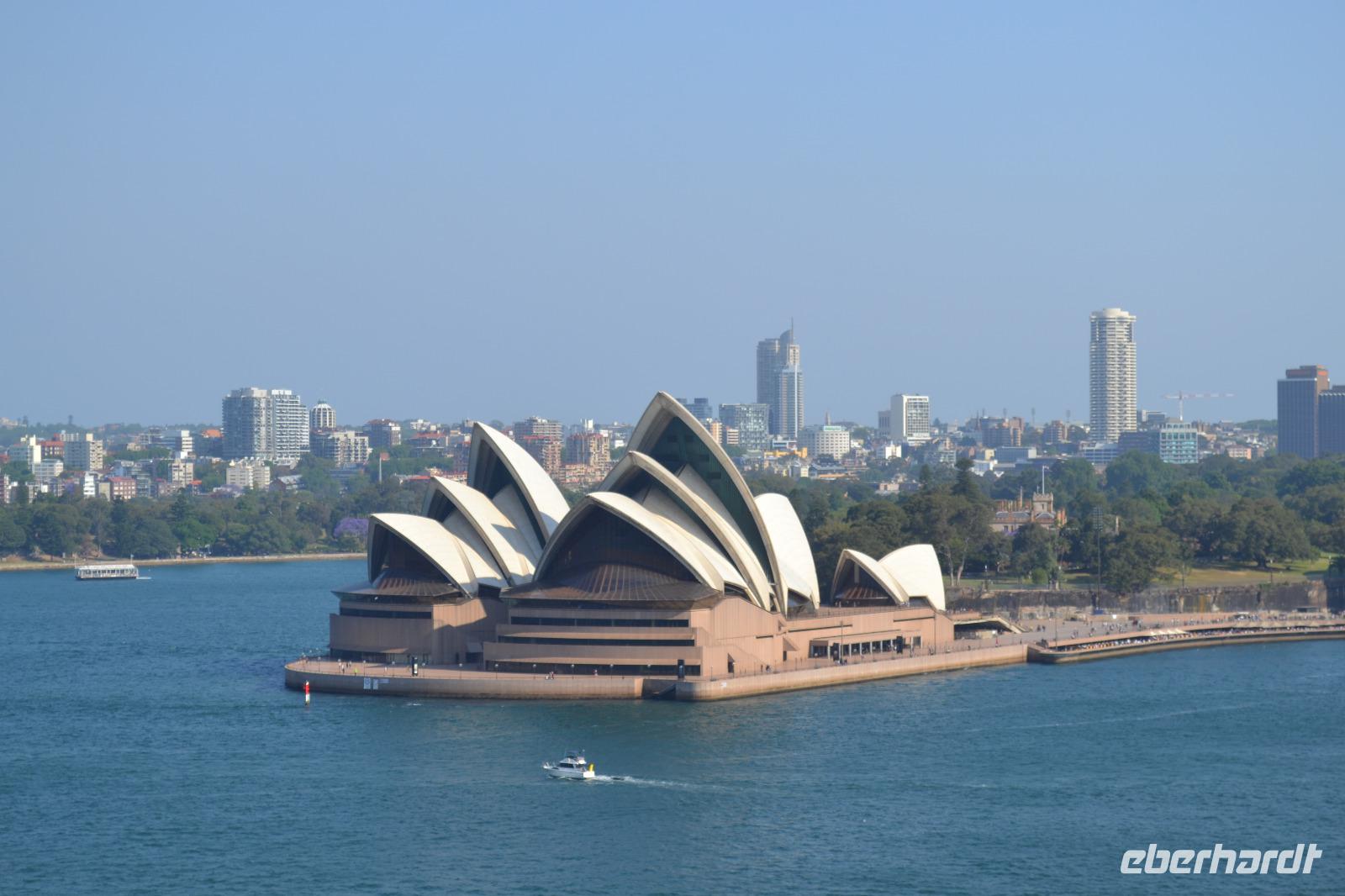 Am Morgen holte uns Uli zusammen mit Busfahrer Max von dem zentralen Hotel in Sydney ab. Zuerst fuhren wir zu dem Aussichtspunkt wo wir einen Gesamtblick über die Oper, Harbour Bridge und der Skyline hatten. Weiter ging es durch die Vororte vorbei an dem Darling Harbour, entlang des historischen Viertel „The Rocks", Kings Cross und Paddington. Entfernt von den Hochhäusern merkte man nicht mehr, dass es sich um eine Weltmetropole handelte. Die hübsch angelegten Stadtteile mit den lila blühenden Jacaradas gefielen uns sehr. Leider lag auch heute noch ein Rauchfilm über der Stadt, sodass unsere Aufnahmen an den Fotostopps nur bedingt gelungen sind. Gegen Mittag gelangten wir zum Bondi Beach, dem bekanntesten Surf Spot der Welt. Auch wir konnten heute trotz niedrigen Wellen einigen Sportlern beim Wellenreiten zusehen. Gemeinsam spazierten wir den Coastal Walk, wo gerade die Sculpture by the Sea zu sehen waren. Dabei handelt es sich um die größte temporäre Ausstellung von Bildhauerarbeiten im öffentlichen Raum. Rund 100 Kunstwerke von Künstlern aus aller Welt werden hier präsentiert. Auf dem Rückweg zum Bus blieb uns noch Zeit den Strandabschnitt entlang zu laufen. Anschließend fuhren wir zurück in die Stadt, wo wir am Hafen eine Mittagspause an einem Food Court einlegten. Nur wenige Gehminuten entfernt erreichten wir das Opernhaus. Wir wurden von einer österreichischen Gästeführerin in Empfang genommen und durch die magischen Hallen und verschiedenen Konzertsäle geführt. Dabei erzählte Sie uns lustige und spannenden Anekdoten über die Entstehung und Geschichte der Oper. Das Gebäude, welches durch den Architekten Jørn Utzon geplant wurde, ist Oktober 1973 offiziell von Königin Elisabeth II., übergeben worden. Zur feierlichen Eröffnung wurde Beethovens Neunte mit der Ode An die Freude gespielt. Im Anschluss ging es für uns auf das Schiff, wo wir uns die Stadt noch einmal von einer anderen Perspektive ansahen. Dabei kamen wir unmittelbar an der Residenz der königlichen Familie bei staatlichen Besuchen vorbei. Nachdem wir zurück am Hafen waren, stand uns der Nachmittag zur freien Verfügung. Laura spazierte mit einigen Gäste gemeinsam über die Harbour Bridge. Sie stellt den Hauptverbindungszweig zwischen Nord- und Süd Sydney dar und wird von den australischen Bürgern liebevoll „Kleiderbügel" genannt. Am Abend trafen wir uns um zu unserem Fischrestaurant am Darling Harbour zu spazieren. Dort erwartete uns ein leckeres 3-Gänge-Menü auf der Terrasse. Als Abschluss des Abends nahm uns Laura noch mit in eine Drehbare Skybar. Die o-Bar liegt im 47. Stock und besticht mit einem tollen Blick auf das nächtlich beleuchtete Sydney. Wir ließen uns den Cocktail schmecken!