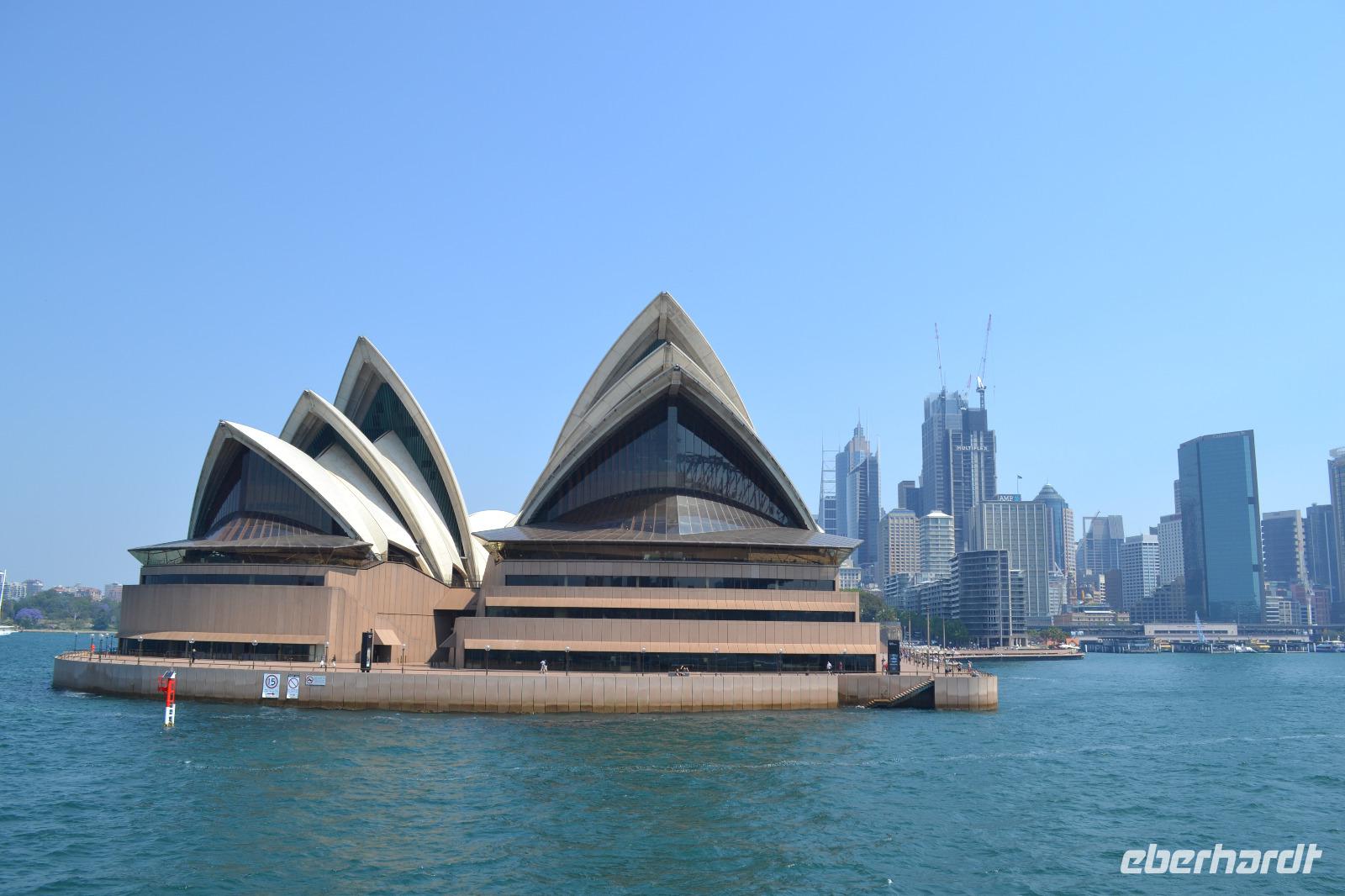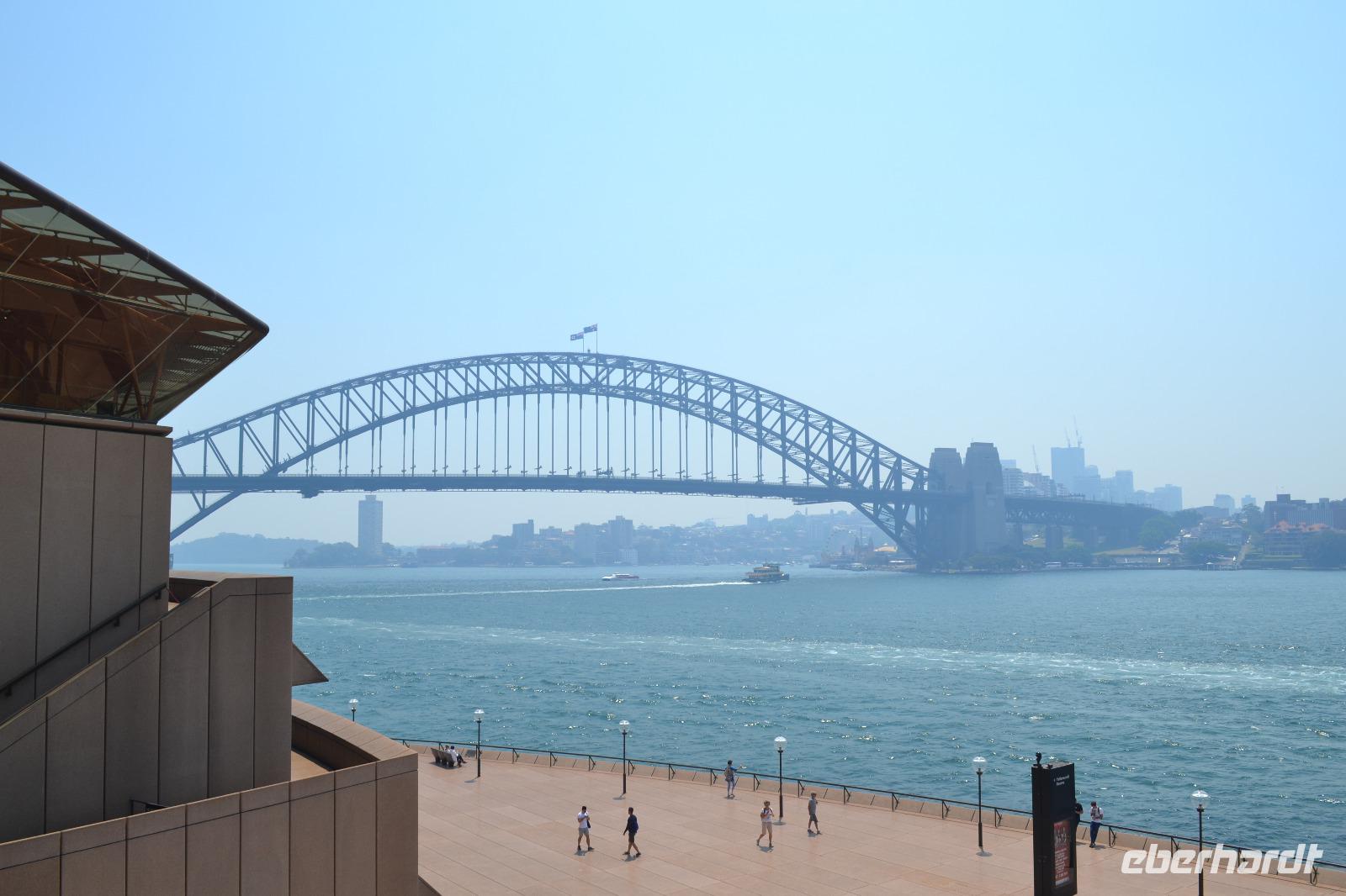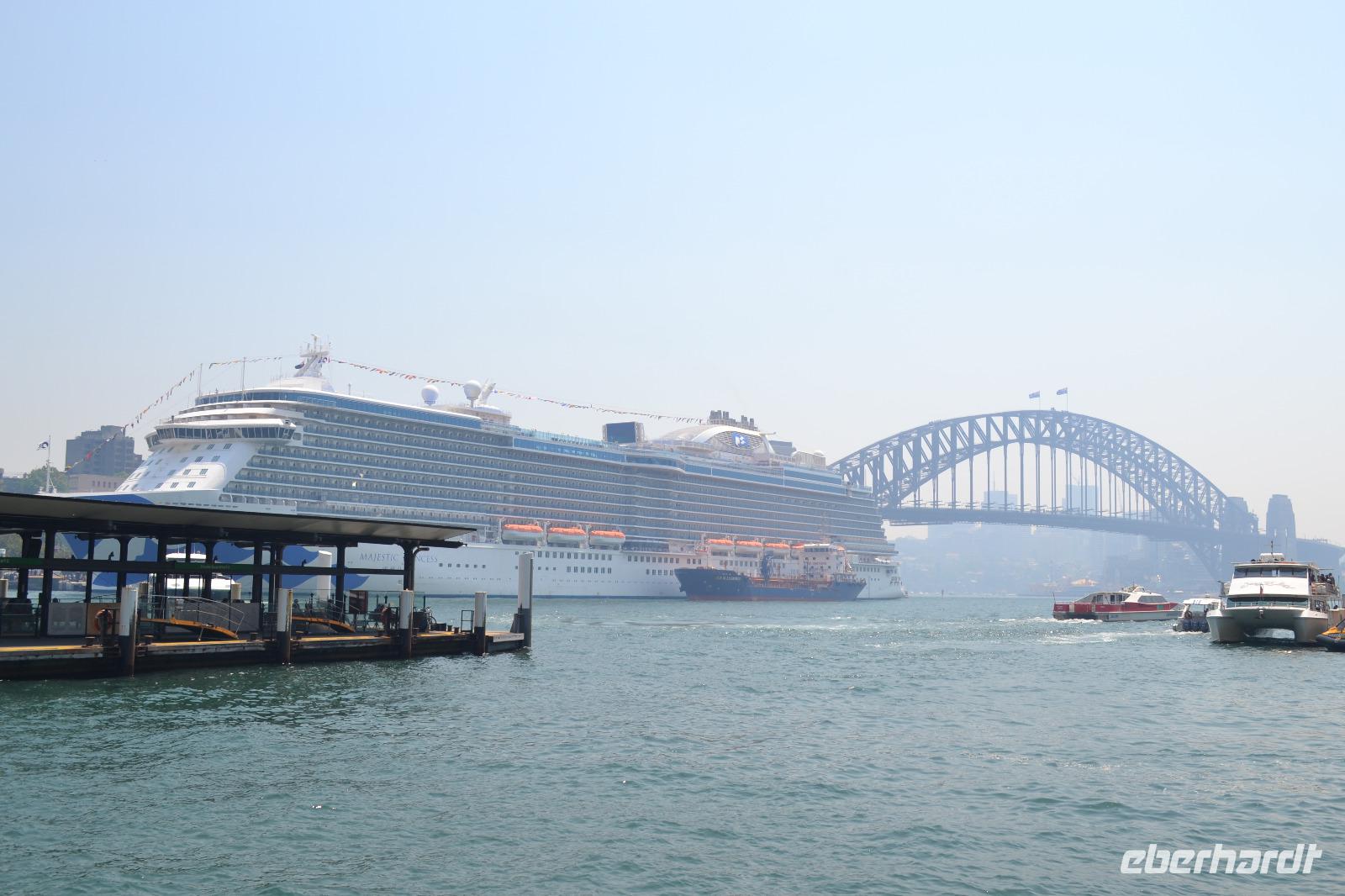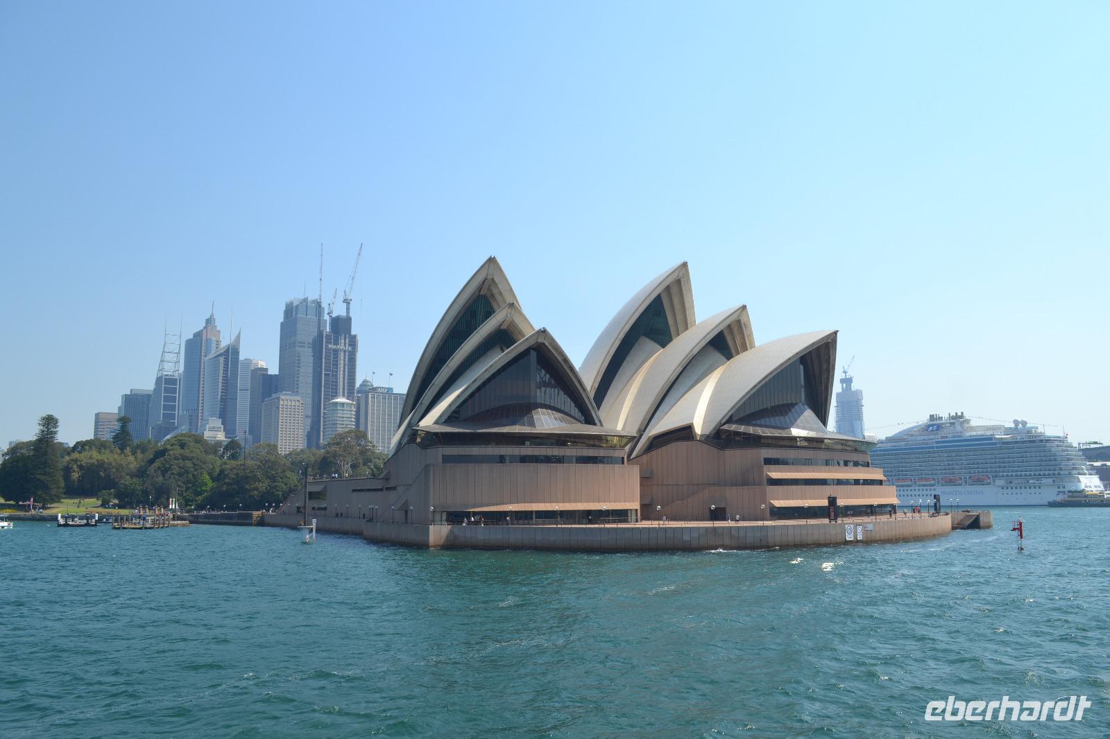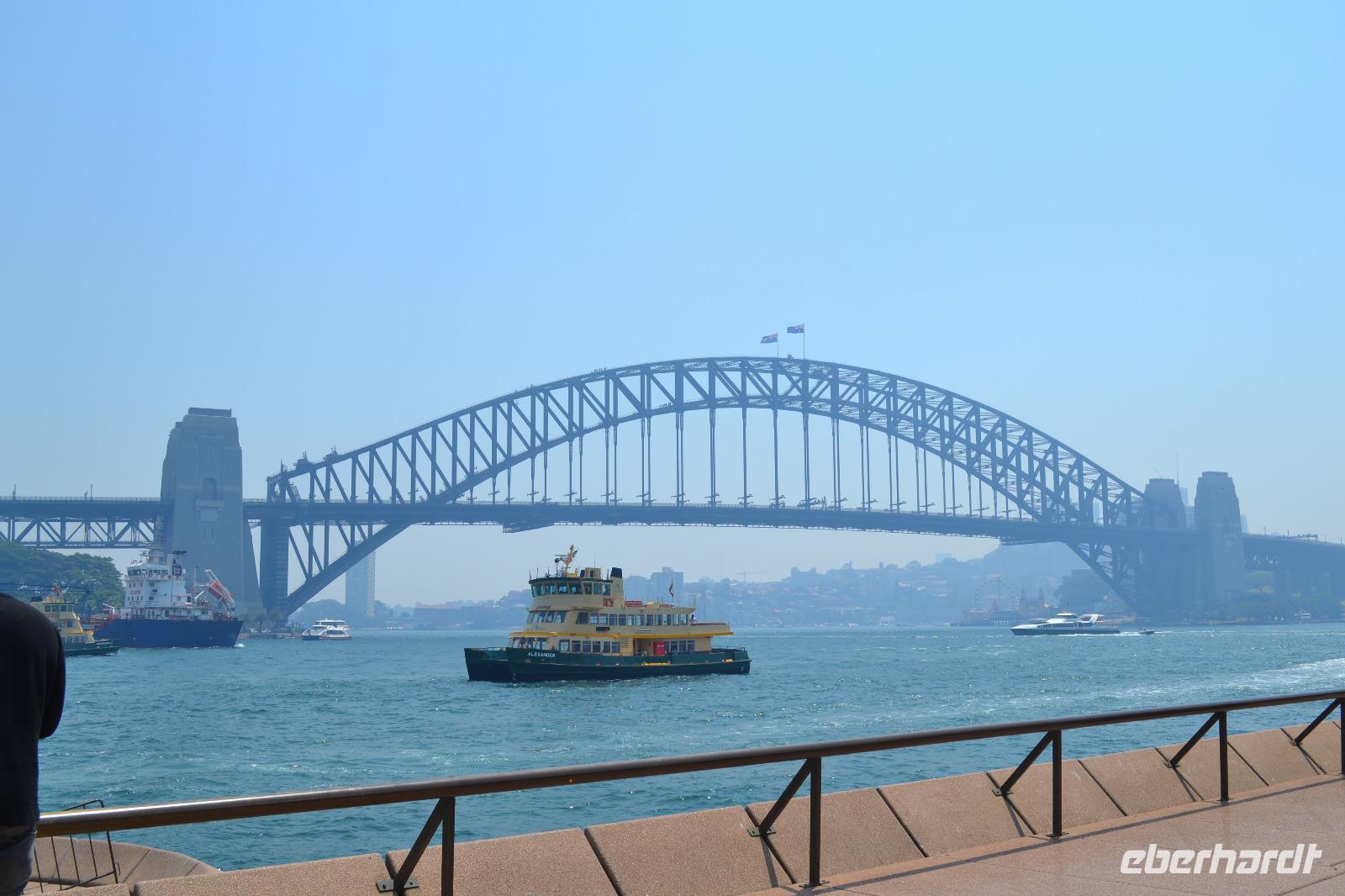Am Morgen holte uns Uli zusammen mit Busfahrer Max von dem zentralen Hotel in Sydney ab. Zuerst fuhren wir zu dem Aussichtspunkt wo wir einen Gesamtblick über die Oper, Harbour Bridge und der Skyline hatten. Weiter ging es durch die Vororte vorbei an dem Darling Harbour, entlang des historischen Viertel „The Rocks", Kings Cross und Paddington. Entfernt von den Hochhäusern merkte man nicht mehr, dass es sich um eine Weltmetropole handelte. Die hübsch angelegten Stadtteile mit den lila blühenden Jacaradas gefielen uns sehr. Leider lag auch heute noch ein Rauchfilm über der Stadt, sodass unsere Aufnahmen an den Fotostopps nur bedingt gelungen sind. Gegen Mittag gelangten wir zum Bondi Beach, dem bekanntesten Surf Spot der Welt. Auch wir konnten heute trotz niedrigen Wellen einigen Sportlern beim Wellenreiten zusehen. Gemeinsam spazierten wir den Coastal Walk, wo gerade die Sculpture by the Sea zu sehen waren. Dabei handelt es sich um die größte temporäre Ausstellung von Bildhauerarbeiten im öffentlichen Raum. Rund 100 Kunstwerke von Künstlern aus aller Welt werden hier präsentiert. Auf dem Rückweg zum Bus blieb uns noch Zeit den Strandabschnitt entlang zu laufen. Anschließend fuhren wir zurück in die Stadt, wo wir am Hafen eine Mittagspause an einem Food Court einlegten. Nur wenige Gehminuten entfernt erreichten wir das Opernhaus. Wir wurden von einer österreichischen Gästeführerin in Empfang genommen und durch die magischen Hallen und verschiedenen Konzertsäle geführt. Dabei erzählte Sie uns lustige und spannenden Anekdoten über die Entstehung und Geschichte der Oper. Das Gebäude, welches durch den Architekten Jørn Utzon geplant wurde, ist Oktober 1973 offiziell von Königin Elisabeth II., übergeben worden. Zur feierlichen Eröffnung wurde Beethovens Neunte mit der Ode An die Freude gespielt. Im Anschluss ging es für uns auf das Schiff, wo wir uns die Stadt noch einmal von einer anderen Perspektive ansahen. Dabei kamen wir unmittelbar an der Residenz der königlichen Familie bei staatlichen Besuchen vorbei. Nachdem wir zurück am Hafen waren, stand uns der Nachmittag zur freien Verfügung. Laura spazierte mit einigen Gäste gemeinsam über die Harbour Bridge. Sie stellt den Hauptverbindungszweig zwischen Nord- und Süd Sydney dar und wird von den australischen Bürgern liebevoll „Kleiderbügel" genannt. Am Abend trafen wir uns um zu unserem Fischrestaurant am Darling Harbour zu spazieren. Dort erwartete uns ein leckeres 3-Gänge-Menü auf der Terrasse. Als Abschluss des Abends nahm uns Laura noch mit in eine Drehbare Skybar. Die o-Bar liegt im 47. Stock und besticht mit einem tollen Blick auf das nächtlich beleuchtete Sydney. Wir ließen uns den Cocktail schmecken!