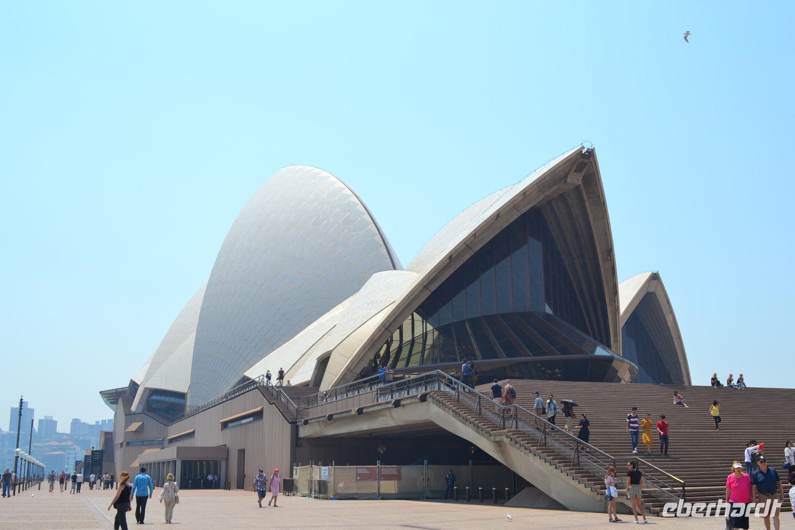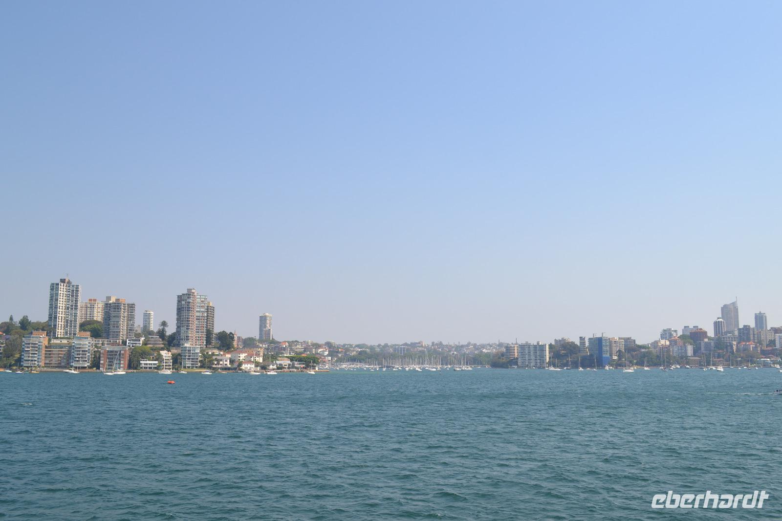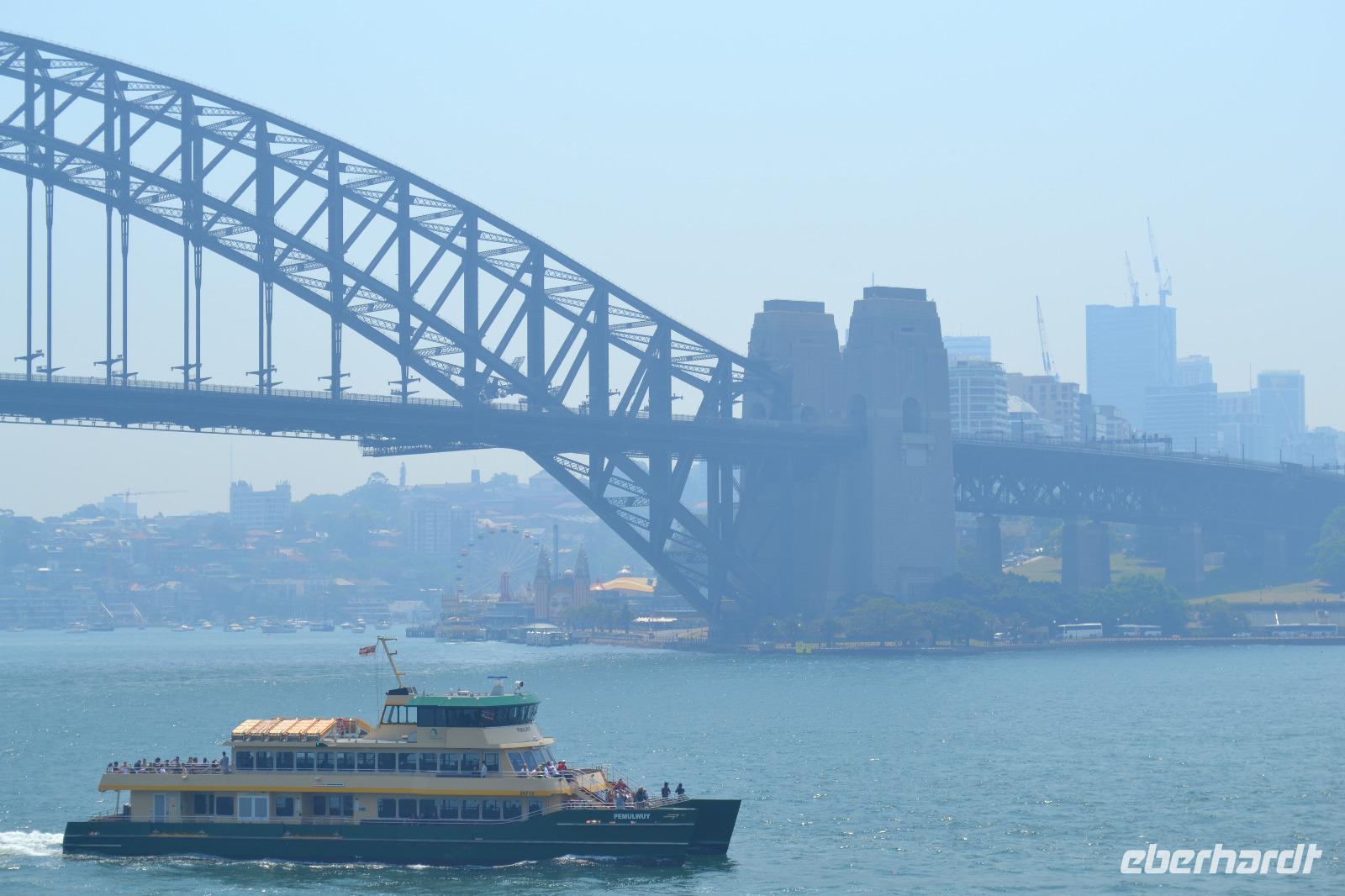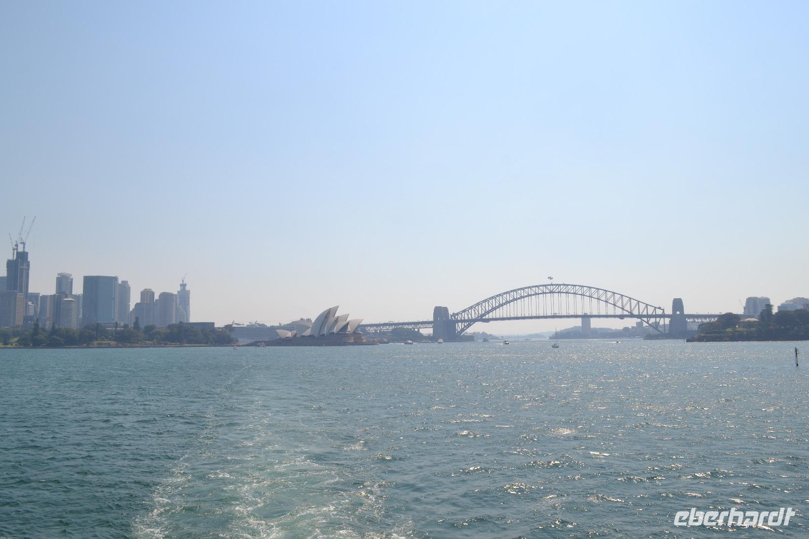 Am Morgen holte uns Uli zusammen mit Busfahrer Max von dem zentralen Hotel in Sydney ab. Zuerst fuhren wir zu dem Aussichtspunkt wo wir einen Gesamtblick über die Oper, Harbour Bridge und der Skyline hatten. Weiter ging es durch die Vororte vorbei an dem Darling Harbour, entlang des historischen Viertel „The Rocks", Kings Cross und Paddington. Entfernt von den Hochhäusern merkte man nicht mehr, dass es sich um eine Weltmetropole handelte. Die hübsch angelegten Stadtteile mit den lila blühenden Jacaradas gefielen uns sehr. Leider lag auch heute noch ein Rauchfilm über der Stadt, sodass unsere Aufnahmen an den Fotostopps nur bedingt gelungen sind. Gegen Mittag gelangten wir zum Bondi Beach, dem bekanntesten Surf Spot der Welt. Auch wir konnten heute trotz niedrigen Wellen einigen Sportlern beim Wellenreiten zusehen. Gemeinsam spazierten wir den Coastal Walk, wo gerade die Sculpture by the Sea zu sehen waren. Dabei handelt es sich um die größte temporäre Ausstellung von Bildhauerarbeiten im öffentlichen Raum. Rund 100 Kunstwerke von Künstlern aus aller Welt werden hier präsentiert. Auf dem Rückweg zum Bus blieb uns noch Zeit den Strandabschnitt entlang zu laufen. Anschließend fuhren wir zurück in die Stadt, wo wir am Hafen eine Mittagspause an einem Food Court einlegten. Nur wenige Gehminuten entfernt erreichten wir das Opernhaus. Wir wurden von einer österreichischen Gästeführerin in Empfang genommen und durch die magischen Hallen und verschiedenen Konzertsäle geführt. Dabei erzählte Sie uns lustige und spannenden Anekdoten über die Entstehung und Geschichte der Oper. Das Gebäude, welches durch den Architekten Jørn Utzon geplant wurde, ist Oktober 1973 offiziell von Königin Elisabeth II., übergeben worden. Zur feierlichen Eröffnung wurde Beethovens Neunte mit der Ode An die Freude gespielt. Im Anschluss ging es für uns auf das Schiff, wo wir uns die Stadt noch einmal von einer anderen Perspektive ansahen. Dabei kamen wir unmittelbar an der Residenz der königlichen Familie bei staatlichen Besuchen vorbei. Nachdem wir zurück am Hafen waren, stand uns der Nachmittag zur freien Verfügung. Laura spazierte mit einigen Gäste gemeinsam über die Harbour Bridge. Sie stellt den Hauptverbindungszweig zwischen Nord- und Süd Sydney dar und wird von den australischen Bürgern liebevoll „Kleiderbügel" genannt. Am Abend trafen wir uns um zu unserem Fischrestaurant am Darling Harbour zu spazieren. Dort erwartete uns ein leckeres 3-Gänge-Menü auf der Terrasse. Als Abschluss des Abends nahm uns Laura noch mit in eine Drehbare Skybar. Die o-Bar liegt im 47. Stock und besticht mit einem tollen Blick auf das nächtlich beleuchtete Sydney. Wir ließen uns den Cocktail schmecken!