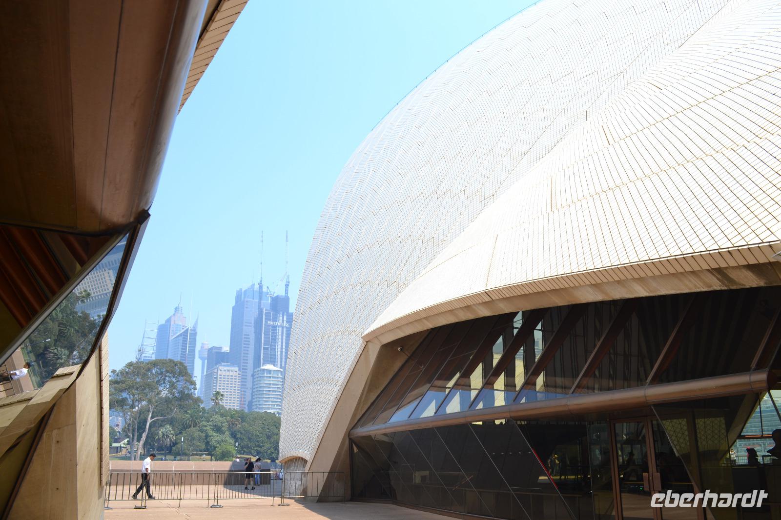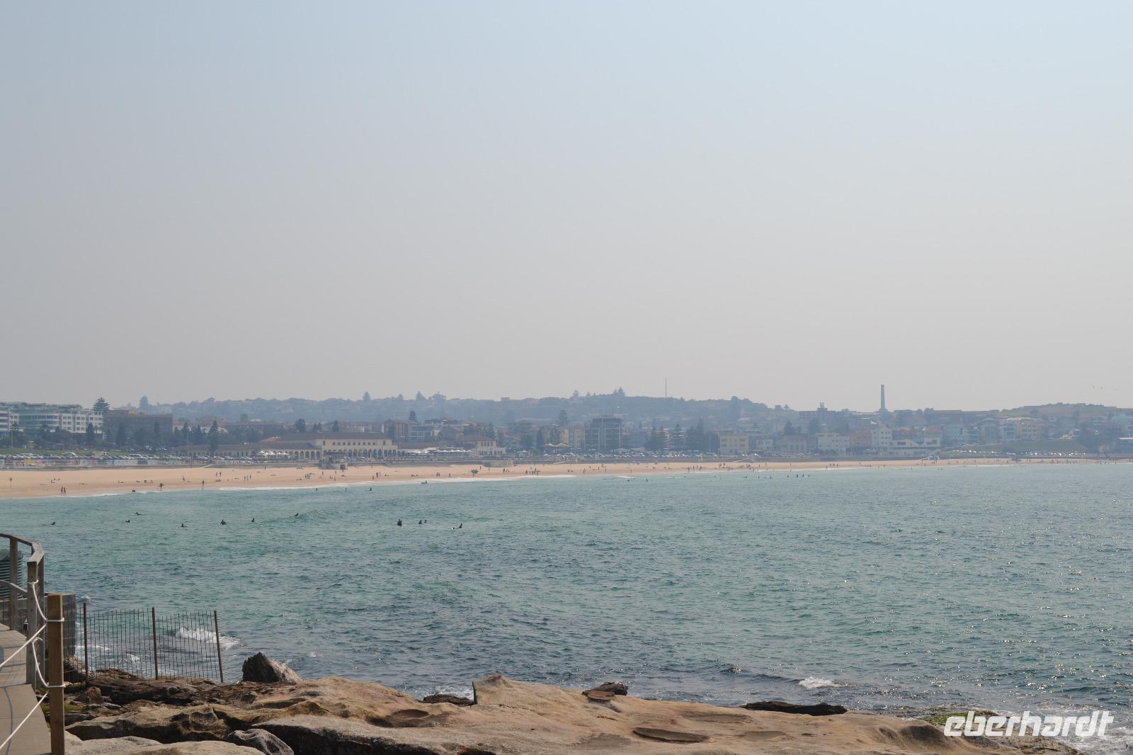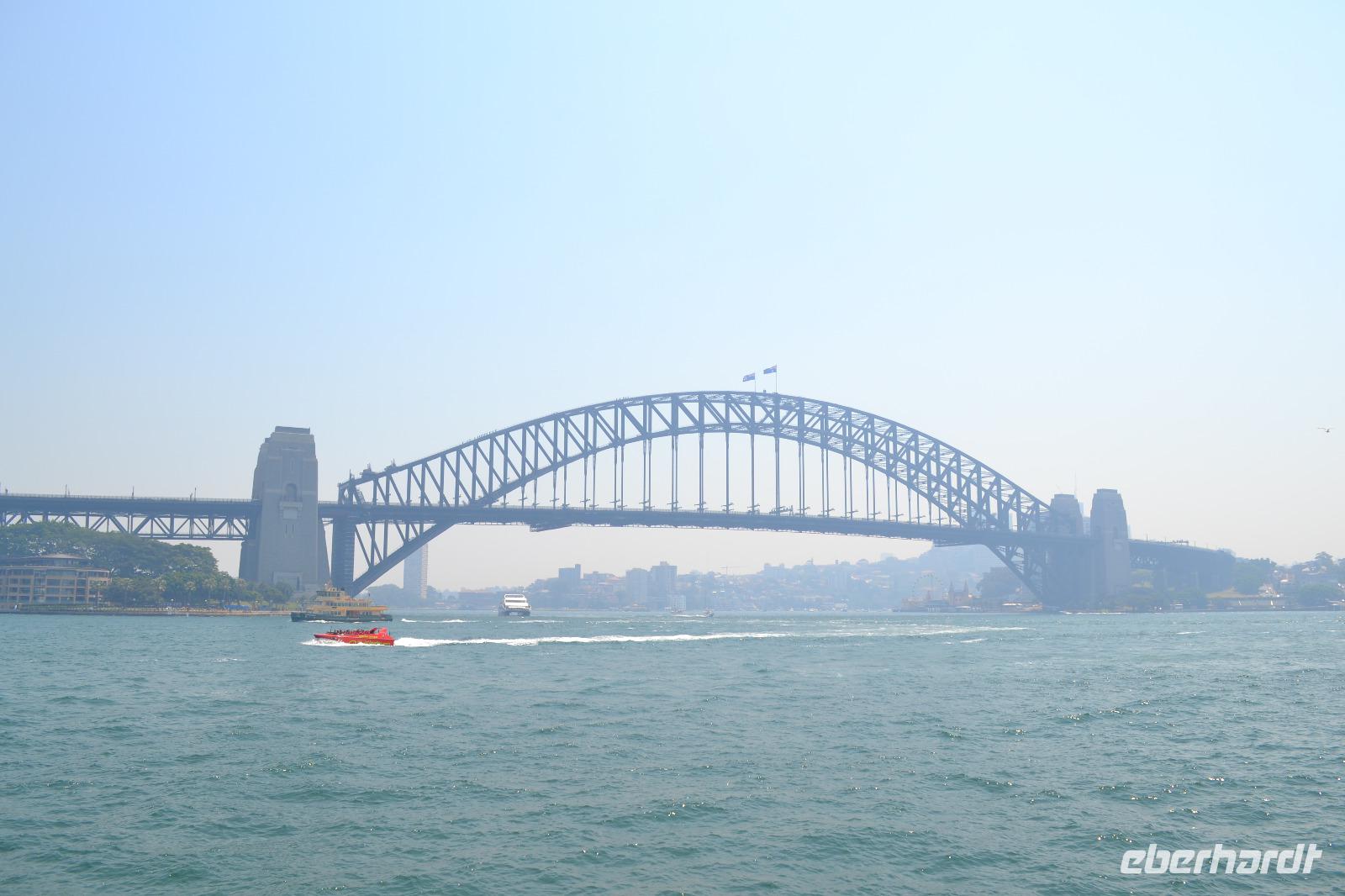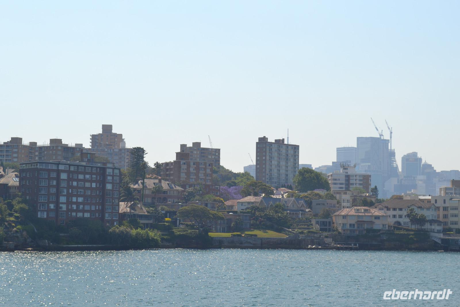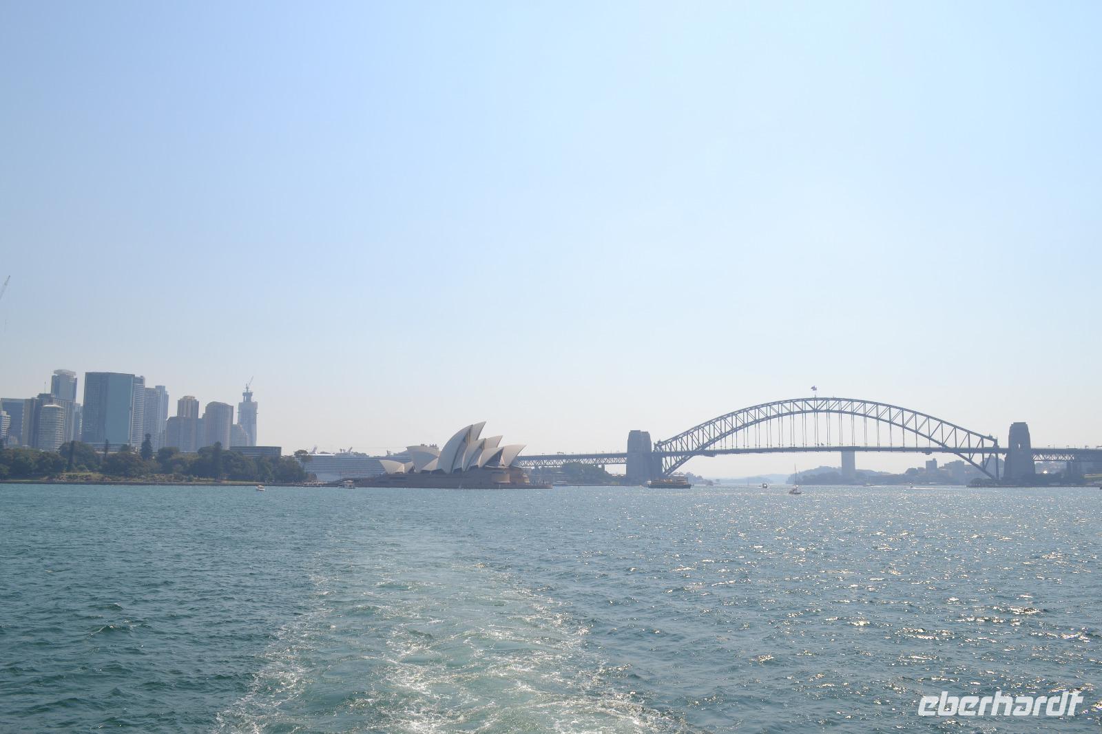 Am Morgen holte uns Uli zusammen mit Busfahrer Max von dem zentralen Hotel in Sydney ab. Zuerst fuhren wir zu dem Aussichtspunkt wo wir einen Gesamtblick über die Oper, Harbour Bridge und der Skyline hatten. Weiter ging es durch die Vororte vorbei an dem Darling Harbour, entlang des historischen Viertel „The Rocks", Kings Cross und Paddington. Entfernt von den Hochhäusern merkte man nicht mehr, dass es sich um eine Weltmetropole handelte. Die hübsch angelegten Stadtteile mit den lila blühenden Jacaradas gefielen uns sehr. Leider lag auch heute noch ein Rauchfilm über der Stadt, sodass unsere Aufnahmen an den Fotostopps nur bedingt gelungen sind. Gegen Mittag gelangten wir zum Bondi Beach, dem bekanntesten Surf Spot der Welt. Auch wir konnten heute trotz niedrigen Wellen einigen Sportlern beim Wellenreiten zusehen. Gemeinsam spazierten wir den Coastal Walk, wo gerade die Sculpture by the Sea zu sehen waren. Dabei handelt es sich um die größte temporäre Ausstellung von Bildhauerarbeiten im öffentlichen Raum. Rund 100 Kunstwerke von Künstlern aus aller Welt werden hier präsentiert. Auf dem Rückweg zum Bus blieb uns noch Zeit den Strandabschnitt entlang zu laufen. Anschließend fuhren wir zurück in die Stadt, wo wir am Hafen eine Mittagspause an einem Food Court einlegten. Nur wenige Gehminuten entfernt erreichten wir das Opernhaus. Wir wurden von einer österreichischen Gästeführerin in Empfang genommen und durch die magischen Hallen und verschiedenen Konzertsäle geführt. Dabei erzählte Sie uns lustige und spannenden Anekdoten über die Entstehung und Geschichte der Oper. Das Gebäude, welches durch den Architekten Jørn Utzon geplant wurde, ist Oktober 1973 offiziell von Königin Elisabeth II., übergeben worden. Zur feierlichen Eröffnung wurde Beethovens Neunte mit der Ode An die Freude gespielt. Im Anschluss ging es für uns auf das Schiff, wo wir uns die Stadt noch einmal von einer anderen Perspektive ansahen. Dabei kamen wir unmittelbar an der Residenz der königlichen Familie bei staatlichen Besuchen vorbei. Nachdem wir zurück am Hafen waren, stand uns der Nachmittag zur freien Verfügung. Laura spazierte mit einigen Gäste gemeinsam über die Harbour Bridge. Sie stellt den Hauptverbindungszweig zwischen Nord- und Süd Sydney dar und wird von den australischen Bürgern liebevoll „Kleiderbügel" genannt. Am Abend trafen wir uns um zu unserem Fischrestaurant am Darling Harbour zu spazieren. Dort erwartete uns ein leckeres 3-Gänge-Menü auf der Terrasse. Als Abschluss des Abends nahm uns Laura noch mit in eine Drehbare Skybar. Die o-Bar liegt im 47. Stock und besticht mit einem tollen Blick auf das nächtlich beleuchtete Sydney. Wir ließen uns den Cocktail schmecken!