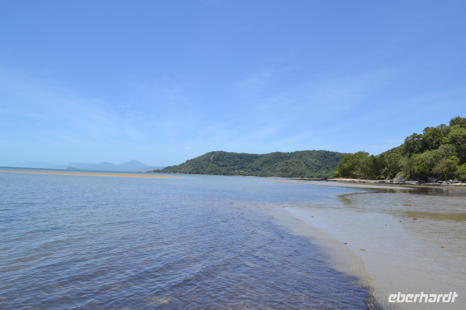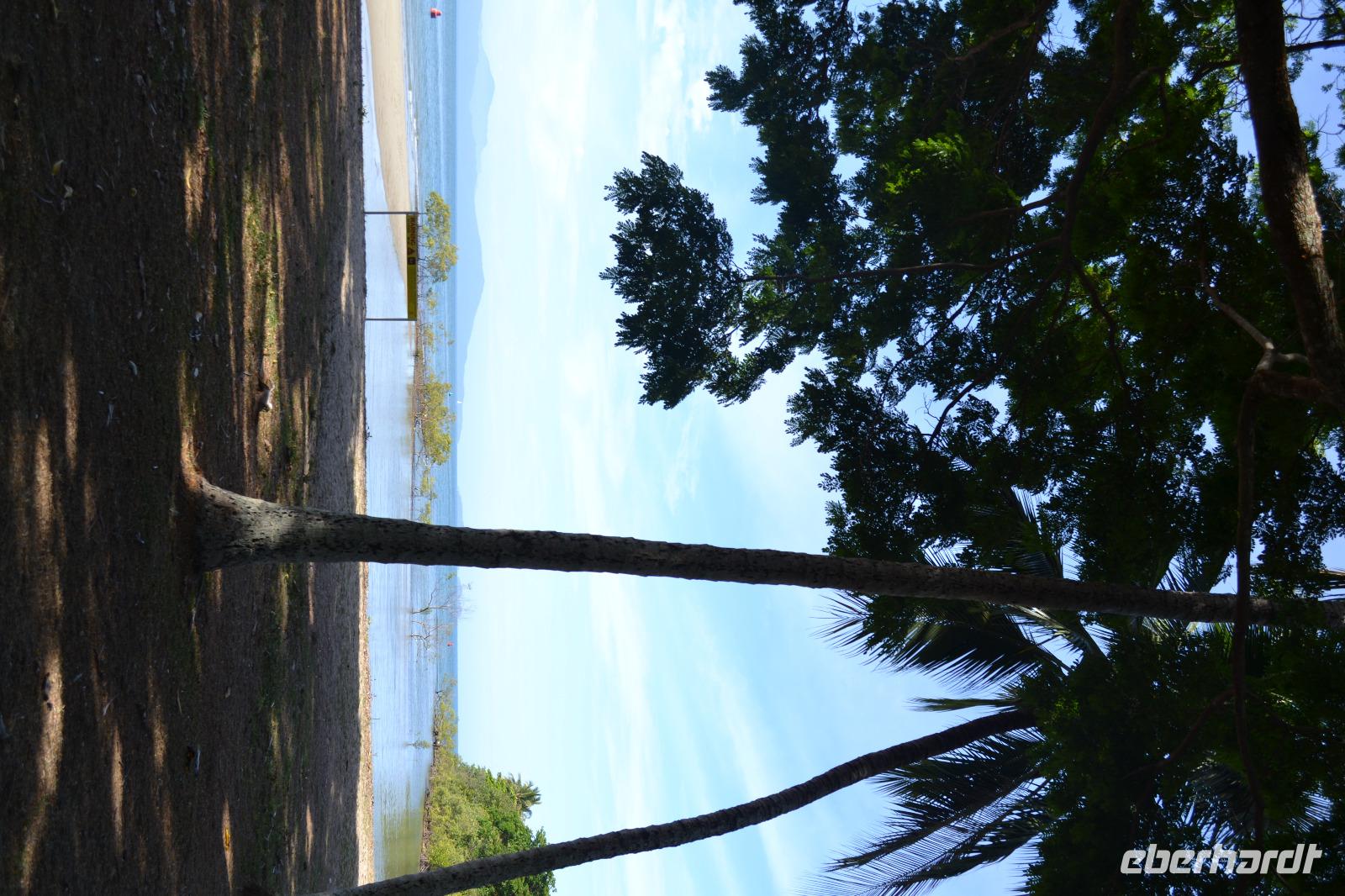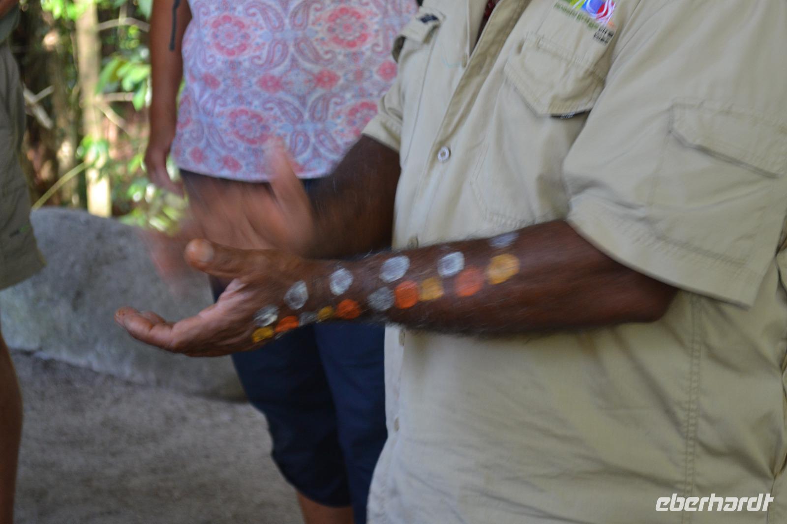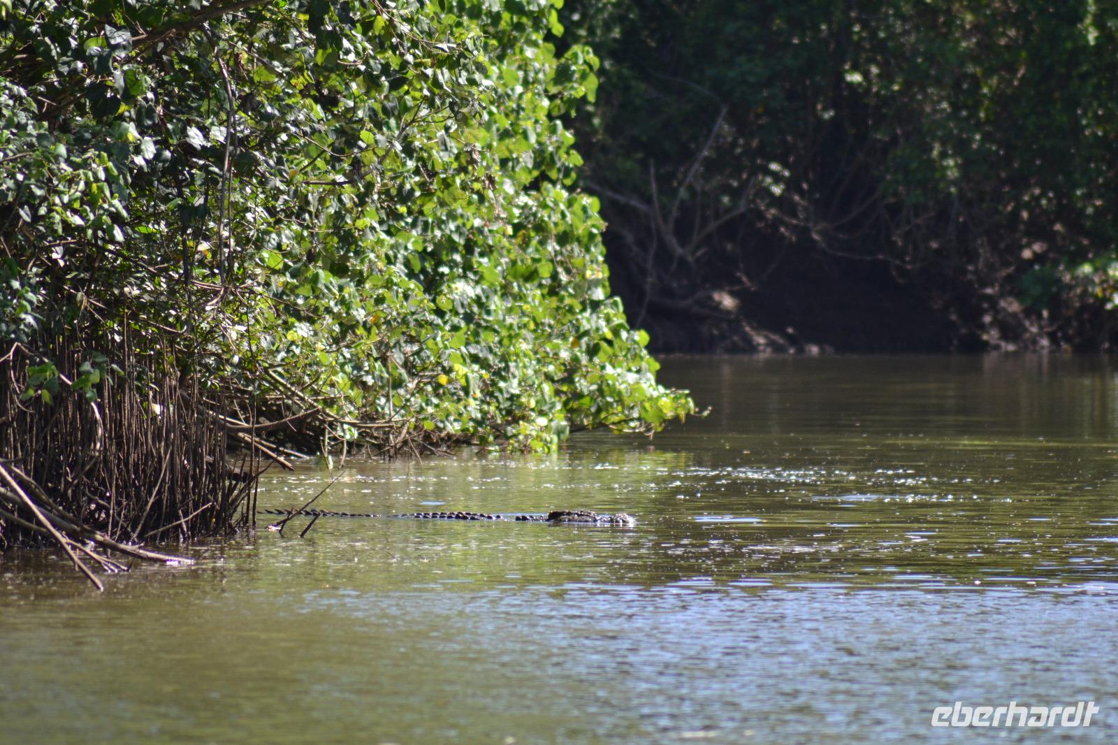 Den heutigen Tag nutzen einige Gäste zum Entspannen in Palm Cove. 12 Gäste fuhren mit Laura und Annette in den Daintree-Nationalpark. Die Fahrt entlang der wunderschönen Küste führte uns nach Mossmann Gorge wo wir mit einer Aborigine Zeremonie willkommen geheißen wurden. Wir tanzten gemeinsam mit Vater und Sohn um ein stark rauchendes, erloschenes Feuer. Danach erklärten Sie uns die verschiedenen Bemalungen der Stammesmitglieder und womit die Farbe hergestellt wird. In dem Kulturzentrum wurde uns ein typisch australisches Gebäck mit Marmelade und Sahne gereicht. Nach der kleinen Stärkung am Morgen ging es mit dem Shuttlebus zu dem Mossmann-Fluss. Hier spazierten wir auf den Pfaden entlang des Flusses und konnten die verwurzelten Bäume und Pflanzen bestaunen. Die Gegend rund um den Fluss wird auf Grund der Feuchtigkeit vorwiegend für den Zuckerrohr Anbau genutzt. Der ein oder andere hätte hier sicherlich noch länger verweilen können. Doch es ging mit dem nächsten Shuttlebus wieder zurück in das Zentrum, wo bereits unser Bus auf uns wartete um uns zu dem Mittagessen zu bringen. Auf dem Weg dort hin stiegen wir an dem traumhaften mit Palmen besetzten Wonga Beach aus und hielten unsere Füße in das warme Wasser. 12 Uhr erreichten wir das Daintree Teahouse welches im Frühjahr leider von einem Hochwasser des nebenliegenden Flusses überflutet wurde. Doch Sie haben es in wenigen Monaten geschafft wieder betriebsfähig zu sein und darüber waren wir sehr froh. Da Essen wurde mit viel Liebe zum Detail angerichtet. Auf jedem Teller lagen ca. 8 einheimische Fruchtstücke, welche uns der Besitzer während des Essens erklärte. Das Restaurant lag in Mitten des Regenwaldes. Am Nachmittag fuhren wir zu dem Bootsanleger, wo wir die nächste Stunde auf Krokodil Suche gingen. Wir konnten viele unterschiedliche Lebewesen wie den Graureiher, Eisvogel und einen grünen Frosch entdecken. Wir machten uns zum Ende der Tour keine Hoffnung auf ein Krokodil, da das Wasser schon sehr warm war und die Tiere keinen Grund mehr hatten aufzutauchen. Doch das größte bekannteste Krokodil des Flusses fühlte sich von uns gestört und schwamm plötzlich aus dem nichts auf uns zu. Das hatte selbst unser Bootsführer lange nicht mehr erlebt. Nun entdeckten wir noch das ein oder andere am Ufer entlang schwimmen. Auf der Rückfahrt nach Cairns hielten wir für einen Strandspaziergang in der kleinen Hafenstadt Port Douglas. Der Ort lebt hauptsächlich von Touristen, denn hier gibt es eine Vielzahl an hochwertigen Hotels und einen Golfplatz. Leider ist die Stadt auch seit dem Tod des australische „Crocodile Hunter" Steve Irwin 2006 bekannt. Er starb bei Dreharbeiten zu einer Tierdokumentation durch den Stich eines Stachelrochens. Mit einer letzten Fotostopp mit der Aussicht auf die Küste vor Cairns verabschiedeten wir uns von unserer Reiseleiterin. Am Abend bummelten wir gemütlich von dem Hotel entlang der Esplanade zu unserem Abschluss Abendessen. Laura Verabschiedete sich mit einem kleinen Glas Honig von uns. Die Süßigkeit ist auf Grund der geringen zahl an Bienen in Australien eine Seltenheit, genauso wie das Glück nach Australien zu kommen. Wir verabschiedeten uns von den Gästen, welche weiter nach Neuseeland reisen, denn sie mussten früh aufstehen.