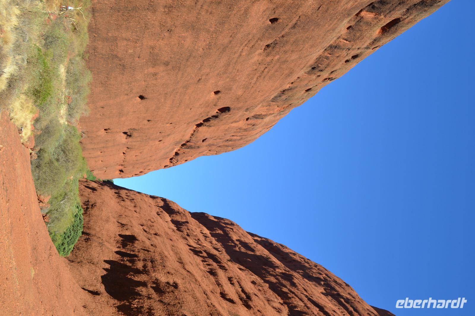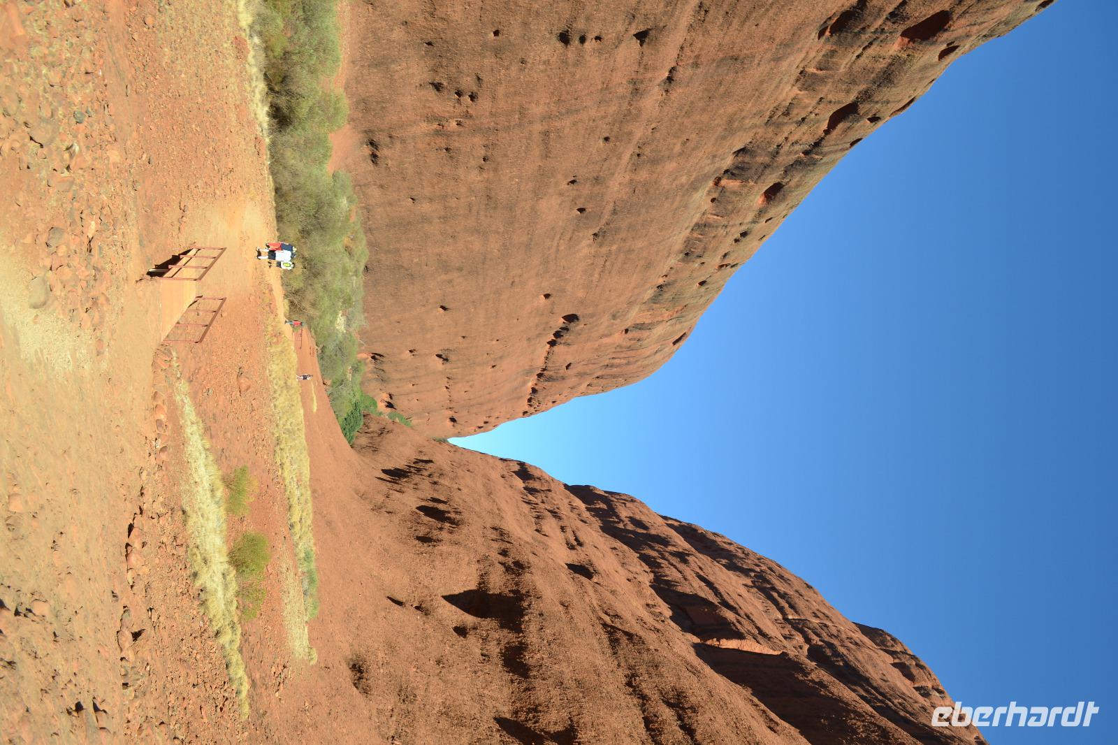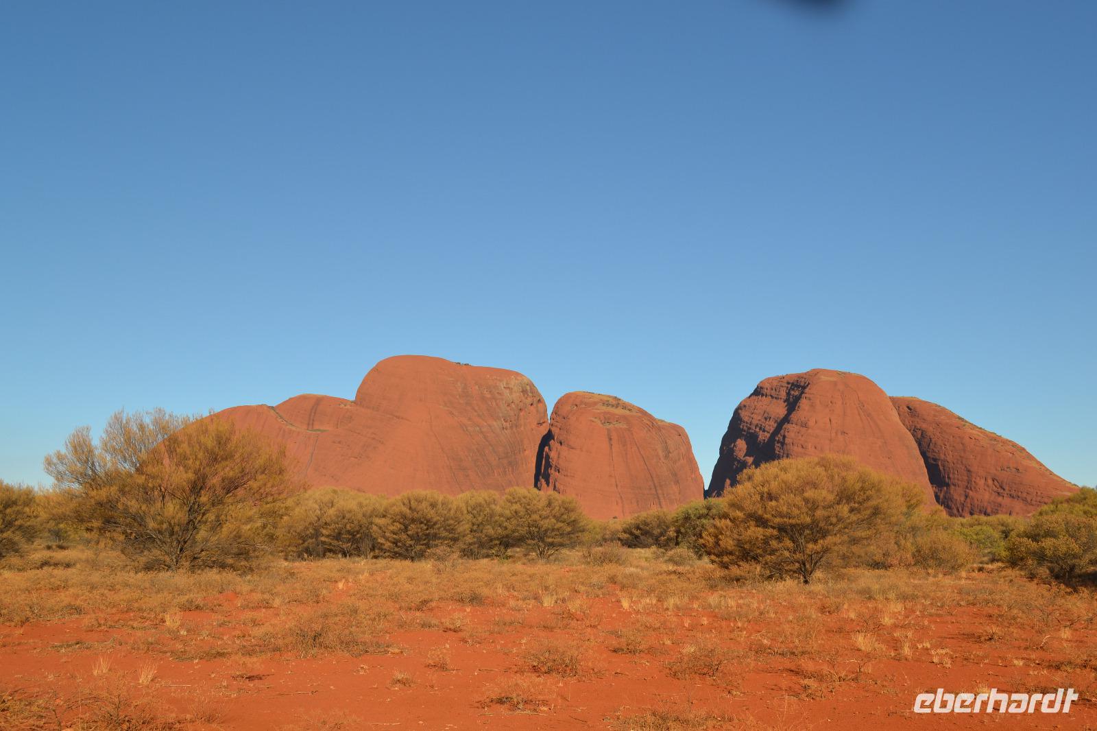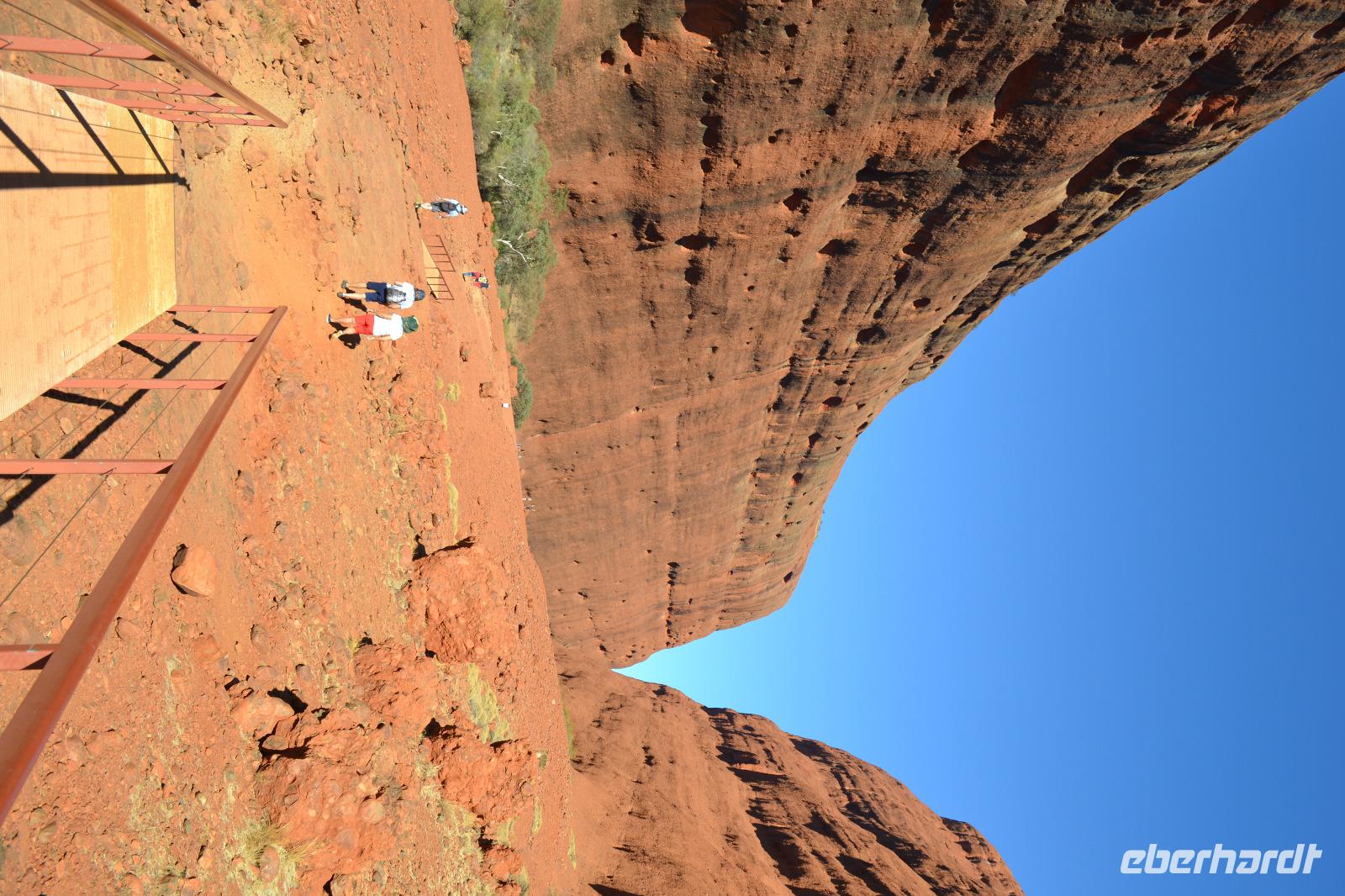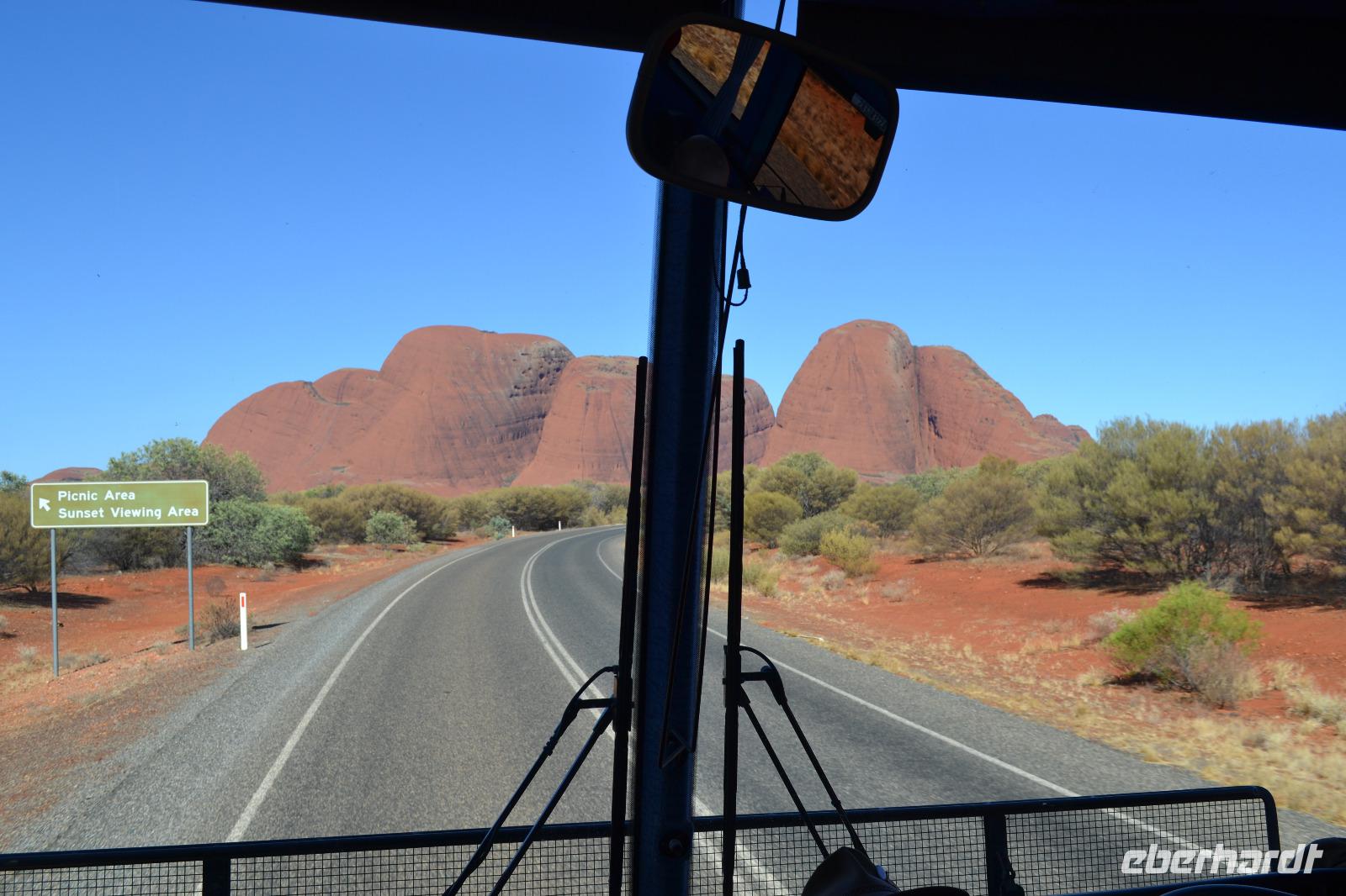 Heute stand eine lange Busfahrt durch das rote Outback bevor. Wir verließen unser Hotel in Alice Springs und legten nach der ersten Etappe eine Pause an einer Straußenfarm ein. Leider hatte diese heute geschlossen, doch an der Tankstelle stand ein Dromedar und ein paar Strauße zum Füttern bereit. Weiter ging es Richtung Ayers Rock! Der Busfahrer hatte es heute leicht, denn auf der ca. 5 Stündigen Fahrt musste er nur 1-mal rechts abbiegen. Entlang des Stuart Highway hielten wir an einer roten Sanddüne, hinter welcher sich ein ausgetrockneter Salzsee befand. Dieser liegt bereits seit vielen Jahren ohne Wasser brach, aber die weißen Salzrückstände sind geblieben. Von dort aus hatte man einen tollen Blick auf den Mount Connor. Der Tafelberg wird oft mit dem Uluru verwechselt, da sich beide sehr ähnlichsehen. Wir trafen am frühen Nachmittag in unserem Hotel ein und konnten uns ein wenig ausruhen und auf die Wanderung an den Olgas vorbereiten. Einige Gäste nutzen die Zeit für ein Schläfchen, andere aßen eine Kleinigkeit zum Mittag oder fuhren zusammen mit Eva in das „Zentrum" von Ayers Rock. 15:30 Uhr fuhren wir gemeinsam zu dem Kata Tjutas, eine Gruppe von 36 Bergen. Sie sind auch bekannt unter dem Namen „die Olgas", benannt nach Königin Olga von Württemberg, die Gemahlin König Karls. Wir wanderten ca. 1 Stunde zu der Felsspalte und waren froh uns die Fliegennetze gekauft zu haben. Auch auf das trinken konnte heute auf keinen Fall verzichtet werden, denn durch die geringe Luftfeuchtigkeit kann es schnell zu Dehydrierungen kommen. Im Anschluss fuhren wir zu unserem heutigen Highlight- dem Sonnenuntergang am Uluru! Wir waren nicht die einzigen Touristen, die dieses Spektakel erleben wollte. Wir hatten unseren separaten Tisch mit ein paar kleinen Snacks und Sekt. Unsere Reisebegleitung hatte heute Geburtstag und gab auch noch ein Gläschen Schnaps aus. Wir beobachteten die untergehende Sonne und die sich veränderten Rottöne am Felsen. Als die Sonne verschwunden war sind wir zurück in unser Hotel und hatten einen BBQ Abend. Wir suchten uns das rohe Fleisch an der Theke aus und grillten es nach eigenem Geschmack selbst. Laura verteilte an jeden ein Glas Wein. Da der heutige Tag sehr anstrengend war und wir bereits am frühen Morgen raus mussten gingen wir nach dem Essen direkt auf unsere Zimmer.