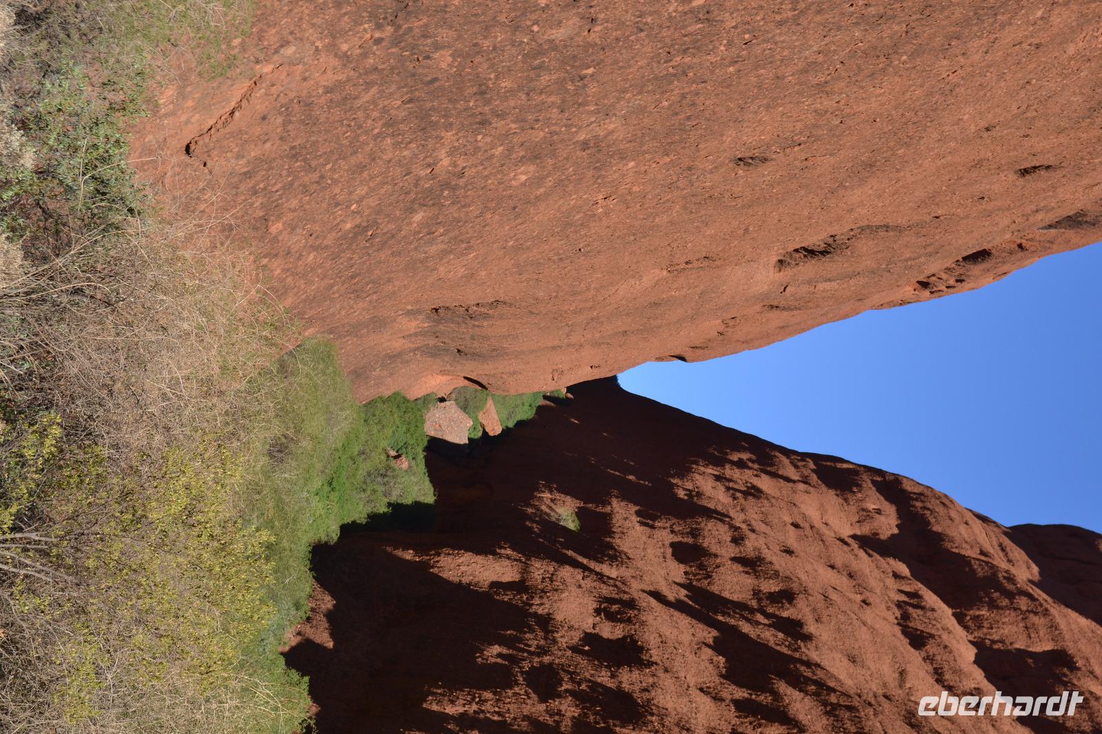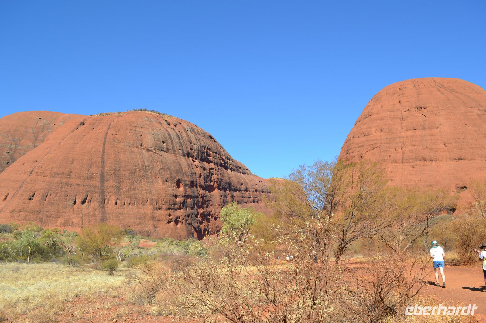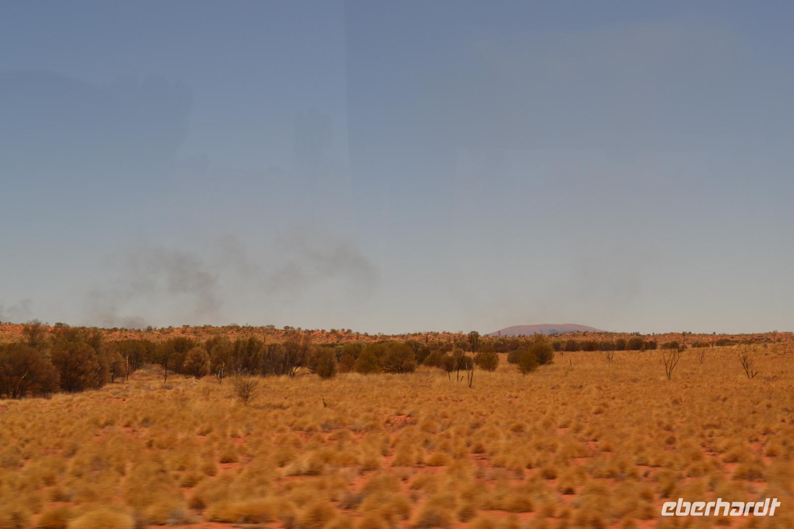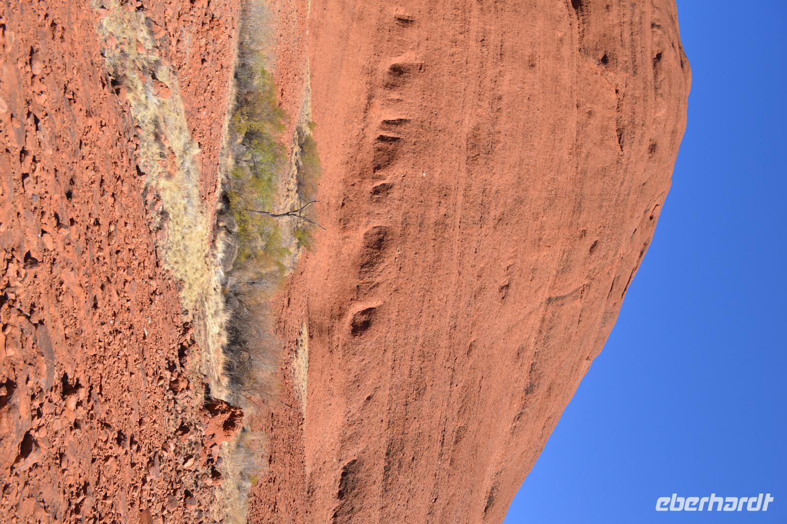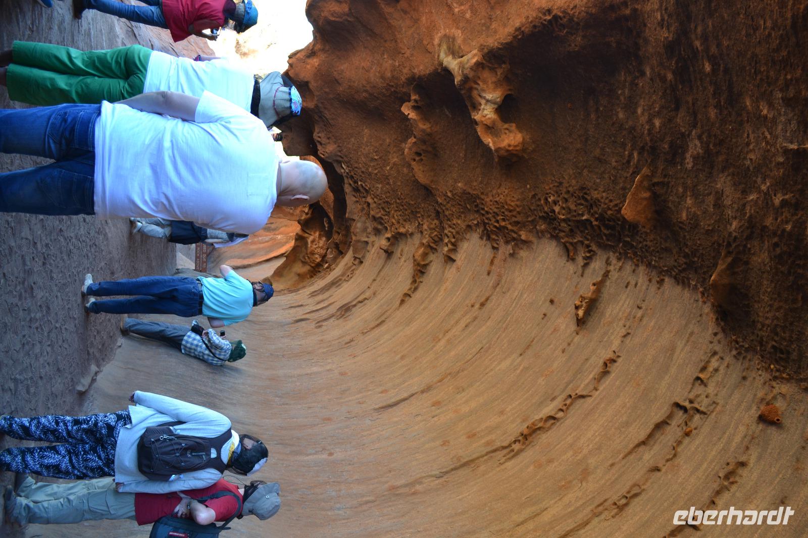 Heute stand eine lange Busfahrt durch das rote Outback bevor. Wir verließen unser Hotel in Alice Springs und legten nach der ersten Etappe eine Pause an einer Straußenfarm ein. Leider hatte diese heute geschlossen, doch an der Tankstelle stand ein Dromedar und ein paar Strauße zum Füttern bereit. Weiter ging es Richtung Ayers Rock! Der Busfahrer hatte es heute leicht, denn auf der ca. 5 Stündigen Fahrt musste er nur 1-mal rechts abbiegen. Entlang des Stuart Highway hielten wir an einer roten Sanddüne, hinter welcher sich ein ausgetrockneter Salzsee befand. Dieser liegt bereits seit vielen Jahren ohne Wasser brach, aber die weißen Salzrückstände sind geblieben. Von dort aus hatte man einen tollen Blick auf den Mount Connor. Der Tafelberg wird oft mit dem Uluru verwechselt, da sich beide sehr ähnlichsehen. Wir trafen am frühen Nachmittag in unserem Hotel ein und konnten uns ein wenig ausruhen und auf die Wanderung an den Olgas vorbereiten. Einige Gäste nutzen die Zeit für ein Schläfchen, andere aßen eine Kleinigkeit zum Mittag oder fuhren zusammen mit Eva in das „Zentrum" von Ayers Rock. 15:30 Uhr fuhren wir gemeinsam zu dem Kata Tjutas, eine Gruppe von 36 Bergen. Sie sind auch bekannt unter dem Namen „die Olgas", benannt nach Königin Olga von Württemberg, die Gemahlin König Karls. Wir wanderten ca. 1 Stunde zu der Felsspalte und waren froh uns die Fliegennetze gekauft zu haben. Auch auf das trinken konnte heute auf keinen Fall verzichtet werden, denn durch die geringe Luftfeuchtigkeit kann es schnell zu Dehydrierungen kommen. Im Anschluss fuhren wir zu unserem heutigen Highlight- dem Sonnenuntergang am Uluru! Wir waren nicht die einzigen Touristen, die dieses Spektakel erleben wollte. Wir hatten unseren separaten Tisch mit ein paar kleinen Snacks und Sekt. Unsere Reisebegleitung hatte heute Geburtstag und gab auch noch ein Gläschen Schnaps aus. Wir beobachteten die untergehende Sonne und die sich veränderten Rottöne am Felsen. Als die Sonne verschwunden war sind wir zurück in unser Hotel und hatten einen BBQ Abend. Wir suchten uns das rohe Fleisch an der Theke aus und grillten es nach eigenem Geschmack selbst. Laura verteilte an jeden ein Glas Wein. Da der heutige Tag sehr anstrengend war und wir bereits am frühen Morgen raus mussten gingen wir nach dem Essen direkt auf unsere Zimmer.