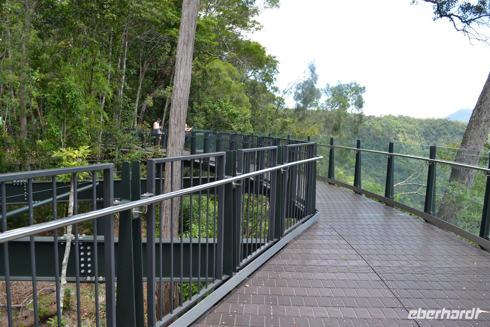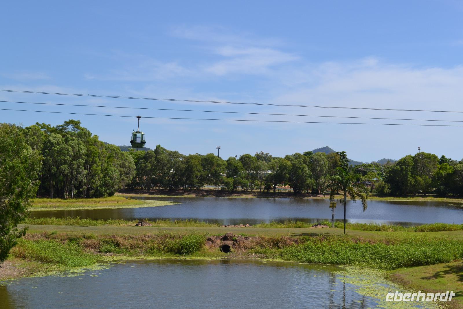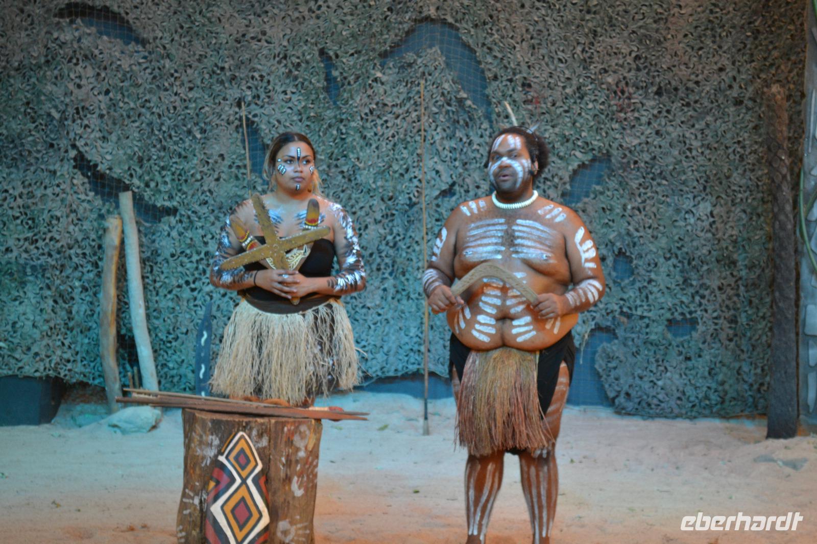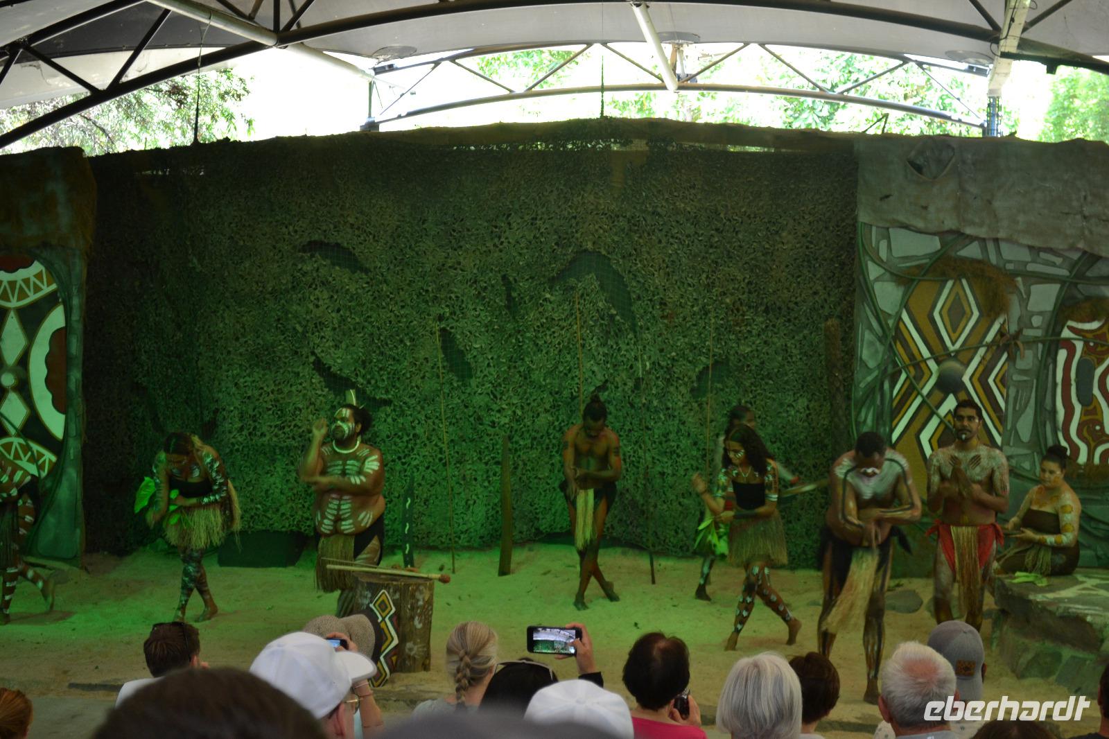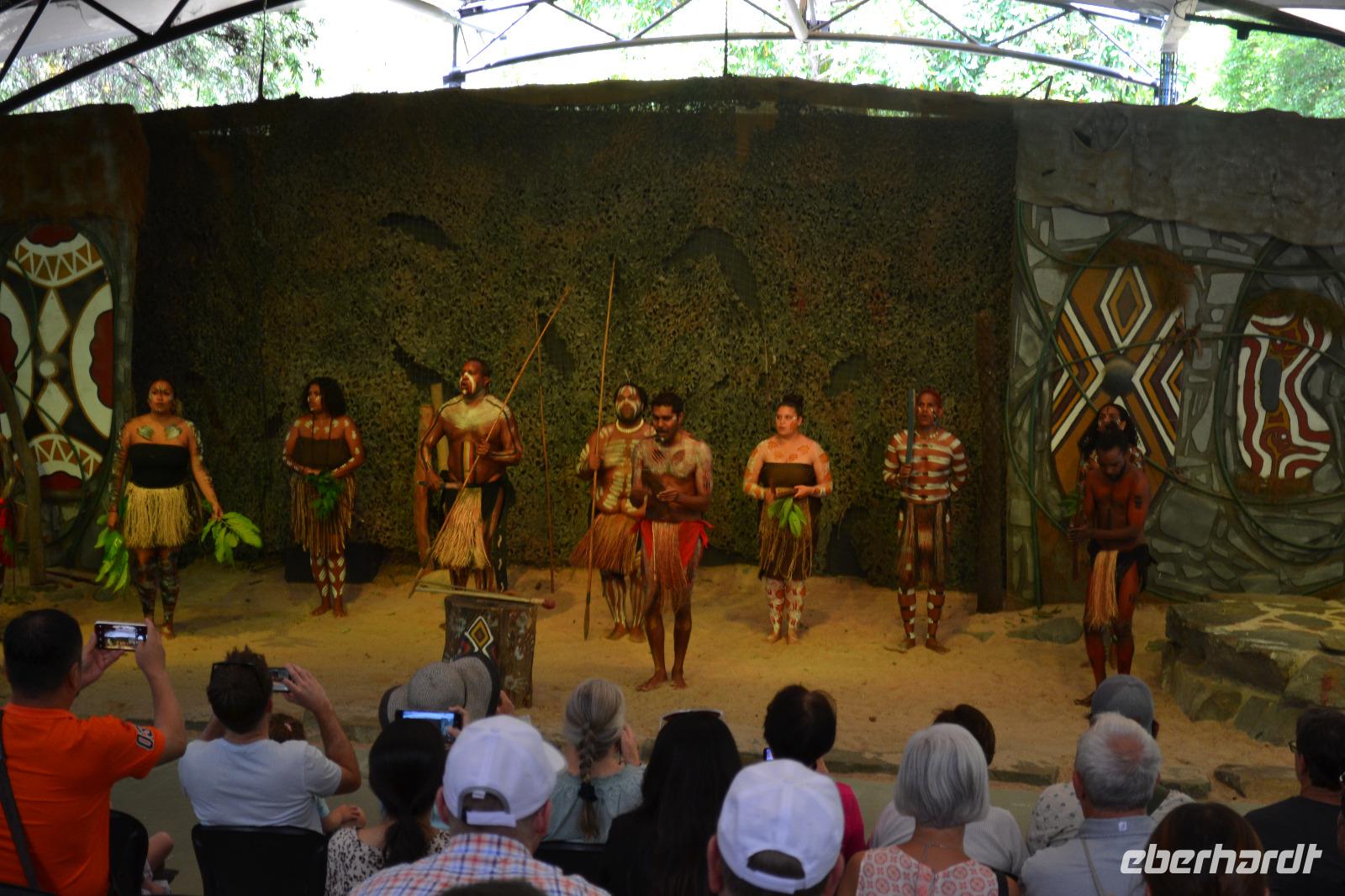 Nach einem reichhaltigen Frühstück verbrachten wir den heutigen Vormittag gemeinsam mit einer anderen Eberhardt Travel Gruppe in dem Tjapukai Kulturzentrum. Zunächst wurden wir in dem Kino bei einer Bilder- und Tanzshow begrüßt. Im Anschluss ging es über eine Brücke an einem kleinen See mit Schildkröten und Aalen vorbei. Diese konnten mit Brot gefüttert werden. Wir sammeln uns im Theater, wo uns von zwei Gästeführer einige Früchte des Regenwaldes, sowie die Waffen und Bestrafungen des Stammes erklärten. Als Abschluss wurde uns gezeigt wie man auf einem Didgeridoo spielt. Danach ging es für uns ans Eingemachte. Wir durften uns vor den Augen der Einheimischen beim Bumerang werfen ausprobieren. Nicht jeder hatte Erfolg dabei, aber Spaß hat es auf jeden Fall gemacht! Man kann behaupten in Australien einen Bumerang geworfen zu haben. Nach der sportlichen Aktion spazierten wir zurück in das Theater. Dort führten uns die Stammeszugehörigen eine Tanzdarbietung vor. Es handelte sich um Uralte Tänze des Tjapukai Stammes um Tiere zu vertreiben oder sich mit der Natur in Einklang zu bringen. Nach dem Bumerang folgte die nächste Disziplin im Speer werfen. Mittels eines Beschleunigers klappte das Werfen super und wir kamen weit. Mittags verließen wir das Zentrum und es ging mit der Skyrail bis nach Kuranda in den Regenwald. Unterwegs stiegen wir zweimal aus den Gondeln damit uns Annette einen Einblick in die Natur geben konnte. Dort tummelte es nur von Baumriesen und kleinen Tierchen. Um den Wald zu schützen wurden für die Touristen Pfade zum laufen errichtet. Somit zerstört man die kleinen Lebewesen nicht und sinkt in dem weichen Material nicht ein. Um die Barron Falls gut zu sehen baute man eine riesige Stahl Konstruktion mit Glasfenster in den Regenwald. Von da aus beobachteten wir Teenager in einen Teil des Wasserfalls springen. Für unser Mittagessen fuhren wir bis in den kleinen Ort Kuranda. Unser Essen wurde uns in einer Markthalle in mitten der Natur serviert. Auch ein paar schaulustige Leguane zeigten sich. Uns blieb noch ein wenig Zeit durch die Geschäfte zu bummeln oder in das Vogel-bzw. Schmetterlingshaus zu gehen. 15:15 Uhr trafen wir uns alle an dem Bahnhof um mit der Scenic Railway zurück nach Freshwater und dann weiter mit dem Bus nach Cairns zu fahren. Wir genossen die Fahrt mit dem Zug durch die Natur. Am Abend erreichten wir unser Hotel und Anette verabschiedete sich bis zum übernächsten Tag. Wir trafen uns zum Abendessen an der Hotelbar. Einige Gäste sind noch an der Esplanade hängen geblieben und bekamen glücklicherweise auch noch zu später Stunde ihr Menü.