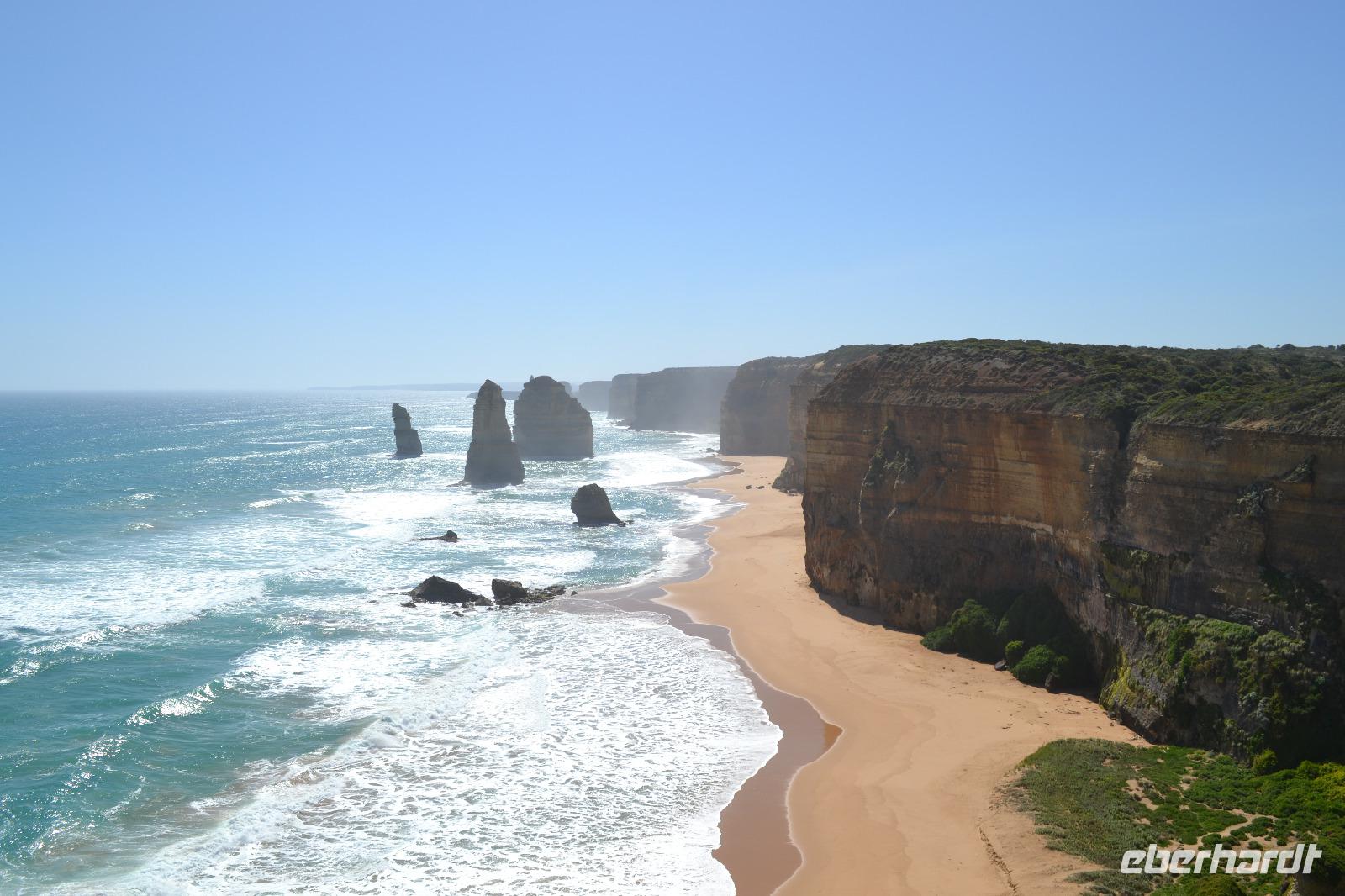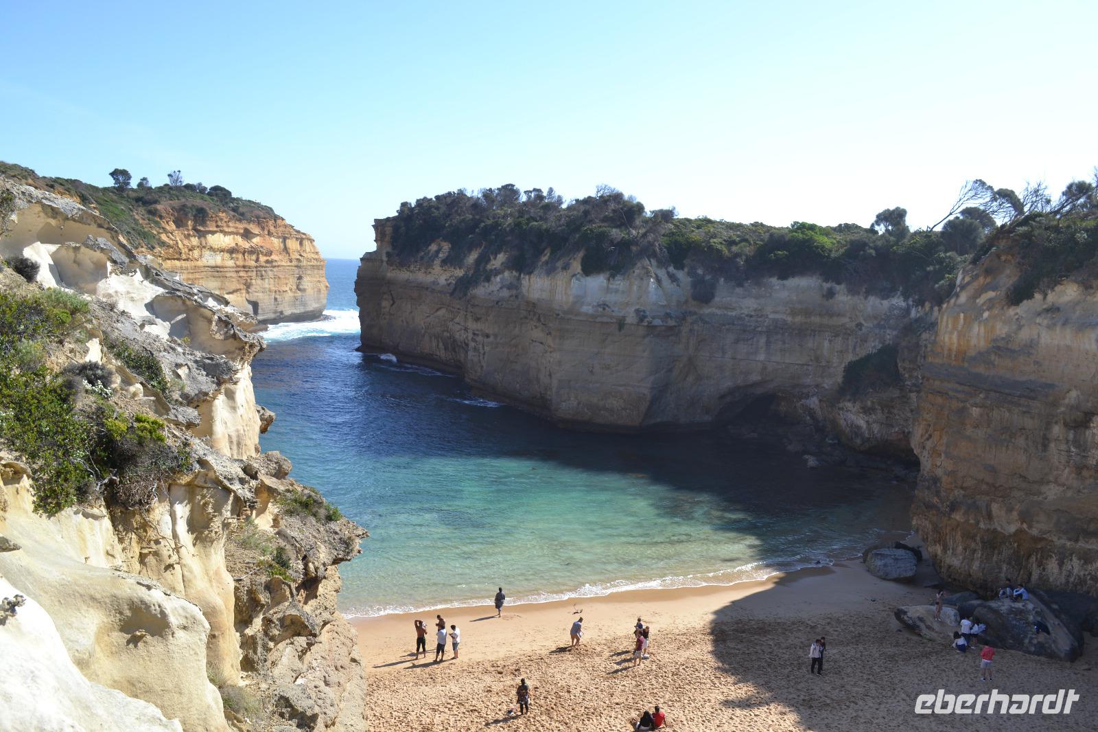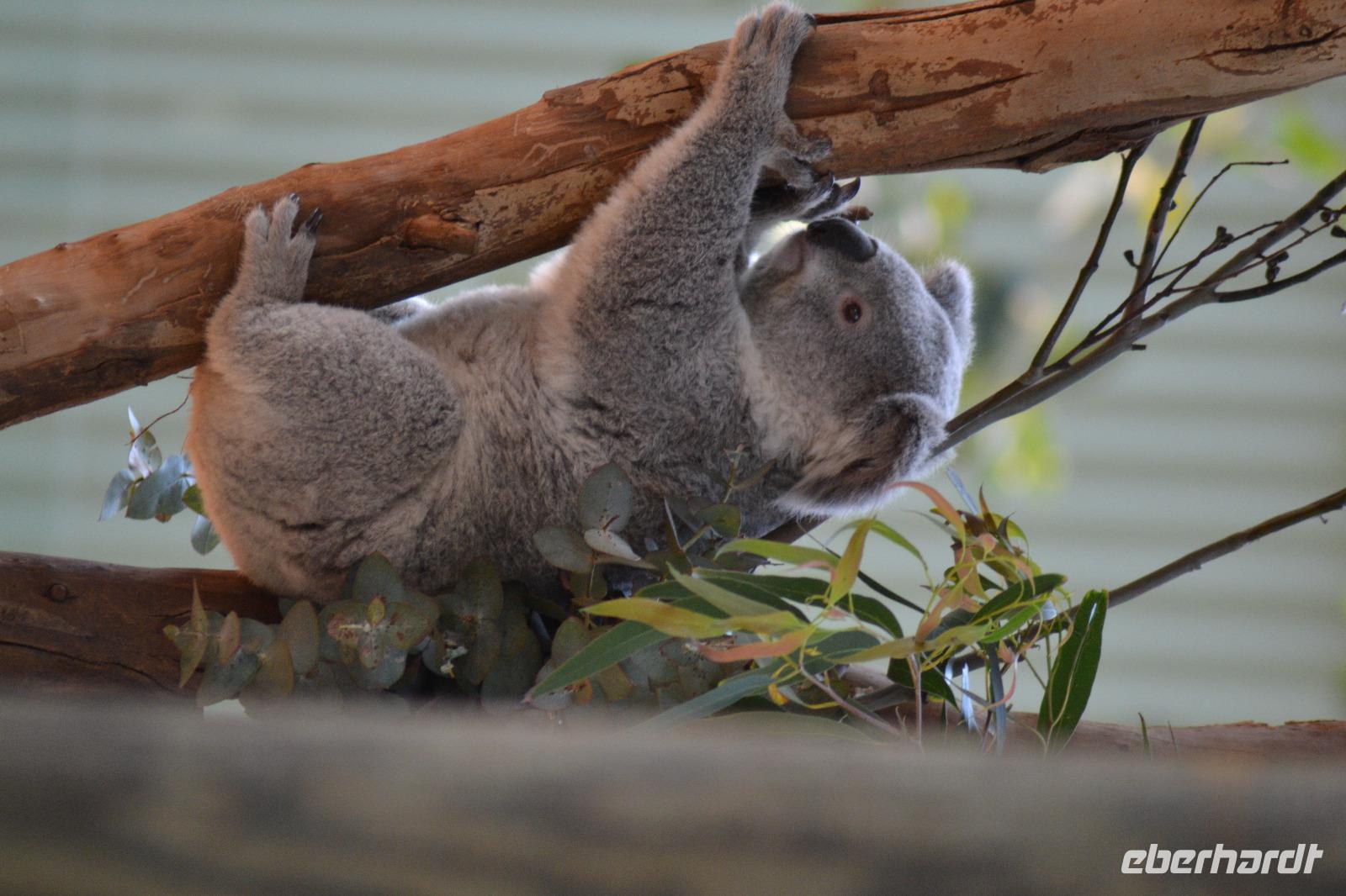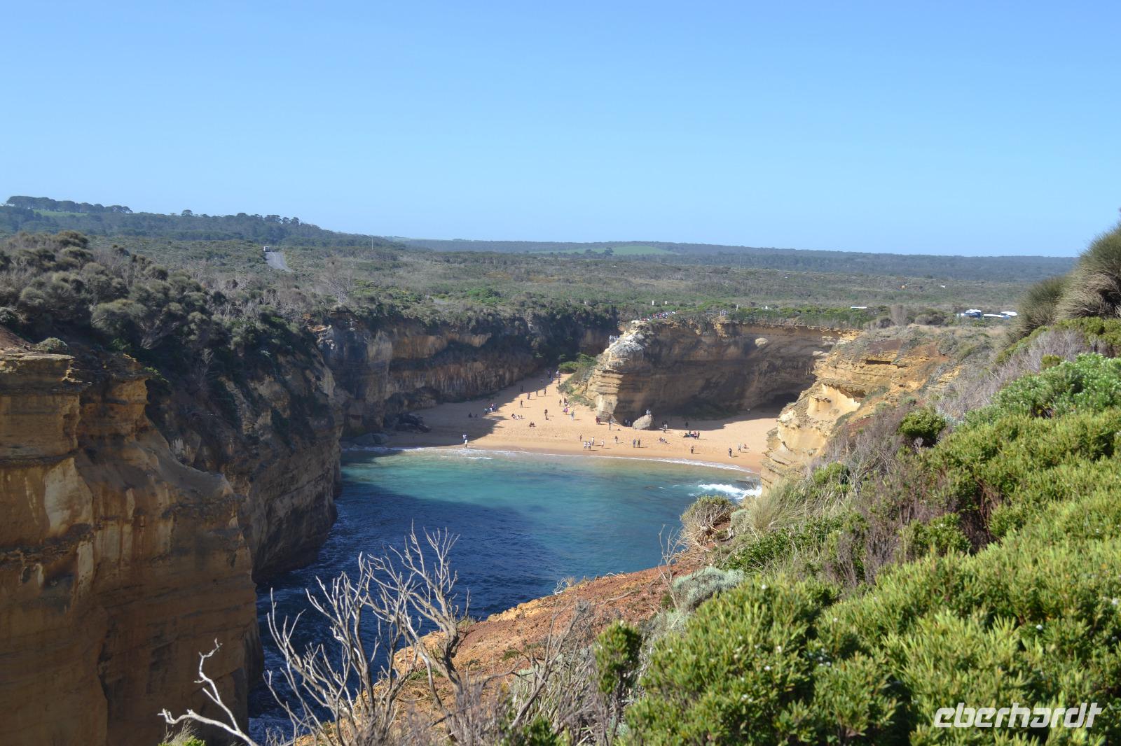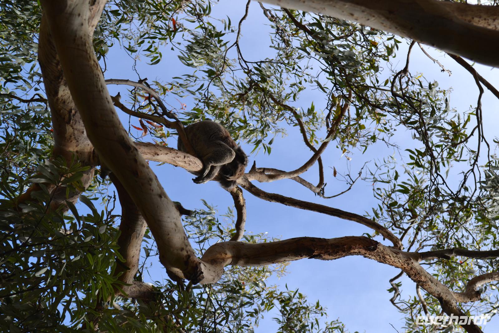 Am Morgen wurden wir beim Frühstücken bereits mit unschönen Nachrichten im australischen TV überrascht. Starke Buschbrände haben zur Folge, dass bei unserem nächsten Ziel Sydney ein Dunst über der Stadt liegt. Jedoch wollten wir uns davon den heutigen Tag nicht vermiesen lassen. Der Abschnitt entlang der Great Ocean Road gehört zu einer der schönsten Küstenstraßen der Welt. Nach dem wir mit mäßigem Verkehr aus Melbourne raus waren hielten wir für eine kurze Pause an einer Chocolaterie entlang der Autobahn. Dort konnten wir das stille Örtchen aufsuchen, einen Kaffee trinken und Süßigkeiten einkaufen. Danach ging es mit dem Bus die kurvige Straße auf der Gerat Ocean Road weiter. Ein Fotostopp am Beginn der bekannten Straße und ein kleiner Spaziergang zum Strand diente als Abwechslung zu den Erzählungen über Schlangen Angriffe der Reiseleiterin. Alle Tierliebhaber kamen heute auf Ihre Kosten, denn in Kennett River, unserem nächsten Stopp sah man einige der australischen Bewohner hautnah. An einem etwa zwei Kilometer breiten Waldstück an der Grey River Road, einer Abzweigung der Great Ocean Road, konnte man die Koalas in den Eukalyptus-Bäumen sitzen, lächeln und schlafen sehen. Sie ließen sich von dem bunten Treiben der Vögel nicht beeindrucken. Die gefiederten Tiere konnte man mit ein paar Körner des Vogelfutters bis auf die Schulter oder Köpfe locken. Doch auch von weitem lässt es sich gut beobachten. Wir genossen die Weiterfahrt mit dem Blick auf das Wasser bis wir in dem kleinen Ferienort Apollo Bay ankamen. Bevor wir unser Mittagessen einnahmen blieb uns noch Zeit für einen kleinen Bummel entlang der Promenade. Nach der Stärkung ging es zu den 12 Aposteln, welche eigentlich nur noch 9 Apostel heißen müssten. Durch Erosionsprozesse trugen sich bereits 3 der Felsformationen ab. Nach dem Uluru ist der Küstenabschnitt das meist fotografiertest Postkartenmotiv Australiens. Natürlich hielten auch wir sämtliche Blickwinkel der Apostel fest. Nur wenige Kilometer entfernt spazierten wir zu der engen Felsenbucht Loch Ard Gorge im Port-Campbell-Nationalpark. Die Bucht wurde nach dem Klipper Loch Ard benannt, welche 1878 nach einer dreimonatigen Schifffahrt von England nach Melbourne auf Grund lief und versank. Nach dem sonnigen Tag entlang der Südküste Australiens machten wir uns zurück auf den Weg nach Melbourne, in die südlichste Millionen Metropole der Welt. Den Abend verbrachte jeder individuell. Laura ging mit einigen Gästen auf dem direkt neben dem Hotel erbauten Eureka Tower. Dieser bietet im 88. Stock einen wunderbaren Blick auf die beleuchtetet Stadt.
