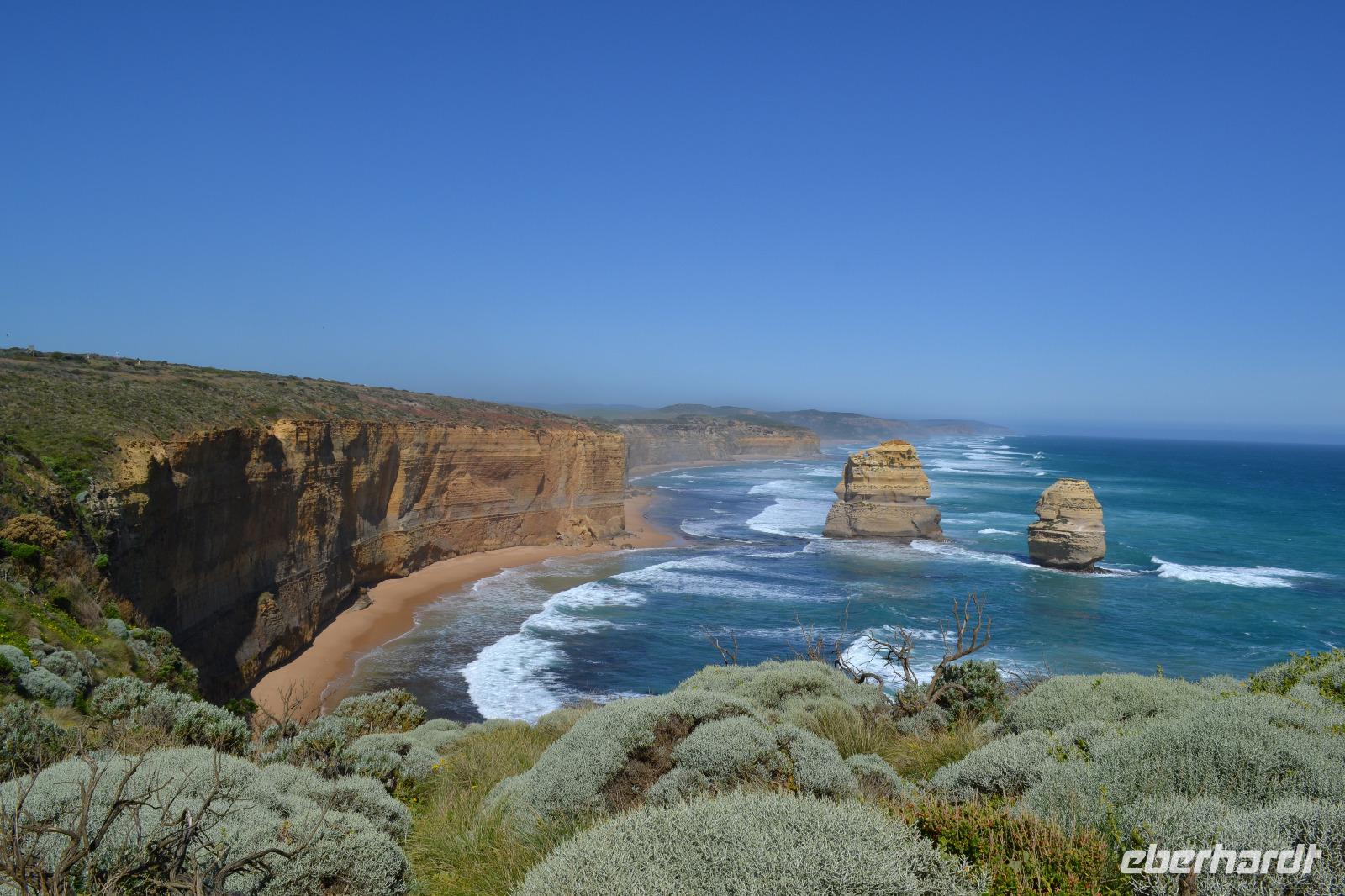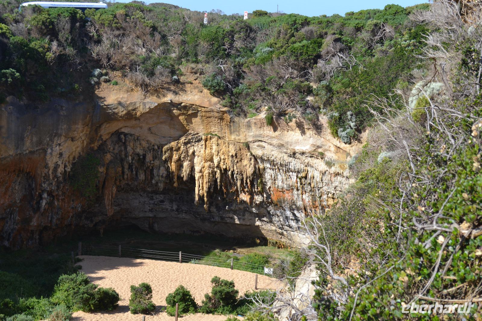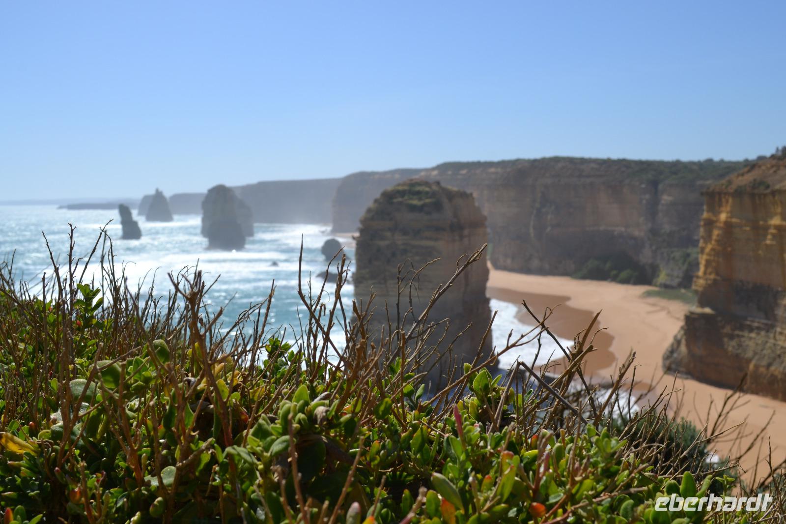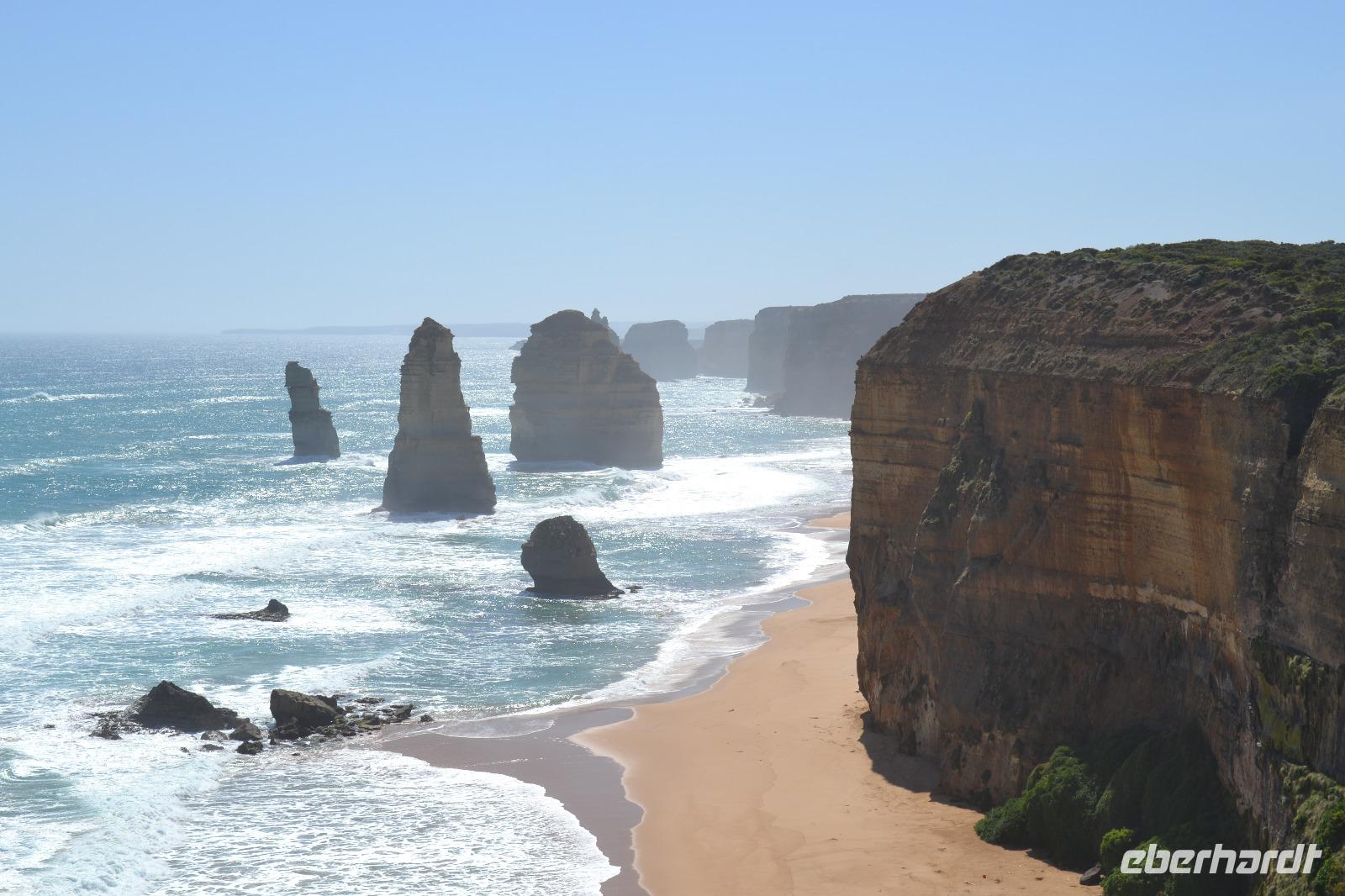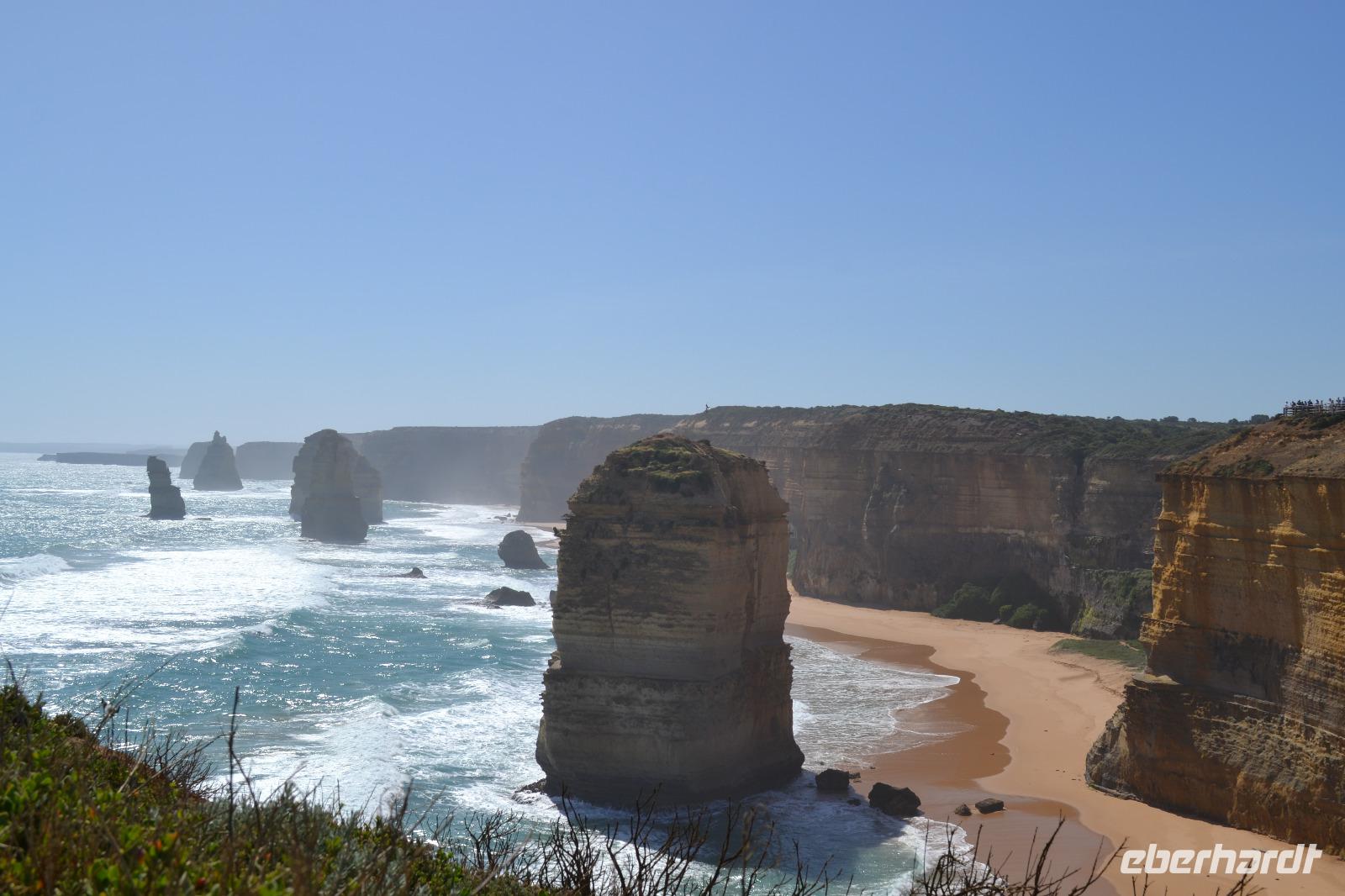 Am Morgen wurden wir beim Frühstücken bereits mit unschönen Nachrichten im australischen TV überrascht. Starke Buschbrände haben zur Folge, dass bei unserem nächsten Ziel Sydney ein Dunst über der Stadt liegt. Jedoch wollten wir uns davon den heutigen Tag nicht vermiesen lassen. Der Abschnitt entlang der Great Ocean Road gehört zu einer der schönsten Küstenstraßen der Welt. Nach dem wir mit mäßigem Verkehr aus Melbourne raus waren hielten wir für eine kurze Pause an einer Chocolaterie entlang der Autobahn. Dort konnten wir das stille Örtchen aufsuchen, einen Kaffee trinken und Süßigkeiten einkaufen. Danach ging es mit dem Bus die kurvige Straße auf der Gerat Ocean Road weiter. Ein Fotostopp am Beginn der bekannten Straße und ein kleiner Spaziergang zum Strand diente als Abwechslung zu den Erzählungen über Schlangen Angriffe der Reiseleiterin. Alle Tierliebhaber kamen heute auf Ihre Kosten, denn in Kennett River, unserem nächsten Stopp sah man einige der australischen Bewohner hautnah. An einem etwa zwei Kilometer breiten Waldstück an der Grey River Road, einer Abzweigung der Great Ocean Road, konnte man die Koalas in den Eukalyptus-Bäumen sitzen, lächeln und schlafen sehen. Sie ließen sich von dem bunten Treiben der Vögel nicht beeindrucken. Die gefiederten Tiere konnte man mit ein paar Körner des Vogelfutters bis auf die Schulter oder Köpfe locken. Doch auch von weitem lässt es sich gut beobachten. Wir genossen die Weiterfahrt mit dem Blick auf das Wasser bis wir in dem kleinen Ferienort Apollo Bay ankamen. Bevor wir unser Mittagessen einnahmen blieb uns noch Zeit für einen kleinen Bummel entlang der Promenade. Nach der Stärkung ging es zu den 12 Aposteln, welche eigentlich nur noch 9 Apostel heißen müssten. Durch Erosionsprozesse trugen sich bereits 3 der Felsformationen ab. Nach dem Uluru ist der Küstenabschnitt das meist fotografiertest Postkartenmotiv Australiens. Natürlich hielten auch wir sämtliche Blickwinkel der Apostel fest. Nur wenige Kilometer entfernt spazierten wir zu der engen Felsenbucht Loch Ard Gorge im Port-Campbell-Nationalpark. Die Bucht wurde nach dem Klipper Loch Ard benannt, welche 1878 nach einer dreimonatigen Schifffahrt von England nach Melbourne auf Grund lief und versank. Nach dem sonnigen Tag entlang der Südküste Australiens machten wir uns zurück auf den Weg nach Melbourne, in die südlichste Millionen Metropole der Welt. Den Abend verbrachte jeder individuell. Laura ging mit einigen Gästen auf dem direkt neben dem Hotel erbauten Eureka Tower. Dieser bietet im 88. Stock einen wunderbaren Blick auf die beleuchtetet Stadt.