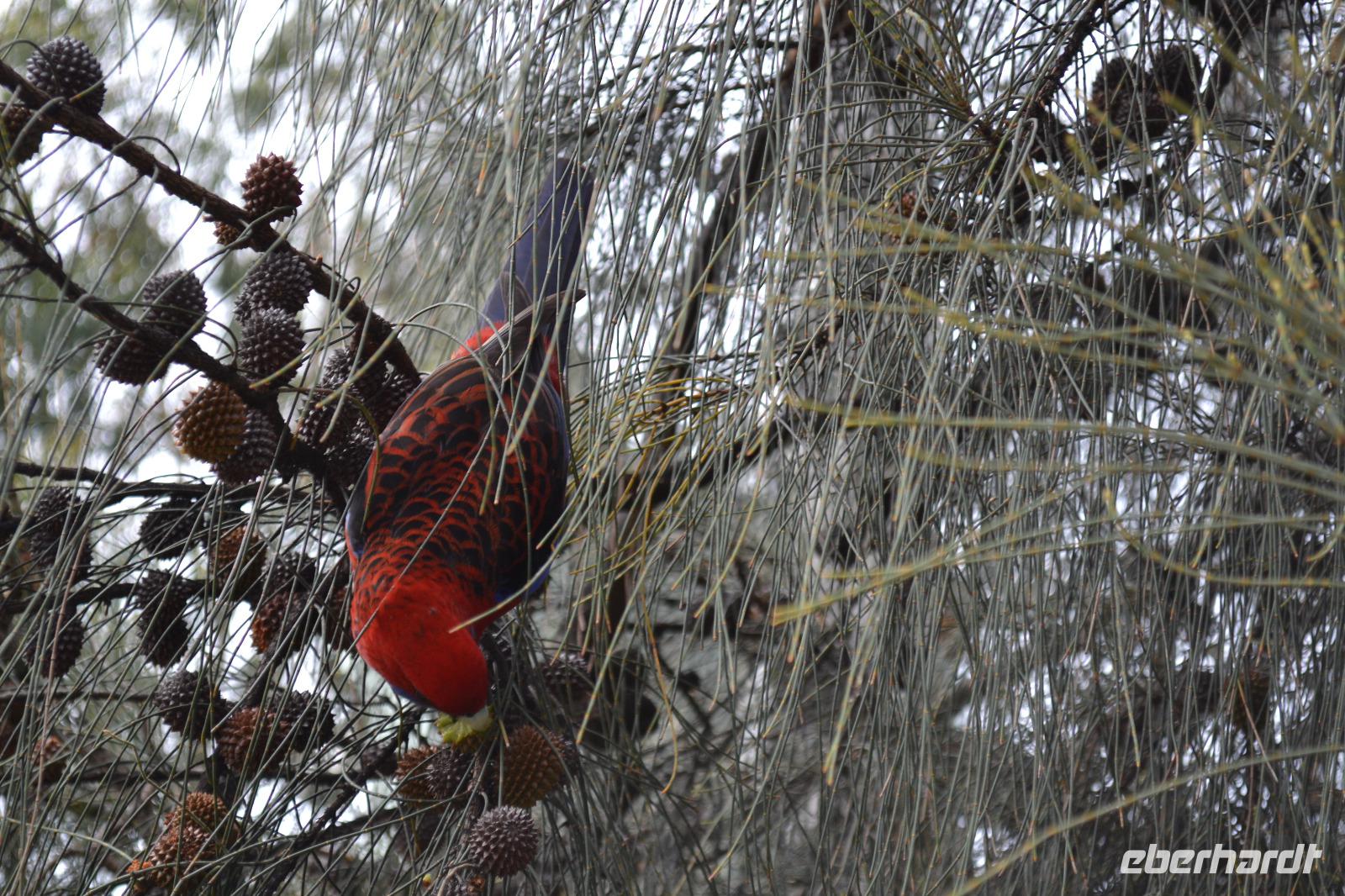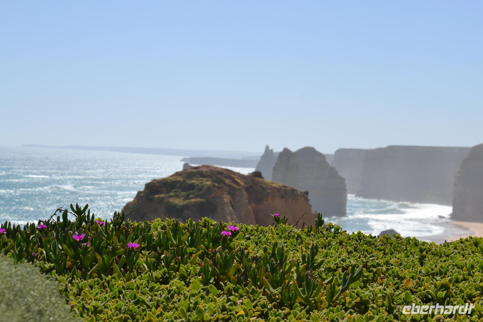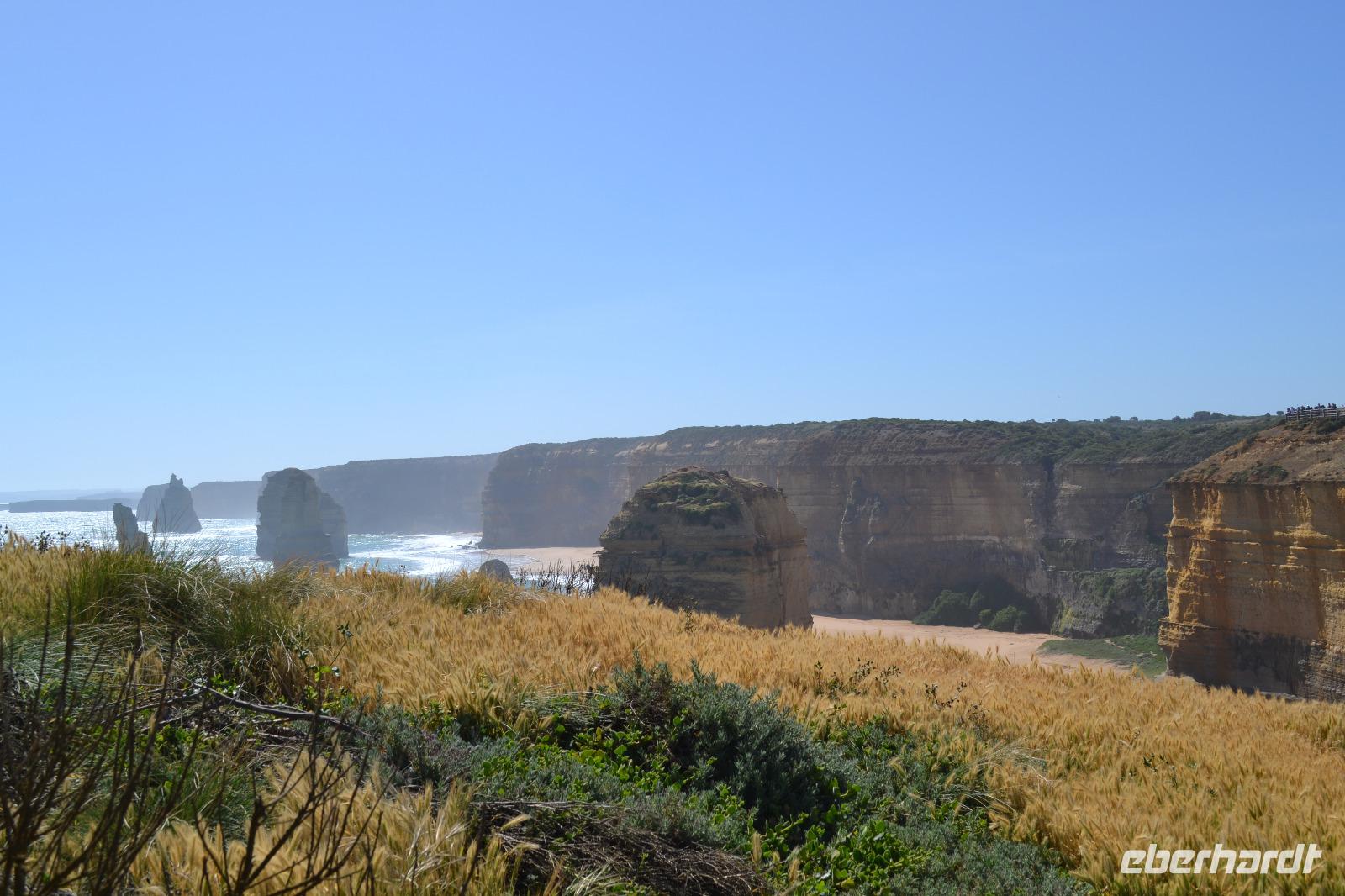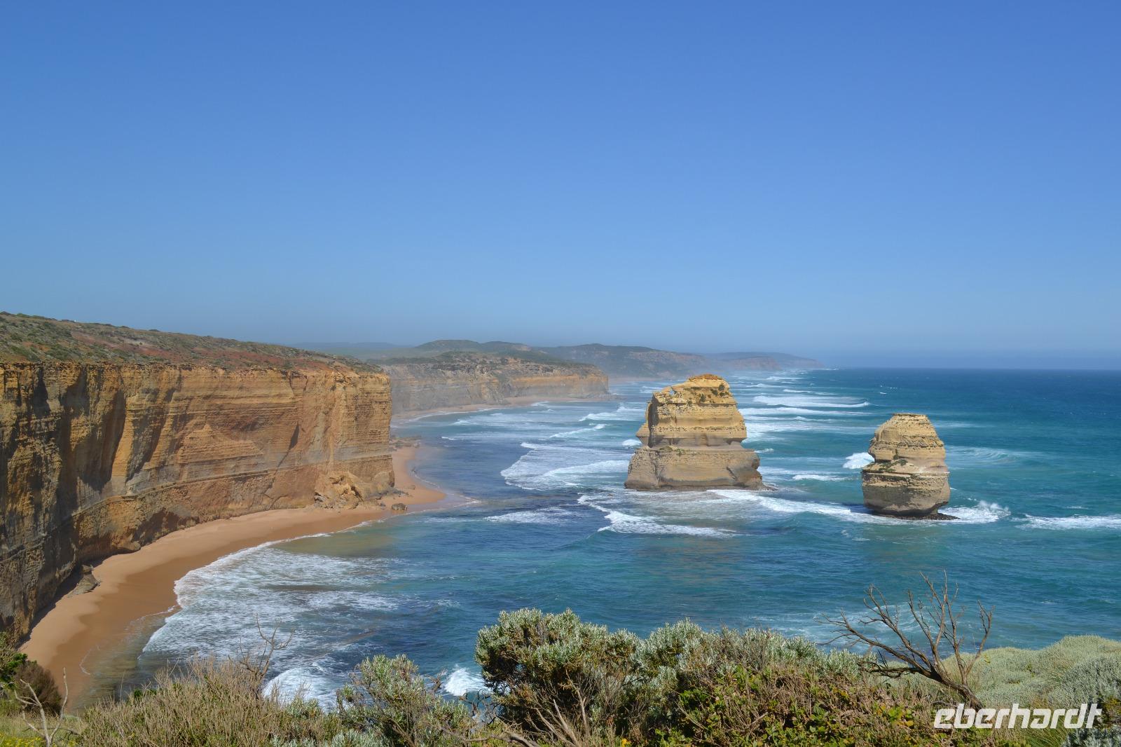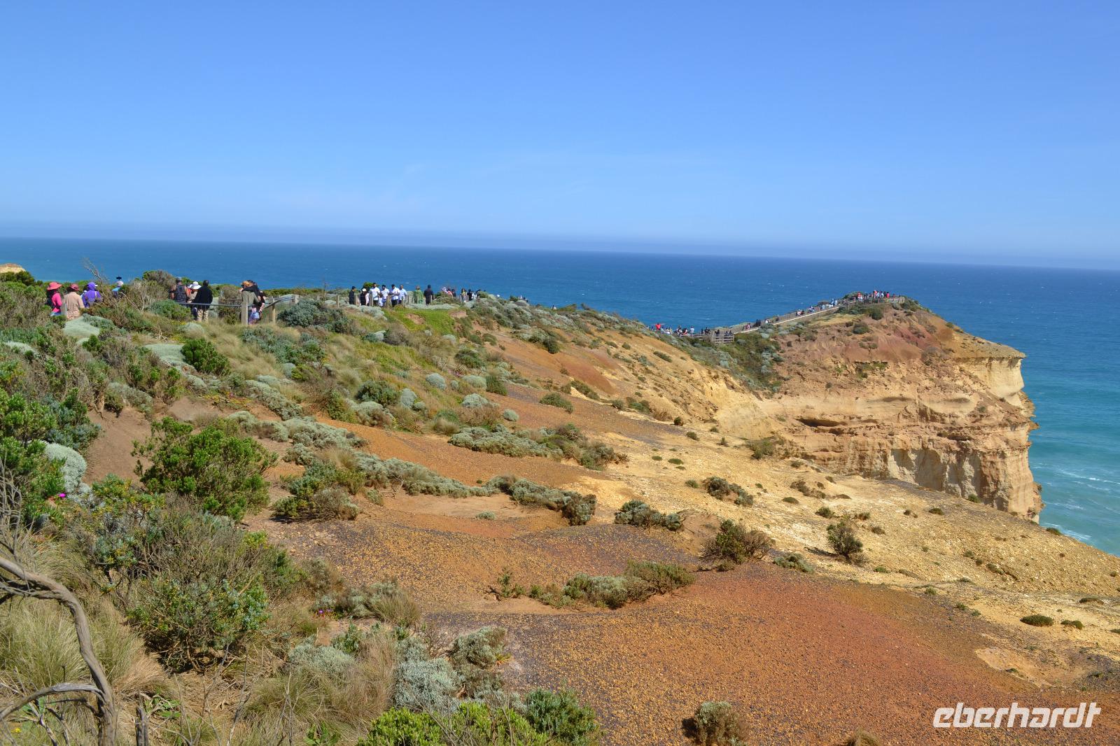 Am Morgen wurden wir beim Frühstücken bereits mit unschönen Nachrichten im australischen TV überrascht. Starke Buschbrände haben zur Folge, dass bei unserem nächsten Ziel Sydney ein Dunst über der Stadt liegt. Jedoch wollten wir uns davon den heutigen Tag nicht vermiesen lassen. Der Abschnitt entlang der Great Ocean Road gehört zu einer der schönsten Küstenstraßen der Welt. Nach dem wir mit mäßigem Verkehr aus Melbourne raus waren hielten wir für eine kurze Pause an einer Chocolaterie entlang der Autobahn. Dort konnten wir das stille Örtchen aufsuchen, einen Kaffee trinken und Süßigkeiten einkaufen. Danach ging es mit dem Bus die kurvige Straße auf der Gerat Ocean Road weiter. Ein Fotostopp am Beginn der bekannten Straße und ein kleiner Spaziergang zum Strand diente als Abwechslung zu den Erzählungen über Schlangen Angriffe der Reiseleiterin. Alle Tierliebhaber kamen heute auf Ihre Kosten, denn in Kennett River, unserem nächsten Stopp sah man einige der australischen Bewohner hautnah. An einem etwa zwei Kilometer breiten Waldstück an der Grey River Road, einer Abzweigung der Great Ocean Road, konnte man die Koalas in den Eukalyptus-Bäumen sitzen, lächeln und schlafen sehen. Sie ließen sich von dem bunten Treiben der Vögel nicht beeindrucken. Die gefiederten Tiere konnte man mit ein paar Körner des Vogelfutters bis auf die Schulter oder Köpfe locken. Doch auch von weitem lässt es sich gut beobachten. Wir genossen die Weiterfahrt mit dem Blick auf das Wasser bis wir in dem kleinen Ferienort Apollo Bay ankamen. Bevor wir unser Mittagessen einnahmen blieb uns noch Zeit für einen kleinen Bummel entlang der Promenade. Nach der Stärkung ging es zu den 12 Aposteln, welche eigentlich nur noch 9 Apostel heißen müssten. Durch Erosionsprozesse trugen sich bereits 3 der Felsformationen ab. Nach dem Uluru ist der Küstenabschnitt das meist fotografiertest Postkartenmotiv Australiens. Natürlich hielten auch wir sämtliche Blickwinkel der Apostel fest. Nur wenige Kilometer entfernt spazierten wir zu der engen Felsenbucht Loch Ard Gorge im Port-Campbell-Nationalpark. Die Bucht wurde nach dem Klipper Loch Ard benannt, welche 1878 nach einer dreimonatigen Schifffahrt von England nach Melbourne auf Grund lief und versank. Nach dem sonnigen Tag entlang der Südküste Australiens machten wir uns zurück auf den Weg nach Melbourne, in die südlichste Millionen Metropole der Welt. Den Abend verbrachte jeder individuell. Laura ging mit einigen Gästen auf dem direkt neben dem Hotel erbauten Eureka Tower. Dieser bietet im 88. Stock einen wunderbaren Blick auf die beleuchtetet Stadt.