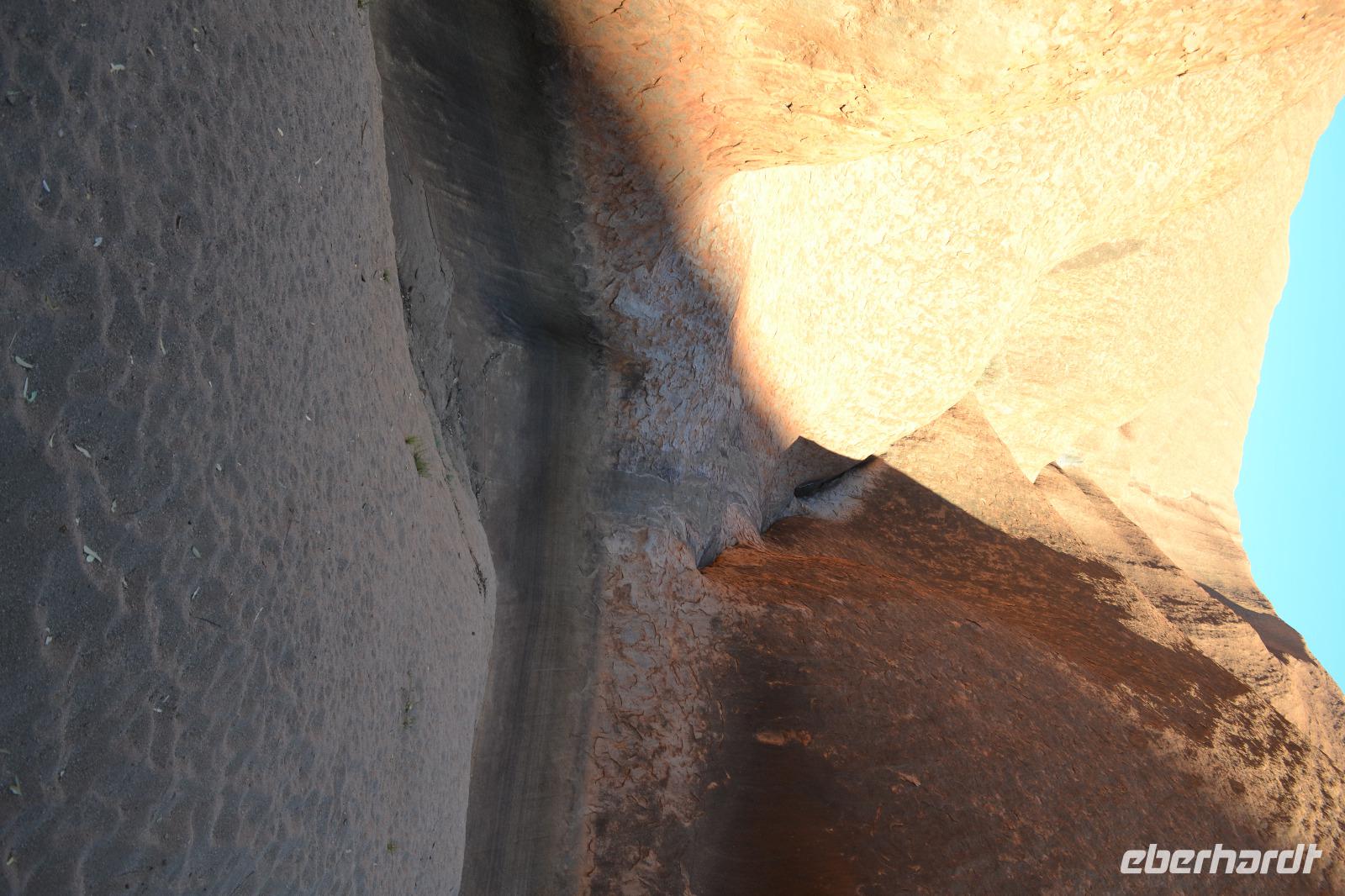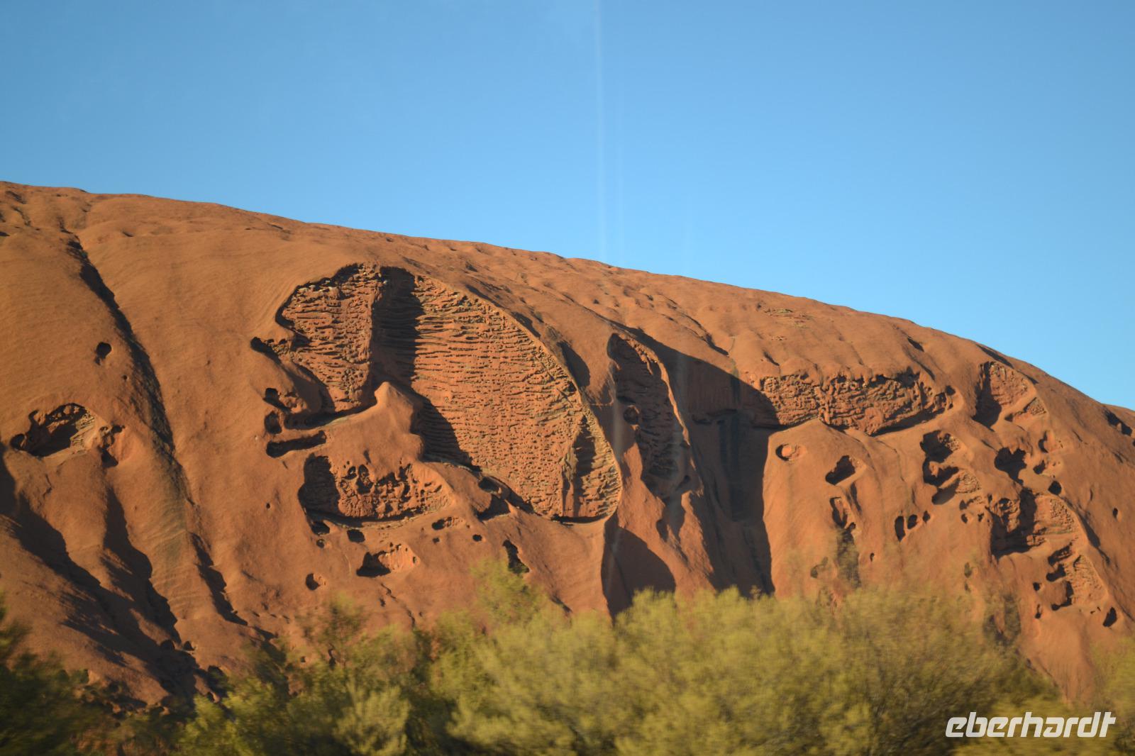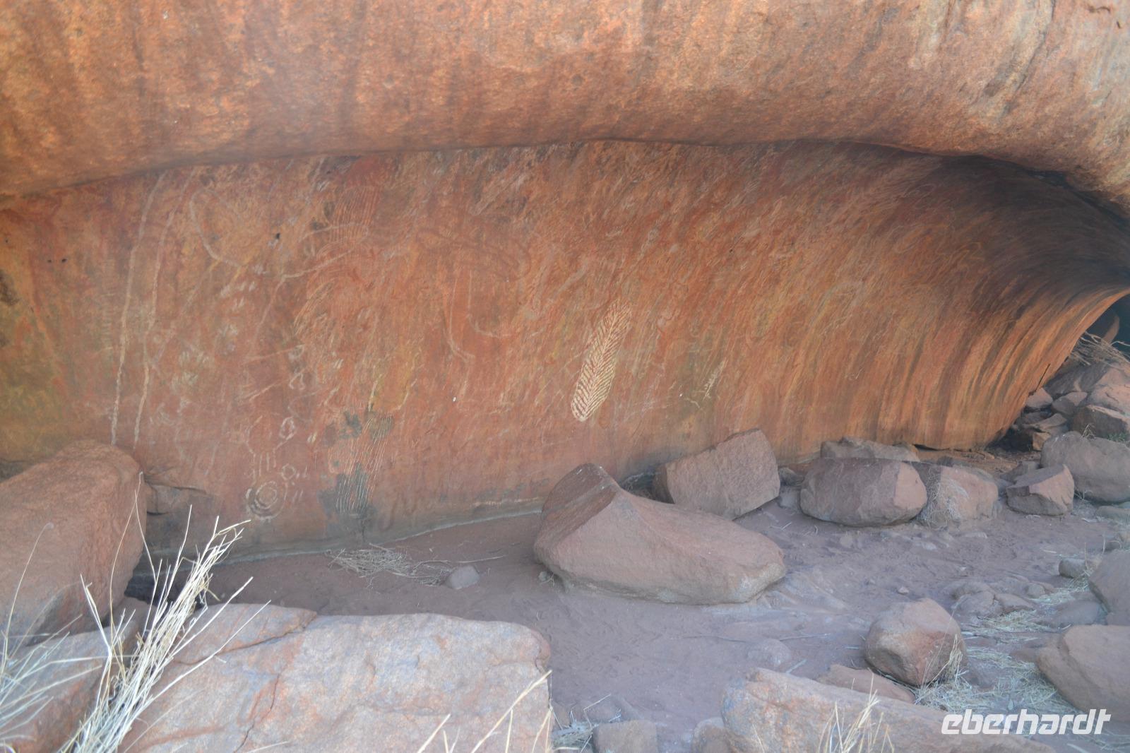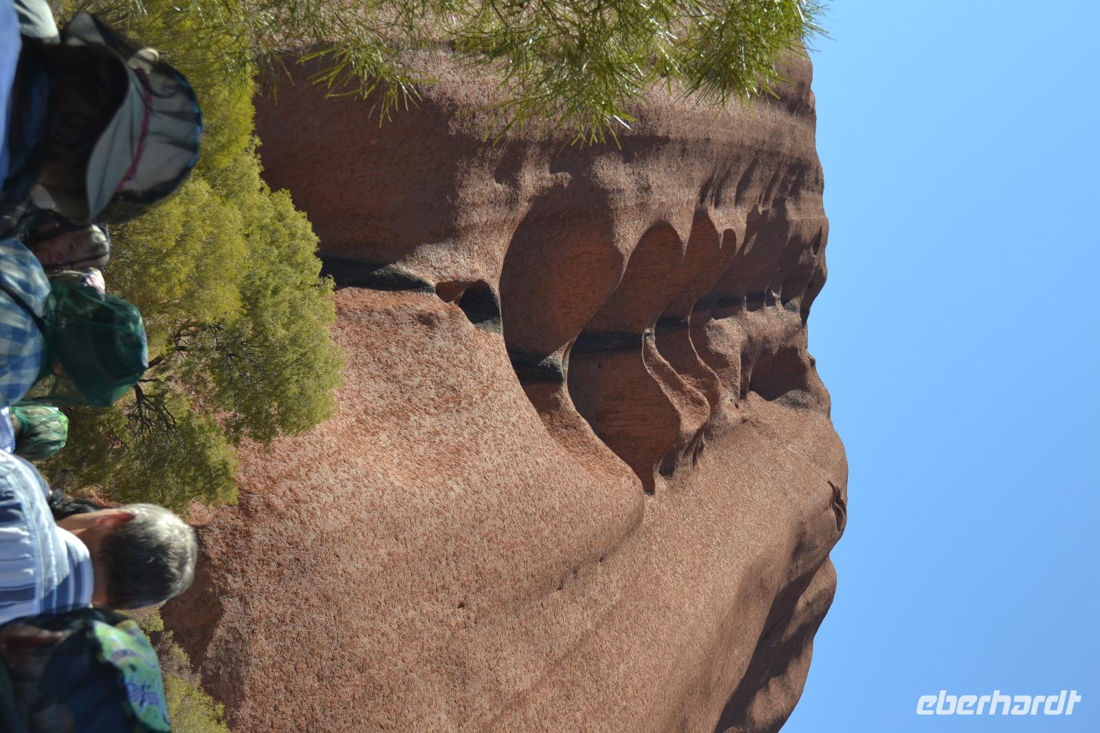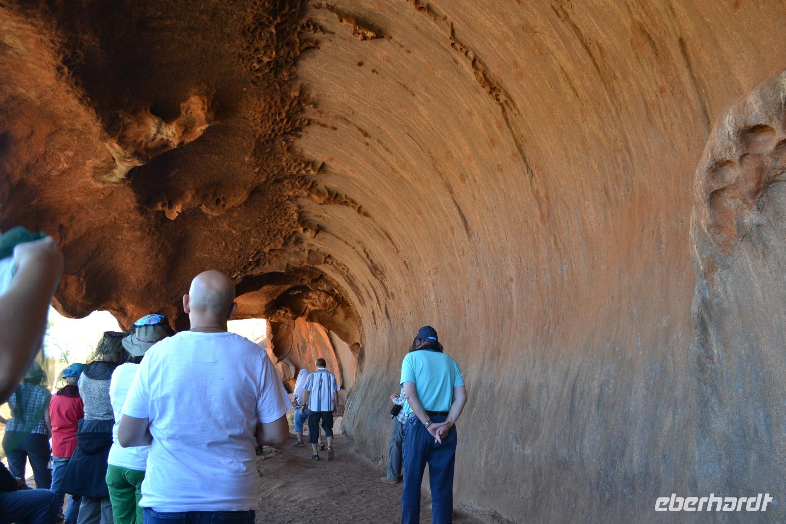 Bereits 5 Uhr und ohne ein Frühstück verließen wir das Hotel um den Sonnenaufgang am heiligen Berg der Aborigines nicht zu verpassen. Am Morgen lagen die Temperaturen bei 10 Grad. Wir konnten beim Sonnenaufgang kurz vor 6 Uhr noch einige andere Farbtöne bildlich festhalten, welche es beim Sonnenuntergang nicht gab. Nach diesem einmaligen Erlebnis fuhren wir in das Kulturzentrum in der Nähe des Uluru um dort zu frühstücken. Wir gingen mit besonderer Vorsicht durch die Räumlichkeiten, denn in der vorherigen Nacht wurde in dem Souvenir Shop eingebrochen und es musste auf die Polizei gewartet werden. Wir stärkten uns um anschließend mit Eva die Höhlen direkt am Berg zu besichtigen. Auf dem Weg dort hin kamen wir an dem am 26.10.2019 geschlossenen Aufstieg auf den Uluru vorbei. Wir wunderten uns, warum die Bergsteiger den Handlauf nicht von oben nach unten, sondern von unten nach oben abbauten. Doch dafür gab es eine ganz einfache Erklärung. Sie wollen damit verhindern, dass sich Touristen nach dem Verbot unerlaubt auf den Berg schleichen. Ohne etwas zum festhalten ist ein Aufstieg sehr schwierig, wenn nicht gar unmöglich. Eva führte uns zu den ersten Höhlen mit Malereien und erklärte uns die verschiedenen Bedeutungen. Diese wurden von den unterschiedlichsten Menschengruppen genutzt. Es gab Männer Höhlen, welche getrennt von den Frauen waren. Auch die durch Umwelteinflüsse entstandenen Einkerbungen an den Felswänden erzählen Geschichten, wie beispielsweise die von der Schlangenfrau. Nach den zwei Spaziergängen an unterschiedlichen Stellen ging es zurück zum Hotel, wo wir nur noch unsere Koffer in den Bus luden und direkt zum Flughafen fuhren. Dieser war mit 2 Gates überschaubar! Das Boarding startete 10 Minuten früher als geplant mit dem Flug nach Sydney. Beim Zwischenstopp blieb uns Zeit für ein Abendessen bevor es weiter nach Cairns ging. Am späten Abend begrüßte uns dort unsere letzte Reiseleiterin der Reise Annette am Ausgang des Flughafens. Sie stellt sich kurz vor und kündigte Ihren Sohn als den zukünftigen National Fußballspieler an. Heute bezogen wir nur noch unsere Zimmer in dem tollen Hotel in Palm Cove und fielen müde in unsere Betten.
