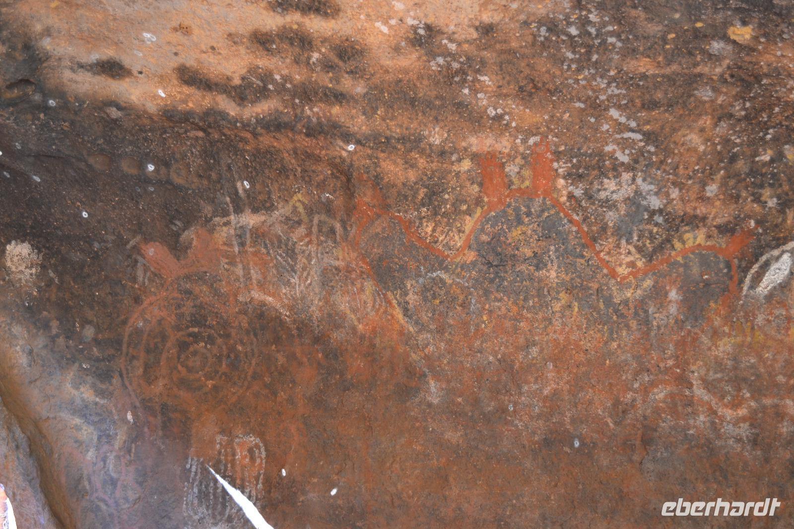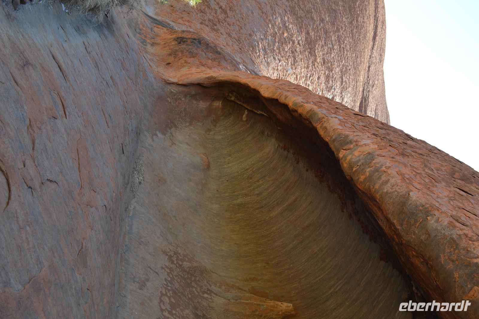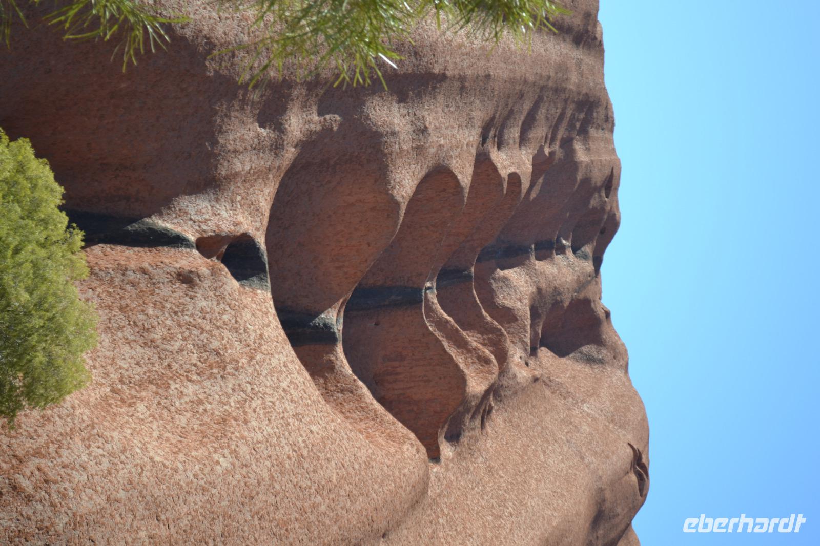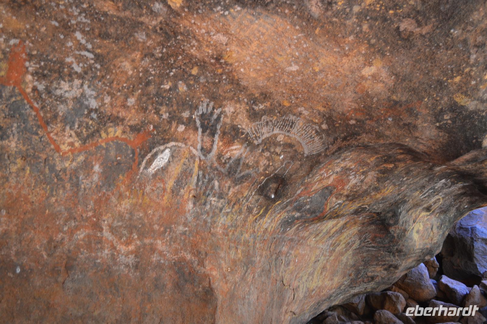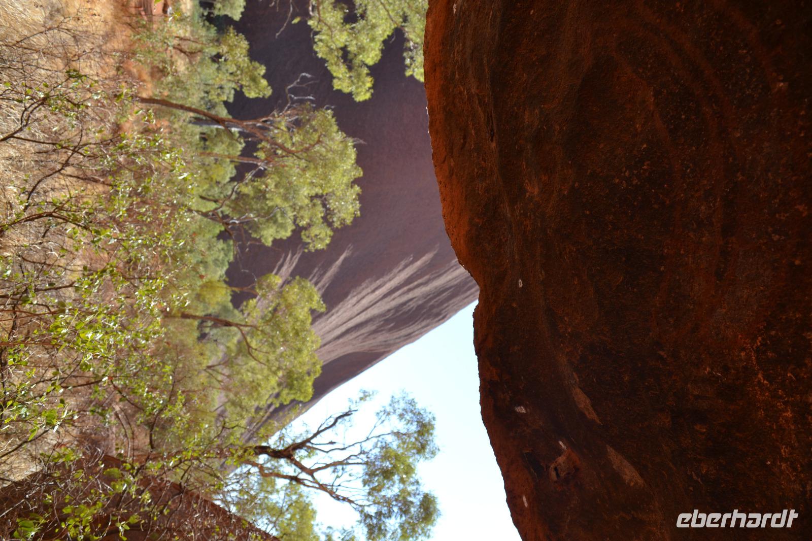 Bereits 5 Uhr und ohne ein Frühstück verließen wir das Hotel um den Sonnenaufgang am heiligen Berg der Aborigines nicht zu verpassen. Am Morgen lagen die Temperaturen bei 10 Grad. Wir konnten beim Sonnenaufgang kurz vor 6 Uhr noch einige andere Farbtöne bildlich festhalten, welche es beim Sonnenuntergang nicht gab. Nach diesem einmaligen Erlebnis fuhren wir in das Kulturzentrum in der Nähe des Uluru um dort zu frühstücken. Wir gingen mit besonderer Vorsicht durch die Räumlichkeiten, denn in der vorherigen Nacht wurde in dem Souvenir Shop eingebrochen und es musste auf die Polizei gewartet werden. Wir stärkten uns um anschließend mit Eva die Höhlen direkt am Berg zu besichtigen. Auf dem Weg dort hin kamen wir an dem am 26.10.2019 geschlossenen Aufstieg auf den Uluru vorbei. Wir wunderten uns, warum die Bergsteiger den Handlauf nicht von oben nach unten, sondern von unten nach oben abbauten. Doch dafür gab es eine ganz einfache Erklärung. Sie wollen damit verhindern, dass sich Touristen nach dem Verbot unerlaubt auf den Berg schleichen. Ohne etwas zum festhalten ist ein Aufstieg sehr schwierig, wenn nicht gar unmöglich. Eva führte uns zu den ersten Höhlen mit Malereien und erklärte uns die verschiedenen Bedeutungen. Diese wurden von den unterschiedlichsten Menschengruppen genutzt. Es gab Männer Höhlen, welche getrennt von den Frauen waren. Auch die durch Umwelteinflüsse entstandenen Einkerbungen an den Felswänden erzählen Geschichten, wie beispielsweise die von der Schlangenfrau. Nach den zwei Spaziergängen an unterschiedlichen Stellen ging es zurück zum Hotel, wo wir nur noch unsere Koffer in den Bus luden und direkt zum Flughafen fuhren. Dieser war mit 2 Gates überschaubar! Das Boarding startete 10 Minuten früher als geplant mit dem Flug nach Sydney. Beim Zwischenstopp blieb uns Zeit für ein Abendessen bevor es weiter nach Cairns ging. Am späten Abend begrüßte uns dort unsere letzte Reiseleiterin der Reise Annette am Ausgang des Flughafens. Sie stellt sich kurz vor und kündigte Ihren Sohn als den zukünftigen National Fußballspieler an. Heute bezogen wir nur noch unsere Zimmer in dem tollen Hotel in Palm Cove und fielen müde in unsere Betten.