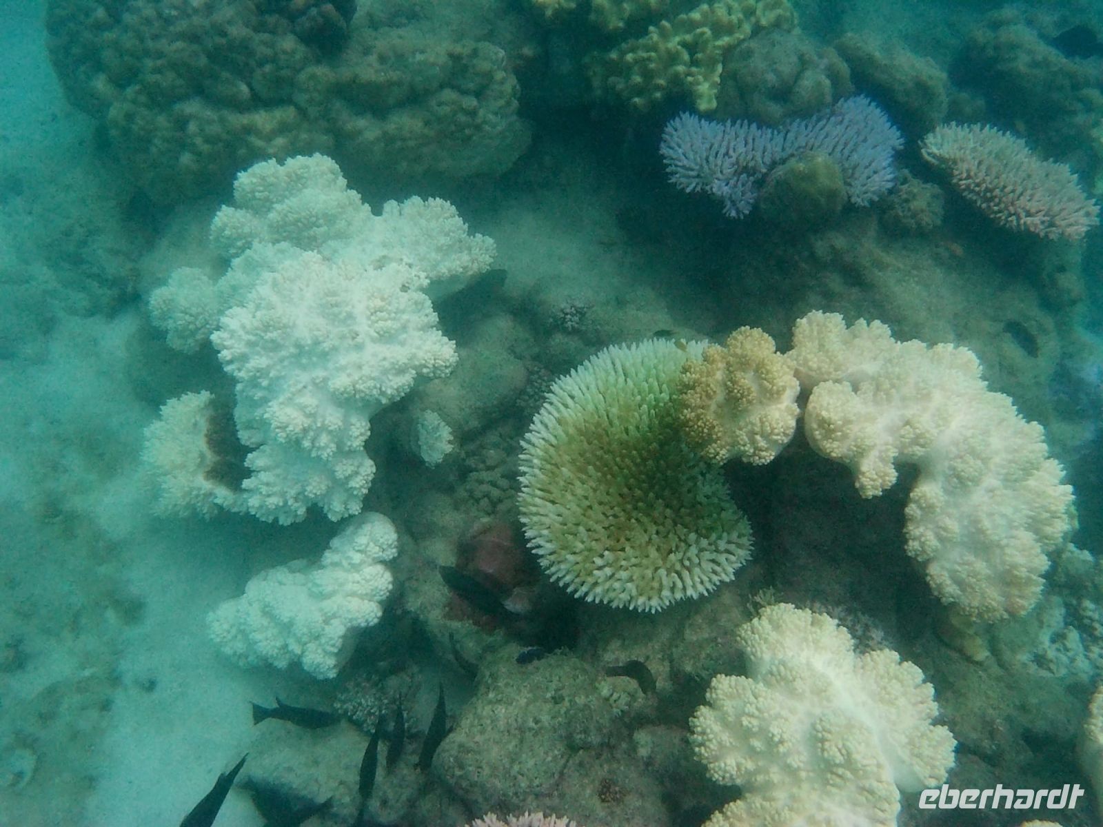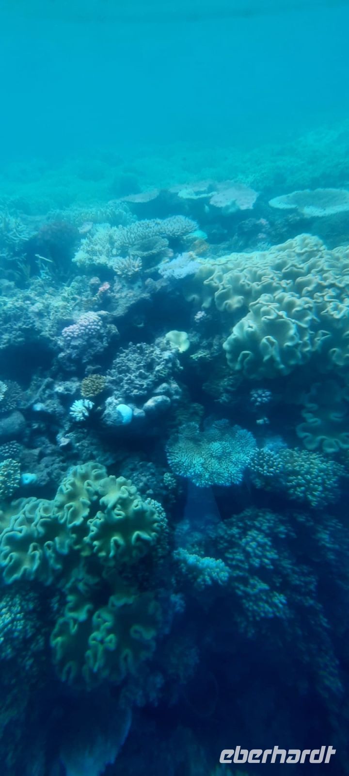 Und dann zwängen sich die ersten von uns in den obligatorischen Ganzkörperanzug (der teuflischen Quallen wegen), nehmen Flossen und Schnorchel zur Hand und lassen sich mit dem Tender Boot auf das vogelreiche Eiland übersetzen. Nach einem guten Mittagessen sind dann unsere restlichen Gruppenmitglieder dran, den Mördermuscheln, Papageienfischen und den zum Teil schon sehr bleichen Korallen einen Besuch abzustatten.