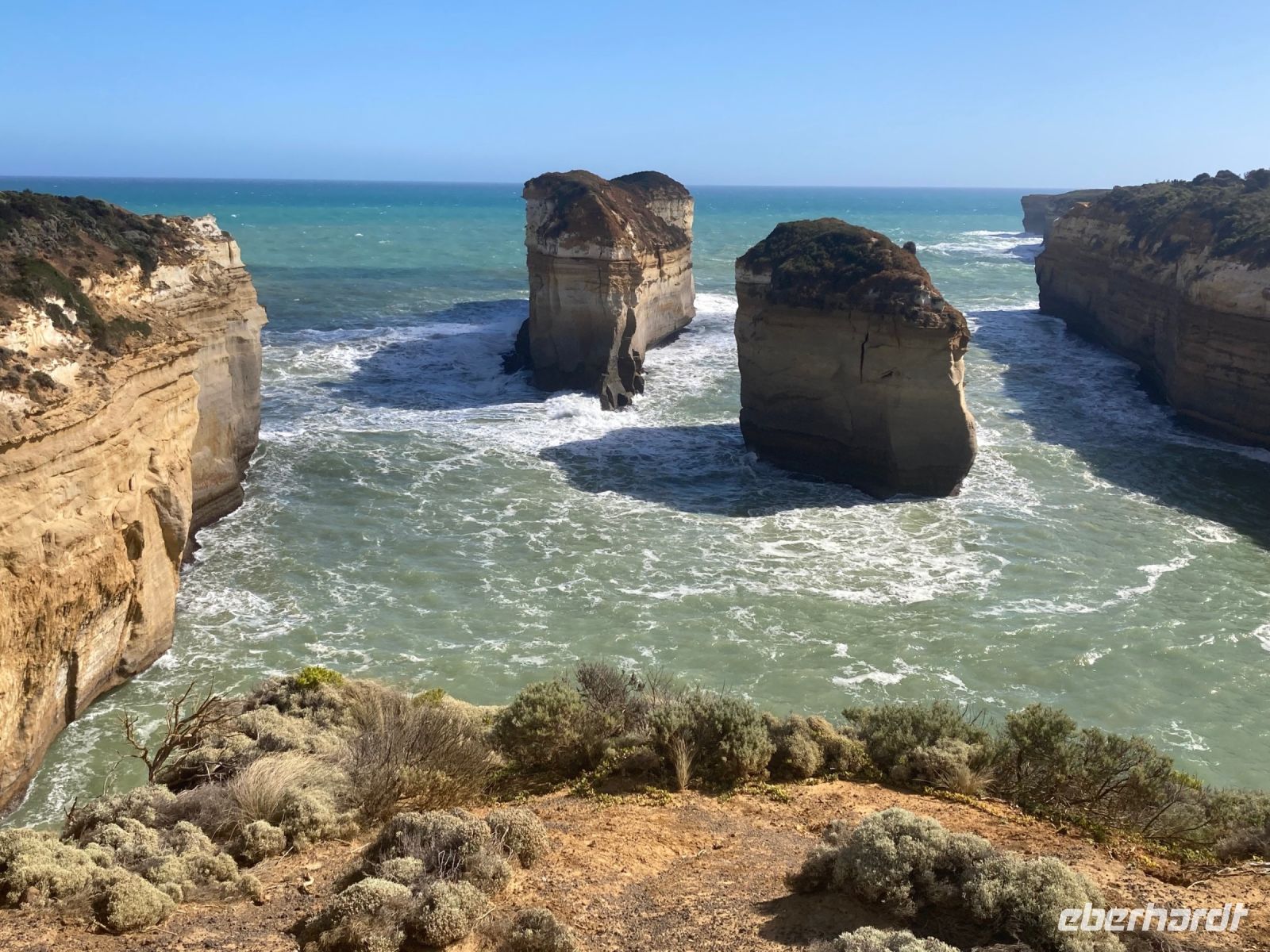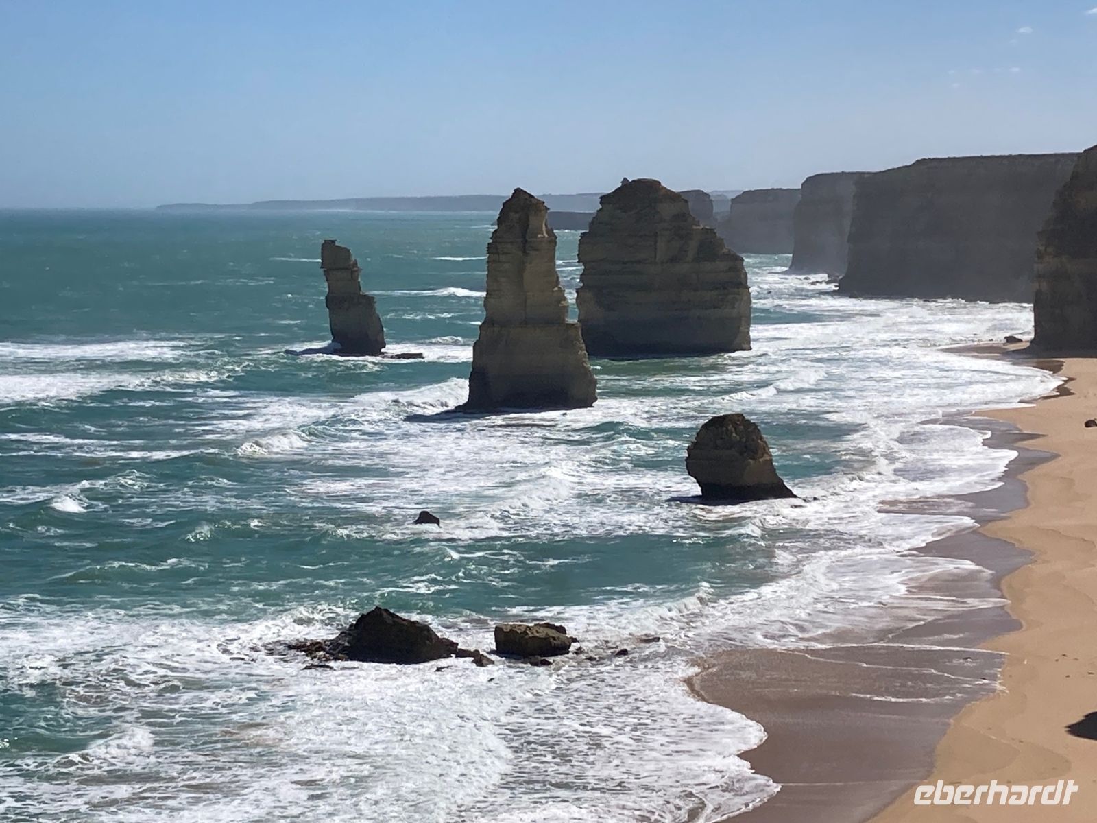 Früh um 8 Uhr starten wir zu unserem Tagesausflug auf einer der schönsten Straßen weltweit, der Great Ocean Road. Nachdem wir das Tor zur Küstenstraße passiert haben, das mit einem Denkmal die Erbauer, fast allesamt Kriegsveteranen, ehrt, lassen wir die Surferhochburg Torquay links liegen und stoppen erstmals in Kenneth River. Dort führt uns Andrea in die Tierwelt Australiens ein, indem sie uns verschlafene Koalas hoch in den Bäumen zeigt und auch den ersten Papagei entdeckt. Dieser entpuppt sich allerdings als Rosellasittich, wie ein ornithologisch sehr versiertes Mitglied unserer Gruppe treffsicher bemerkt.Bei einem späteren Stopp können wir dann einen riesengroßen Schwarm von sogenannten Gelbhaubenkakadus beobachten. Doch zuvor halten wir in Apollo Bay, um die Füße ins Meer zu stecken und ausgiebig Mittag zu essen. Und dann sind wir endlich an der Schiffbruchküste mit ihren spektakulären Felsformationen. Von mehreren Aussichtsplattformen aus bestaunen wir die 12 Apostel, die nur noch zu acht sind und die bei meinem ersten Australienbesuch noch Muttersau und Ferkel hießen, und statten auch der Loch Ard Gorge, den Razorblades und der eingestürzten London Bridge einen Besuch ab.