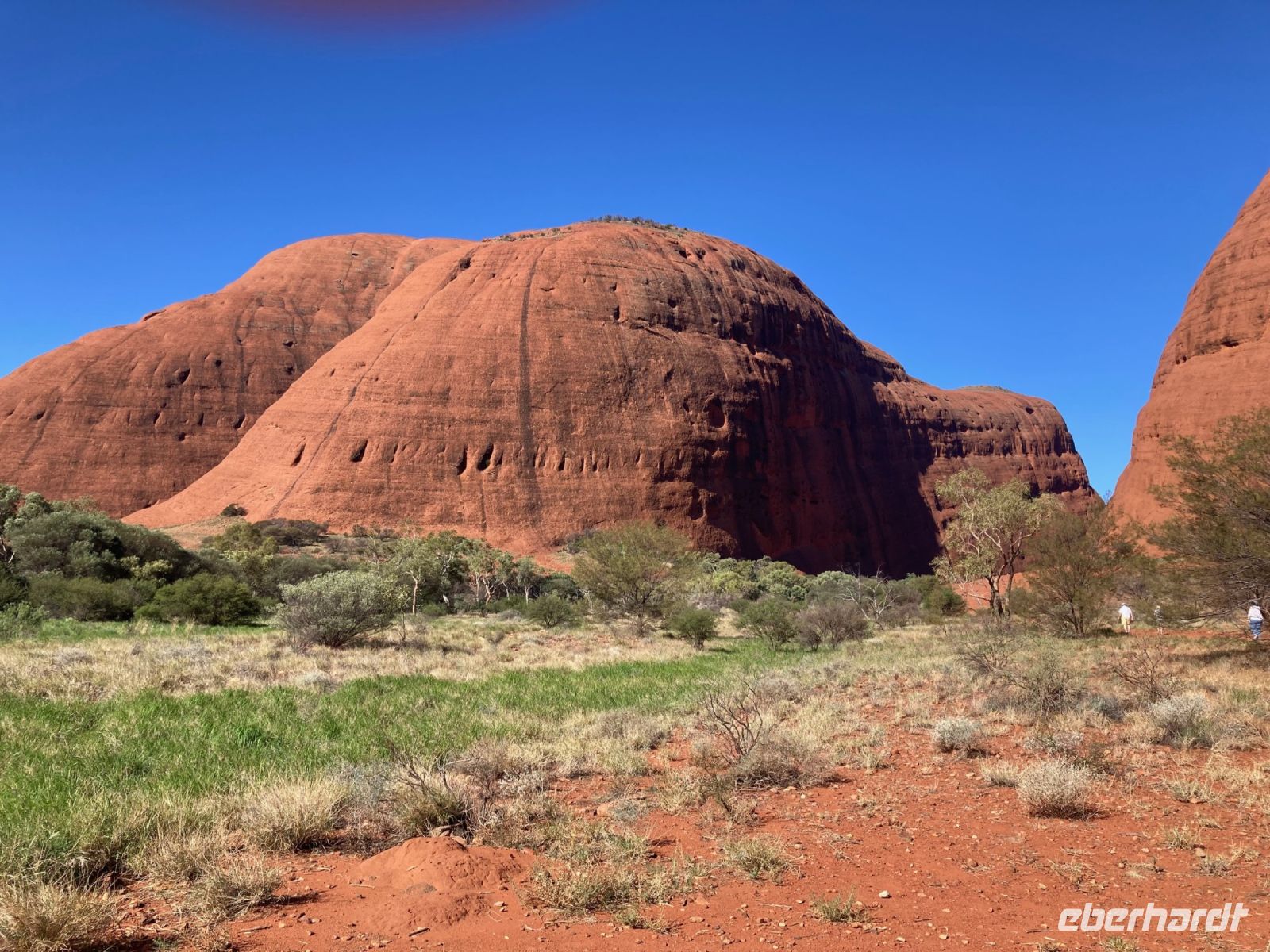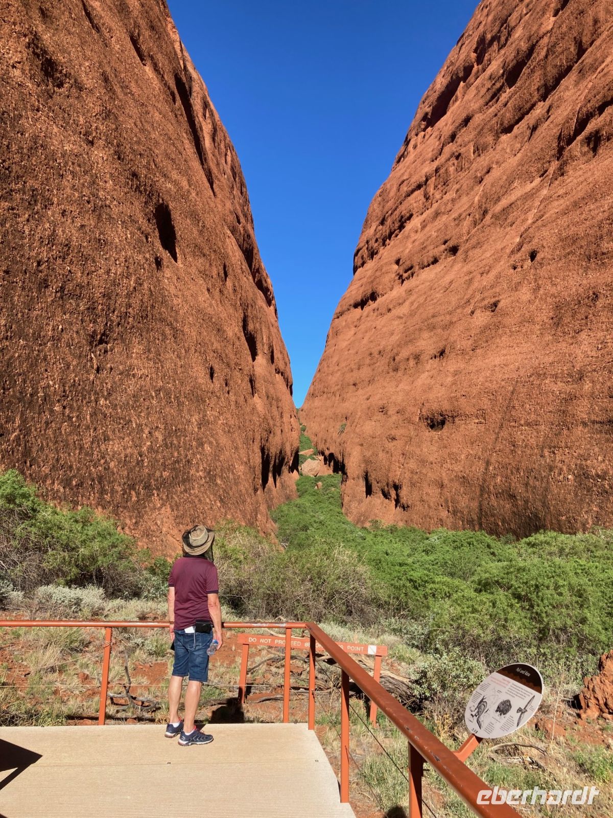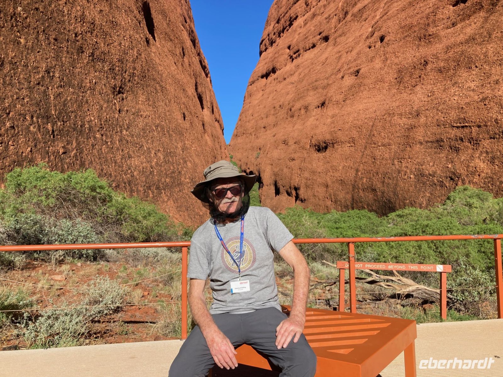 Noch in der Dunkelheit um 4 Uhr machen wir uns, ausgestattet mit einer Frühstücksbox, zum Flughafen auf, um über Sydney ins Outback nach Ayers Rock zu fliegen. Bei über 40° im wenig vorhandenen Schatten begrüßt uns unsere Reiseleiterin Eve, rät uns dringend zum Kauf von Fliegennetzen und betont die Notwendigkeit einer Kopfbedeckung. Dann, nach einem schrittweise stattfindenden Zimmer-Check In, besuchen wir mit ihr das Kulturzentrum der Aboriginals und fahren anschließend zu den 36 Kuppeln der Kata Tjutas, zwischen denen wir eine kleine Wanderung absolvieren. Der großen Hitze wegen belassen es die meisten mit einem kurzen Spaziergang, sodass es nur zwei Gruppenmitglieder zusammen mit dem alten Reiseleiter zur Plattform am Talschluss schaffen.