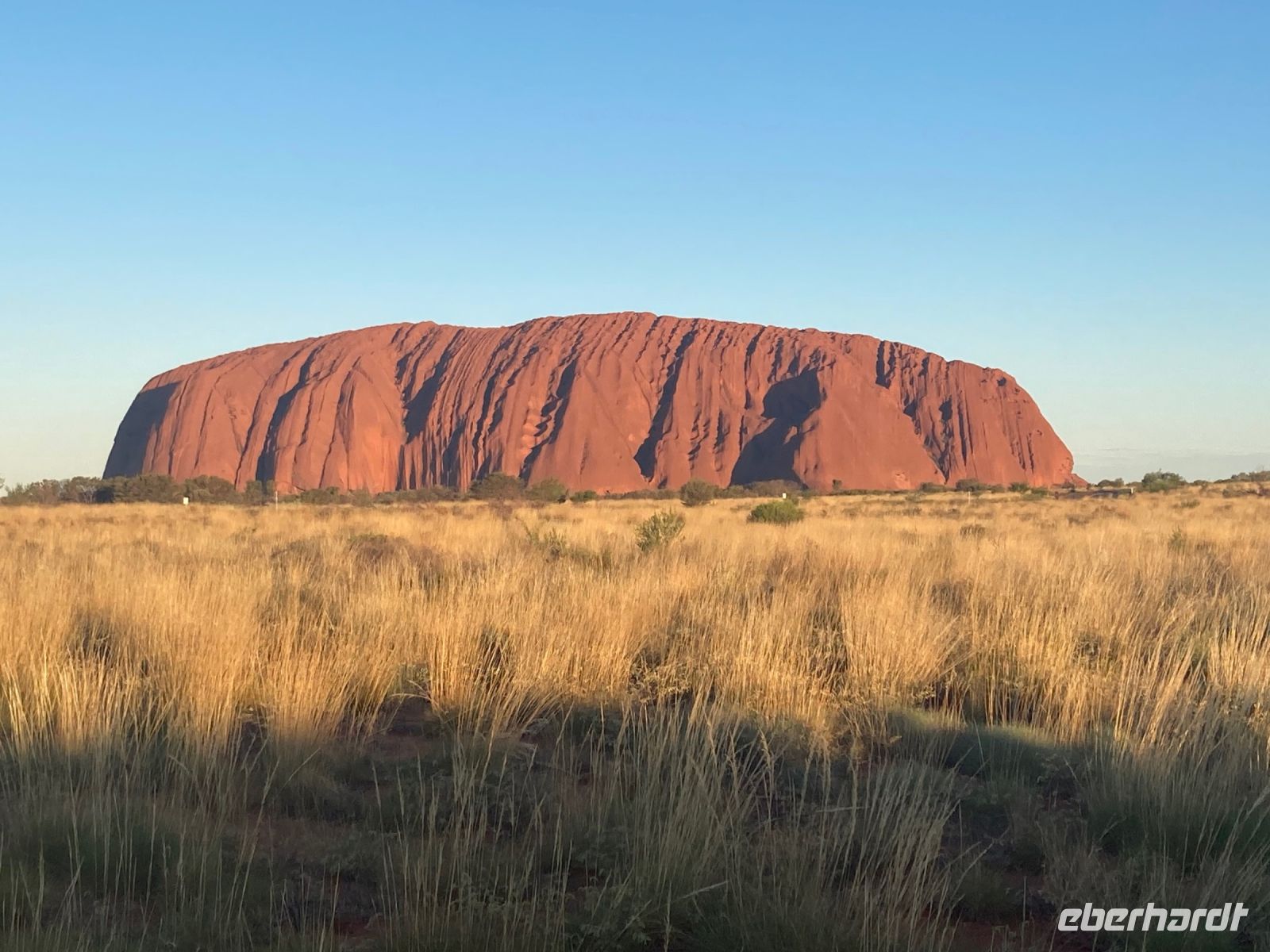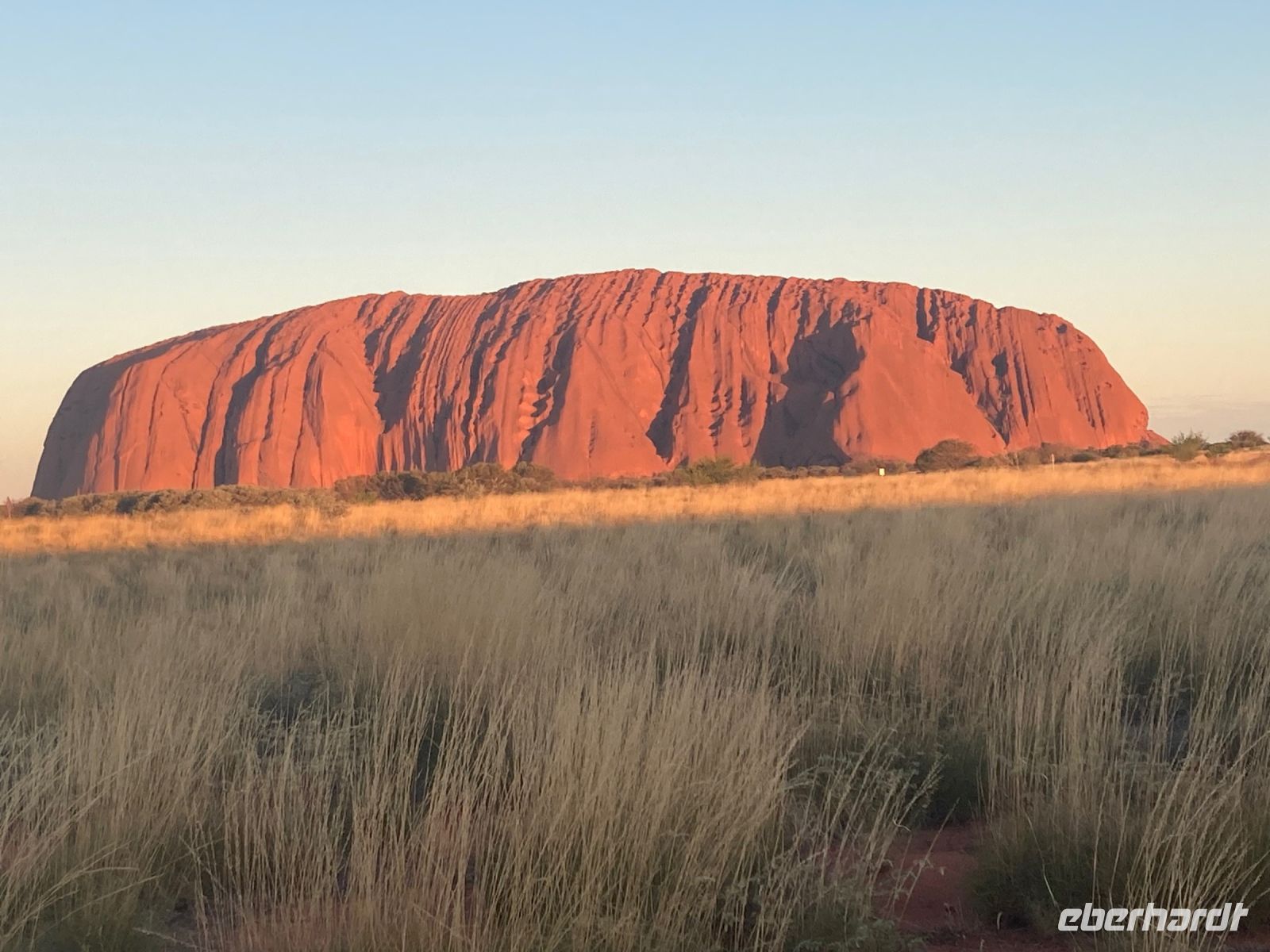 Und dann streben wir dem absoluten Höhepunkt des Tages entgegen: Wir fahren zurück zum uneingeschränkten Zentrum dieser unwirtlichen Gegend, dem Uluru, um bei diesem rostrot leuchtenden Berg den Sonnenuntergang zu erleben. Zwar sind wir ob der vielen anderen Touristen etwas irritiert, doch als das ständig wechselnde Farbenspiel am Monolith beginnt und uns hilfreiche Hände ein Glas Sekt und kleine Snacks kredenzen, lassen wir uns von dieser Stimmung verzaubern.