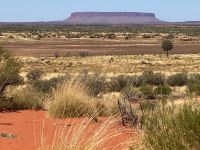 Nach dieser interessanten Tour mit einigen stillen, nachdenklichen Momenten geht es zurück ins angenehme Wüstencamp, um uns mit einem exzellenten Frühstück (dem besten auf der Reise!) auf den nächsten Programmpunkt vorzubereiten. Mit einem großen Tank eiskalten Frischwassers ausgestattet durchqueren wir mit dem Bus das glühende, von rotem Sand und windigen Wüsteneichen durchzogene Herzstück des australischen Outbacks. Auf schnurgeraden Straßen streben wir über Hunderte von Kilometern Alice Springs, dem administrativen Zentrum dieser heißen Gegend zu. Dabei passieren wir die einzige Tankstelle (inclusive Emu-Farm) im weiten Rund, halten an einer einsamen Toilette mit Blick auf einen Tafelberg und einen riesigen Salzsee und können links und rechts kleine Sandtornados beobachten.