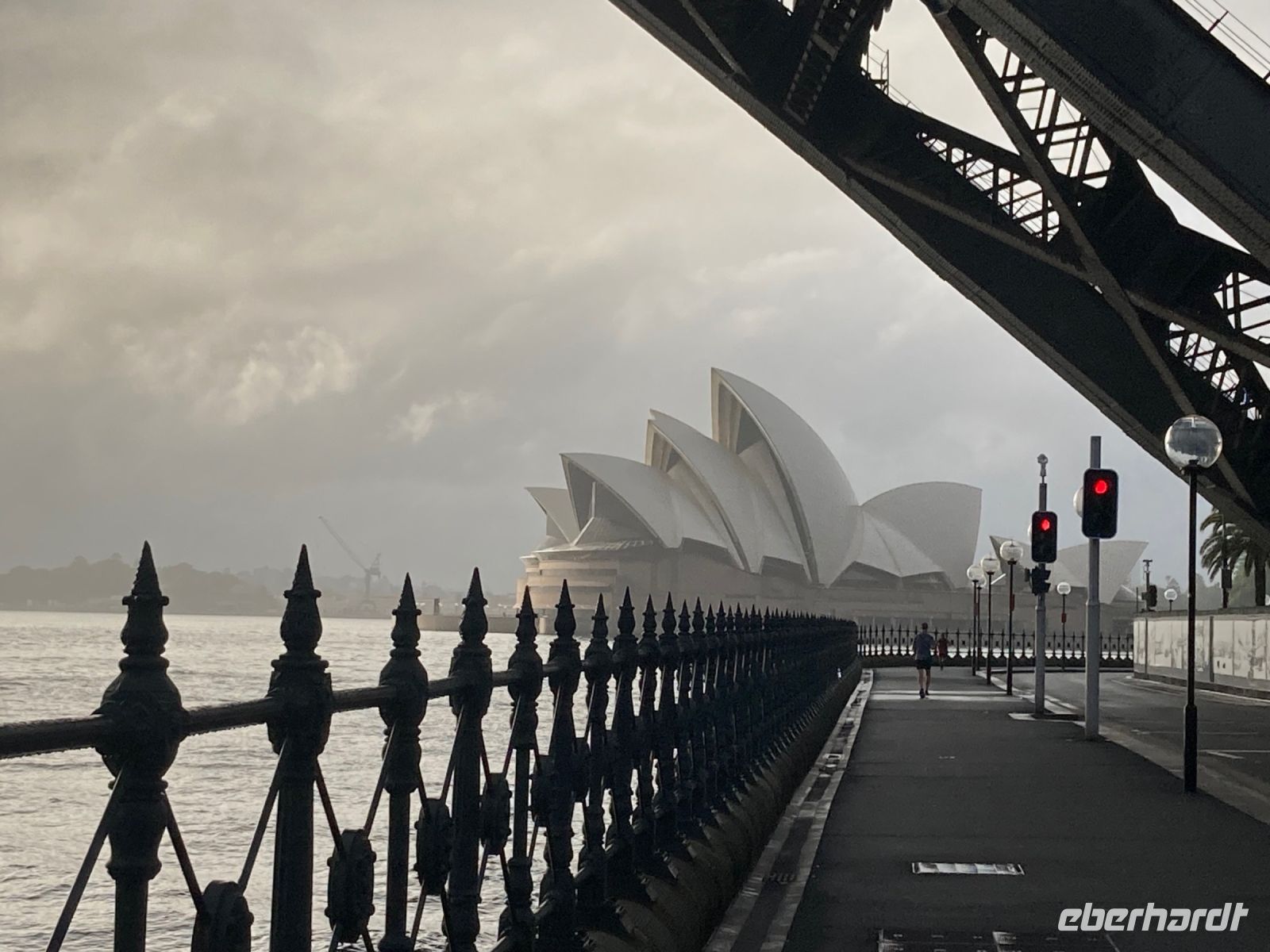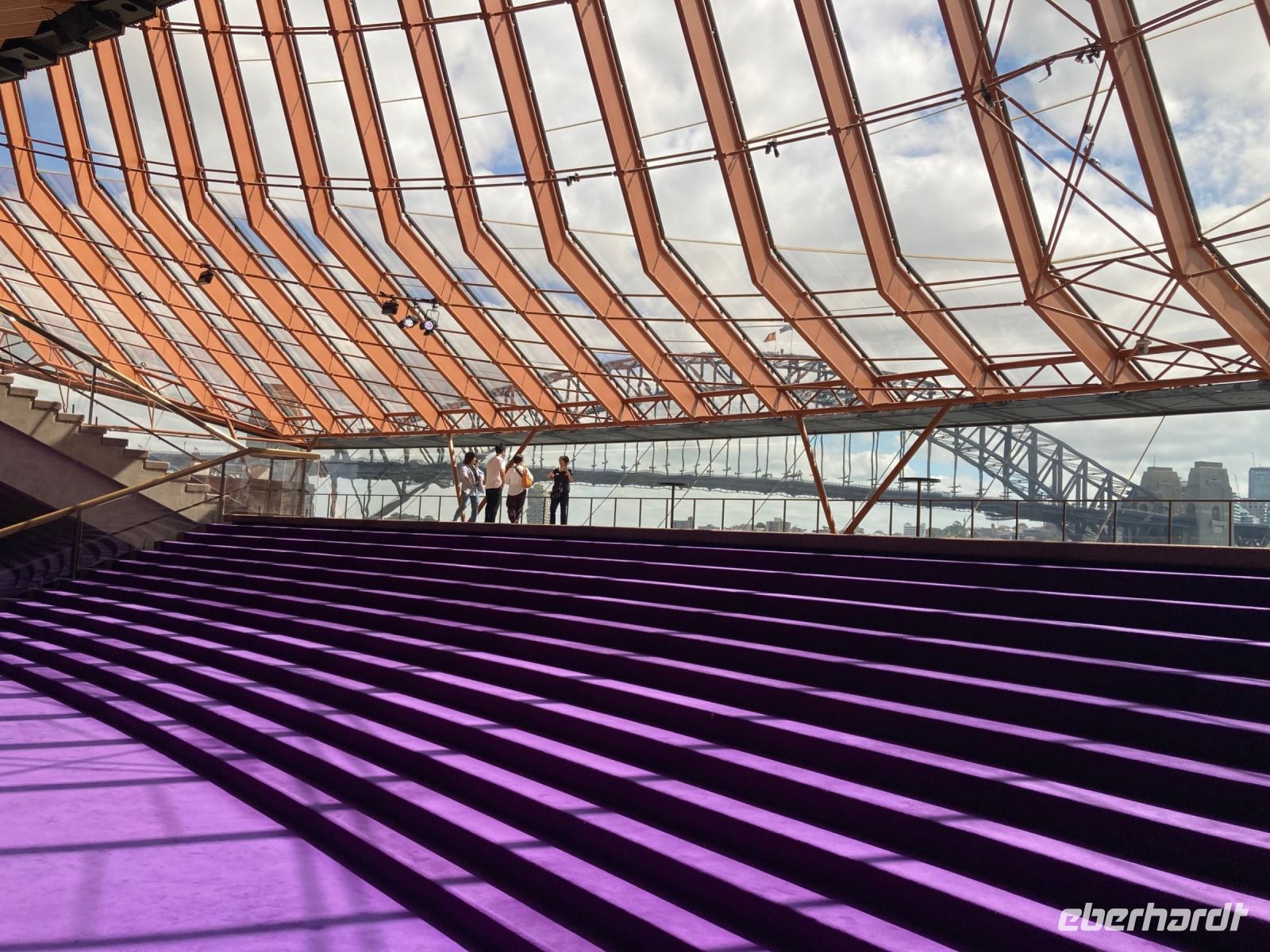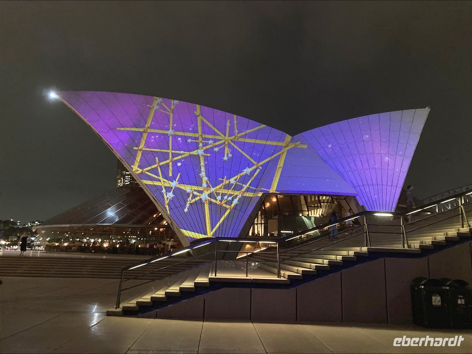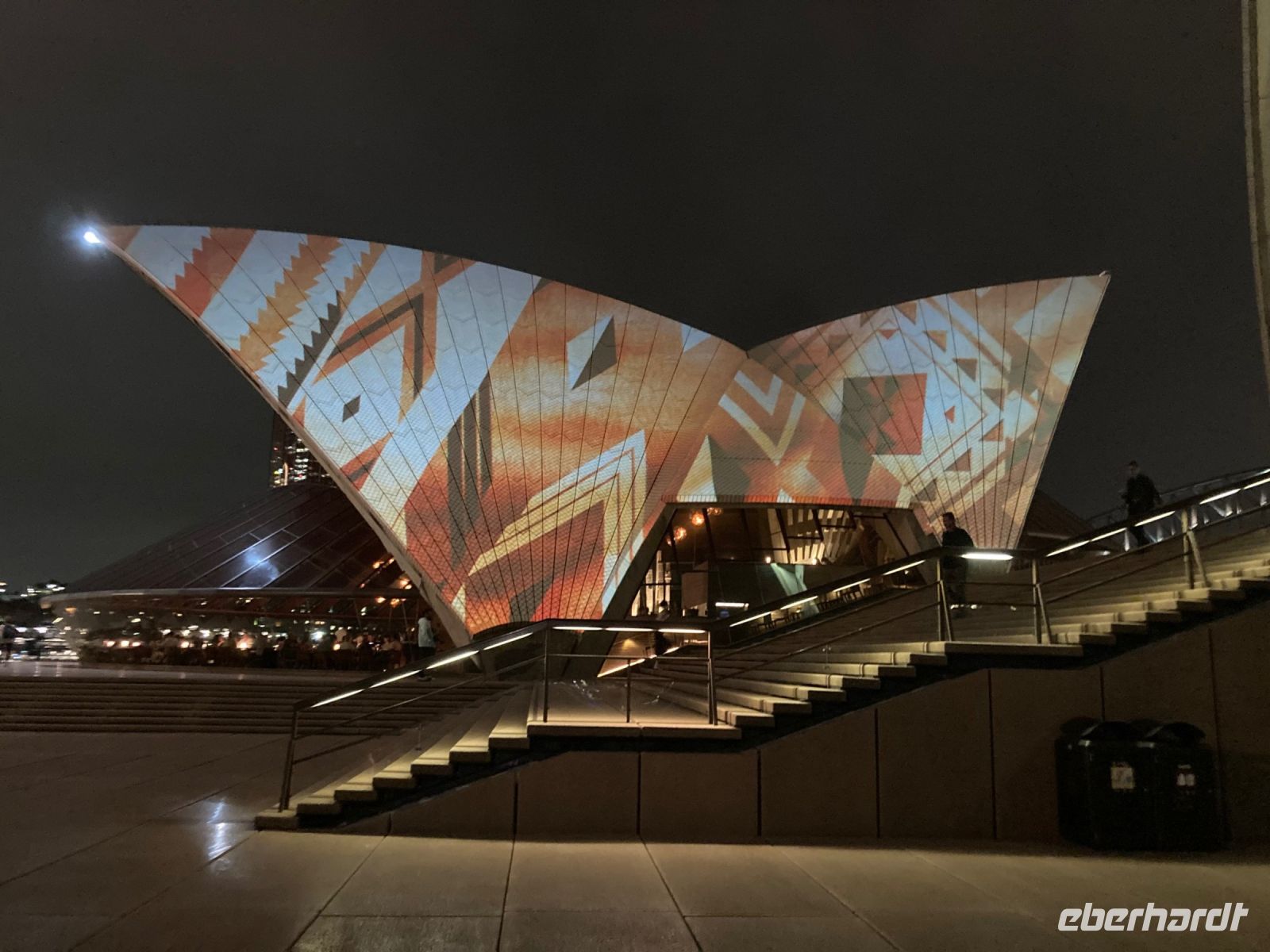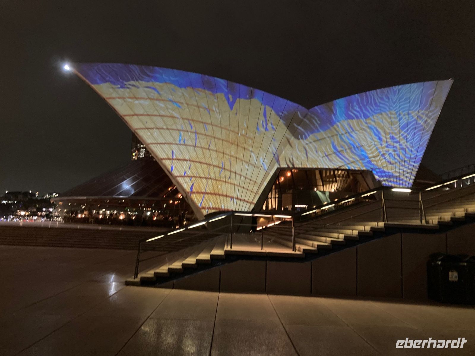 Wieder zurück im prächtigen Sydney wollen am Abend fast alle wieder zur Oper, um dem Lichtspektakel beizuwohnen, das auf die kleinen Segeln des filigranen Bauwerks projeziert wird. Und danach geht es vor Ort nur wenige Meter zur Waterfront, um da noch einen kleinen Imbiss zu nehmen und ein 10€-Bier zu genießen.