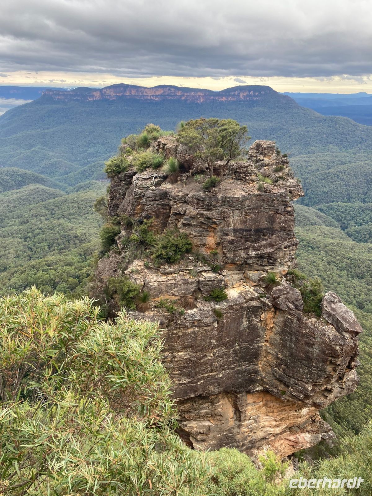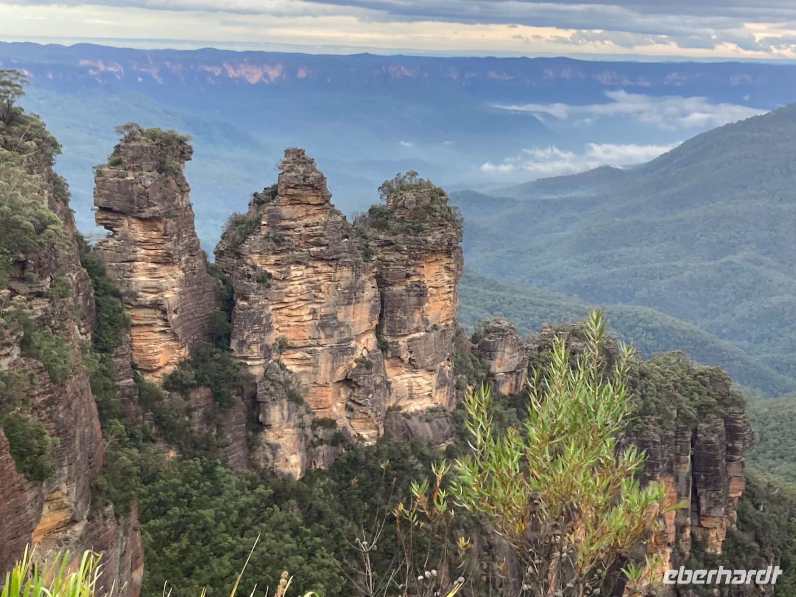 Heute wollen wir den legendären Blue Mountains einen Besuch abstatten. Während bei der Abfahrt auf Meereshöhe noch schmuddeliges Regenwetter herrscht, klart der Himmel, nachdem wir die Anhöhe der Blauen Berge erreicht haben, spürbar auf und einer entspannten Besichtigung dieser spektakulären Gegend mit ihren Schluchten, Aussichtspunkten und Wanderwegen steht nichts mehr im Wege. Besonders der Blick vom Echo Point zu der berühmten Felsformation der "Drei Schwestern" ist phänomenal, zumal er sich durch kurze Wegstrecken und durch die Benutzung von wackeligen Steigleitern perspektivisch verändern lässt.