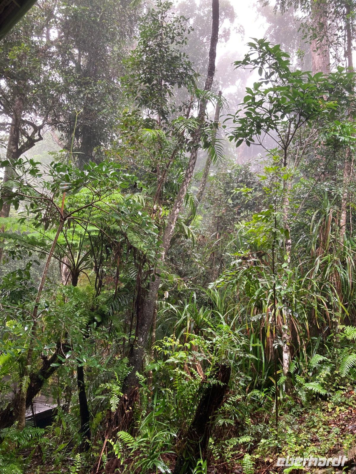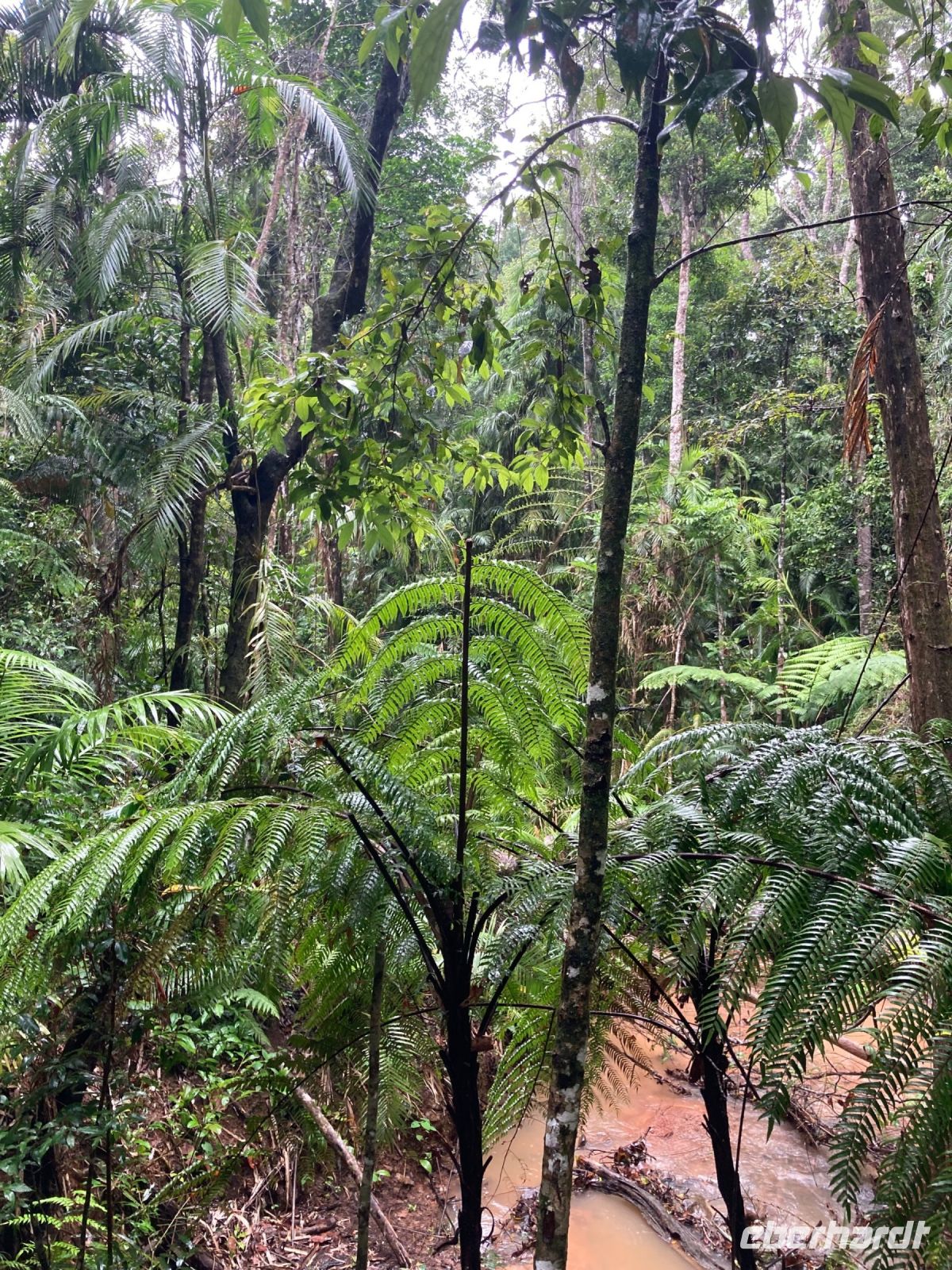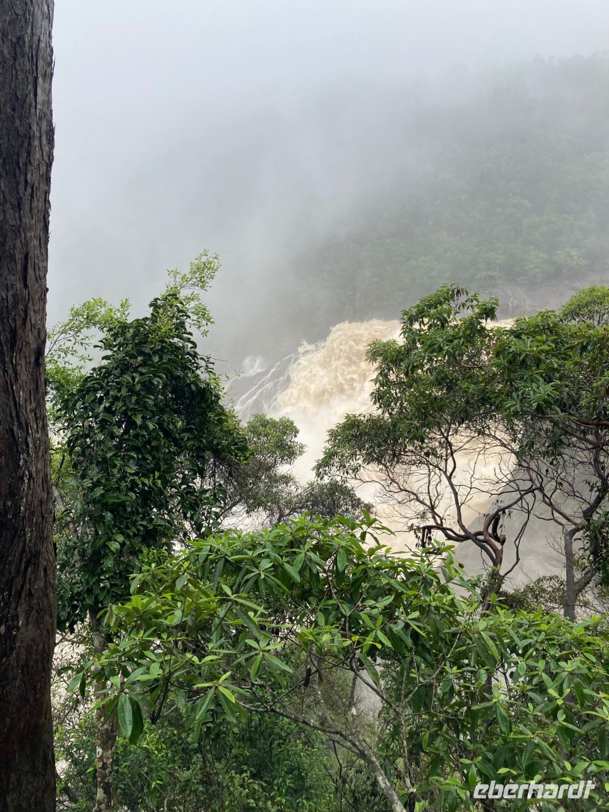 Doch am Mittag heißt es dann, von diesem schönen Ort Abschied zu nehmen, sich ein weiteres Mal ins Flugzeug zu setzen und dem letzten Highlight, der Regenwaldregion um Cairns, entgegen zu fliegen. Schon von der landenden Maschine aus sieht man, dass es in dieser Gegend in der letzten Zeit ziemlich nass war. Aus der Luft lassen sich braune, schlammführende Flüsse, die ihre Fracht weit ins Meer transportieren, und Erdrutsche, die große Felsbrocken zu Tale fördern, gut erkennen. So sind wir denn schon vorbereitet, als wir beim Verlassen des Flugzeugs von der Wucht der hohen Luftfeuchtigkeit getroffen werden.