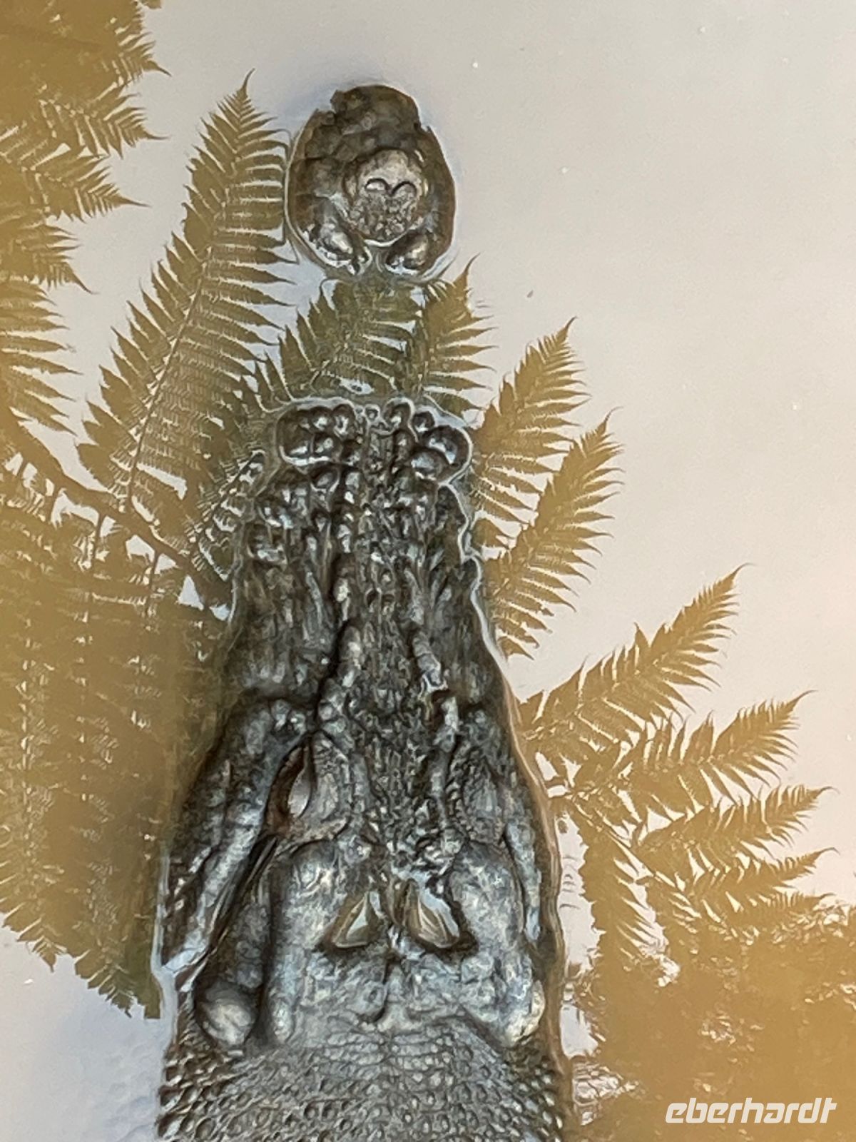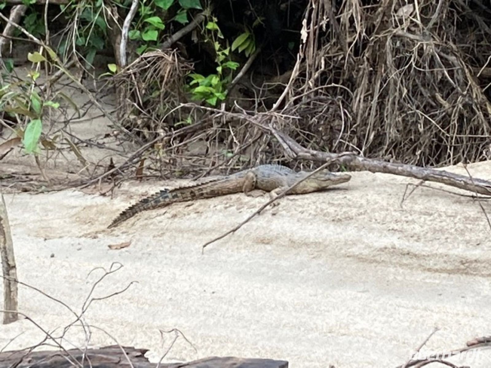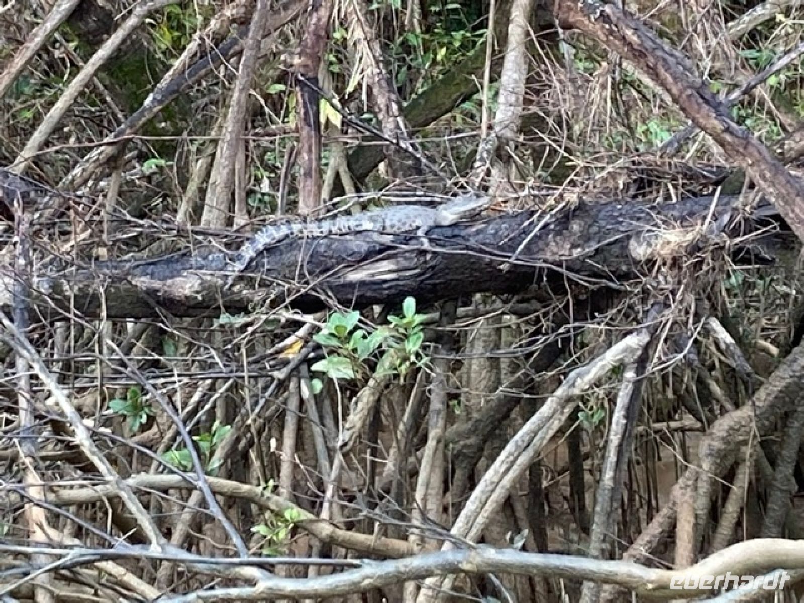 Zum krönenden Abschluss wollen wir uns den gefährlichen Salzwasserkrokodilen nähern, indem wir eine Bootsfahrt auf dem schlammigen Urwaldfluss, dem Daintree River unternehmen. Alle hocken wir angespannt im Boot und starren ans nahe Ufer und in die trüben Fluten. Die Ausbeute: zwei Jungtiere am Ufer und ein größeres Exemplar im Wasser unter einer Böschung, bei dessen Entdeckung durch ein Mitglied der Gruppe der erfahrene Bootsführer höchst lobende Worte findet.