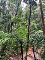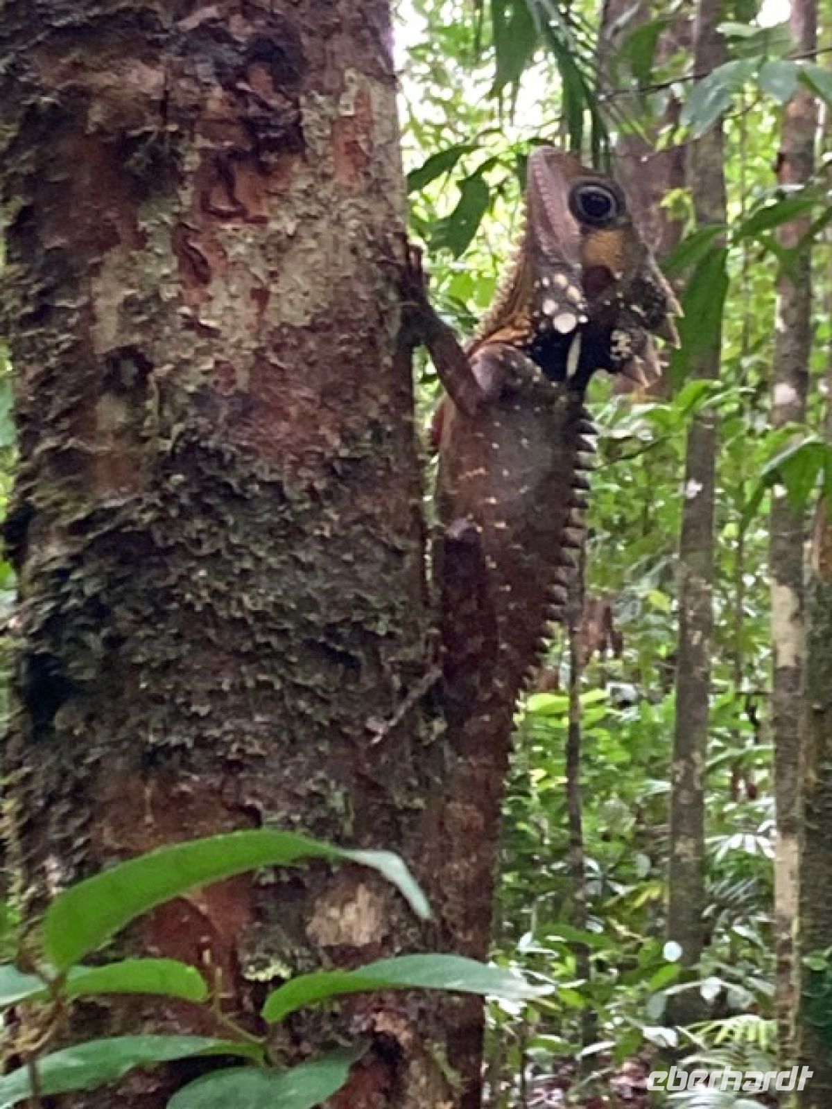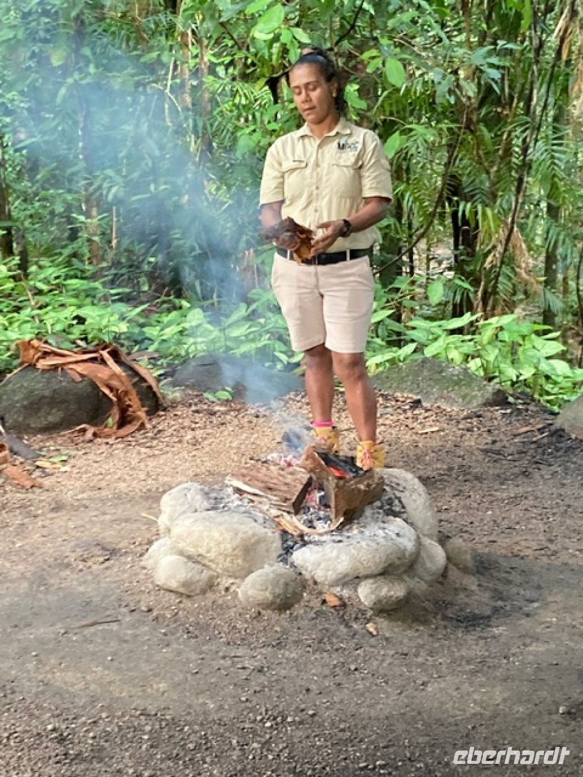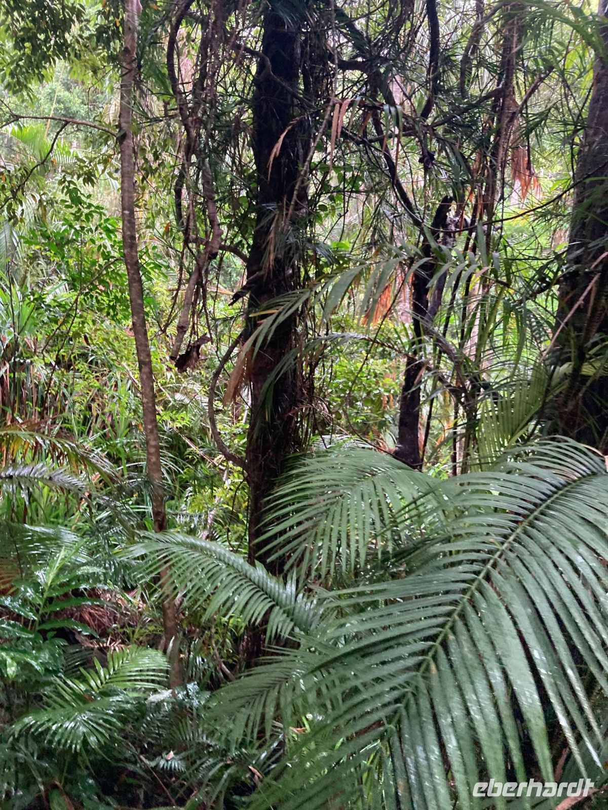 Früh am Morgen tuckern wir bei schlechtem Wetter vorbei an verträumten kleinen Palmenbuchten Richtung Norden in den Daintree National Park. Als wir das Visitor Center erreichen, hört der Regen auf und wir können nach einem typischen englischen Frühstück (eigentlich das Essen zur Tea time) der Willkommenszeremonie einer Aboriginal-Frau beiwohnen, die allerdings etwas knapp ausfällt. Dann wandern wir unter Anettes Führung in die Mossman Gorge, um ein weiteres Mal die Einzigartigkeit des Regenwalds und seiner Bewohner zu bewundern.