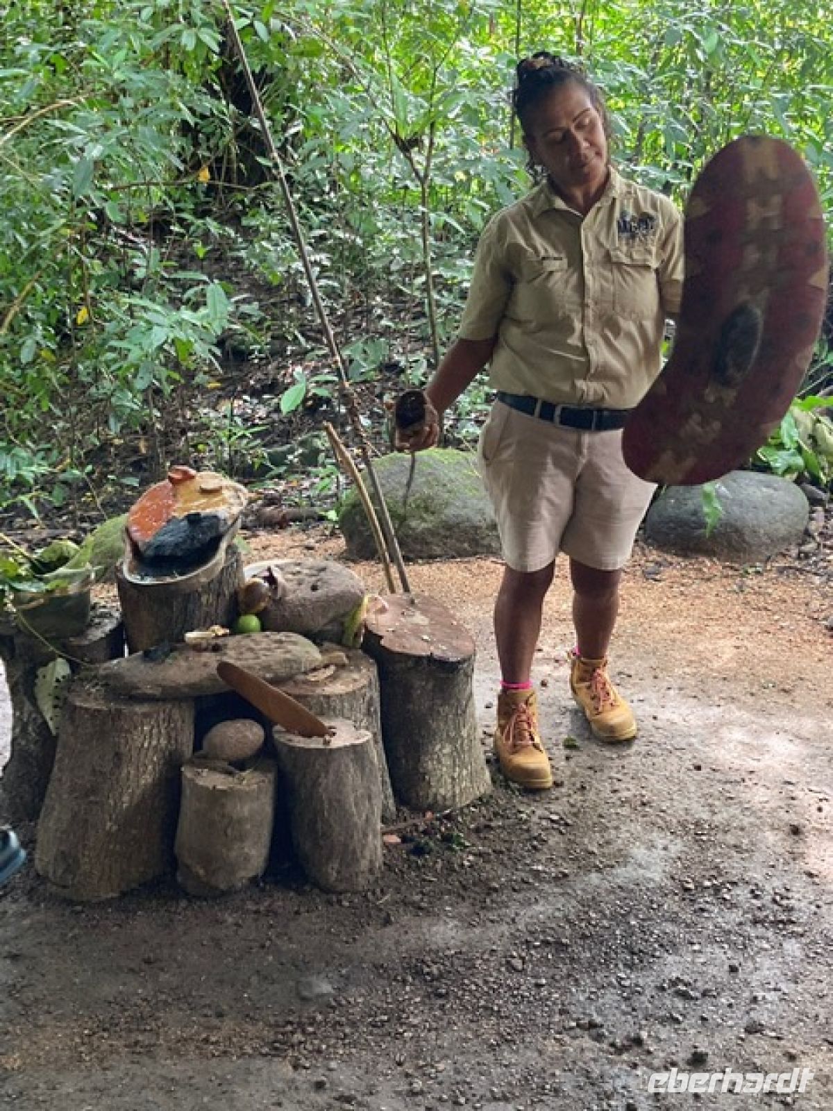 Nach einer weiteren Fahrt vorbei an endlosen Zuckerrohrfeldern kehren wir in einem wunderschön gelegenen Freiluft-Restaurant ein, dessen Spezialität es ist, alle Speisen mit vielen exotischen Früchten zu garnieren. Nach dem vorzüglichen Essen stellt uns der Patron die einzelnen Früchte vor, sodass wir endlich wissen, welche Schätze die tropische Natur zu bieten hat.