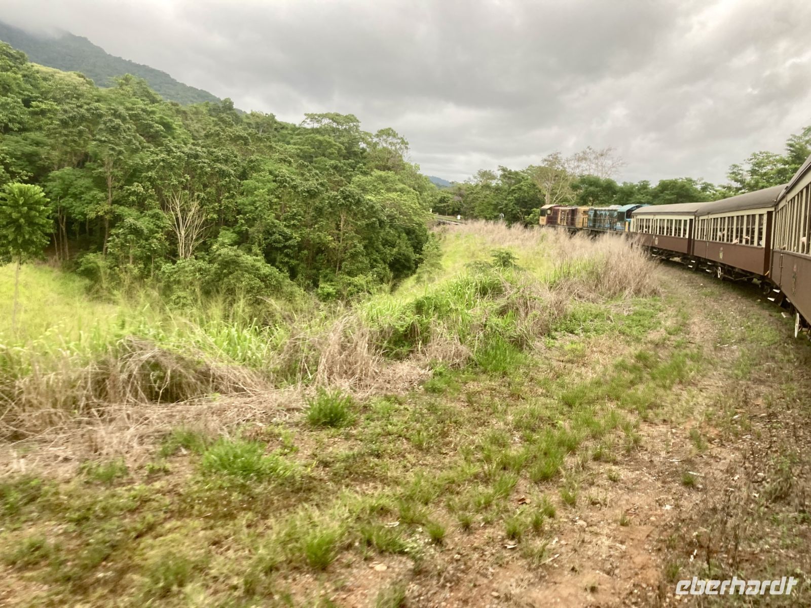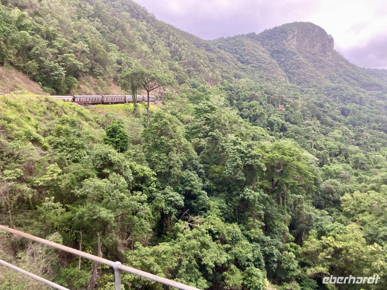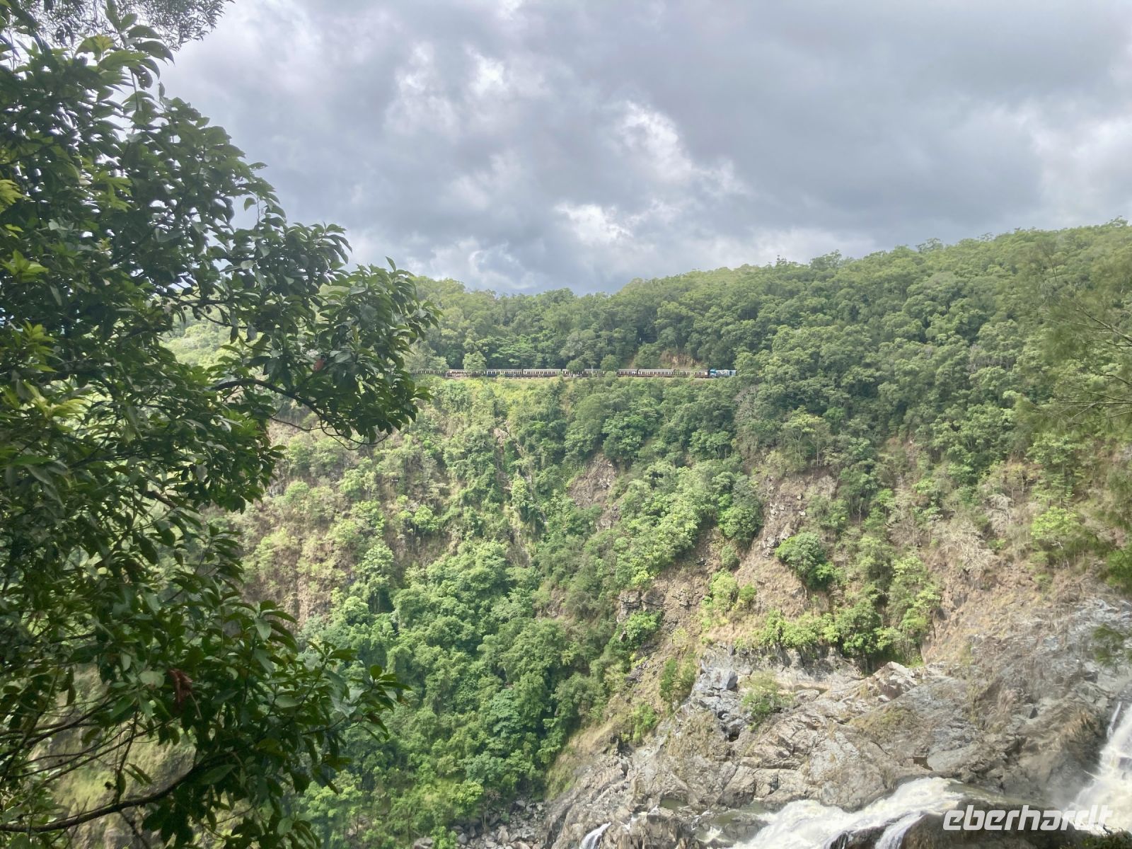 Der Rückweg nach Cairns führte uns mit dem Scenic Railway, einer malerischen Zugfahrt, die uns durch die tropische Landschaft und entlang der Barron Falls brachte. Die Scenic Railway ist eine historische Bahnstrecke, die 1891 eröffnet wurde und heute eine der bekanntesten Touristenattraktionen der Region ist. Während der Fahrt genossen wir spektakuläre Ausblicke auf die Berge, den Regenwald und die Wasserfälle.