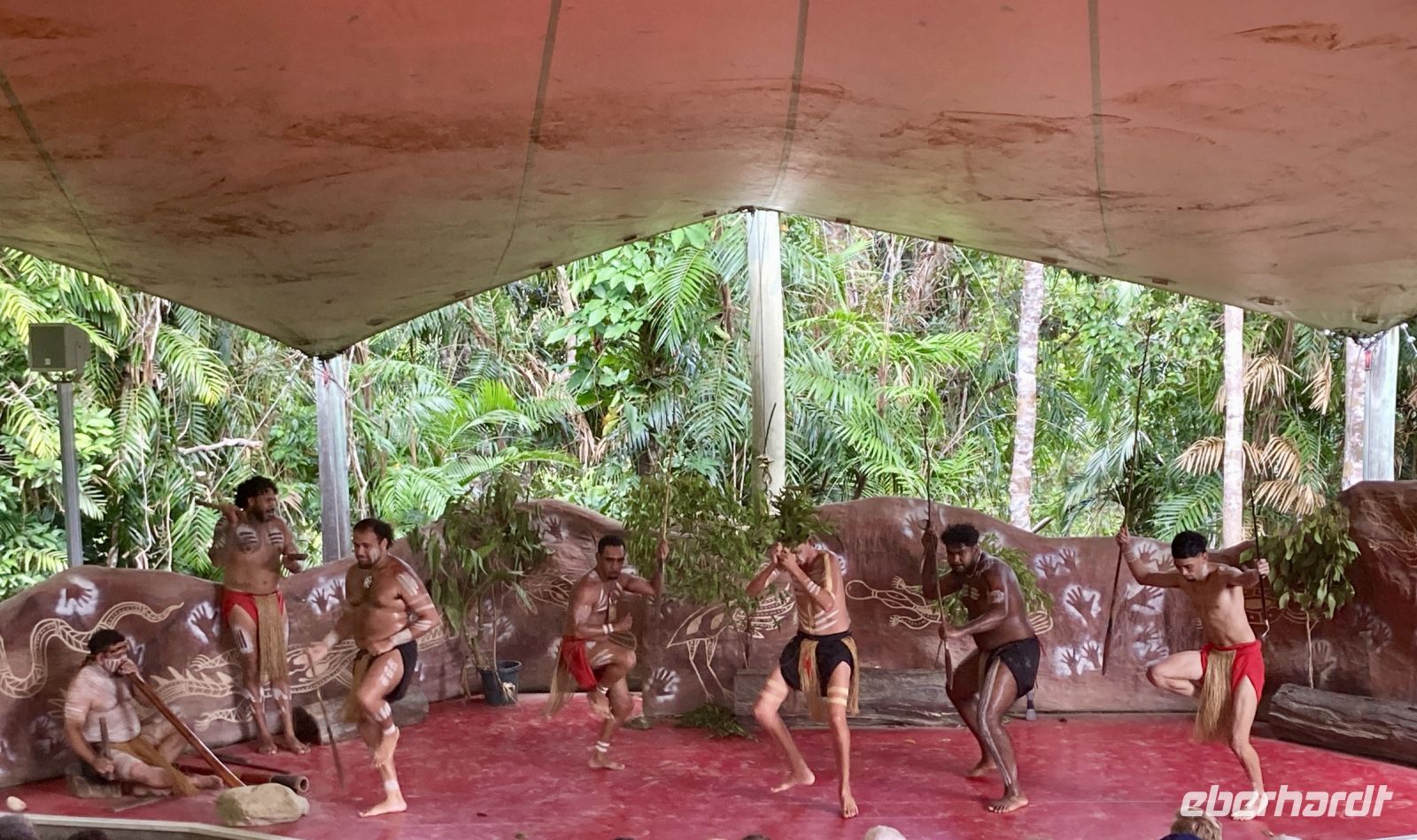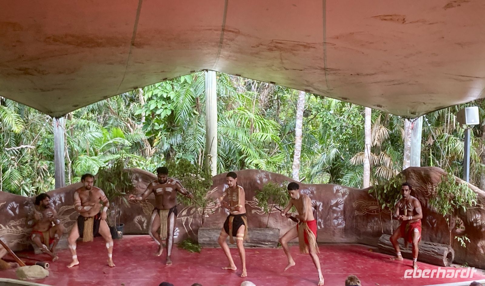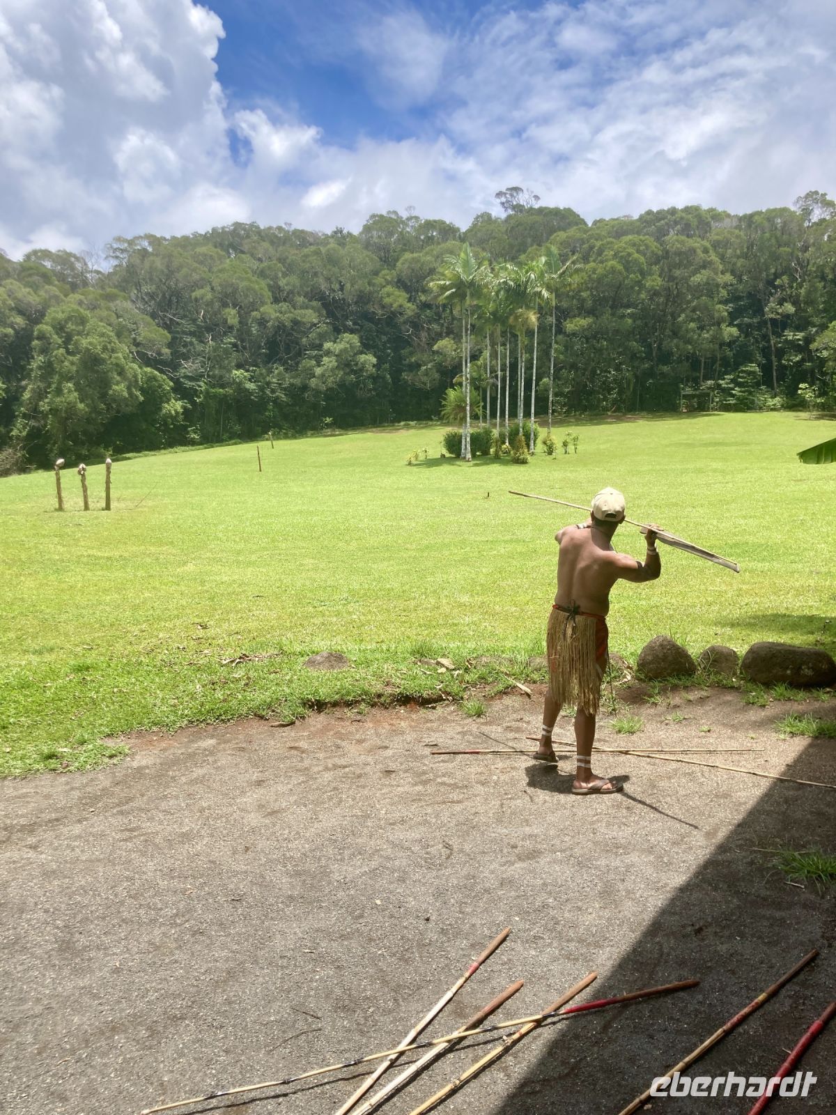 Bevor wir uns Kuranda genauer ansahen, machten wir einen Zwischenstopp bei den Pamagirri Aboriginals. Dort erhielten wir einen faszinierenden Einblick in ihre Kultur. Man zeigte uns, wie man traditionell jagt, das Didgeridoo spielt und den Bumerang wirft. Das Didgeridoo hat seinen Ursprung im nordwestlichen Arnhem Land in Australien, einer Region, die für ihre trockenen Landschaften bekannt ist. Es wird aus einem Baumstamm hergestellt, der von Termiten ausgefressen wurde. Mit diesem Instrument werden verschiedene Tiergeräusche nachgeahmt, was Teil der spirituellen und kulturellen Tradition der Aboriginals ist. Im Anschluss an diese Demonstrationen führten die Aboriginals in einem kleinen Theater noch traditionelle Tänze auf, die ihre Kultur und Geschichte widerspiegelten. Einige Gäste nutzten im Anschluss die Gelegenheit, um ein Foto mit einem Koala zu machen.
