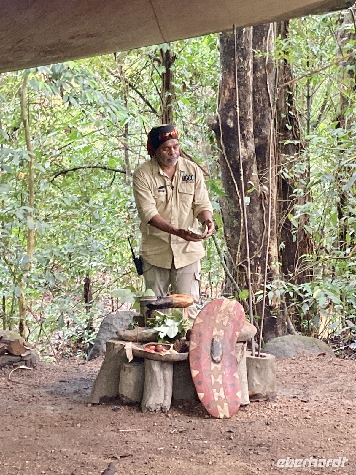 Unser erster Halt war die Mossman Gorge, wo uns ein Aboriginal-Führer herzlich mit einer traditionellen Willkommenszeremonie begrüßte. Diese Zeremonie ist eine wertvolle Tradition, die den Respekt vor der Natur und den Ahnen betont. Mossman Gorge ist bekannt für seine beeindruckende Natur, die durch klare, kühle Flüsse und üppige tropische Vegetation besticht. Nach einer erfrischenden Wanderung durch diesen wunderschönen Teil des Regenwaldes kehrten wir im Daintree Tea House ein, wo wir ein köstliches Mittagessen mit frischen tropischen Früchten und regionalen Spezialitäten genießen konnten.