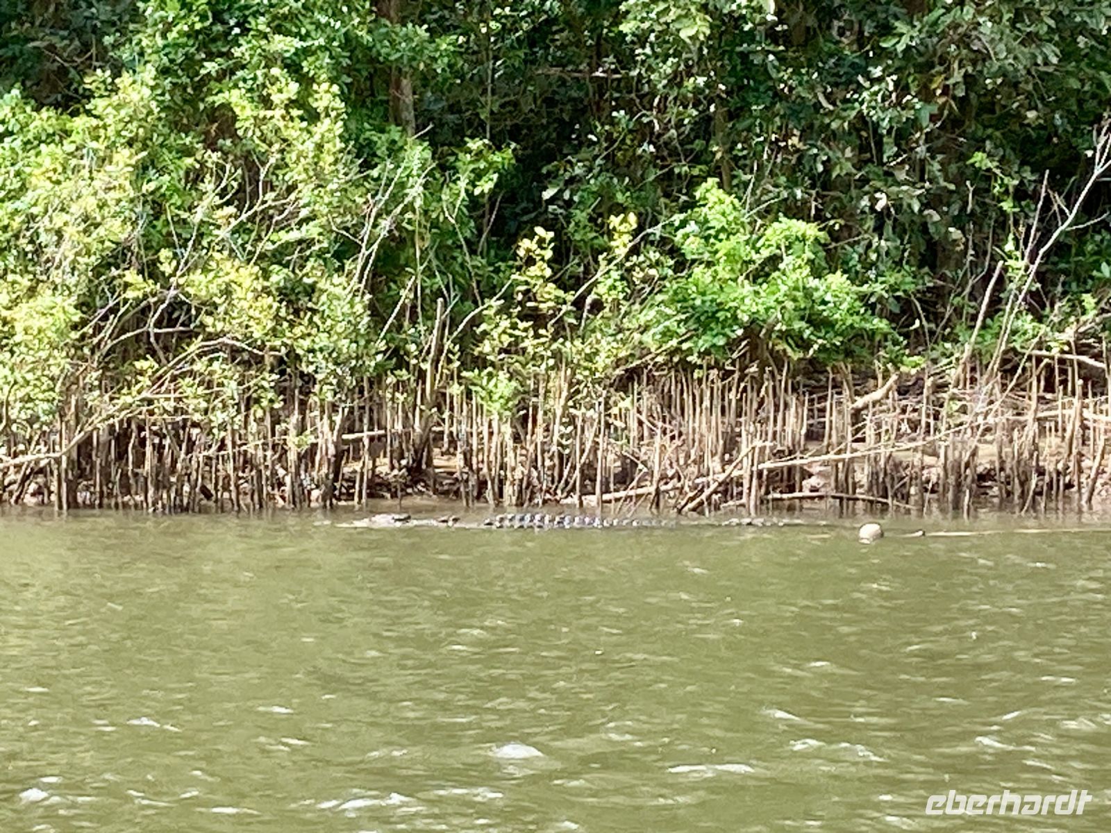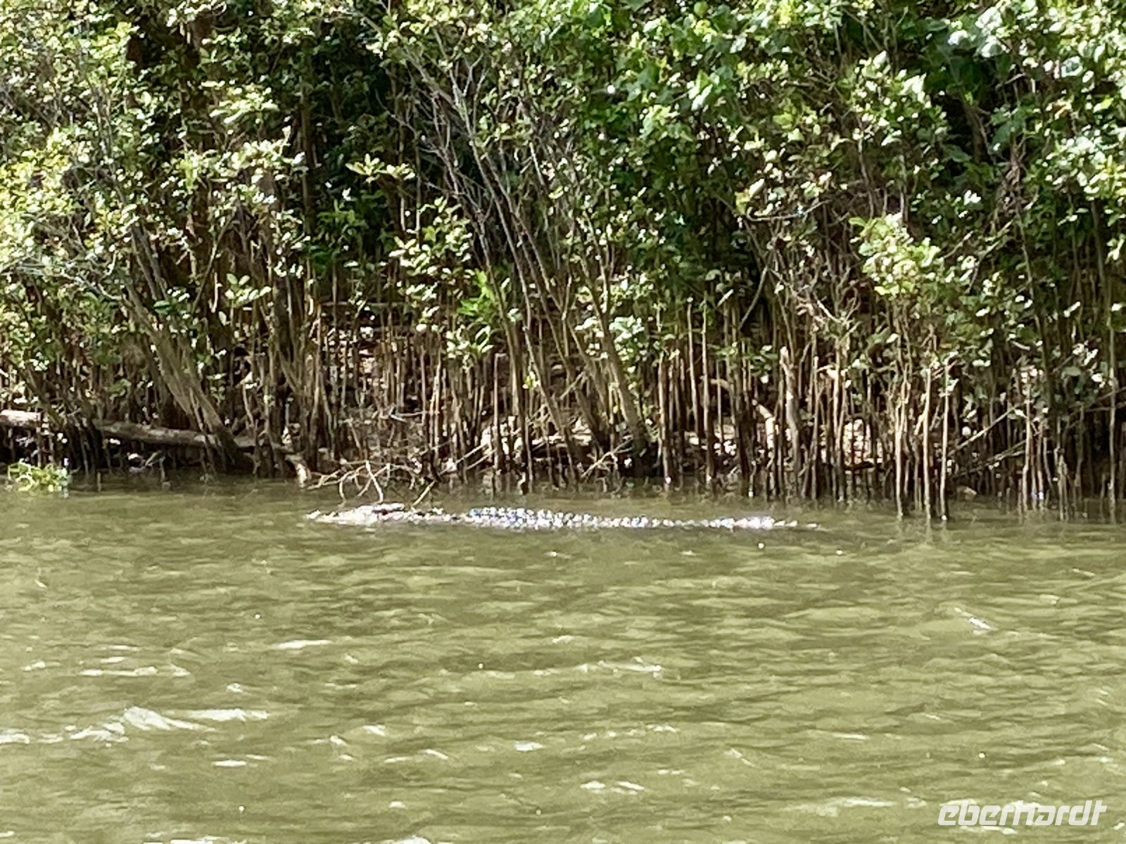 Nach dem Mittagessen stand eine Bootsfahrt auf dem Daintree River auf dem Programm, bei der wir ein echtes Highlight der Region entdeckten: ein Salzwasserkrokodil namens "Scarface". Unser Guide erklärte uns viele interessante Fakten über diese faszinierenden Tiere. Krokodile sind in den ersten zwei Lebensmonaten besonders eng mit ihrer Mutter verbunden, und sie verbringen viel Zeit in ihrer Nähe. Zudem können sie beeindruckende 6 bis 12 Monate ohne Nahrung überleben, was ihre Überlebensfähigkeit in der Wildnis unterstreicht.